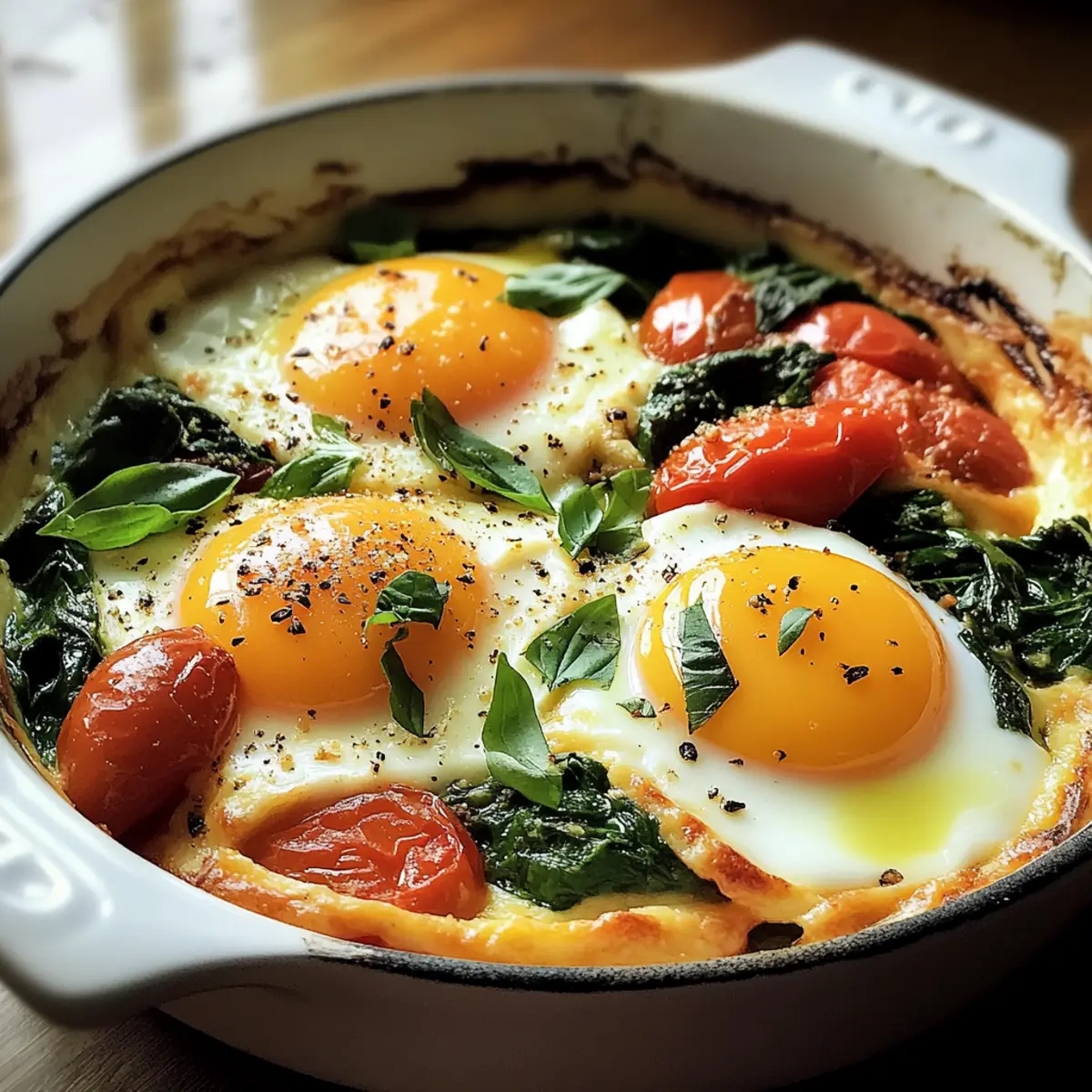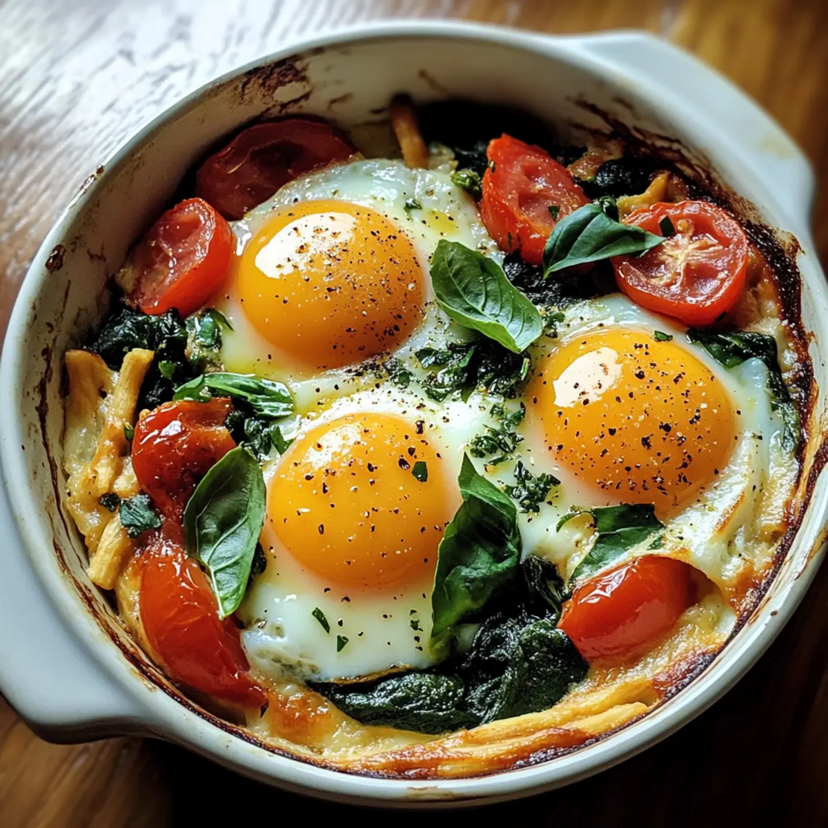 Ein köstlicher Geruch zieht durch die Küche, während ich die Eier in die Pfanne schlage. Kleine, warme Wells aus gebratenem Spinat und saftigen Tomaten bilden die perfekte Basis für dieses Gericht. Bei diesen Italienischen gebackenen Eiern mit Spinat und Tomaten trifft die Crema der Eier auf die erdigen Noten des Spinats – eine harmonische Kombination, die sich perfekt für ein schnelles und gesundes Frühstück oder ein entspanntes Brunch eignet. Mit nur wenigen Zutaten, die du wahrscheinlich ohnehin zu Hause hast, kannst du dieses mediterrane Highlight in weniger als 30 Minuten zubereiten. Ob zum Start in den Tag oder als leichtes Abendessen, dieses Rezept ist nicht nur köstlich, sondern auch nährstoffreich und befriedigend. Bist du bereit, deiner Familie oder Freunden etwas ganz Besonderes zu servieren? Lass uns gemeinsam kochen! Warum wirst du dieses Rezept lieben? Schnelligkeit: Die Zubereitung ist denkbar einfach und dauert weniger als 30 Minuten – ideal für hektische Morgen. Gesunde Wahl: Vollgepackt mit Eiweiß und Vitaminen aus Spinat und Tomaten, unterstützt dieses Gericht eine gesunde Ernährung. Mediterraner Genuss: Mit frischen Aromen von Basilikum und Oregano bringt es den Geschmack Italiens direkt auf deinen Teller. Vielseitigkeit: Perfekt als Frühstück oder leichtes Abendessen, der Geschmack macht es zu einem Hit für jede Gelegenheit. Leichte Variationen: Füge Käse oder zusätzliches Gemüse hinzu, um es individuell anzupassen. Mit diesen Haehnchen Mit Gemuese oder Senf Hahnchen Mit kannst du ein komplettes Menü zaubern! Italienische gebackene Eier mit Spinat und Tomaten Zutaten Für die Eier: • Eier – Die Grundlage dieses Gerichts, frische Eier sorgen für den besten Geschmack. • Spinat – Fügt eine erdige Note hinzu und ist reich an Nährstoffen; alternativ kannst du auch Grünkohl verwenden. • Tomaten – Sorgt für Süße und Saftigkeit; frische oder auch eingelegte Tomaten sind perfekt. Für die Würze: • Knoblauch – Hebt den Geschmack hervor; die Menge kann je nach Vorliebe angepasst werden. • Basilikum – Frische, aromatische Akzente; statt frischem Basilikum kann auch getrockneter verwendet werden. • Oregano – Gibt Tiefe und Wärme; italienische Gewürzmischung ist ebenfalls eine tolle Alternative. • Salz und Pfeffer – Zum Nachwürzen ganz nach deinem Geschmack; achte auf deine diätetischen Bedürfnisse. Für die Zubereitung: • Olivenöl – Zum Anbraten der Gemüse; verleiht zusätzliches Aroma. Wenn kein Olivenöl da ist, kannst du auch ein anderes Kochöl verwenden. Kreiere deine eigenen Italienischen gebackenen Eier mit Spinat und Tomaten und genieße ein schnelles, gesundes sowie köstliches Essen! Schritt-für-Schritt-Anleitung für Italienische gebackene Eier mit Spinat und Tomaten Step 1: Ofen vorheizen Heize deinen Ofen auf 190°C vor, um die perfekten Bedingungen für die Italienischen gebackenen Eier mit Spinat und Tomaten zu schaffen. Während der Ofen vorheizt, kannst du deine andere Vorbereitung starten und sicherstellen, dass alles bereit ist, bevor du die Eier backst. Step 2: Gemüse anbraten Erhitze in einer ofenfesten Pfanne bei mittlerer Hitze einen Esslöffel Olivenöl. Füge gehackten Knoblauch hinzu und brate ihn für 1-2 Minuten, bis er duftet, aber nicht verbrannt ist. Dieser Schritt sorgt für eine aromatische Grundlage für das Gericht. Step 3: Spinat und Tomaten hinzufügen Gib nun die frische Spinatmenge in die Pfanne und lasse sie für etwa 3-4 Minuten köcheln, bis sie zusammengefallen ist. Füge dann die gewürfelten Tomaten hinzu und würze die Mischung mit Salz, Pfeffer, frischem Basilikum und Oregano. Rühre alles gut um, um die Aromen zu kombinieren. Step 4: Eier hineinlegen Erstelle mit einem Löffel kleine Vertiefungen in der Gemüsemasse und schlage vorsichtig die Eier in diese Vertiefungen. Achte darauf, dass die Eier gleichmäßig verteilt sind, um ein gleichmäßiges Garen in den nächsten Schritten zu gewährleisten. Step 5: Eier backen Platziere die Pfanne vorsichtig in den vorgeheizten Ofen und backe die Eier für etwa 10-15 Minuten, bis die Eiweiße fest sind und die Eigelbe den gewünschten Gargrad erreicht haben. Beobachte die Eier, um sicherzustellen, dass sie nicht übergart werden. Step 6: Servieren Nehme die Pfanne aus dem Ofen und lasse sie ein paar Minuten abkühlen, bevor du die Italienischen gebackenen Eier mit Spinat und Tomaten servierst. Idealerweise genießt du sie mit einer Scheibe knusprigem Brot, um die köstliche Mischung von Eiern und Gemüse perfekt abzurunden. Italienische gebackene Eier mit Spinat und Tomaten Variationen Lass deiner Kreativität freien Lauf und genieße diese köstlichen Anpassungen! Käse hinzugefügt: Füge zerbröckelten Feta oder geschmolzenen Mozzarella hinzu, um eine cremige Textur zu erreichen. Zusätzliches Gemüse: Verfeinere das Gericht mit Paprika oder Champignons für mehr Geschmack und Nährstoffe. So wird jede Portion noch bunter und gesünder! Würzige Note: Bringe etwas Schwung ins Spiel, indem du rote Pfefferflocken oder frische Jalapeños hinzufügst – perfekt für Liebhaber scharfer(🍳) Küche. Kräuterwechsel: Experimentiere mit Kräuter wie Thymian oder Petersilie, um den Geschmack zu variieren. Das verleiht dem Gericht eine ganz neue Dimension! Vegan-Option: Nutze pflanzliche Eier-Alternativen wie Kichererbsenmehl für eine vegane Variante, die ebenso köstlich ist. Tomatensauce: Verwende eine würzige Tomatensauce als Basis, um dem Gericht einen herzhaften, italienischen Charakter zu verleihen. Eine tolle Möglichkeit, die Aromen zu intensivieren! Scharf gewürzt: Ergänze das Gemüse mit frisch geriebenem Parmesan für einen zusätzlichen Geschmacksbooster. Wenn du nach weiteren Rezeptideen suchst, schau dir unbedingt auch die Rezepte für Gegrilltes Vietnamesisches Hahnchen und Senf Hahnchen Mit an! Sie ergänzen dein Menü perfekt und bieten ebenso einfache Variationen für jeden Geschmack. Aufbewahrungstip