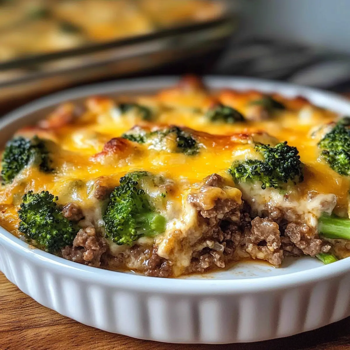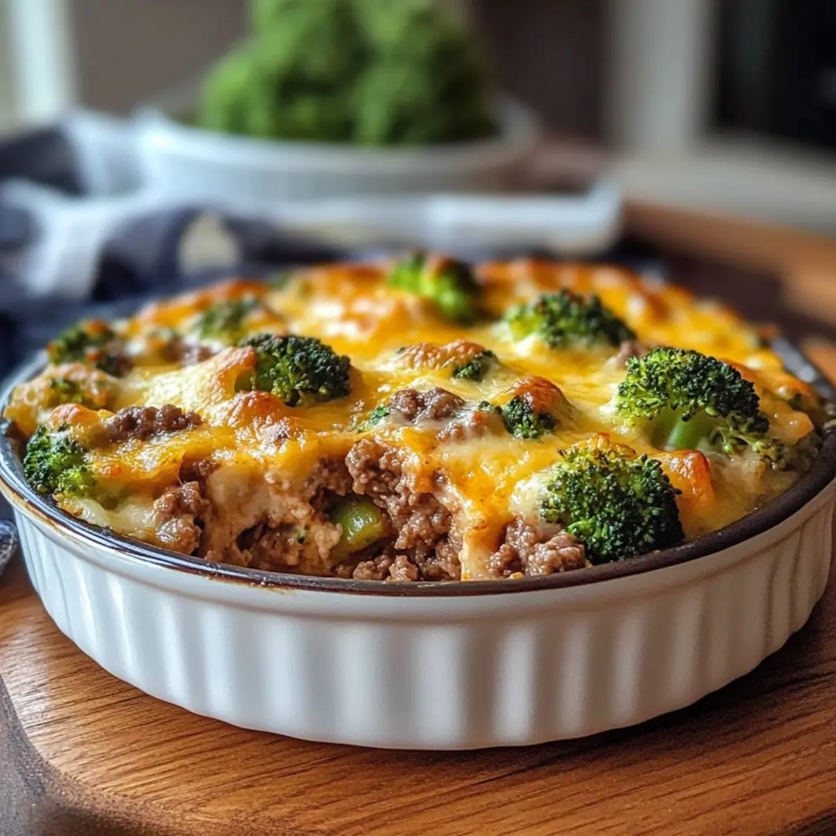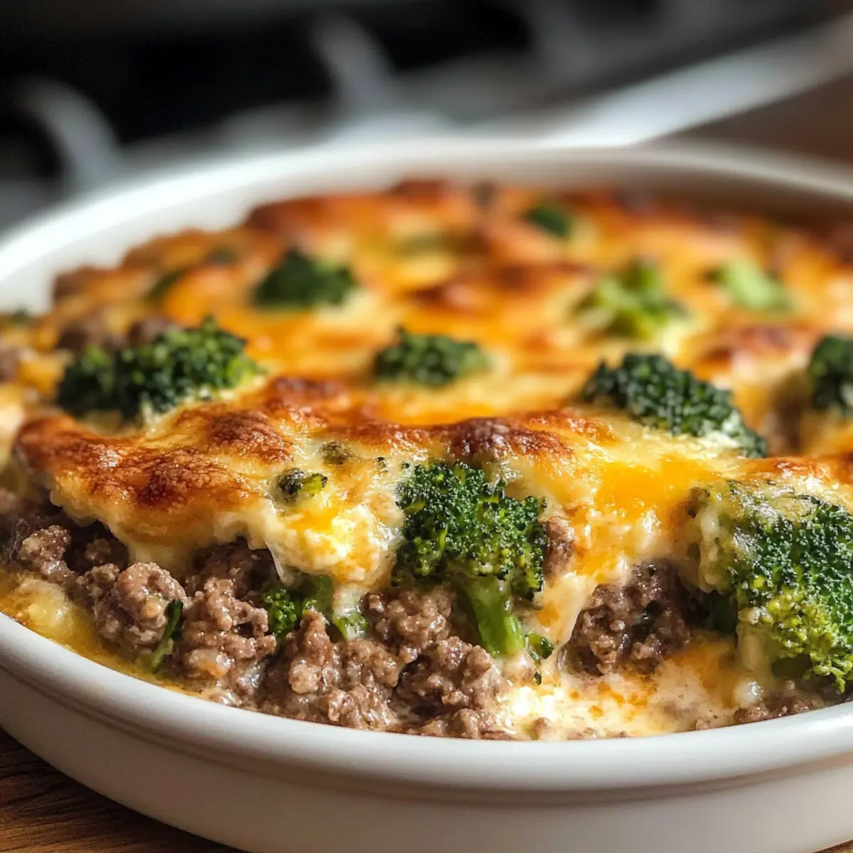 Als ich die Küche betrat, lag der verlockende Duft von gebräunten Zwiebeln und frisch gebratenem Hackfleisch in der Luft – ein echter Seelenschmeichler. Heute teile ich mit euch mein Rezept für einen Käseigen Rinder- und Brokkoli-Auflauf, der nicht nur die Herzen aller Familienmitglieder im Sturm erobert, sondern auch in weniger als einer Stunde zubereitet werden kann. Dieses Gericht kombiniert zartes Gemüse, herzhaftes Fleisch und geschmolzenen Käse zu einer unwiderstehlichen Casserole, die perfekte für ein schnelles Abendessen ist. Zudem lässt sich der Auflauf hervorragend vorbereiten und einfrieren, sodass ihr euch auch an stressigen Tagen auf ein köstliches Essen freuen könnt. Seid ihr bereit, mit mir gemeinsam in die Welt der einfachen, aber liebevollen Hausmannskost einzutauchen? Warum wird dieser Auflauf zum Familienliebling? Herzhaft und zufriedenstellend: Der kombinierte Geschmack von würzigem Rinderhack und frisch gegartem Brokkoli sorgt für ein leckeres Aroma, das alle anspricht. Zeitsparend: In weniger als einer Stunde bereit, perfekt für hektische Wochentage! Vielfältig: Mit leicht austauschbaren Zutaten, wie ganze Körner oder magerem Fleisch, könnt ihr ihn nach eurem Geschmack anpassen. Einfach zum Vorbereiten: Ideal zum Vorkochen und Einfrieren – so habt ihr immer eine köstliche Mahlzeit zur Hand. Komfort für die ganze Familie: Jede Portion ist ein warmer, schmelzender Genuss, der die Erinnerungen an geliebte Familienessen weckt. Käseiges Rinder- und Brokkoli-Auflauf Zutaten Für die Basis Olivenöl – sorgt für die nötige Fettbasis beim Anbraten. Zwiebel – verleiht dem Gericht eine süße und aromatische Note. Knoblauch – intensiviert den Geschmack und das Aroma. Für den Auflauf Rinderhack – die Hauptproteinquelle, die für reichhaltigen Geschmack sorgt. Salz & Pfeffer – essentielle Gewürze, um den Geschmack abzurunden. Champignon-Cremesuppe – bildet die cremige Grundlage für das Gericht. Milch – verdünnt die Soße und sorgt für zusätzliche Cremigkeit. Worcestershiresoße – fügt eine umami Note hinzu. Paprika – bringt Farbe und eine leichte Wärme ins Gericht. Für das Gemüse Brokkoliröschen – liefert Nährstoffe und eine schöne Textur. Für die Kohlenhydrate Reis/Ei-Nudeln – sorgen für die Stütze des Auflaufs. Für den Käse Cheddar Käse – schmilzt wunderbar und verleiht dem Gericht den charakteristischen Geschmack. Optional für den Belag Semmelbrösel – sorgen für einen knusprigen Überzug. Geschmolzene Butter – verbessert den Geschmack und die Knusprigkeit der Semmelbrösel. Dieser käseige Rinder- und Brokkoli-Auflauf ist nicht nur ein Blickfang, sondern auch ein wahrer Genuss für die ganze Familie! Step-by-Step Instructions für Käseiges Rinder- und Brokkoli-Auflauf Step 1: Ofen vorheizen Heize deinen Ofen auf 190°C (375°F) vor und fette ein 23×33 cm (9×13 Zoll) Backblech ein. Dieser erste Schritt stellt sicher, dass dein Käseiger Rinder- und Brokkoli-Auflauf gleichmäßig gebacken wird und erhält die perfekte Konsistenz. Step 2: Basis anbraten Erhitze 2 Esslöffel Olivenöl in einer großen Pfanne bei mittlerer Hitze. Füge die gewürfelte Zwiebel und den gehackten Knoblauch hinzu und brate sie für etwa 2–3 Minuten, bis sie weich und aromatisch sind. Dieser Schritt gibt der Basis deines Auflaufs einen köstlichen Geschmack. Step 3: Fleisch anbraten Gib 500 g Rinderhack in die Pfanne und würze es mit Salz und Pfeffer. Brate das Fleisch etwa 5–7 Minuten an, bis es schön gebräunt ist. Achte darauf, überschüssiges Fett abzugießen, damit dein Auflauf nicht zu fettig wird und den vollen Geschmack entfaltet. Step 4: Sauce zubereiten Rühre eine Dose Champignon-Cremesuppe, 240 ml Milch, 2 Esslöffel Worcestershire-Soße und 1 Teelöffel Paprika in die Pfanne. Mische alles gründlich, bis eine gleichmäßige Sauce entsteht, und koche sie weitere 2 Minuten, damit die Aromen sich vermischen. Step 5: Zutaten kombinieren Füge 300 g blanchierte Brokkoliröschen und 250 g vorgekochten Reis oder Ei-Nudeln in die Pfanne hinzu. Faltet alles vorsichtig zusammen, bis alle Zutaten gut miteinander vermischt sind. Dieser Schritt sorgt dafür, dass die Aromen gleichmäßig verteilt werden. Step 6: Auflauf zusammenstellen Übertrage die Mischung aus Rinderhack und Brokkoli in das vorbereitete Backblech und streiche die Oberfläche glatt. Bestreue den Auflauf großzügig mit 200 g geriebenem Cheddar-Käse und optional 50 g Semmelbrösel, die mit 2 Esslöffeln geschmolzener Butter vermischt werden. Step 7: Backen Backe den Auflauf im vorgeheizten Ofen für 25–30 Minuten, bis der Käse schön blubbert und goldbraun wird. Für eine extra knusprige Kruste kannst du die letzten 2–3 Minuten die Grillfunktion nutzen, um eine perfekte Farbe zu erzielen. Step 8: Ruhen lassen und servieren Lass den Käseigen Rinder- und Brokkoli-Auflauf nach dem Backen 5 Minuten ruhen, bevor du ihn servierst. Dadurch setzen sich die Aromen und die Konsistenz verbessert sich, perfekt zum Genießen an Familientafeln. Vorbereiten des Käseigen Rinder- und Brokkoli-Auflaufs Dieser käseige Rinder- und Brokkoli-Auflauf ist ideal für die Vorbereitung im Voraus! Du kannst die komplette Mischung bis zu 24 Stunden im Voraus zubereiten und im Kühlschrank aufbewahren, damit die Aromen gut durchziehen. Einfach alle Zutaten wie Rinderhack, Brokkoli und die Sauce bis Schritt 5 zusammenstellen und in eine eingefettete Auflaufform geben. Wenn du bereit bist, zu backen, streue einfach den Käse und die Semmelbrösel darüber und backe ihn 30 Minuten lang bei 190 °C (375 °F). Ein weiterer Tipp: Wenn du den Auflauf einfrieren möchtest, mache ihn unbebacken und decke ihn luftdicht ab, so bleibt die Qualität erhalten. Dadurch hast du immer ein köstliches Familienessen zur Hand, selbst an den hektischsten Tagen! Was passt gut zu Käseigem Rinder- und Brokkoli-Auflauf? Der perfekte Begleiter zu diesem herzhaften Auflauf macht ein ausgewogenes u