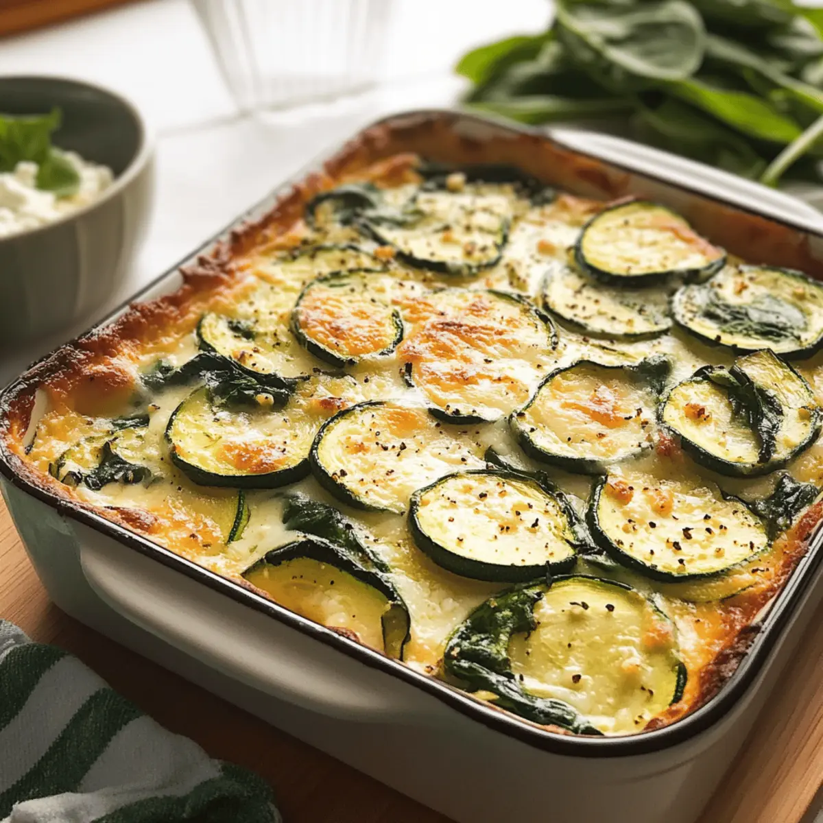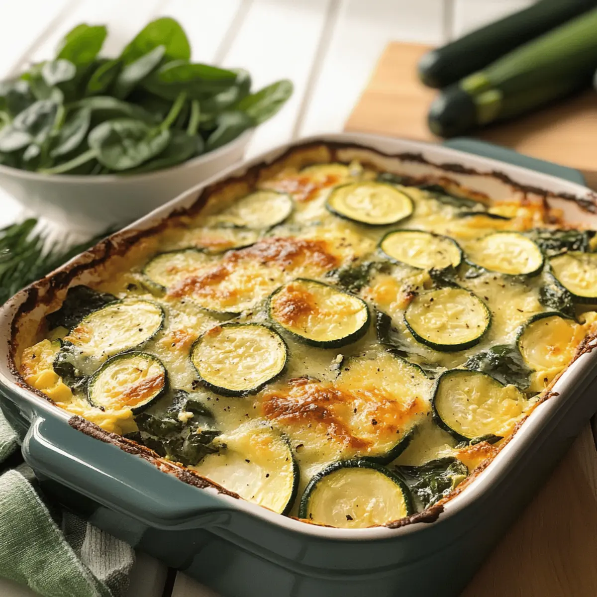 Während ich in der Küche stehe und die frischen Zutaten für meinen Käse-Spinat-Zucchini-Feta-Auflauf vorbereite, merke ich, wie das köstliche Aroma von Knoblauch und sautiertem Spinat durch den Raum zieht. Dieses Rezept ist nicht nur einfach und schnell zuzubereiten, es vereint auch die Vorteile einer vegetarischen und keto-freundlichen Mahlzeit. Die Kombination aus zartem Zucchini, würzigem Feta und aromatischem Spinat ergibt einen herzhaften Auflauf, der leicht als Hauptgericht oder Beilage glänzt. Was mir besonders an diesem Gericht gefällt, ist, dass es in nur 45 Minuten fertig ist – ideal für einen stressigen Wochentag! Seid ihr bereit für ein einfaches, aber köstliches Rezept, das allen schmeckt? Warum ist der Auflauf so beliebt? Einfachheit: Die Zubereitung des Käsigen Spinat-Zucchini-Feta-Auflaufs erfordert nur grundlegende Kochfähigkeiten, was ihn perfekt für Anfänger macht. Schnelligkeit: In nur 45 Minuten ist dieses köstliche Gericht servierfertig, ideal für hektische Wochentage. Vielfältige Verwendung: Ob als leichtes Hauptgericht oder als Beilage – dieser Auflauf passt zu jeder Gelegenheit und kann leicht angepasst werden. Reichhaltiger Geschmack: Die Kombination aus würzigem Feta, frischem Spinat und zartem Zucchini sorgt für eine harmonische Aromenexplosion, die niemanden enttäuscht. Gesund und nahrhaft: Mit seinem hohen Gemüseanteil und dem niedrigen Kohlenhydratgehalt ist dieser Auflauf nicht nur köstlich, sondern auch hervorragend für eine gesunde Ernährung geeignet. Für mehr tolle Rezepte, die sich schnell umsetzen lassen, schaut euch auch unseren Beitrag über schnelle Veggie-Gerichte an! Käsiger Spinat-Zucchini-Feta-Auflauf Zutaten Hinweis: Diese Zutaten bilden die perfekte Grundlage für einen köstlichen, käsehaltigen Spinat-Zucchini-Feta-Auflauf. Für die Füllung Spinat – sorgt für einen reichhaltigen, erdigen Geschmack und ist voller Nährstoffe; sowohl frischer als auch gefrorener Spinat sind geeignet. Zucchini – verleiht Feuchtigkeit und eine milde Süße; alternativ kann auch gelber Kürbis verwendet werden. Feta Käse – begeistert mit seiner cremigen Konsistenz und dem pikanten Aroma; für einen anderen Geschmack kann Ziegenkäse als Substitute verwendet werden. Eier – binden den Auflauf und bieten Struktur; für eine vegane Variante können Tofu oder ein Leinsamenei eingesetzt werden. Sahne – sorgt für Reichtum und Cremigkeit; Kokoscreme kann für eine milchfreie Version genutzt werden. Knoblauch – hebt den Geschmack mit seinem aromatischen Profil; frischer, gehackter Knoblauch ist vorzuziehen. Salz, Pfeffer, Muskatnuss – grundlegende Gewürze, die den gesamten Geschmack verfeinern. Für die Garnierung Frischer Dill – bringt eine frische Note ins Spiel und rundet das Gericht perfekt ab. Bereitet euch auf einen köstlichen Käsigen Spinat-Zucchini-Feta-Auflauf vor, der nicht nur einfach und schnell zuzubereiten ist, sondern auch bestens für eine gesunde Ernährung geeignet ist! Schritt-für-Schritt-Anleitung für Käsiger Spinat-Zucchini-Feta-Auflauf Schritt 1: Ofen vorheizen und Backform vorbereiten Heizen Sie Ihren Ofen auf 180°C vor und bereiten Sie eine geeignete Backform vor, indem Sie sie leicht einfetten oder mit Backpapier auslegen. Dies hilft, dass der Käse nicht anbrennt und erleichtert das Entfernen des Auflaufs nach dem Backen. Schritt 2: Spinat sautieren Erhitzen Sie etwas Olivenöl in einer großen Pfanne bei mittlerer Hitze. Fügen Sie den gehackten Knoblauch hinzu und braten Sie ihn für etwa 1 Minute an, bis er aromatisch ist. Geben Sie dann den frischen oder gefrorenen Spinat dazu und sautieren Sie ihn 2-3 Minuten lang, bis er zusammengefallen ist. Lassen Sie ihn kurz abkühlen. Schritt 3: Eier-Mischung anrühren In einer großen Schüssel schlagen Sie die Eier auf und mischen sie gründlich mit der Sahne, Salz, Pfeffer und frisch geriebener Muskatnuss. Diese Mischung dient als Bindemittel für den Käsigen Spinat-Zucchini-Feta-Auflauf und sorgt für eine schön cremige Konsistenz. Schritt 4: Auflauf schichten Legen Sie die Zucchinischeiben gleichmäßig in die vorbereitete Backform. Darauf verteilen Sie die sautierten Spinat und streuen den zerbröckelten Feta-Käse gleichmäßig über das Gemüse. Gießen Sie die Eier-Mischung langsam und gleichmäßig über die gesamten Schichten, damit alles gut durchfeuchtet wird. Schritt 5: Backen Schieben Sie die Backform in den vorgeheizten Ofen und backen Sie den Käsigen Spinat-Zucchini-Feta-Auflauf für 25-30 Minuten. Achten Sie darauf, das Gericht zu beobachten; es ist fertig, wenn die Oberseite goldbraun ist und die Eier fest geworden sind. Schritt 6: Servieren und Garnieren Nehmen Sie den Auflauf aus dem Ofen und lassen Sie ihn ein paar Minuten abkühlen. Garnieren Sie ihn mit frischem Dill für eine extra aromatische Note und servieren Sie ihn warm. Dieser Käsige Spinat-Zucchini-Feta-Auflauf eignet sich hervorragend als leichtes Hauptgericht oder als Beilage zu Ihrem Lieblingssalat. Expertentipps für Käsiger Spinat-Zucchini-Feta-Auflauf Gut Abtropfen: Achten Sie darauf, dass der Spinat gut abgetropft ist, um einen wässrigen Auflauf zu vermeiden. Zu viel Feuchtigkeit kann die Textur negativ beeinflussen. Frische Kräuter: Für einen zusätzlichen Geschmacksrahmen können Sie frische Kräuter wie Oregano oder Thymian zur Eier-Mischung hinzufügen. Das verleiht dem Käsigen Spinat-Zucchini-Feta-Auflauf eine aromatische Note. Eier Richtig Vermengen: Mischen Sie die Eier gründlich, um eine gleichmäßige Konsistenz im Auflauf zu gewährleisten. Unzureichendes Mischen kann zu ungleichmäßiger Textur führen. Zucchini Dünn Schneiden: Schneiden Sie die Zucchini in dünne Scheiben, damit sie beim Backen gleichmäßig garen. Zu dicke Scheiben benötigen länger und könnten hart bleiben. Backform Vorbereiten: Nutzen Sie eine leicht gefettete Backform oder Backpapier. Dadurch gelingt das Herausnehmen des Auflaufs besser und Käse bleibt nicht h