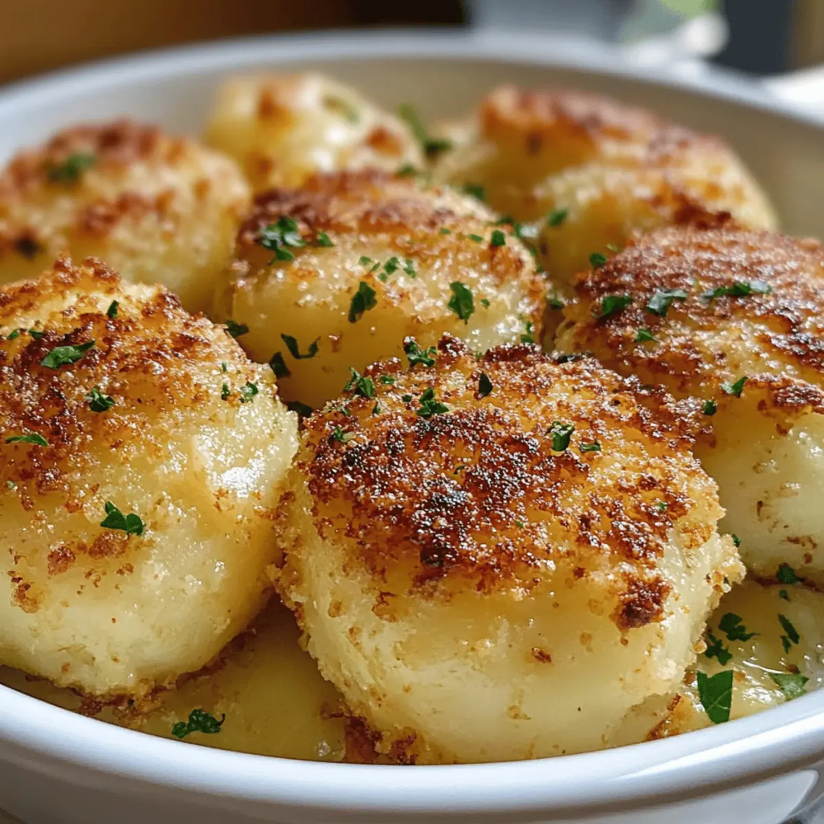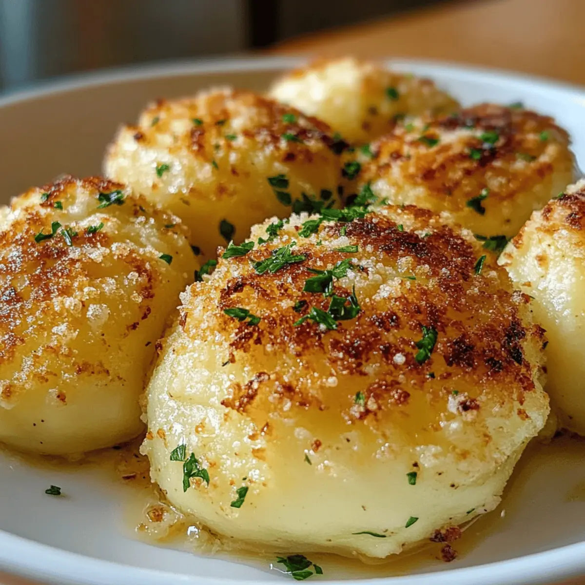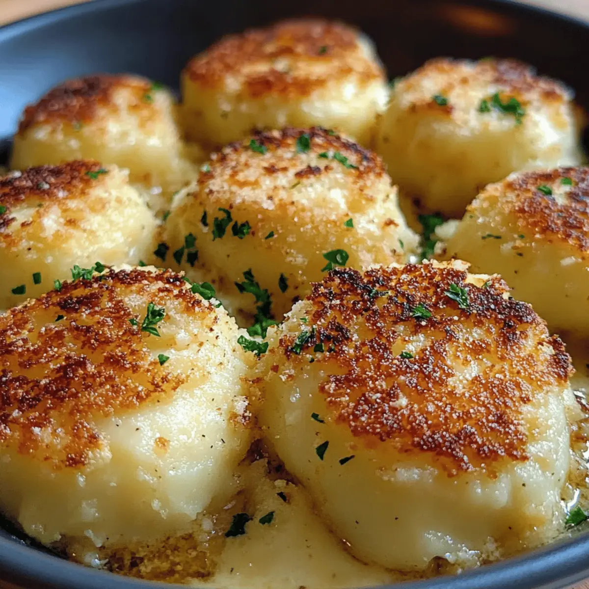 In meinem kleinen Küchenuniversum gehört die Zubereitung von Kartoffelklöße mit Knoblauchbutter und Parmesan-Kruste definitiv zu den Momenten, die mein Herz höher schlagen lassen. Diese köstlichen Klöße, gefüllt mit einer samtigen Knoblauchbutter und umhüllt von einer knusprigen Parmesan-Schicht, sind nicht nur ein wahrer Hingucker auf dem Tisch, sondern auch das perfekte Gericht, um Familie und Freunde zu begeistern. Sie sind schnell zubereitet und lassen sich nach Belieben variieren – ideal für alle, die eine gesunde, vegetarische Alternative zu schnellem Essen suchen. Glaubt mir, der erste Biss wird euch in eine Welt voller Geschmack und Freude entführen! Seid ihr bereit, eure Kochkünste auf ein neues Level zu heben? Warum sind diese Kartoffelklöße ein Muss? Einfachheit: Die Zubereitung ist kinderleicht, sodass auch Kochanfänger grandiose Ergebnisse erzielen. Sinnliche Aromen: Die Kombination aus frisch gehacktem Knoblauch und Parmesan verleiht den Klößen eine geschmackliche Tiefe, die eure Geschmacksknospen verzaubern wird. Vielseitigkeit: Ob als Hauptgericht oder Beilage – diese Klöße passen zu nahezu jeder Mahlzeit und können mit verschiedenen Kräutern abgewandelt werden. Gesund & Satt: Diese vegetarischen Kartoffelklöße bieten eine sättigende, nahrhafte Alternative zu Fast Food und stillen den Hunger auf köstliche Art. Familienfreundlich: Perfekt für Dinnerpartys oder ein entspanntes Familienessen – sie werden sicher zum Hit bei euren Liebsten! Vorbereitet: Die Klöße können im Voraus zubereitet und im Kühlschrank aufbewahrt werden, was sie zu einer zeitsparenden Wahl für hektische Tage macht! Schaut auch in unseren Artikel über vegetarische Beilagen, um weitere köstliche Ideen zu entdecken! Kartoffelklöße mit Knoblauchbutter Zutaten Für die Klöße: 1 kg mehligkochende Kartoffeln – Achte darauf, hochstärkende Kartoffeln zu verwenden, um die perfekte fluffige Konsistenz zu erreichen. 1 Eigelb – Bringt eine cremige Textur und hilft, den Teig zusammenzuhalten. 2 EL Kartoffelstärke – Sorgt für eine leichte und luftige Kloßtextur. Salz & Muskatnuss – Verleiht den Klößen eine geschmackliche Note; nach Belieben anpassen. Für die Füllung: 100 g weiche Butter – Die Basis für die aromatische Füllung, sorgt für zusätzlichen Reichtum und Feuchtigkeit. 2 Knoblauchzehen – Für einen intensiven Geschmack; kann je nach Vorliebe angepasst werden. 1 EL gehackte Petersilie – Frische in der Füllung; als Alternative können auch andere Kräuter verwendet werden. Für den Belag: 4 EL Semmelbrösel – Sorgt für eine knusprige Außenschicht; für glutenfreie Optionen einfach glutenfreie Semmelbrösel verwenden. 4 EL frisch geriebener Parmesan – Gibt eine köstliche, goldbraune Kruste; kann durch einen würzigen Käse ersetzt werden. 1 EL Butter (zum Bräunen) – Wird verwendet, um die Semmelbrösel und den Käse in der Pfanne zu rösten. Lasst euch von diesen Kartoffelklöße mit Knoblauchbutter verzaubern – sie sind nicht nur lecker, sondern auch eine wunderbare, hausgemachte Alternative zu schnellem Essen! Step-by-Step Instructions für Kartoffelklöße mit Knoblauchbutter Parmesan Step 1: Kartoffeln vorbereiten Setzen Sie einen großen Topf mit Salzwasser auf und bringen Sie ihn zum Kochen. Die mehligkochenden Kartoffeln ungeschält hineingeben und etwa 20–25 Minuten kochen, bis sie weich sind. Danach abgießen, schälen und durch eine Kartoffelpresse drücken. Lassen Sie die Kartoffeln vollständig ausdampfen, um eine fluffige Konsistenz für die Kartoffelklöße mit Knoblauchbutter zu gewährleisten. Step 2: Kloßteig herstellen In einer Schüssel die gepressten Kartoffeln mit dem Eigelb, der Kartoffelstärke, etwas Salz und Muskatnuss vermengen. Den Teig gut durchkneten, bis er geschmeidig ist. Lassen Sie ihn anschließend 15 Minuten ruhen, damit sich die Aromen entfalten können und der Teig sich besser verarbeitet lässt. Step 3: Knoblauchbutter-Füllung vorbereiten In einer kleinen Schüssel die weiche Butter mit den fein gehackten Knoblauchzehen, Petersilie, Salz und Pfeffer verrühren. Formen Sie die Mischung zu kleinen Bällchen und legen Sie diese für etwa 10 Minuten ins Gefrierfach. So behalten die Füllung ihre Form und fließen nicht beim Kochen der Kartoffelklöße. Step 4: Klöße formen Teilen Sie den Teig in gleich große Portionen und drücken Sie jede Portion flach in Ihrer Handfläche. Platzieren Sie ein gefrorenes Knoblauchbutterbällchen in der Mitte, und formen Sie den Teig vorsichtig um die Füllung, bis Sie glatte Klöße erhalten. Stellen Sie sicher, dass die Klöße gut versiegelt sind, um ein Auslaufen während des Kochens zu verhindern. Step 5: Klöße kochen In einem großen Topf Salzwasser zum Köcheln bringen und die geformten Kartoffelklöße vorsichtig hineinlegen. Lassen Sie sie 15–20 Minuten garen, bis sie an die Oberfläche steigen. Das ist ein Zeichen dafür, dass sie fertig sind. Nehmen Sie die Klöße mit einem Schaumlöffel vorsichtig aus dem Wasser und lassen Sie sie gut abtropfen. Step 6: Parmesan-Kruste zubereiten In einer Pfanne etwas Butter bei mittlerer Hitze schmelzen. Fügen Sie die Semmelbrösel und den frisch geriebenen Parmesan hinzu und rösten Sie die Mischung unter ständigem Rühren, bis sie goldbraun und knusprig wird. Sehen Sie aufmerksam zu, damit die Mischung nicht anbrennt und eine perfekte Kruste für die Kartoffelklöße mit Knoblauchbutter wird. Step 7: Klöße panieren Die gekochten Kartoffelklöße in die Pfanne mit der knusprigen Parmesan-Mischung geben und vorsichtig darin wenden, bis sie gleichmäßig bedeckt sind. Dies verleiht den Klößen eine köstliche, goldene Kruste. Servieren Sie die Klöße sofort, um den perfekten Crunch zu genießen und Ihre Gäste mit diesem köstlichen Gericht zu begeistern. Kartoffelklöße mit Knoblauchbutter Variationen Lasst euch von der Vielseitigkeit dieser wunderbaren Kartoffelklöße inspirieren – es gibt unzähli