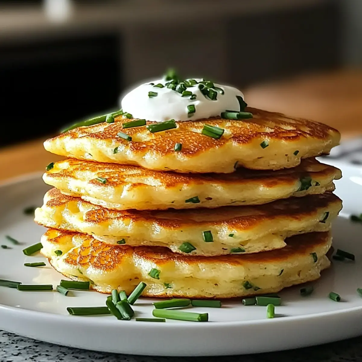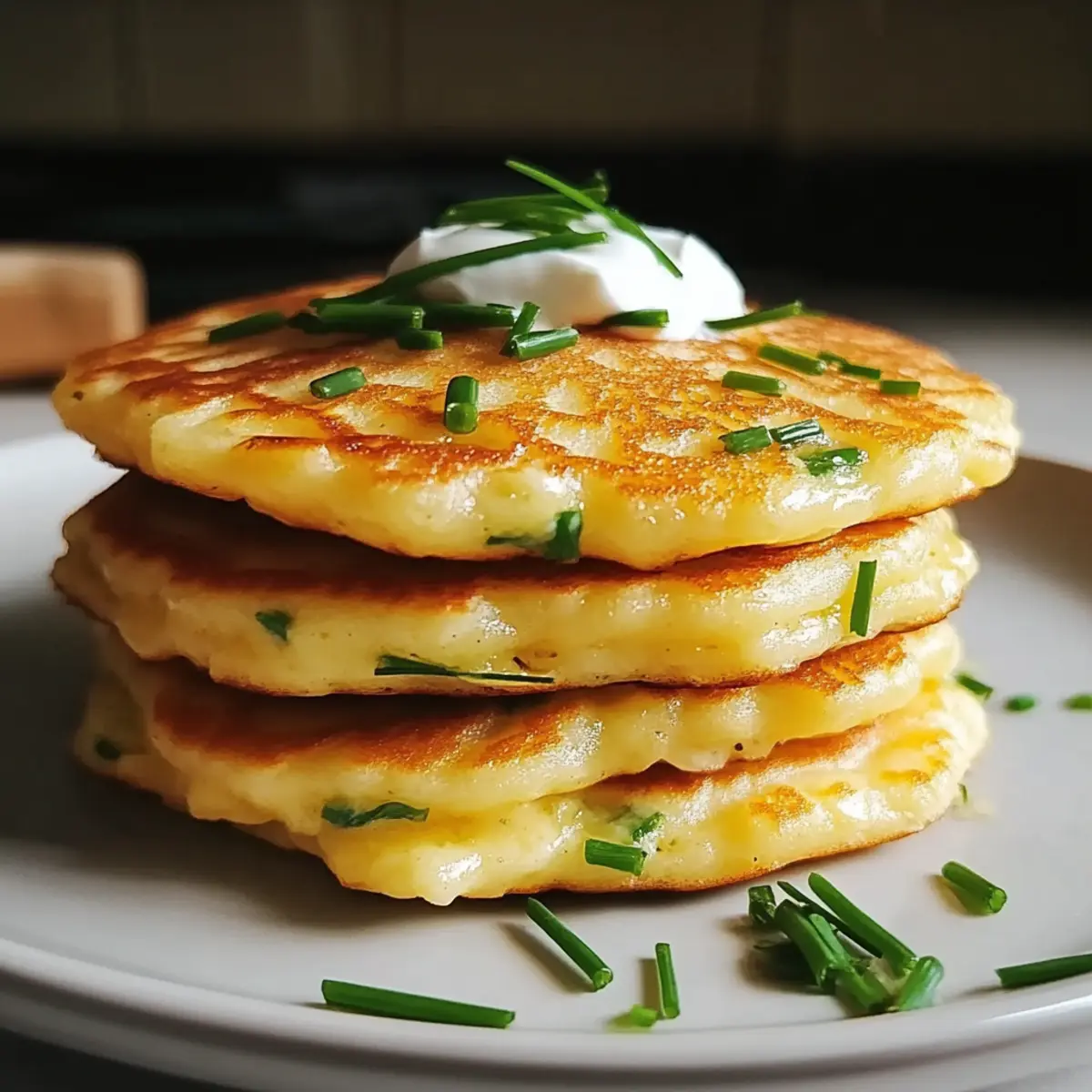 Wiederhole die Schritte mit dem verbleibenden Teig und stelle sicher, dass die Pfanne gut geölt bleibt. Sobald alle Käse und Schnittlauch Pfannkuchen fertig sind, serviere sie warm. Du kannst sie nach Belieben mit frischem Schnittlauch oder einem Klecks saurer Sahne garnieren.