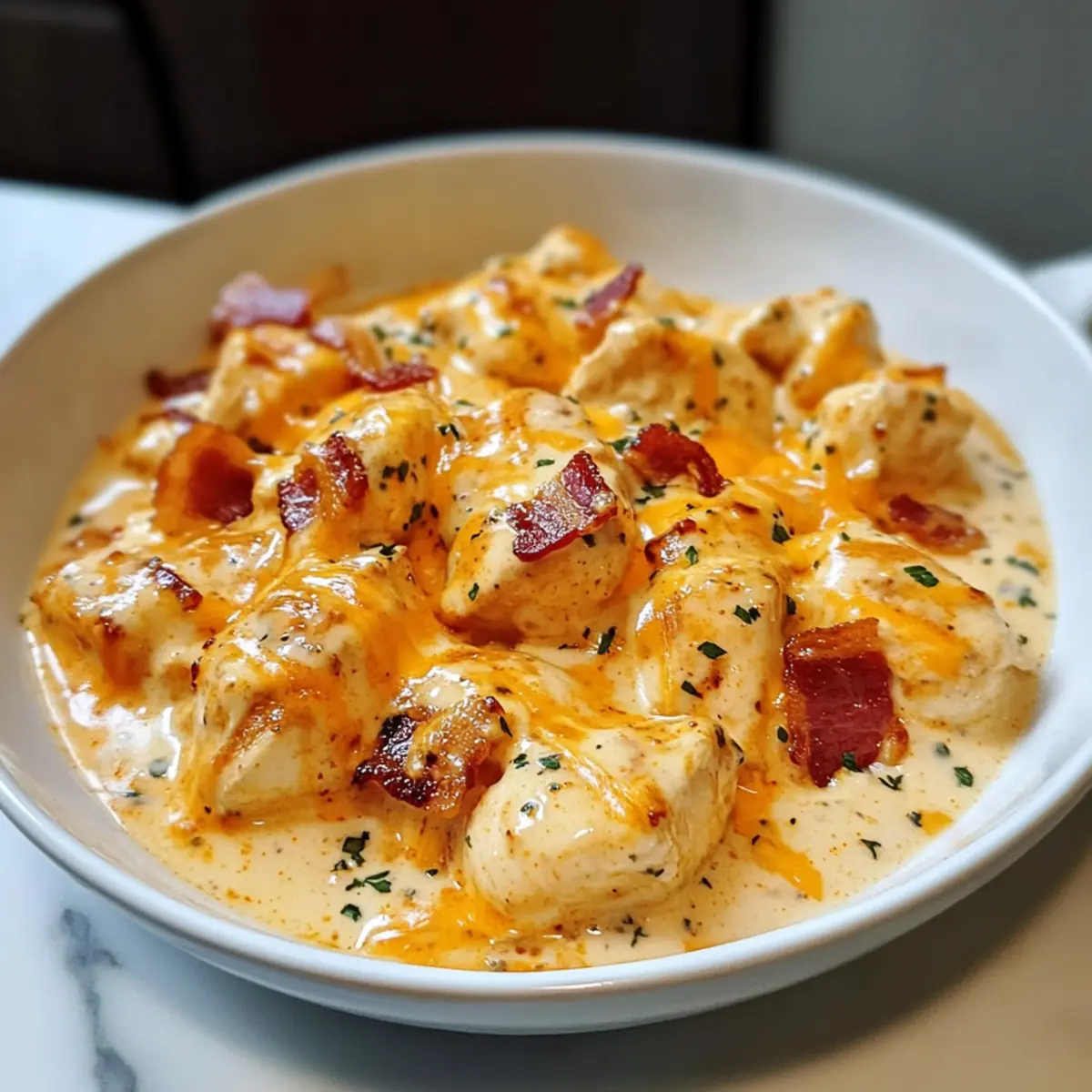 In derselben Pfanne das Hähnchen und das ausgelassene Fett beiseite und brate nun kleinen, gewürfelten Bacon knusprig an. Dies sollte etwa 4-5 Minuten dauern. Füge nach dem Braten das Ranch-Gewürz hinzu und vermische alles gut, sodass der köstliche Bacon-Geschmack das Aroma des Hähnchens intensiviert.