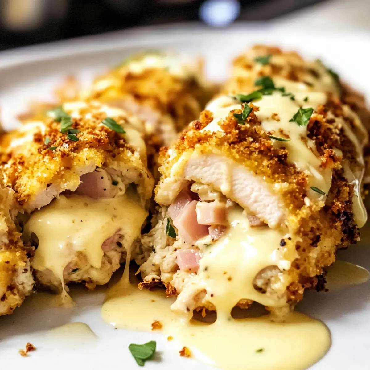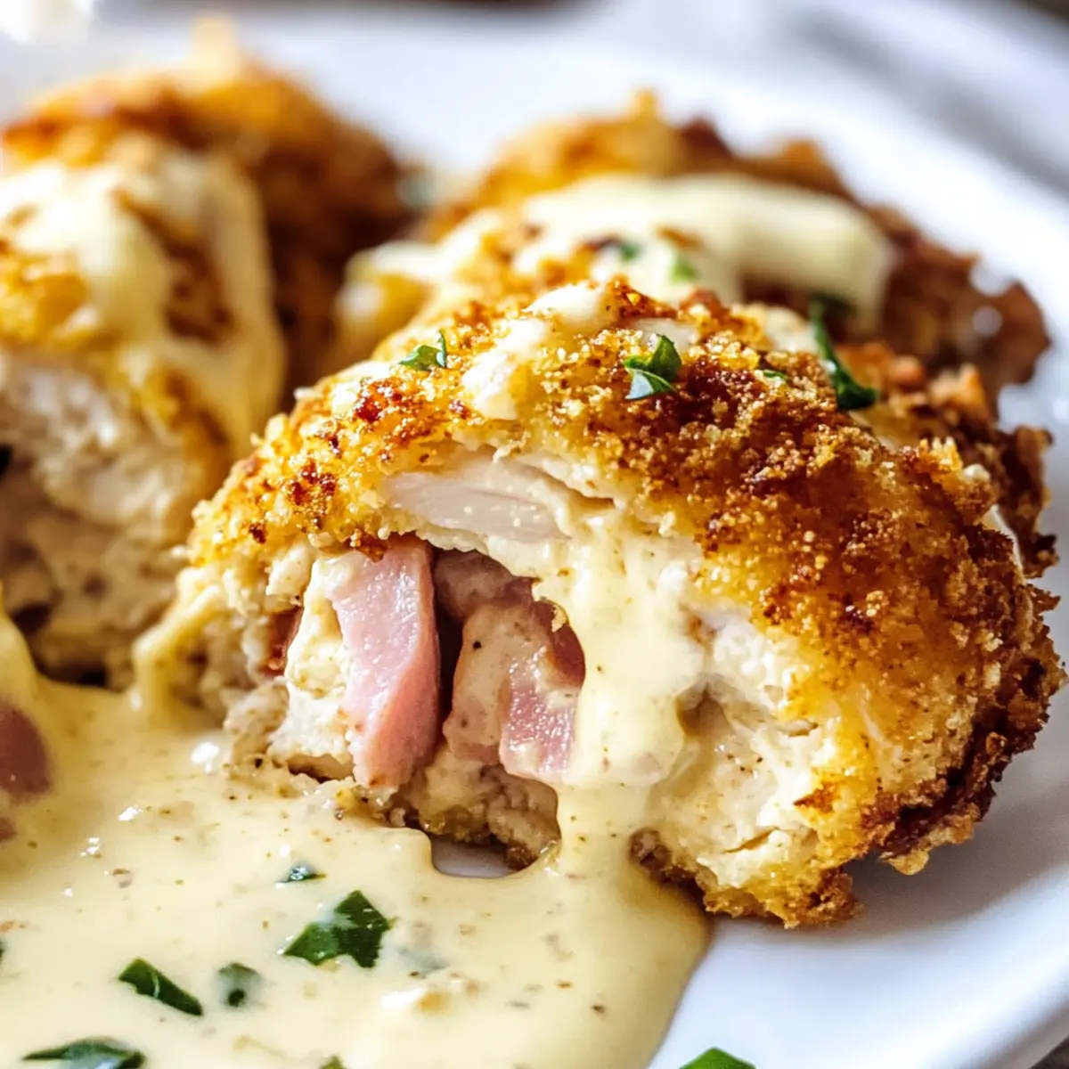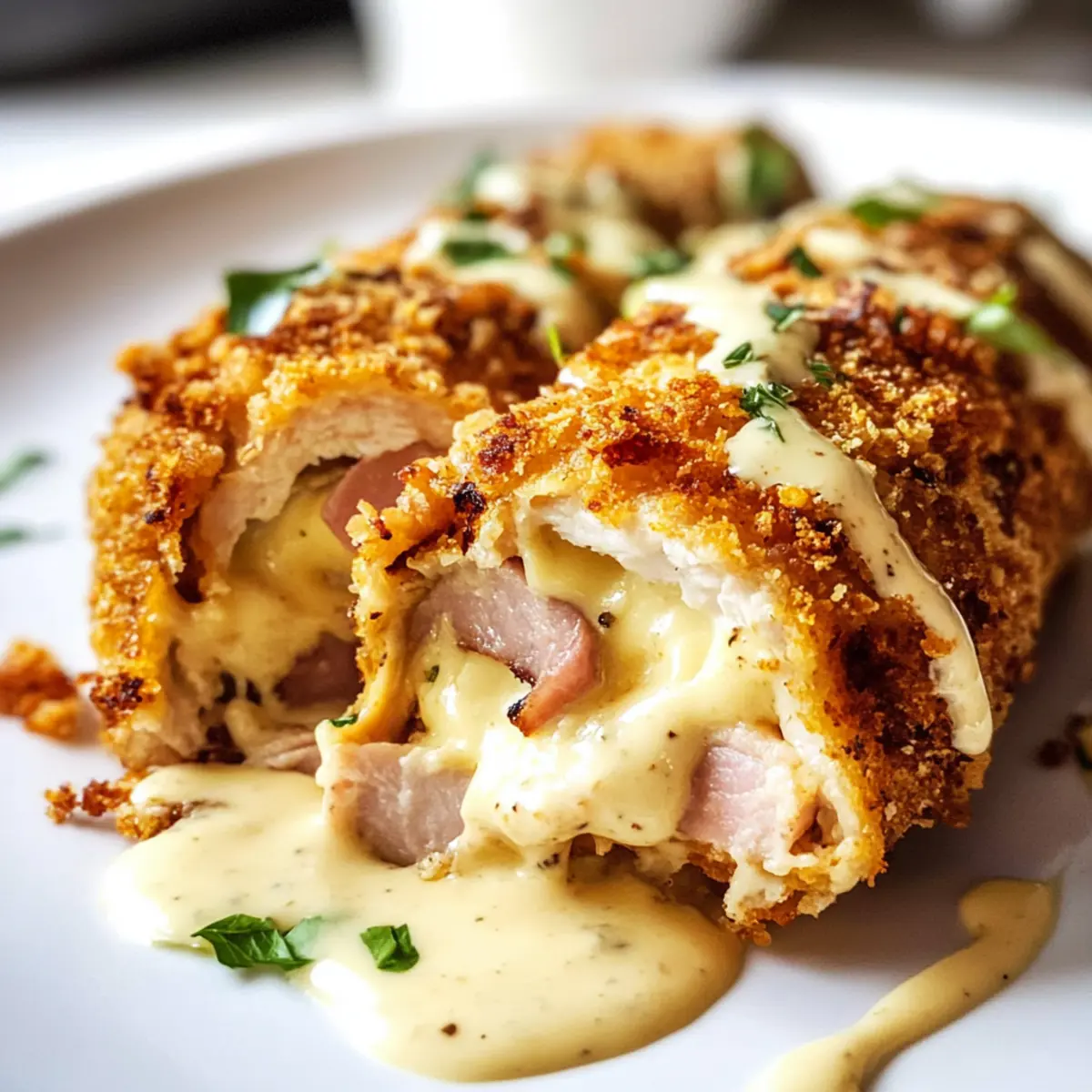 Der erste Biss in dieses Keto Hähnchen Cordon Bleu ist wie eine Reise in die besten Küchen der Welt, ohne das Haus zu verlassen. Saftiges Hähnchen, umhüllt von einer knusprigen Kruste und gefüllt mit geschmolzenem Schweizer Käse und herzhaftem Schinken, trifft hier auf eine verführerische, cremige Parmesan-Sauce. Dieses Gericht ist nicht nur eine köstliche Abwandlung des klassischen Rezepts, sondern auch ideal für alle, die sich einer kohlenhydratarmen Ernährung verschrieben haben. Mit einer unkomplizierten Zubereitung und Anpassungsmöglichkeiten, sei es im Air Fryer oder im Ofen, verwandelt sich ein gewöhnlicher Abend in ein wahres Festmahl. Wie klingt das für deinen nächsten Dinner-Abend? Warum wirst du dieses Rezept lieben? Einfachheit auf höchstem Niveau: Die Zubereitung ist unkompliziert, und du benötigst nur grundlegende Kochkenntnisse, um dieses köstliche Gericht zu meistern. Reichhaltiger, herzhafter Geschmack: Die Kombination aus geschmolzenem Käse, herzhaftem Schinken und einer cremigen Parmesan-Sauce sorgt für ein geschmackliches Erlebnis, das die Geschmacksknospen zum Tanzen bringt. Zwei Klassiker auf einmal: Hier vereinen sich die Lieblingszutaten in einem Gericht, das sowohl Sättigung als auch Geschmack bietet. Es ist die perfekte Lösung für einen gemütlichen Abend! Vielseitigkeit ist der Schlüssel: Egal, ob du es im Air Fryer oder im Ofen zubereitest, du kannst die Methode wählen, die dir am besten passt. Probiere auch Bombastische Spitzkohl Hackfleisch als unkomplizierte Beilage! Schnell und zeitsparend: Mit der Möglichkeit, die Hähnchenfüllung und Sauce im Voraus zuzubereiten, kannst du wertvolle Zeit sparen und trotzdem ein Gericht servieren, das wie ein Gourmet-Mahl aussieht. Perfekt für jeden Anlass: Ob für ein romantisches Dinner oder ein Treffen mit Freunden, dieses Keto Hähnchen Cordon Bleu wird garantiert ein Hit! Keto Hähnchen Cordon Bleu Zutaten Für das Hähnchen • Entbeinte Hähnchenbrust oder -schenkel – Die Hauptproteinquelle; Schenkel sorgen für mehr Saftigkeit, während Brustfilets mager sind. • Salz und Pfeffer – Essentiell für die Würze; nach persönlichem Geschmack anpassen. • Scheiben Schweizer Käse – Bietet Cremigkeit und Geschmack; kann durch Provolone oder Mozzarella ersetzt werden. • Scheiben Delikatessenschinken oder Truthahn – Fügt herzhaften Tiefgang hinzu; Truthahn ist eine magerere Option. • Eier (verquirlt) – Binden die Panade am Hähnchen; für eine vegane Option können Flachseier verwendet werden. • Parmesankäse – Bereichert die Paniermischung mit zusätzlichem Geschmack; frisch gerieben ist sehr zu empfehlen. • Mandelmehl – Fungiert als kohlenhydratarme Panade; kann durch Kokosmehl für eine glutenfreie Option ersetzt werden. • Italienische Gewürzmischung – Fügt geschmackliche Komplexität hinzu; kann bei Bedarf durch getrockneten Oregano oder Basilikum ersetzt werden. • Avocadoöl – Wird zum Frittieren verwendet und liefert gesunde Fette; kann beim Backen weggelassen werden. • Butter – Basis für die cremige Sauce; kann durch Olivenöl für eine milchfreie Variante ersetzt werden. Für die Sauce • Hühnerbrühe – Sorgt für Tiefe in der Sauce; benutze natriumarme Brühe für eine gesündere Variante. • Schlagsahne – Trägt zur Reichhaltigkeit der Sauce bei; kann durch kokosmilch für eine milchfreie Alternative ersetzt werden. • Frischkäse – Gewährleistet eine cremige Konsistenz der Sauce; veganen Frischkäse verwenden, falls gewünscht. • Dijon-Senf – Fügt der Sauce eine säuerliche Note hinzu; kann durch gelben Senf ersetzt werden. • Geriebener Parmesan – Verbessert den Geschmack der Sauce; eine Mischung verschiedner Käsesorten kann verwendet werden für einen variierenden Geschmack. Schritt-für-Schritt-Anleitung für Keto Hähnchen Cordon Bleu Step 1: Hähnchen vorbereiten Klopfe die entbeinten Hähnchenbrustfilets oder -schenkel auf eine Dicke von 0,5 cm. Dies sorgt für eine gleichmäßige Garung. Würze das Hähnchen anschließend großzügig mit Salz und Pfeffer, um den natürlichen Geschmack zu betonen. Achte darauf, dass die Gewürze gleichmäßig verteilt sind, damit jedes Stück perfekt gewürzt wird. Step 2: Hähnchen füllen Lege eine Scheibe Delikatessenschinken und eine Scheibe Schweizer Käse auf jedes Hähnchenstück. Achte darauf, die Füllung gleichmäßig zu verteilen. Rolle das Hähnchen von der breiten Seite her auf und sichere es mit Zahnstocher oder Küchengarn, damit die Füllung beim Kochen nicht herausfällt. Diese Fülltechnik sorgt dafür, dass das Keto Hähnchen Cordon Bleu saftig und aromatisch bleibt. Step 3: Panade vorbereiten Verquirle in einer Schüssel die Eier, um eine bindende Schicht für die Panade zu schaffen. In einer weiteren Schüssel mischst du Parmesan, Mandelmehl und italienische Gewürzmischung, die dem Hähnchen zusätzlichen Geschmack verleihen. Tauche die gefüllten Hähnchenröllchen zuerst in die verquirlten Eier und dann in die Panade, wobei du sie gut andrückst, damit die Panade haftet und eine knusprige Kruste entsteht. Step 4: Hähnchen garen Für den Air Fryer: Lege die Hähnchenröllchen mit der Naht nach unten in den Air Fryer. Sprühe sie leicht mit Avocadoöl ein und stelle die Temperatur auf 200 °C ein. Gare die Röllchen 8 Minuten, wende sie dann vorsichtig, sprühe erneut mit Öl ein und garen sie für weitere 6-10 Minuten, bis sie goldbraun sind und eine Kerntemperatur von 70 °C erreicht haben. Lasse das Hähnchen anschließend für 10 Minuten ruhen, damit der Saft sich setzen kann. Step 5: Hähnchen in der Pfanne/Ofen garen Erhitze etwas Butter oder Öl in einer großen Pfanne bei mittlerer Hitze. Brate die gefüllten Hähnchenröllchen 4 Minuten lang, bis sie goldbraun sind. Wende sie vorsichtig und brate die andere Seite für weitere 3 Minuten. Übertrage die Röllchen dann in eine Auflaufform und backe sie bei 180 °C für 15-20 Minuten, bis sie vollständig durc