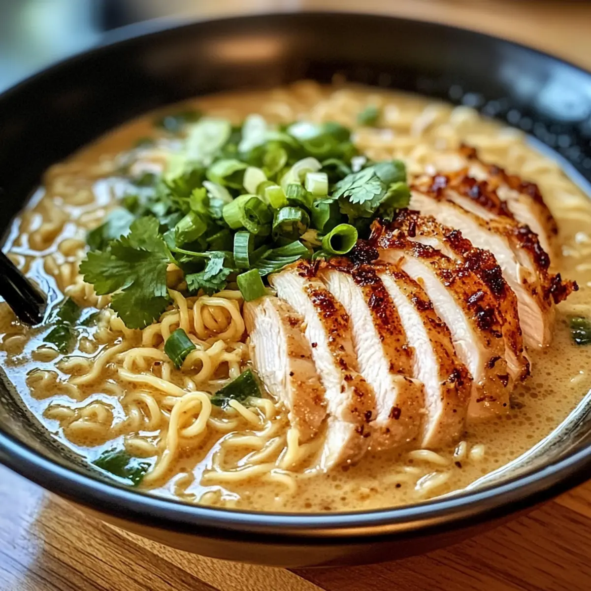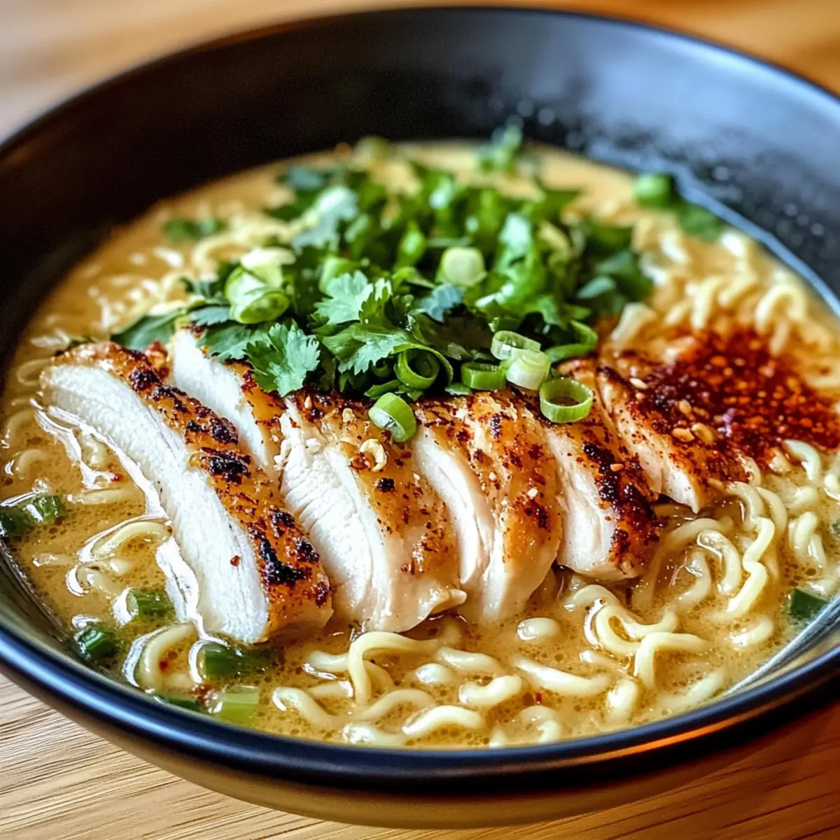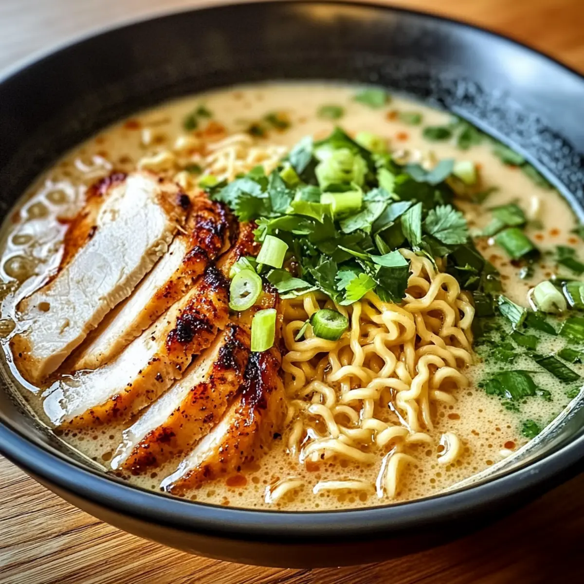 Als ich letzte Woche von einem langen Arbeitstag nach Hause kam, schwebte mir ein ganz besonderer Gedanke im Kopf: Wie wäre es mit einem Knoblauch-Hühnchen-Ramen, der nicht nur schnell zubereitet, sondern auch ein absoluter Genuss ist? Diese cremige und herzhafte Schüssel verbindet zartes Hühnchen mit einer samtigen Knoblauchbrühe und perfekt gegarten Nudeln – einfach himmlisch! Ideal für hektische Wochentage, bietet dieses Rezept die Möglichkeit, die Zutaten ganz nach deinem Geschmack anzupassen. Außerdem ist es familientauglich und kann einfach in eine vegetarische Version verwandelt werden. Schmeißt du noch einen Blick auf das Rezept und entdeckst, wie vielseitig und schnell köstliche Hausmannskost sein kann? Warum wirst du dieses Rezept lieben? Einfachheit: Du wirst überrascht sein, wie einfach die Zubereitung ist – perfekt für Gastgeber. Mit wenigen Zutaten zauberst du ein leckeres Gericht in nur 30 Minuten. Vielseitigkeit: Egal, ob du es scharf oder mild magst, die Anpassungsfähigkeit ermöglicht es, die Aromen genau nach deinem Wunsch zu gestalten. Probiere zum Beispiel das Rezept mit verschiedenen Gemüsesorten oder wechsle zwischen Hähnchen und Tofu für eine vegetarische Option. Cremige Köstlichkeit: Die Kombination aus cremiger Brühe mit frischem Knoblauch verleiht deinem Essen eine ganz besondere Note und bringt die Aromen zum Leben. Familienfreundlich: Dieses Rezept erfreut die gesamte Familie und lässt sich auch gut im Voraus vorbereiten – ideal für hektische Wochentage. Wenn du noch mehr Inspiration benötigst für schnelle Rezepte, schau dir unsere Sammlung an schnellen Abendessen an. Raffiniert und gemütlich: Perfekt für entspannte Abende, wenn du gemütlich und lecker essen möchtest! Knoblauch-Hühnchen-Ramen Zutaten • Dieser Abschnitt hilft dir, alle nötigen Zutaten auf einen Blick zu finden, um dein köstliches Knoblauch-Hühnchen-Ramen zuzubereiten. Für das Hühnchen Hähnchenbrust ohne Haut – liefert das Hauptprotein und sorgt für zarte Stücke. Kann durch Tofu für eine vegetarische Option ersetzt werden. Für die Brühe Hühnerbrühe – die geschmackvolle Basis des Gerichts, die Tiefe verleiht. Vegetarische Brühe ist eine tolle Alternative für die fleischlose Variante. Wasser – verdünnt die Brühe und sorgt für die gewünschte Konsistenz. Für die Nudeln Ramen-Nudeln – die Hauptkarbohydratquelle; sie garen schnell. Kann durch Udon-Nudeln oder glutenfreie Variationen ersetzt werden. Für die Cremigkeit Schlagsahne – fügt eine wunderbare Reichhaltigkeit hinzu. Für eine leichtere Version kann man die Hälfte durch Milch ersetzen. Für den Geschmack Knoblauch (gehackt) – gibt den unverwechselbaren, aromatischen Geschmack. Frischer Knoblauch sorgt für die beste Aromenentfaltung. Olivenöl – ideal zum Anbraten und fügt gesunde Fette hinzu. Kann durch Pflanzenöl ersetzt werden. Sojasauce – verstärkt den Umami-Geschmack der Brühe. Für glutenfreie Optionen Tamari verwenden. Für die Würze Ingwer (gerieben) – bringt Wärme und einen leichten Kick. Frisch ist bevorzugt, aber gemahlener Ingwer ist auch möglich. Rote Paprikaflocken (optional) – verleiht Schärfe; je nach Vorliebe anpassen. Für ein milderes Gericht weglassen. Salz und Pfeffer – einfache Gewürze, die den Geschmack abrunden. Für die Garnitur Frühlingszwiebeln (in Scheiben) – sorgen für Farbe und Frische. Chinakohl ist eine gute Alternative. Frischer Koriander (optional) – bringt zusätzliche Frische ins Gericht. Kann durch Petersilie ersetzt werden. Für das Gemüse Gemüse (z.B. Spinat, Pak Choi, Paprika) – sorgt für eine nahrhafte Ergänzung und Vielfalt. Verwende deine bevorzugten schnell garenden Gemüsesorten. Step-by-Step Instructions für Knoblauch-Hühnchen-Ramen Step 1: Hähnchen braten Erhitze in einem großen Topf 2 Esslöffel Olivenöl auf mittelhoher Stufe. Würze die Hähnchenbrust mit Salz und Pfeffer und brate sie 5-7 Minuten pro Seite oder bis sie goldbraun und durchgegart ist. Entferne das Hähnchen aus dem Topf, lasse es kurz ruhen und schneide es dann in mundgerechte Stücke. Step 2: Knoblauch und Ingwer anbraten Im selben Topf füge 3 gehackte Knoblauchzehen und 1 Teelöffel geriebenen Ingwer hinzu und brate sie für 1-2 Minuten an, bis sie aromatisch sind. Achte darauf, dass der Knoblauch nicht verbrennt; die Mischung sollte goldbraun und duftend sein. Dies ist der Schlüssel zur Geschmacksbasis für das Knoblauch-Hühnchen-Ramen. Step 3: Brühe ansetzen Gib nun 4 Tassen Hühnerbrühe und 2 Tassen Wasser in den Topf. Rühre gut um und bringe die Mischung zum Simmern. Lass die Brühe für etwa 5 Minuten leise köcheln, damit die Aromen sich entfalten können. Währenddessen kannst du die Ramen-Nudeln vorbereiten. Step 4: Ramen-Nudeln kochen Füge die Ramen-Nudeln direkt in die simmernde Brühe hinzu und koche sie gemäß den Verpackungshinweisen, etwa 4-5 Minuten. Die Nudeln sollten weich, aber noch bissfest sein, bevor du mit dem nächsten Schritt fortfährst. Rühre gelegentlich um, damit sie nicht zusammenkleben. Step 5: Cremige Sauce zubereiten Reduziere die Hitze auf niedrig und rühre 1 Tasse Schlagsahne sowie 2 Esslöffel Sojasauce ein. Lasse die Mischung für etwa 2-3 Minuten weiter köcheln, bis sie cremig und leicht eingedickt ist. Die Kombination aus Sahne und Sojasauce verleiht dem Knoblauch-Hühnchen-Ramen eine herrlich reichhaltige Konsistenz. Step 6: Brühe andicken Um die Brühe weiter zu verdicken, vermische 1 Esslöffel Speisestärke mit 2 Esslöffeln Wasser und gib die Mischung in den Topf. Rühre kräftig um, bis die Brühe die gewünschte Konsistenz erreicht hat. Achte darauf, die Brühe nicht zu stark eindicken zu lassen; sie sollte reichhaltig, aber flüssig bleiben. Step 7: Gemüse hinzufügen Füge 2 Tassen frisch gewaschenes Gemüse, wie Spinat oder Pak Choi, hinzu und koche sie in der Brühe, bis sie verwelkt sind – das dauert etwa 2-3 Minuten. Das Gemüse sorgt nicht nur für Farbe, so