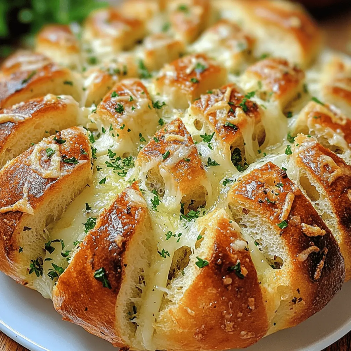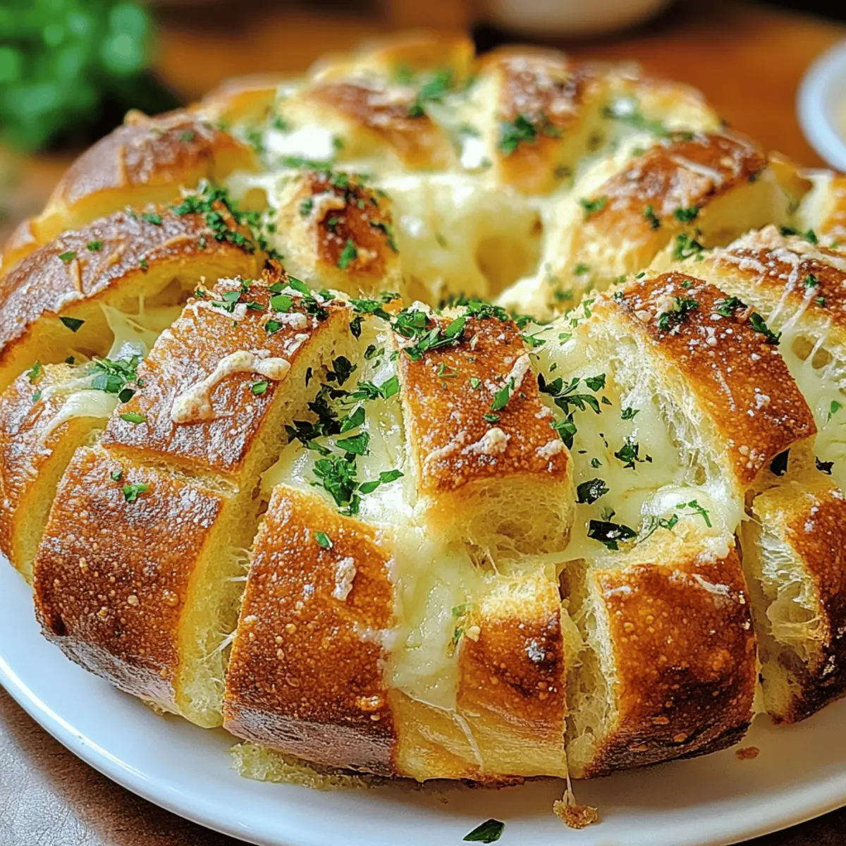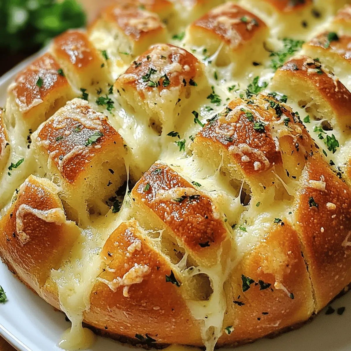 Die ersten Aromen, die deine Küche durchdringen, sind knoblauchig und käseartig – und ich kann dir gar nicht sagen, wie sehr mich das an gemütliche Abende mit Freunden erinnert! Heute teile ich mein Knoblauch Parmesan Zupfbrot Rezept Einfach und Schnell, das nicht nur deine Gäste in Staunen versetzen wird, sondern auch in weniger als einer Stunde bereit ist. Es eignet sich hervorragend als Snack oder Appetizer für gesellige Runden und ist dabei kinderleicht zuzubereiten. Übrigens, dieses Rezept ist nicht nur für Vegetarier ein Hochgenuss – es lässt sich auch leicht anpassen, um glutenfreien oder veganen Vorlieben gerecht zu werden. Wer könnte da widerstehen? Bist du bereit, gemeinsam in das knusprige Vergnügen einzutauchen? Warum ist dieses Zupfbrot so beliebt? Einzigartiger Geschmack: Dieses Knoblauch Parmesan Zupfbrot ist ein echter Geschmackstraum, der mit einer perfekten Kombination aus Knoblauch, Parmesan und italienischen Kräutern begeistert. Einfache Zubereitung: Mit nur wenigen Handgriffen ist es schnell und unkompliziert gemacht – ideal, wenn die Zeit drängt. Vielseitig: Egal, ob du es mit einer leichten Salad Kombination oder einem herzhaften Dip wie unserem Bete Dip Rezept servierst, es passt immer! Crowd-Pleaser: Egal ob beim Filmabend oder geselligem Beisammensein, es wird garantiert schnell vergriffen sein. Anpassungsfähig: Mithilfe von Variationen wie veganer oder glutenfreier Variante kannst du es an die Vorlieben deiner Gäste anpassen. Köstlicher Duft: Der verführerische Geruch wird deine Gäste schon beim Backen in die Küche locken! Knoblauch Parmesan Zupfbrot Zutaten • Ob du ein erfahrener Koch bist oder gerade erst anfängst, dieses Knoblauch Parmesan Zupfbrot Rezept Einfach und Schnell wird dich begeistern! Für den Teig Artisanbrot – bietet eine herzhafte Basis mit toller Textur, wähle runde oder ovale Formen. Ungesalzene Butter – sorgt für Reichtum und leitet den Knoblauchgeschmack weiter; ersetze sie durch Olivenöl für eine leichtere Version. Für die Füllung Knoblauch – essenziell für den Geschmack; fein gehackt für gleichmäßige Verteilung; verwende gerösteten Knoblauch für eine süßere Note. Parmesankäse – schafft eine reichhaltige, käseartige Kruste; ersetze ihn durch Mozzarella für eine weichere Textur. Getrocknete italienische Kräuter – heben das Geschmacksprofil an (Oregano, Basilikum, Thymian); frische Kräuter intensivieren den Geschmack. Rote Chiliflocken – optional für einen würzigen Kick; nach Geschmack anpassen oder weglassen für eine mildere Variante. Für die Garnierung Frische Petersilie – für Garnitur und Frische; ersetze sie durch andere frische Kräuter wie Basilikum für Variation. Salz – verstärkt alle Aromen; nach Geschmack verwenden. Schritt-für-Schritt-Anleitung für Knoblauch Parmesan Zupfbrot Rezept Einfach und Schnell Schritt 1: Ofen vorheizen Heize deinen Ofen auf 190°C vor. Dies sorgt dafür, dass das Knoblauch Parmesan Zupfbrot gleichmäßig und perfekt knusprig gebacken wird. Während der Ofen aufheizt, kannst du mit den anderen Vorbereitungen beginnen. Schritt 2: Buttermischung zubereiten In einer Schüssel schmelze die ungesalzene Butter und füge den fein gehackten Knoblauch, die getrockneten italienischen Kräuter, die roten Chiliflocken und das Salz hinzu. Rühre alles gut um, bis die Zutaten gut vermischt sind. Diese aromatische Mischung wird das Zupfbrot durchdringen und für den köstlichen Geschmack sorgen. Schritt 3: Brot vorbereiten Nimm das Artisanbrot und schneide es in tiefen Schlitzen in einem Kreuzmuster ein, achte darauf, die Unterseite nicht durchzuschneiden. Diese Schnitte schaffen perfekte Taschen für die köstliche Füllung und sorgen für eine großartige Textur. Schritt 4: Knoblauchbutter auftragen Verwende einen Pinsel oder einen Löffel, um die Knoblauchbuttermischung großzügig in die Einschnitte des Brotes zu streichen. Achte darauf, dass die Mischung gut verteilt ist, damit jede Bissportion voller Geschmack ist. Dies ist der Moment, in dem das Knoblauch Aroma seinen Weg in das Brot findet. Schritt 5: Parmesan hinzufügen Streue den frisch geriebenen Parmesan gleichmäßig über das Brot, lass ihn in die Schnitte fallen, um das Zupfbrot geschmacklich aufzuwerten. Der Käse wird während des Backens schmelzen und eine herrlich knusprige Kruste bilden, die einfach unwiderstehlich ist. Schritt 6: Brot einwickeln Wickle das gefüllte Brot in Aluminiumfolie ein und lege es auf ein Backblech. Dies verhindert, dass das Brot zu schnell austrocknet und hilft dabei, die Aromen im Inneren zu versiegeln. Bereite dich auf die köstlichen Düfte vor, die bald deine Küche erfüllen werden. Schritt 7: Backen Schiebe das Brotpaket in den vorgeheizten Ofen und backe es für 15-20 Minuten. Achte darauf, dass das Brot am Ende dieser Zeit schön warm und weich ist, aber noch nicht ganz knusprig. Schritt 8: Unwrap und Finish Backen Nimm das Brot aus dem Ofen, entferne vorsichtig die Aluminiumfolie und lege das Brot wieder in den Ofen. Backe es für weitere 5-10 Minuten, bis die Oberfläche goldbraun und knusprig ist. Dies gibt dir die perfekte Textur für dein Knoblauch Parmesan Zupfbrot. Schritt 9: Abkühlen und Garnieren Lass das Zupfbrot kurz abkühlen, bevor du es in Stücke reißt. Garniere es kurz vor dem Servieren mit frischer, gehackter Petersilie, um einen Farbtupfer und zusätzliche Frische zu zaubern. Jetzt ist dein Knoblauch Parmesan Zupfbrot bereitet und bereit, genossen zu werden! Vorbereitung für das Knoblauch Parmesan Zupfbrot Rezept Einfach und Schnell Dieses Knoblauch Parmesan Zupfbrot Rezept Einfach und Schnell ist ideal für die Planung deiner Mahlzeiten! Du kannst die Knoblauchbuttermischung bis zu 24 Stunden im Voraus zubereiten und im Kühlschrank aufbewahren, um den Geschmack zu intensivieren. Das Brot selbst kann ebenfalls bereits am Vortag vorbereitet und in Folie eingewickelt werden, sodass es frisch bleibt. Wenn du bereit bist, es zu g