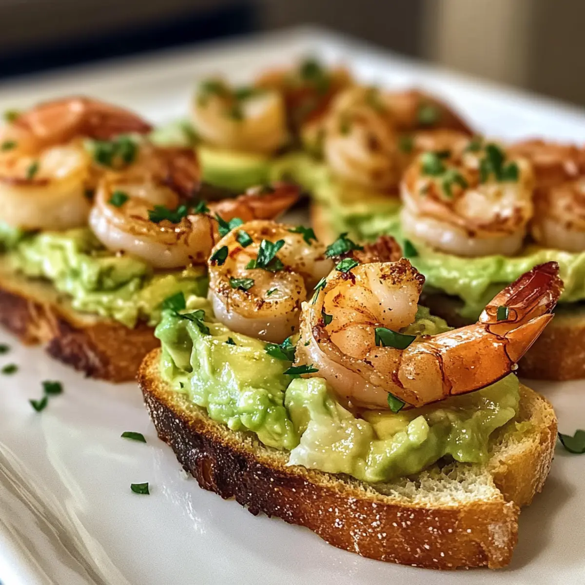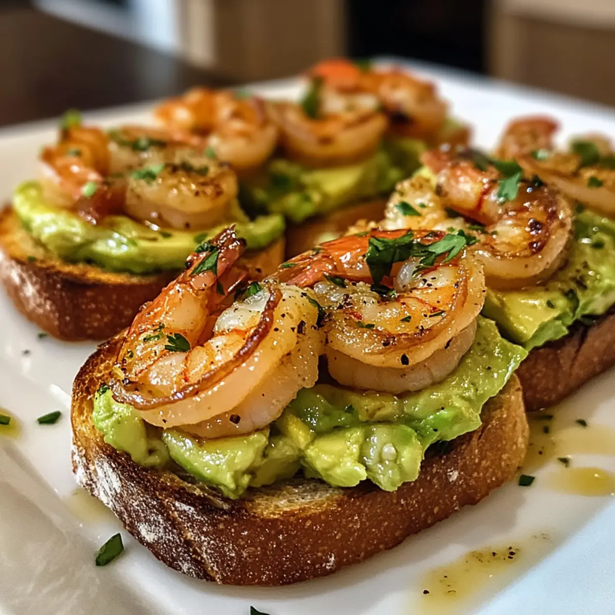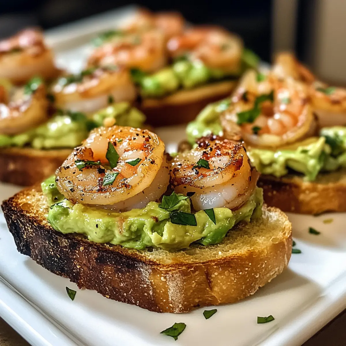 Knoblauchgarnelen-Crostini mit Avocado für unwiderstehliche Bissen, ein köstliches Snack-Rezept.