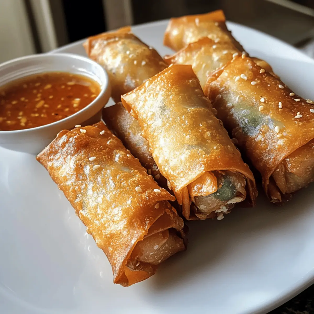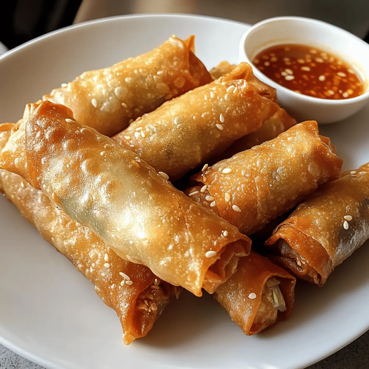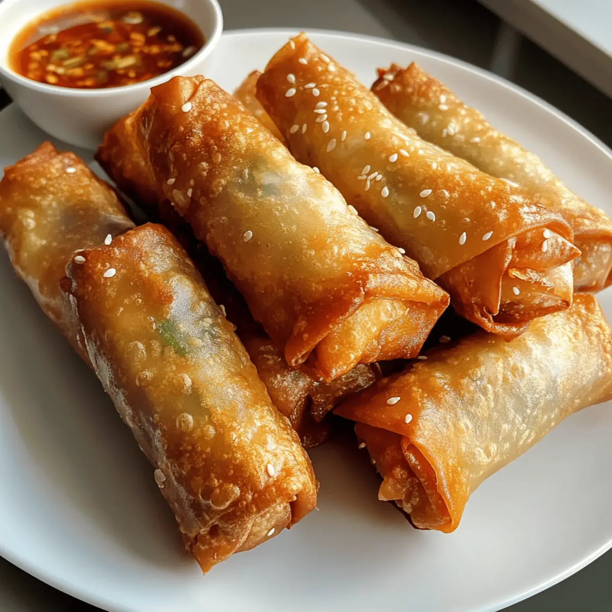 Ein verführerischer Duft zieht durch die Küche, wenn ich die knusprigen Hähnchen-Frühlingsrollen zubereite. Diese kleinen, goldbraunen Wunder sind nicht nur der perfekte Snack für gesellige Abende, sondern auch eine großartige Möglichkeit, frisches Gemüse und zartes Hähnchen in einem knusprigen Teig zu vereinen. Mit ihrer schnellen Zubereitungszeit von nur 15 Minuten und der Zubereitung im Airfryer sind sie eine gesunde Alternative zu herkömmlich frittierten Snacks, die euch den Genuss ohne das schlechte Gewissen schenken. Egal, ob für unerwartete Gäste oder ein schnelles Abendessen – diese Frühlingsrollen sind ein echtes Highlight. Wer kann da schon widerstehen? Glaubt mir, ihr wollt diese Behandlung nicht verpassen! Warum werden diese Frühlingsrollen dein Favorit? Schnell und einfach: In nur 15 Minuten zaubern Sie köstliche, knusprige Hähnchen-Frühlingsrollen, perfekt für unvorhergesehene Gäste. Wandelbar: Variieren Sie die Füllungen nach Belieben mit Shrimps oder Tofu, um jedem Geschmack gerecht zu werden. Leichter Genuss: Gekocht im Airfryer, sind sie eine gesunde Alternative zu frittieren Snacks, ohne das Fett! Kräftiger Geschmack: Die Kombination aus frischem Gemüse, zartem Hähnchen und aromatischen Gewürzen verführt die Geschmacksknospen. Perfekte Textur: Golden und knusprig außen, mit einer saftigen Füllung innen – ein Garant für Gaumenfreuden. Überraschend vielseitig: Servieren Sie die Frühlingsrollen mit einer leckeren Asiatischen Salatbeilage oder einer selbstgemachten süß-sauren Sauce, wie in Knusprige Spinat Feta oder Knusprige Wurst Suesskartoffel. Knusprige Hähnchen-Frühlingsrollen Zutaten • Entdecke die essenziellen Zutaten für diese köstlichen Frühlingsrollen! Hähnchen (Chicken) – sorgt für Saftigkeit und Proteine; bei Bedarf durch Shrimps oder festen Tofu ersetzen, um die Frühlingsrollen vegetarisch zu gestalten. Glasnudeln (Glass Noodles) – verleihen eine herzhafte Textur; dünne Reisnudeln sind ein guter Ersatz, aber achte darauf, sie nicht zu überweichen. Frühlingsrollenblätter (Spring Roll Wrappers) – umhüllen die Füllung; kümmere dich darum, eine auf einmal zu verwenden und die anderen abzudecken, damit sie nicht austrocknen. Karotten (Carrots) – bringen Süße und Feuchtigkeit; frische, saisonale Karotten erhöhen den Geschmack. Champignons (Mushrooms) – fügen einen umami-reichen Geschmack hinzu; Zucchini kann für eine gemüsige Variante verwendet werden. Frühlingszwiebeln (Spring Onions) – sorgen für Frische und Knusprigkeit; optional können Schalotten für einen milderen Geschmack genutzt werden. Sojasauce & Sesamöl (Soy Sauce & Sesame Oil) – geben Tiefe und Aroma; je nach Salzgeschmack anpassen. Knoblauch (Garlic) & Ingwer (Ginger) – verleihen aromatische Qualitäten; frische Zutaten sind die beste Wahl für intensiven Geschmack. Öl (Oil) – dient zum Bestreichen der Rollen für die Knusprigkeit; ein leichter Sprühnebel oder Pinselauftrag verhindert übermäßiges Fett. Step-by-Step Instructions for Knusprige Hähnchen-Frühlingsrollen Step 1: Nudeln vorkochen Kochen Sie die Glasnudeln gemäß den Anweisungen auf der Verpackung für etwa 3 Minuten, bis sie weich sind. Anschließend gut abspülen und abtropfen lassen. Schneiden Sie die Nudeln in kleinere Stücke, um die Füllung der Frühlingsrollen zu erleichtern. Diese Nudeln verleihen den knusprigen Hähnchen-Frühlingsrollen eine angenehme Textur. Step 2: Füllung zubereiten Erhitzen Sie eine Pfanne bei mittlerer Hitze und braten Sie die gewürfelten Hähnchenstücke mit Sojasauce, Sesamöl, Knoblauch und Ingwer an. Kochen Sie das Hähnchen, bis es goldbraun und durchgegart ist (ca. 5-7 Minuten). Fügen Sie die juliennierten Karotten, Champignons und Frühlingszwiebeln hinzu und sautieren Sie weitere 2 Minuten, damit das Gemüse knusprig bleibt. Step 3: Füllung mischen Geben Sie die abgetropften Glasnudeln zu dem angebratenen Hähnchen und Gemüse in die Pfanne und vermengen Sie alles gut. Schmecken Sie die Mischung mit weiteren Gewürzen ab, falls erforderlich, um die Aromen zu intensivieren. Diese Füllung ist der Schlüssel zu den köstlichen knusprigen Hähnchen-Frühlingsrollen, die Sie gleich zubereiten werden. Step 4: Frühlingsrollen rollen Legen Sie ein Frühlingsrollenblatt auf eine saubere Arbeitsfläche. Geben Sie 1-2 Esslöffel der Füllung auf das untere Drittel des Blattes. Klappen Sie die Seiten des Blattes ein und rollen Sie es fest von unten nach oben auf. Befeuchten Sie die Ränder mit Wasser oder Eiweiß, um die Rollen zu versiegeln und ein Auslaufen zu verhindern. Step 5: Airfryer vorheizen Heizen Sie den Airfryer auf 180°C vor, was etwa 3 Minuten benötigt. Währenddessen bereiten Sie die gerollten Frühlingsrollen vor. Bestreichen Sie die Oberseite der Rollen leicht mit Öl für zusätzliche Knusprigkeit und legen Sie sie in den Airfryer. Achten Sie darauf, dass genug Platz zwischen den Rollen bleibt. Step 6: Frühlingsrollen frittieren Garen Sie die Frühlingsrollen im Airfryer für 10-12 Minuten, bis sie goldbraun und knusprig sind. Drehen Sie sie nach der Hälfte der Garzeit vorsichtig um, um eine gleichmäßige Bräunung zu erzielen. Die knusprigen Hähnchen-Frühlingsrollen sind fertig, sobald sie eine goldene Farbe erreicht haben und angenehm duften. Step 7: Servieren Nehmen Sie die knusprigen Hähnchen-Frühlingsrollen vorsichtig aus dem Airfryer und lassen Sie sie kurz abkühlen. Servieren Sie sie mit Ihrer Lieblings-Dip-Sauce, wie zum Beispiel einer süß-sauren Sauce, und einem frischen Salat. Diese Kombination macht Ihre Mahlzeit perfekt und sorgt für einen zusätzlichen Geschmackskick! Was passt zu knusprigen Hähnchen-Frühlingsrollen? Diese köstlichen, goldbraunen Wunder verdienen ein vollendendes Menü, das ihre Aromen perfekt unterstreicht. Frischer asiatischer Salat: Eine Mischung aus knackigem Gemüse wie Gurken, Karotten und Rotkohl, leicht mit Reisessig und Sesamöl angemacht, bringt ei