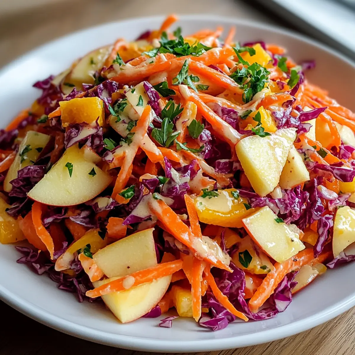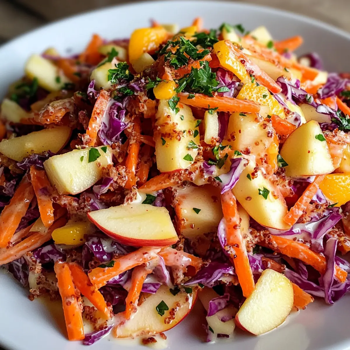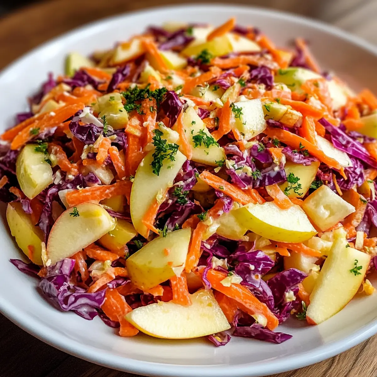 Als ich neulich in meinem Garten stand und die ersten sonnigen Frühlingstage genoss, fiel mir auf, wie wunderbar frisch und knackig die Zutaten gerade waren. Die Kombination aus süßen, knusprigen Äpfeln und erdigen Möhren hat nicht nur mein Geschmackserlebnis bereichert, sondern auch den Grundstein für meinen Knusprigen Apfel-Möhren-Salat mit cremigem Zitrus-Dressing gelegt. Diese gesunde, glutenfreie und vegetarische Leckerei ist perfekt für alle, die auf der Suche nach einer schnellen, aber geschmackvollen Zubereitung sind. Egal, ob für ein entspanntes Abendessen unter der Woche oder einen fröhlichen Picknickausflug – dieser Salat bringt frische Farbe und Energie auf den Tisch. Neugierig, wie einfach sich dieses Geschmackswunder zubereiten lässt? Lass uns gemeinsam in die Rezeptdetails eintauchen! Warum ist dieser Salat ein Muss? Frische Kombination: Der Knusprige Apfel-Möhren-Salat vereint eine köstliche Mischung aus süßen Äpfeln und erdigen Möhren – ein wahrer Genuss! Cremige Textur: Das cremige Zitrus-Dressing sorgt für einen herrlichen Kontrast zur knackigen Konsistenz der Zutaten. Schnelle Zubereitung: Mit minimalem Aufwand lässt sich dieses köstliche Gericht in kürzester Zeit zubereiten, perfekt für eilige Tage. Vielfältig einsetzbar: Ob als Beilage zu einem Grillabend oder als leichtes Mittagessen – dieser Salat passt zu jedem Anlass und erfreut alle. Gesund und nährstoffreich: Mit viel Obst und Gemüse ist dieser Salat nicht nur schmackhaft, sondern auch eine wahre Nährstoffbombe. Lass dich inspirieren und entdecke auch unsere anderen gesunden Rezepte wie gesunde Salate oder schnelle vegetarische Gerichte! Zutaten für den Knusprigen Apfel-Möhren-Salat • Für den Salat und das Dressing Karotten – verleihen eine süße, erdige Note und sind reich an Nährstoffen wie Beta-Carotin und Ballaststoffen. Äpfel – sorgen für eine saftige Süße; wähle Granny Smith für eine säuerliche Note oder Honeycrisp für mehr Süße. Rote Kohl – bringt eine lebendige Farbe und einen pfeffrigen Biss, der die Textur und den Geschmack verbessert. Trockenfrüchte (Rosinen/Cranberries) – erzeugen süße und säuerliche Geschmacksexplosionen im Salat. Nüsse (Walnüsse/Pekanüsse) – fügen einen reichhaltigen, gerösteten Geschmack und zusätzlichen Crunch hinzu. Frische Petersilie – sorgt für eine kräuterige Note, die die Süße und Reichhaltigkeit des Salates ausbalanciert. Griechischer Joghurt – bildet die cremige Basis, bietet eine angenehme Säure und Proteine bei glatter Konsistenz. Mayonnaise – erhöht die Cremigkeit und ermöglicht es dem Dressing, gut an den Zutaten zu haften. Orangensaft – verleiht dem Salat eine zitrische Süße, die alle Aromen harmonisch verbindet. Zitronensaft – sorgt für Frische und hebt den gesamten Geschmack hervor. Honig – fügt eine subtile Süße hinzu und unterstützt die Emulgierung des Dressings. Salz und Pfeffer – unverzichtbare Gewürze, die die Aromen verstärken und schärfen. Dieser Knuspriger Apfel-Möhren-Salat ist einfach zuzubereiten und bringt frische Leichtigkeit auf jeden Tisch. Schritt-für-Schritt-Anleitung für den Knusprigen Apfel-Möhren-Salat mit cremigem Zitrus-Dressing Step 1: Karotten vorbereiten Schäle die Karotten und reibe sie grob in eine große Rührschüssel. Achte darauf, dass die Karotten gleichmäßig gerieben sind, damit sie beim Mischen gut zur Geltung kommen. Dieser Schritt sorgt für die süße, erdige Basis des Knusprigen Apfel-Möhren-Salats. Step 2: Äpfel schneiden Entkerne die Äpfel und schneide sie in kleine Würfel, während du sie in die Schüssel mit den geriebenen Karotten gibst. Um ein Braunwerden der Äpfel zu verhindern, kannst du sie direkt nach dem Schneiden hinzufügen. Die frischen, saftigen Äpfel verstärken den Geschmack und die Textur des Salats. Step 3: Rotkohl und weitere Zutaten hinzufügen Schneide den roten Kohl fein und füge ihn in die Schüssel hinzu. Ergänze die Mischung mit Trockenfrüchten wie Rosinen oder Cranberries sowie gehackten Nüssen und frischer Petersilie. Diese Zutaten bringen zusätzliche Farben und Aromen in deinen Knusprigen Apfel-Möhren-Salat. Step 4: Dressing zubereiten In einer separaten Schüssel vermischt du griechischen Joghurt, Mayonnaise, Orangensaft, Zitronensaft, Honig, Salz und Pfeffer. Verwende einen Schneebesen, um alles gut zu verrühren, bis eine glatte und cremige Konsistenz entsteht. Dieses cremige Zitrus-Dressing ist der Schlüssel zu einem schmackhaften Salat. Step 5: Dressing untermischen Gieße das cremige Dressing über die vorbereitete Salatmischung und verwende zwei große Löffel, um alles vorsichtig zu vermengen. Achte darauf, dass das Dressing gleichmäßig verteilt ist und alle Zutaten gut umhüllt sind. So wird jeder Bissen des Knusprigen Apfel-Möhren-Salats zum Genuss. Step 6: Abschmecken Probiere den Salat und passe die Gewürze nach Belieben an. Du kannst mehr Salz, Pfeffer oder Honig hinzufügen, um den Geschmack zu intensivieren. Dieser Schritt ermöglicht es dir, den perfekten Geschmack für deinen Knusprigen Apfel-Möhren-Salat zu erreichen. Step 7: Salat kühlen Decke die Schüssel mit Frischhaltefolie ab und stelle den Salat für etwa 15 Minuten in den Kühlschrank. Das Kühlen lässt die Aromen miteinander verschmelzen und macht den Salat erfrischend, wenn er serviert wird. Step 8: Anrichten Vor dem Servieren kannst du den Salat nach Belieben mit zusätzlichen Nüssen oder Petersilie garnieren. Serviere den Knusprigen Apfel-Möhren-Salat entweder direkt aus dem Kühlschrank oder bei Zimmertemperatur für den besten Genuss. Lagerungstipps für den Knusprigen Apfel-Möhren-Salat Raumtemperatur:: Dieser Salat sollte nicht länger als 2 Stunden bei Raumtemperatur stehen, um die Frische zu gewährleisten. Kühlschrank:: Bewahre den Knusprigen Apfel-Möhren-Salat in einem luftdichten Behälter im Kühlschrank auf. Er bleibt bis zu 3 Tage frisch. Einfrieren:: Es wird nicht empfohlen, d