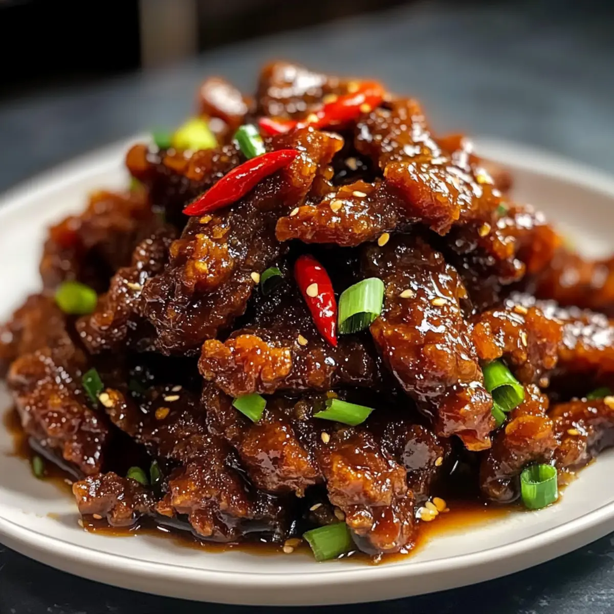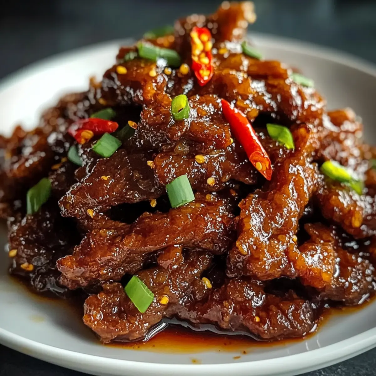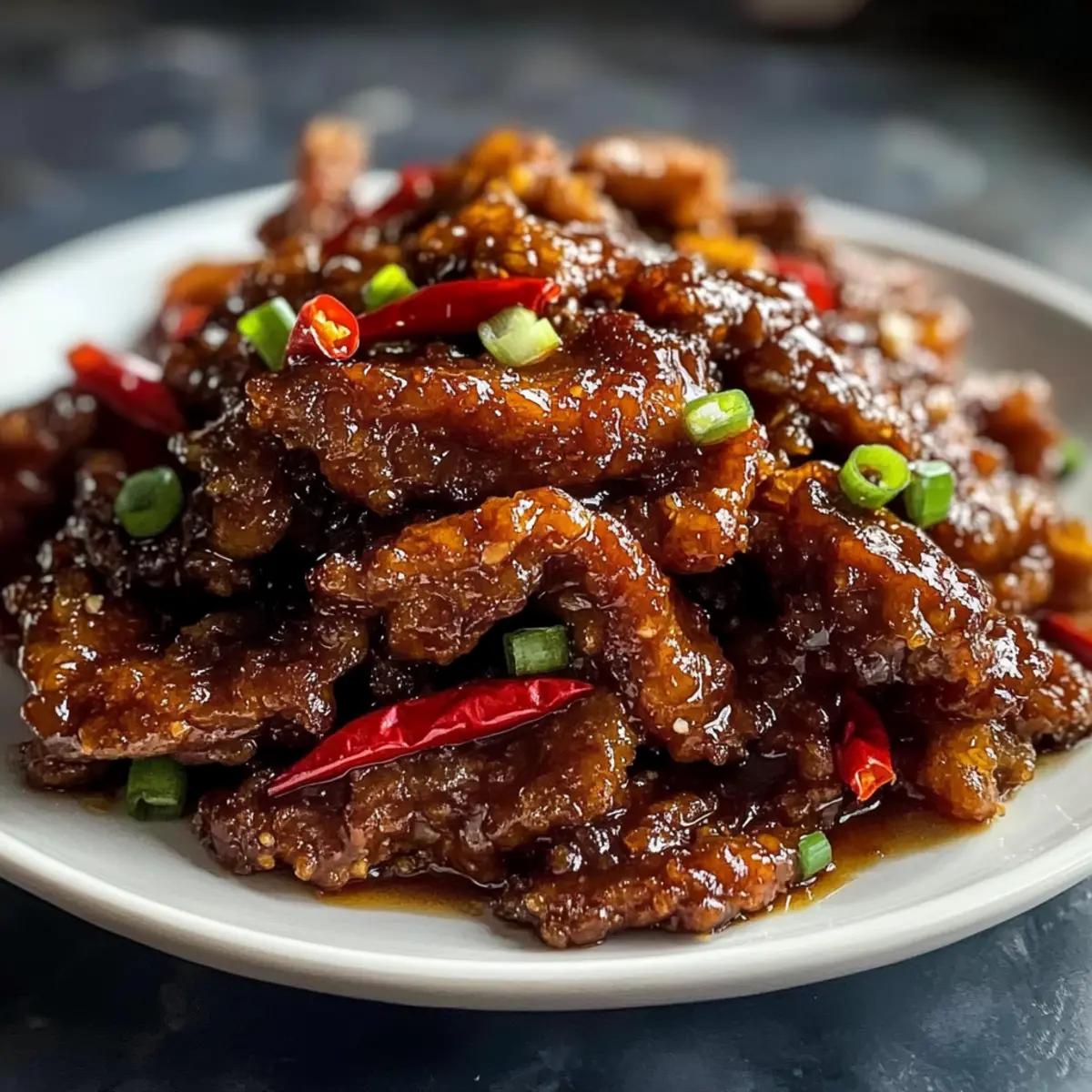 Kürzlich saß ich mit Freunden zusammen, als plötzlich die Aromen eines asiatischen Restaurants in der Luft lagen – und ich wusste, ich wollte ein Gericht nachkochen, das diese Geschmacksexplosion einfängt. Der Star des Abends wird mein Rezept für Knuspriges Chili Rindfleisch sein, das nicht nur unglaublich schnell zuzubereiten ist, sondern auch jedem Gaumen ein Lächeln ins Gesicht zaubert. Die Kombination aus knusprig gebratenem Rindfleisch, umhüllt von einer süß-scharfen Sauce und unterstützt von bunten Gemüsewürfeln, bringt nicht nur Abwechslung auf den Teller, sondern eignet sich auch perfekt für ein entspanntes Abendessen unter der Woche. Neugierig, wie du dieses köstliche Gericht zubereiten kannst? Lass uns gemeinsam den Kochlöffel schwingen! Warum wirst du dieses Rezept lieben? Einfachheit: Die Zubereitung ist kinderleicht und benötigt keine speziellen Kochfähigkeiten – perfekt für vielbeschäftigte Tage. Knuspriger Genuss: Das Rindfleisch wird außen wunderbar knusprig und innen zart, eine Kombination, die jeden begeistert. Vielfältige Optionen: Ob du Fleisch, Tofu oder eine glutenfreie Variante bevorzugst, dieses Rezept passt zu verschiedenen Vorlieben. Schnell und unkompliziert: In weniger als 30 Minuten steht ein köstliches Abendessen auf dem Tisch – ideal für hektische Wochentage. Geschmacksexplosion: Die harmonische Mischung aus süß, sauer und scharf lässt deine Geschmacksknospen tanzen. Probiere das Rezept heute aus und entdecke das Geheimnis für ein unvergessliches, schnelles Abendessen! Knuspriges Chili Rindfleisch Zutaten • Für die Panade • Rindfleisch-Sirloin oder -Flanksteak – Hauptprotein, dünn gegen die Faser geschnitten für mehr Zartheit; kann durch Hähnchen oder Schweinefleisch ersetzt werden. • Speisestärke – Sorgt für eine knusprige Beschichtung des Rindfleischs; glutenfreie Speisestärke ist eine gute Alternative. • Allzweckmehl – Fügt der Panade Struktur hinzu; verwende glutenfreies Mehl für eine glutenfreie Option. • Ei – Bindet die Panade; für eine vegane Variante kann ein Leinsamen-Ei verwendet werden. • Wasser – Verdünnt die Panade, um die richtige Konsistenz zu erreichen. • Backpulver – Sorgt für eine lockere Konsistenz der Panade. • Salz und Pfeffer – Für die Würze, nach Geschmack anpassen. • Für die Sauce • Sojasauce – Verleiht Umami-Geschmack; Tamari kann für glutenfreie Variante verwendet werden. • Reisessig – Fügt Säure hinzu, um die Aromen auszubalancieren. • Hoisinsauce – Bringt Süße und Tiefe; kann mit zusätzlicher Sojasauce und Honig substituiert werden. • Chilisauce – Sorgt für Schärfe; anpassen je nach Vorliebe. • Zucker – Balanciert die Schärfe aus. • Minced Knoblauch und Ingwer – Verstärken den Geschmack der Sauce. • Zwiebel und Paprika – Fügen Textur und Süße hinzu; können durch andere Gemüse wie Champignons oder Brokkoli ersetzt werden. • Rote Chilis – Optional für zusätzliche Schärfe; nach Geschmack anpassen. • Sesamöl – Sorgt für ein aromatisches und reichhaltiges Profil. • Chopped Frühlingszwiebeln – Zum Garnieren geeignet. Mit dieser Zusammenstellung sind Sie bestens gerüstet, um Ihr eigenes knuspriges Chili Rindfleisch zuzubereiten! Guten Appetit! Schritt-für-Schritt-Anleitung für Knuspriges Chili Rindfleisch Step 1: Rindfleisch schneiden Schneide das Rindfleisch in dünne Streifen, indem du es gegen die Faser schneidest. Dadurch bleibt das Fleisch zart und saftig. Achte darauf, gleichmäßige Stücke zu schneiden, damit sie gleichmäßig garen. Dies sollte etwa 5 Minuten in Anspruch nehmen. Step 2: Panade zubereiten Mische in einer Schüssel die Speisestärke, das Allzweckmehl, Backpulver, Salz und Pfeffer gut miteinander. Füge das Ei und Wasser hinzu und verrühre alles zu einem glatten Teig. Die Konsistenz sollte dickflüssig, aber gießbar sein. Dies dauert ca. 3–5 Minuten. Step 3: Rindfleisch panieren und frittieren Erhitze in einer großen Pfanne bei mittelhoher Hitze genug Pflanzenöl, um den Boden zu bedecken. Tauche die Rindfleischstreifen in den Teig, sodass sie gleichmäßig bedeckt sind. Brate das Rindfleisch in Portionen für etwa 3-4 Minuten, bis es goldbraun und knusprig ist. Lass es anschließend auf Küchenpapier abtropfen. Step 4: Sauce anbraten In einem Wok erhitzt du das Sesamöl bei mittlerer Hitze. Füge den gehackten Knoblauch, Ingwer, Zwiebel und die Paprika hinzu und brate sie für 2 Minuten an, bis sie duften und leicht weich sind. Achte darauf, dass sie nicht anbrennen. Step 5: Sauce zubereiten Gib die Sojasauce, den Reisessig, die Hoisinsauce, die Chilisauce und den Zucker in den Wok. Lass die Mischung für etwa 2 Minuten köcheln, bis sie leicht eingedickt ist. Rühre dabei gelegentlich um, um sicherzustellen, dass sich die Aromen gut vermischen. Step 6: Knuspriges Rindfleisch hinzufügen Jetzt kommt das knusprige Rindfleisch zur Sauce. Rühre alles gut um und brate es für weitere 2-3 Minuten, bis das Fleisch gleichmäßig mit der Sauce bedeckt ist und die Aromen in die Streifen einziehen. Achte darauf, die Hitze gleichmäßig zu halten. Step 7: Anrichten und servieren Garniturzeit! Streue die geschnittenen roten Chilis und die gehackten Frühlingszwiebeln über das fertige Gericht. Serviere dein Knuspriges Chili Rindfleisch sofort mit gedämpftem Reis oder Nudeln. Die Farben und Aromen werden alle ansprechen! Was passt zu Knusprigem Chili Rindfleisch? Lass uns ein ganzheitliches Menü kreieren, das die Aromen des Knusprigen Chili Rindfleisch perfekt ergänzt. Gedämpfter Jasminreis: Die zarte Textur des Jasminreises harmoniert wunderbar mit der süß-scharfen Sauce und fängt die Aromen auf. Sautéed Gemüse: Eine Mischung aus Brokkoli, Karotten und Zuckerschoten bringt Frische und Biss, die die knusprigen Rindfleischstreifen perfekt kontrastiert. Frischer Gurkensalat: Der knackige und erfrischende Gurkensalat mit etwas Reisessig hilft, die Schärfe des Gerichts aus