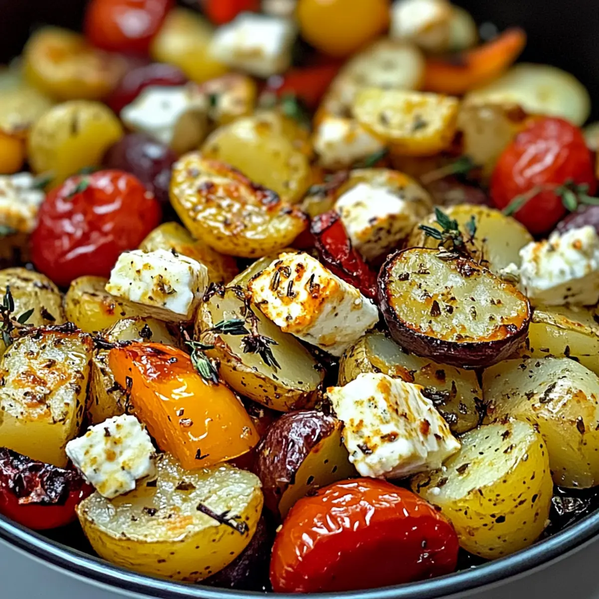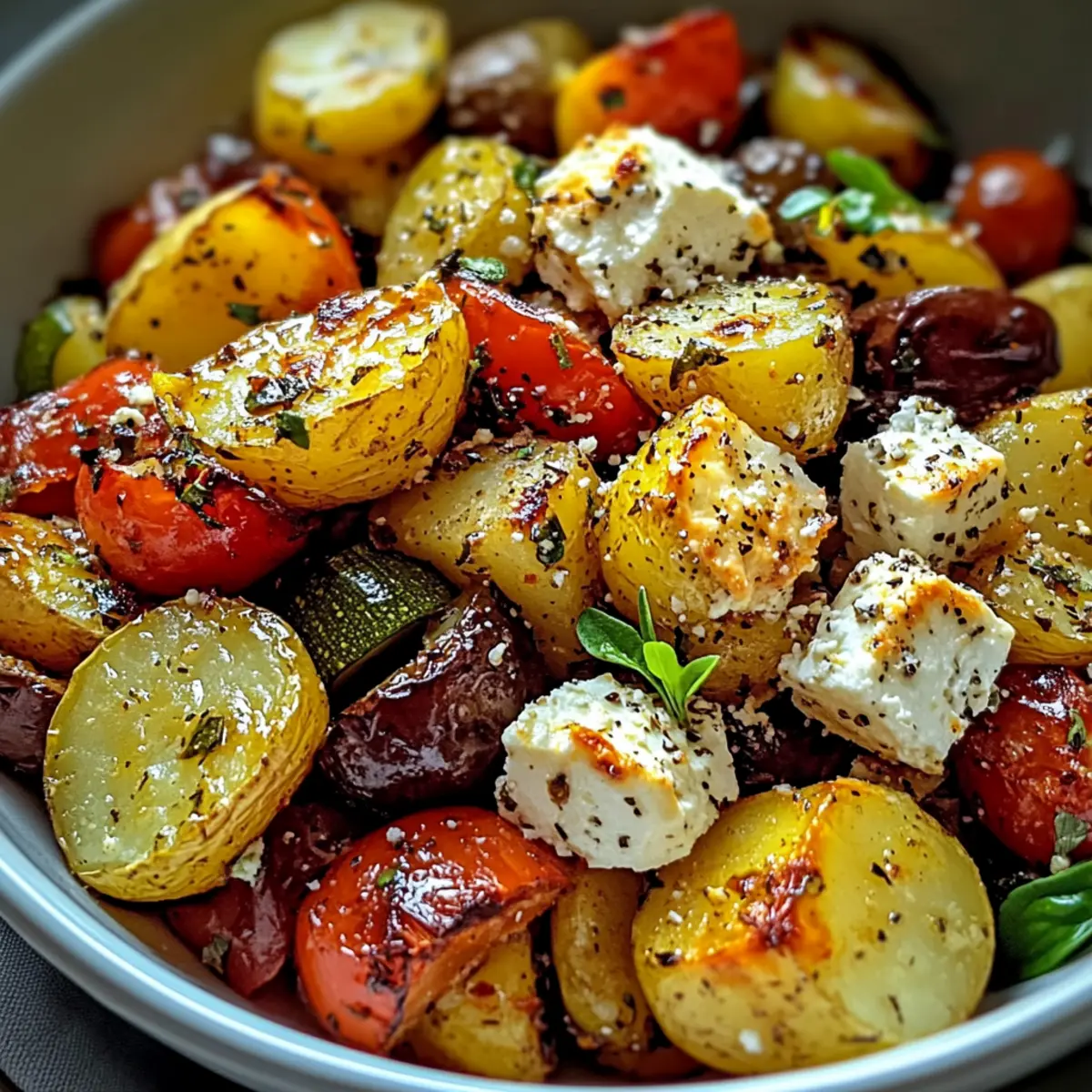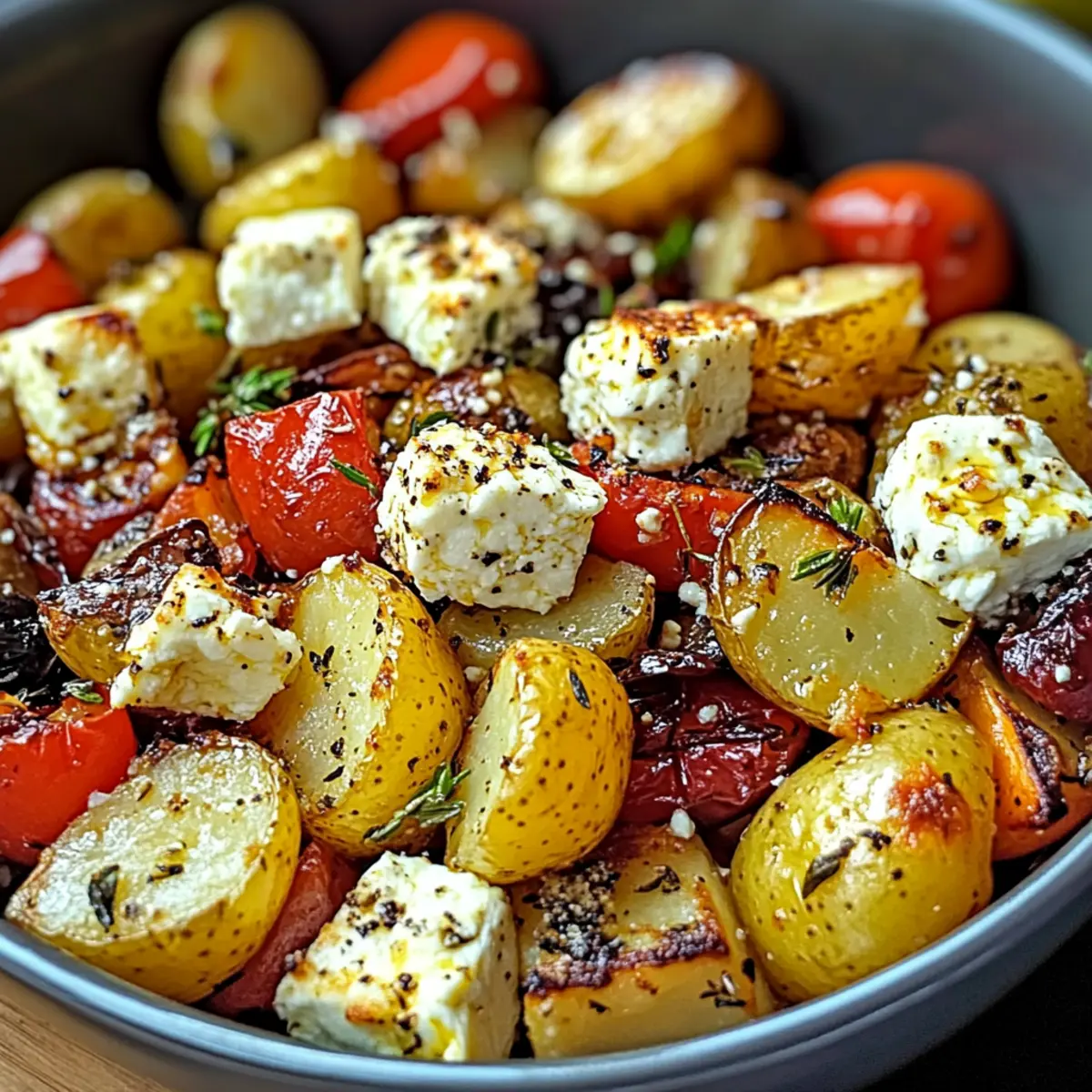 Beim Bummeln durch den lokalen Markt blieb ich plötzlich vor einem farbenfrohen Gemüsetisch stehen. Die frischen Zucchini, die leuchtenden Paprika und die feinen roten Zwiebeln haben mir sofort einen Appetit auf etwas Mediterranes gemacht. Heute möchte ich mit euch ein ganz einfaches Rezept für köstliches Feta Kartoffeln Ofengemüse teilen, das nicht nur schnell zubereitet ist, sondern auch fantastisch schmeckt. In nur 40 Minuten zaubert ihr ein gesundes Gericht, das perfekt für die Nutzung saisonaler Zutaten geeignet ist. Der cremige Feta vereint sich mit goldenen, knusprigen Kartoffeln und zart geröstetem Gemüse zu einem echten Gaumenschmaus — ein absoluter Favorit für jeden Abend! Seid ihr bereit, mit mir in die mediterrane Küche einzutauchen und eure liebsten Gemüsevariationen zu entdecken? Warum wirst du dieses Rezept lieben? Einfachheit: Die Zubereitung ist kinderleicht und erfordert nur grundlegende Kochkenntnisse — perfekt für alle, die schnell ein köstliches Gericht zaubern wollen. Leckere Aromen: Das Zusammenspiel von geröstetem Gemüse und aromatischem Feta sorgt für ein Geschmackserlebnis, das deine Geschmacksknospen verwöhnt! Vielseitigkeit: Du kannst saisonale Gemüsesorten nach Belieben hinzufügen oder austauschen, wodurch jede Zubereitung einzigartig wird. Gesund und Nahrhaft: Mit gesunden Zutaten ist dieses Gericht nicht nur lecker, sondern bietet dir auch eine ausgewogene Mahlzeit. Ein Genuss ohne schlechtes Gewissen! Schnell zubereitet: In nur 40 Minuten kannst du eine köstliche Mahlzeit auf den Tisch bringen, ideal für stressige Wochentage. Lass dich auch von unseren Tipps zur optimalen Verwendung von frischen Kräutern inspirieren: Frisches Gemüse macht den Unterschied! Köstliches Feta Kartoffeln Ofengemüse Zutaten • Entdecke die geschmackvollen Komponenten für dein unverwechselbares Gericht! Für das Gemüse Festkochende Kartoffeln – Sie bilden die Grundlage des Gerichts und sind ideal zum Rösten. Wähle Yukon Gold oder rote Kartoffeln als gute Alternativen. Zucchini – Fügt dem Gericht Feuchtigkeit und Leichtigkeit hinzu. Du kannst sie auch durch Auberginen oder Paprika ersetzen. Paprika – Liefert Süße und Farbe; andere süße Paprikasorten können ebenfalls verwendet werden. Rote Zwiebel – Verbessert die Geschmackstiefe. Gelbe Zwiebeln eignen sich als Ersatz. Knoblauchzehen – Aromatischer Grundpfeiler; frischer Knoblauch sorgt für ein besseres Aroma, während Knoblauchpulver eine schnelle Alternative ist. Für den Belag Feta-Käse – Sein cremiges Aroma hebt das Gericht hervor; veganer Feta ist eine tolle Option für eine milchfreie Zubereitung. Olivenöl – Fördert das Rösten und verleiht die nötige Reichhaltigkeit. Avocadoöl ist ein geeigneter Ersatz. Getrockneter Oregano & Thymian – Diese Kräuter verleihen dem Gericht wunderbare Aromen; frische Kräuter können für ein intensiveres Geschmackserlebnis genutzt werden. Salz und Pfeffer – Grundlegende Gewürze zur Geschmacksoptimierung; nach Belieben anpassen. Frische Petersilie (optional) – Dient der Garnierung und bringt Frische; alternativ kann frischer Basilikum verwendet werden. Mit diesen Zutaten zauberst du ein köstliches Feta Kartoffeln Ofengemüse, das sowohl nahrhaft als auch einfach zuzubereiten ist! Schritt-für-Schritt-Anleitung für Köstliches Feta Kartoffeln Ofengemüse Step 1: Ofen vorheizen Heize deinen Ofen auf 200°C vor (180°C für Umluft). Diese Temperatur sorgt dafür, dass das Gemüse gleichmäßig röstet und die Kartoffeln schön knusprig werden. Während der Ofen vorheizt, kannst du bereits mit der Vorbereitung der Gemüse beginnen. Step 2: Gemüse vorbereiten Schneide die festkochenden Kartoffeln in gleich große Stücke von 2-3 cm, sodass sie gleichmäßig garen. Zucchini in 1 cm dicke Scheiben schneiden, Paprika und rote Zwiebeln ebenfalls in vergleichbare Größen zerteilen. So stellen wir sicher, dass alles im Köstlichen Feta Kartoffeln Ofengemüse zur gleichen Zeit gar ist. Step 3: Knoblauch und Gemüse kombinieren Zerdrücke die Knoblauchzehen und gib sie zusammen mit den vorbereiteten Kartoffeln, Zucchini, Paprika und Zwiebeln in eine große Schüssel. Mische alles gut, damit sich die Aromen gleichmäßig verteilen. Diese Mischung bildet die Grundlage für dein köstliches Gericht. Step 4: Würzen und vermengen Drapiere nun Olivenöl über das Gemüse und würze es großzügig mit getrocknetem Oregano, Thymian sowie Salz und Pfeffer. Mische alles sorgfältig, sodass der gesamte Gemüsemix gut mit dem Öl und den Gewürzen überzogen ist. Dies bringt den mediterranen Geschmack im Köstlichen Feta Kartoffeln Ofengemüse zur Geltung. Step 5: Gemüse rösten Verteile die gewürzte Gemüse-Mischung gleichmäßig auf einem Backblech in einer einzigen Schicht. Achte darauf, dass die Stücke genug Platz haben, um perfekt zu rösten. Backe alles für etwa 25-30 Minuten, bis die Kartoffeln goldbraun und zart sind. Der verführerische Duft wird bald durch die Küche ziehen! Step 6: Feta hinzufügen Nimm das Backblech nach der Röstzeit aus dem Ofen und verteile den gewürfelten Feta gleichmäßig über das Gemüse. Der Feta wird beim weiteren Backen schmelzen und eine köstliche, cremige Schicht bilden. Backe das Ganze für weitere 10-15 Minuten, bis der Feta eine goldene Farbe annimmt. Step 7: Anrichten und servieren Nach dem Backen nimm das köstliche Feta Kartoffeln Ofengemüse aus dem Ofen und lasse es kurz abkühlen. Garniere das Gericht vor dem Servieren mit frischer Petersilie, um einen zusätzlichen Farb- und Frischekick zu verleihen. Jetzt ist es bereit, deine Familie und Freunde zu begeistern! Köstliches Feta Kartoffeln Ofengemüse Variationen Eure Kreativität in der Küche kennt keine Grenzen! Hier sind einige spannende Ideen, wie ihr dieses Rezept nach eurem Geschmack anpassen könnt. Veganer Feta: Statt fettreichem Feta könnt ihr veganen Feta verwenden, um das Gericht vollständig pflanzlich zu gestalten. So kommt je