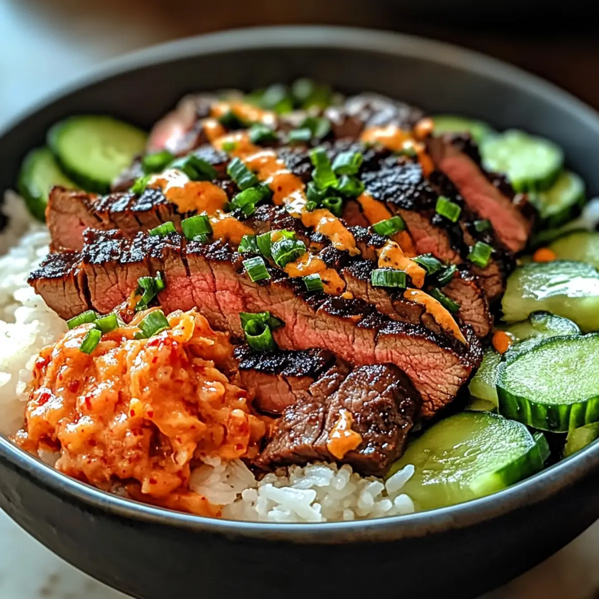 Nehmen Sie eine Schüssel und schichten Sie die Zutaten für Ihre koreanischen BBQ-Steak-Schalen. Beginnen Sie mit einer großzügigen Portion des gekochten Reises als Basis. Fügen Sie dann die geschnittenen Steakstücke, Kimchi, die dünn geschnittene Gurke, die juliennierten Karotten, die Avocadoscheiben und die gehackten grünen Zwiebeln hinzu. Achten Sie darauf, die Farben ansprechend anzuordnen, um eine schöne Präsentation zu erzielen.