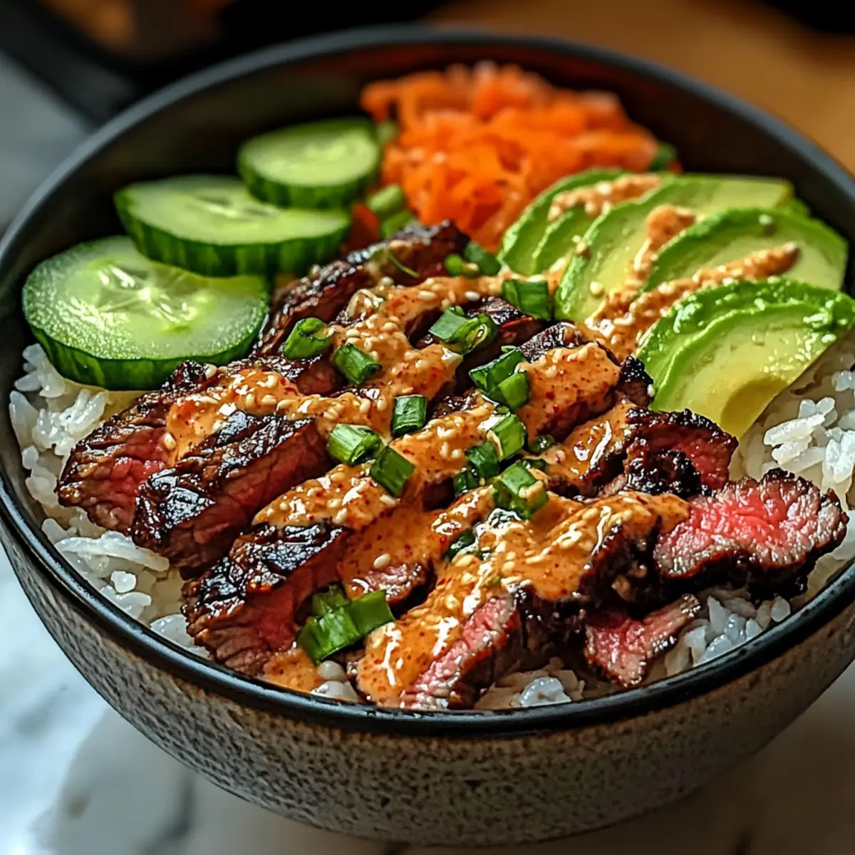4. Nehmen Sie eine Schüssel und schichten Sie die Zutaten. Beginnen Sie mit einer Portion des gekochten Reises und fügen Sie dann die geschnittenen Steakstücke, Kimchi, Gurke, Karotten, Avocadoscheiben und grüne Zwiebeln hinzu.