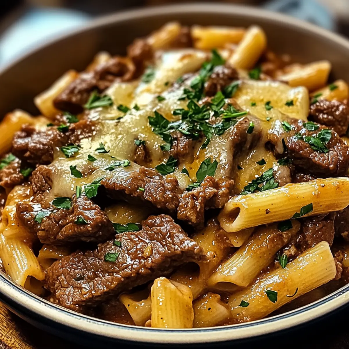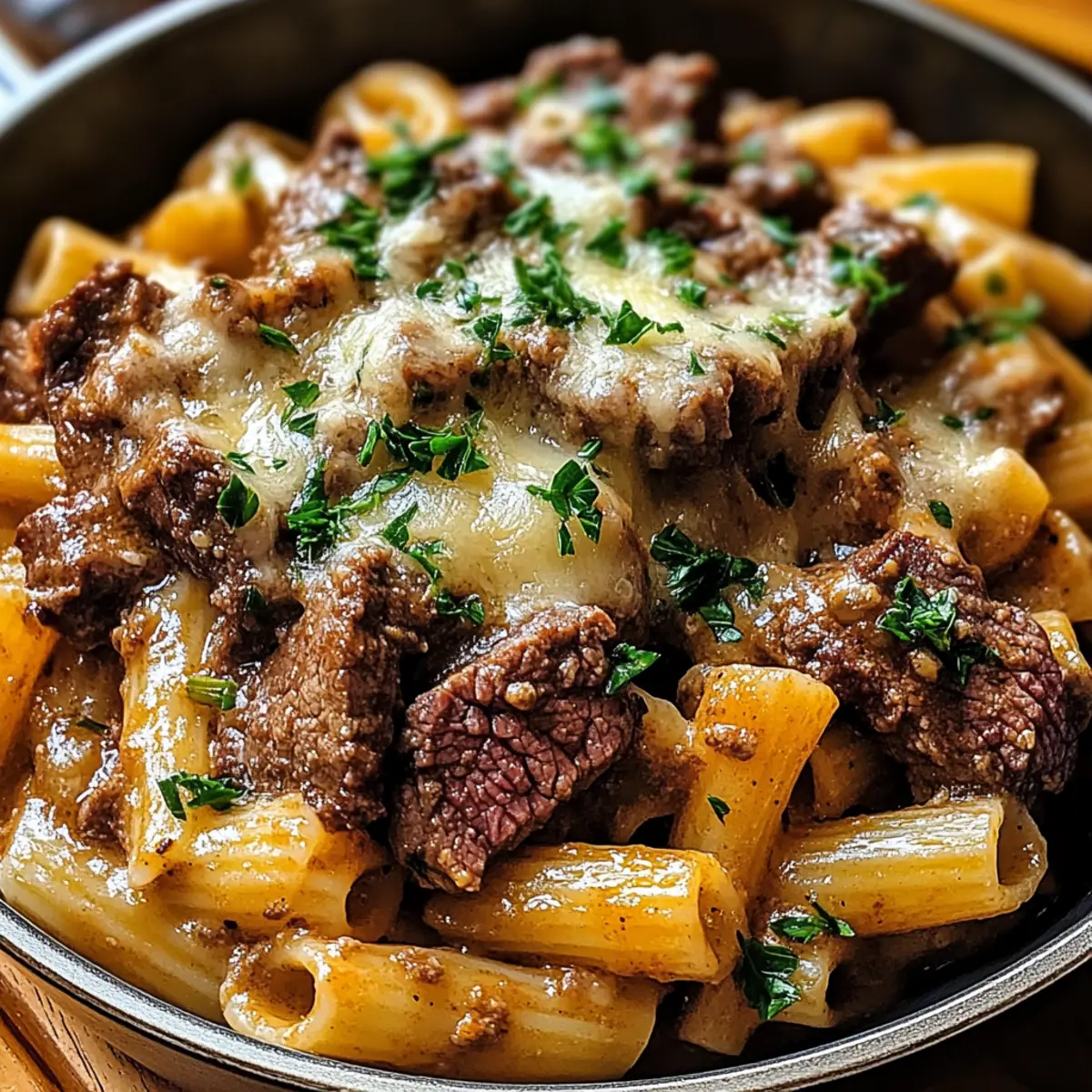 Hast du schon einmal den verführerischen Duft von frisch gebratenem Rindfleisch und geröstetem Knoblauch in deiner Küche erlebt? Ich kann es kaum erwarten, dir mein Rezept für köstliche Knoblauch-Rinderpasta vorzustellen. Diese schmackhafte Mahlzeit vereint zartes Rindfleisch mit al dente Pasta in einer reichhaltigen, aromatischen Knoblauchsoße, die in weniger als 40 Minuten zubereitet ist. Perfekt für einen entspannten Wochentag oder als Gaumenschmaus für Gäste – sie ist sowohl schnell als auch vielseitig. Möchtest du erfahren, wie du dieses genussvolle Gericht nach Hause zaubern kannst? Warum wirst du dieses Rezept lieben? Schnelligkeit: In nur 30 Minuten zauberst du diese köstliche Knoblauch-Rinderpasta auf den Tisch – ideal für hektische Wochentage! Vielfältige Anpassungsmöglichkeiten: Ob mit verschiedenen Pastasorten oder zusätzlichen Gemüsevariationen wie Zucchini oder Paprika, du kannst deiner Kreativität freien Lauf lassen. Aromatische Geschmackskombination: Der intensive Geschmack von frisch gebratenem Rindfleisch und geröstetem Knoblauch in einer velouté Soße verleiht jedem Bissen Tiefgang und Freude. Familienfreundlich: Dieses Gericht kommt bei Groß und Klein gut an und eignet sich perfekt für ein schnelles Abendessen mit der Familie. Praktische Vorbereitung: Das Rezept bietet einfache Schritte und benötigt keine speziellen Kochkünste, sodass du im Handumdrehen ein beeindruckendes Gericht kreieren kannst! Köstliche Knoblauch-Rinderpasta Zutaten Für die Pasta • Pasta – 12 oz (Spaghetti, Fettuccine oder Penne) – Jede Pastaform funktioniert, denke an Vollkorn- oder glutenfreie Optionen für Vielfalt. Für das Rindfleisch • Rindfleisch – 1 lb (Schnitzel aus Sirloin oder Ribeye, dünn geschnitten) – Flank Steak kann auch verwendet werden; wichtig ist, es gegen die Faser zu schneiden. Für die Soße • Knoblauch – 6 Zehen, gehackt – Der Hauptgeschmacksträger dieses Gerichts. • Olivenöl – 2 Esslöffel – Zum Anbraten des Rindfleischs und zur Verbesserung der Soße. • Butter – 2 Esslöffel – Fügt der Soße Reichhaltigkeit hinzu; kann durch vegane Butter ersetzt werden. • Rinderbrühe – ½ Tasse – Bildet die Basis der Soße. • Schlagsahne (optional) – ¼ Tasse für eine cremigere Soße – griechischer Joghurt oder ungesüßte Mandelnmilch können leichtere Alternativen sein. • Parmesan-Käse – ½ Tasse, gerieben – Verleiht dem Gericht eine salzige, nussige Note. • Rote Pfefferflocken – ½ Teelöffel (optional) – Für eine spannende Schärfe, oder Cayennepfeffer verwenden. • Salz & Schwarz Pfeffer – Nach Geschmack – Verwende Knoblauchsovolen für zusätzlichen Geschmack. Für die Garnitur • Frische Petersilie – Zur Dekoration – Frische und Farbe auf dem Teller. Optionale Zutaten • Champignons oder Paprika – 1 Tasse, in Scheiben geschnitten – Für zusätzlichen Biss und Nährstoffe; Zucchini oder Spinat funktionieren auch gut. Die köstliche Knoblauch-Rinderpasta wird also nicht nur deine Sinne verwöhnen, sondern auch deine Kreativität anregen! Schritt-für-Schritt-Anleitung für Köstliche Knoblauch-Rinderpasta Step 1: Pasta kochen Bringe in einem großen Topf ausreichend gesalzenes Wasser zum Kochen. Füge die Pasta hinzu und koche sie laut Packungsanweisung für 8-10 Minuten, bis sie al dente sind. Überprüfe die Pasta ein paar Minuten vor Ablauf der Zeit, um sicherzustellen, dass sie nicht zu weich wird. Verwende ein Sieb, um die Pasta abzugießen, und hebe dir ½ Tasse Nudelwasser auf, falls du die Soße später verdünnen musst. Step 2: Rindfleisch vorbereiten Schneide das Rindfleisch in dünne Streifen von etwa 0,5 cm, damit es gleichmäßig gart und zart bleibt. Würze die Rindfleischstreifen mit Salz und Pfeffer. Achte darauf, das Fleisch gut zu würzen, da es den Geschmack der köstlichen Knoblauch-Rinderpasta verstärkt. Lass das Rindfleisch einige Minuten ruhen, damit die Gewürze einziehen können, während du die Pfanne erhitzt. Step 3: Rindfleisch anbraten Erhitze in einer großen Pfanne bei mittelhoher Hitze 1 Esslöffel Olivenöl. Sobald das Öl heiß ist, füge das gewürzte Rindfleisch in einer einzigen Schicht hinzu und brate es 2-3 Minuten auf jeder Seite an, bis es goldbraun und zart ist. Überfülle die Pfanne nicht, da das Fleisch sonst dampfen kann. Nimm das Rindfleisch aus der Pfanne und stelle es beiseite. Step 4: Knoblauch sautieren Reduziere die Hitze auf mittlere Stufe und gib das restliche Olivenöl sowie die Butter in die Pfanne. Lass die Butter schmelzen und füge dann den gehackten Knoblauch hinzu. Sautiere den Knoblauch 1-2 Minuten lang, bis er duftet, aber achte darauf, ihn nicht zu verbrennen, da dies einen bitteren Geschmack erzeugen würde. Step 5: Soße erstellen Gieße die Rinderbrühe in die Pfanne, um den Bratensatz zu lösen und eine aromatische Grundlage für die Soße zu schaffen. Wenn du eine cremigere Soße bevorzugst, rühre nun die Schlagsahne ein und lasse alles 2-3 Minuten vor sich hin köcheln, bis die Soße etwas eindickt und die Aromen vereint sind. Step 6: Rindfleisch und Pasta kombinieren Gib das angebratene Rindfleisch zurück in die Pfanne und vermische es gut mit der Knoblauchsoße. Füge dann die abgetropfte Pasta hinzu und rühre alles um, bis die Pasta gleichmäßig mit der Soße umhüllt ist. Wenn die Soße zu dick ist, kannst du etwas von dem aufbewahrten Nudelwasser hinzufügen, um die gewünschte Konsistenz zu erreichen. Step 7: Servieren Mische zum Schluss den geriebenen Parmesan und die roten Pfefferflocken (wenn du sie verwendest) unter die Köstliche Knoblauch-Rinderpasta. Nimm die Pfanne vom Herd und garniere die Pasta großzügig mit frischer, gehackter Petersilie, um dem Gericht eine ansprechende Farbe und Frische zu verleihen. Serviere die Pasta heiß und genieße das herzhafte Aroma. Tipps für die beste köstliche Knoblauch-Rinderpasta Beef richtig anbraten: Brate das Rindfleisch in kleinen Portionen an, um e