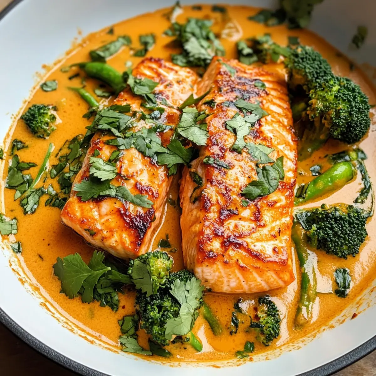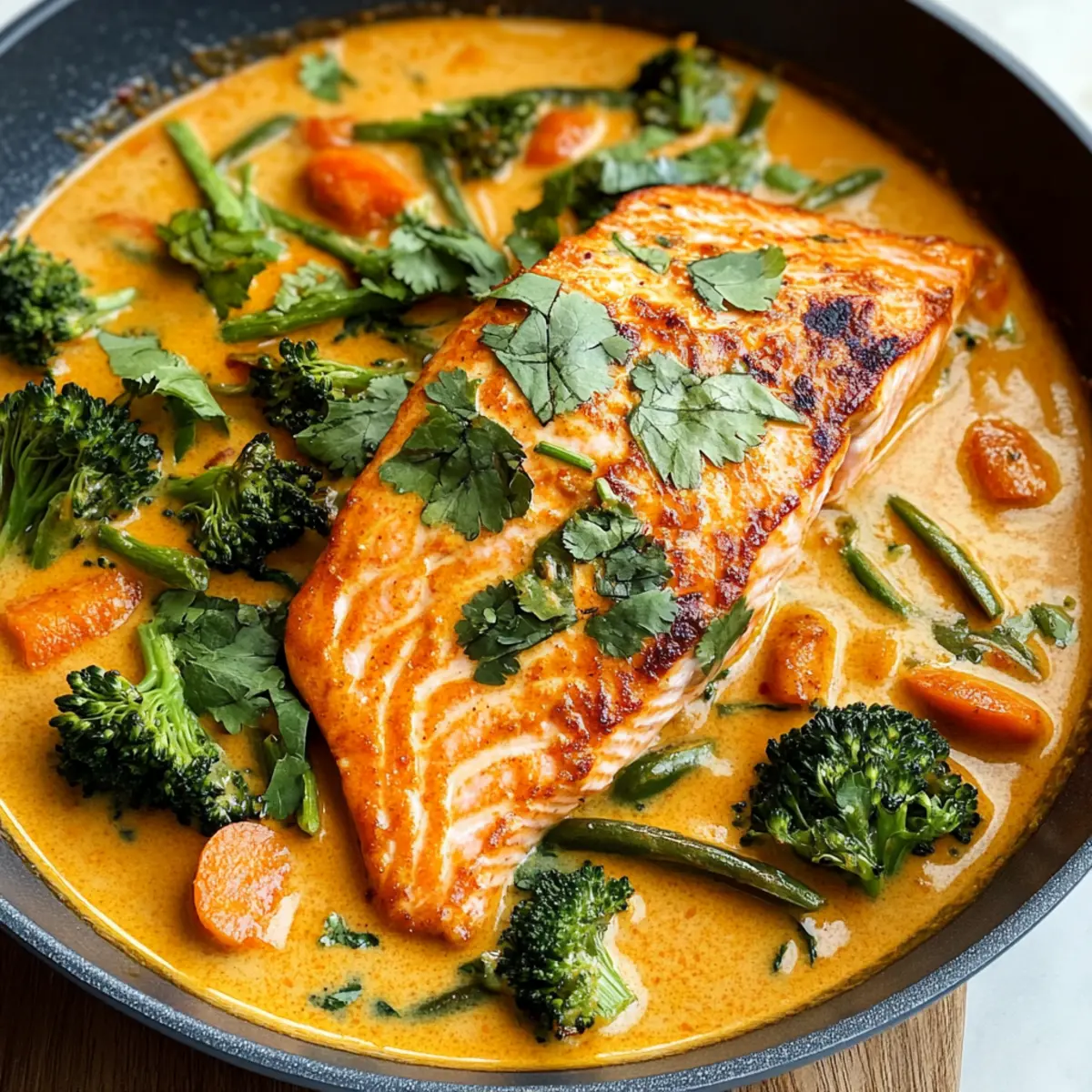 Während ich gerade mit einem dampfenden Teller voller Lachs-Kokos-Curry vor meinem Tisch saß, wurde mir klar, dass ich das perfekte Rezept für dich habe! Dieses Thai-inspirierte Gericht vereint zarten, in einer cremigen roten Currysauce geschmorten Lachs, der einfach unwiderstehlich ist. Es bietet nicht nur den Komfort eines schnellen, leckeren Abendessens für stressige Wochentage, sondern ist auch gesund und voller gesunder Zutaten. Mit einem Hauch von Kokosmilch und aromatischen Gewürzen wird es ein Genuss für alle Sinne. Bist du bereit, deine Geschmacksknospen zu verwöhnen und deine Küche in ein kleines Stück Thailand zu verwandeln? Warum wirst du dieses Rezept lieben? Einfachheit: Die Zubereitung ist kinderleicht! Mit nur wenigen grundlegenden Schritten kannst du blitzschnell ein köstliches Gericht auf den Tisch zaubern. Aroma: Der geschmackliche Höhepunkt kommt von der Kombination aus Kokosmilch und Thai-Curry-Paste, die ein unvergleichliches, herzhaftes Aroma erzeugt. Gesundheit: Vollgepackt mit nährstoffreichen Zutaten wie frischem Lachs und buntem Gemüse ist dieses Gericht nicht nur lecker, sondern auch nährstoffreich. Vielseitigkeit: Variiere nach Belieben! Du kannst das Gemüse anpassen oder sogar das Lachsfilet gegen andere Meeresfrüchte austauschen, um es deinen Vorlieben anzupassen. Schnelligkeit: Ideal für ein schnelles Abendessen unter der Woche – in weniger als 30 Minuten fertig! Beliebtheit: Pläne für ein Dinner mit Freunden oder der Familie? Diese Curry-Kreation wird garantiert alle begeistern und ist perfekt für gesellige Abende! Lachs-Kokos-Curry Zutaten • Bei diesem Rezept verwenden wir eine Auswahl an frischen und aromatischen Zutaten, die zusammen ein köstliches Lachs-Kokos-Curry ergeben. Für den Lachs Frischer Lachs – Dieser liefert das Hauptprotein; achte darauf, qualitativ hochwertigen Fisch für den besten Geschmack zu wählen. Salz & Pfeffer – Zum Würzen; nach Geschmack hinzufügen. Olivenöl – Zum Braten des Lachses; kann durch ein neutrales Öl ersetzt werden. Butter – Verleiht dem Gericht eine cremige Note; optional, kann für eine milchfreie Version weggelassen werden. Für die Sauce Zwiebel (1/2 mittelgroß, gehackt) – Sorgt für Süße und Tiefe; kann durch Schalotten ersetzt werden. Knoblauch (2 Zehen, gehackt) – Verstärkt das Aroma und den Geschmack; frisch ist bevorzugt für besten Geschmack. Thai-Rote-Curry-Paste (2 gehäufte Esslöffel) – Gibt Schärfe und Komplexität; nach persönlicher Vorliebe anpassen. Fischsauce (1/2 Teelöffel, optional) – Fügt Umami-Geschmack hinzu; kann durch Sojasauce für eine vegetarische Option ersetzt werden. Kokosmilch (1 Dose, 400 ml) – Cremige Basis für die Sauce; wähle hochwertige Marken wie Thai Kitchen für optimale Konsistenz. Brauner Zucker (1/2 Teelöffel) – Balanciert die Aromen mit seiner Süße; kann durch Kokoszucker ersetzt werden. Für das Gemüse Karotten (1/2 Tasse, in Stiften) – Für Textur und Süße; kann durch Paprika oder Zuckerschoten ersetzt werden. Broccolini (1 gehäufte Tasse, gehackt) – Fügt Farbe und Knackigkeit hinzu; kann durch Brokkoli ersetzt werden. Für das Finish Limettensaft (1 Teelöffel) – Bringt Frische ins Rezept; frisch gepresst ist am besten. Frisches Basilikum (2 Esslöffel, zer torn/chopped) – Verleiht Frische und Aroma; thailändisches Basilikum ist für Authentizität empfehlenswert. Frischer Koriander (2 Esslöffel, gehackt) – Ergänzt die Aromen und bringt Farbe; kann weggelassen werden, falls nicht gewünscht. Step-by-Step Instructions für Lachs-Kokos-Curry Step 1: Lachs vorbereiten Schneide den frischen Lachs in vier gleich große Stücke und tupfe sie mit einem Küchentuch trocken. Würze die Lachsfilets von beiden Seiten mit Salz und Pfeffer, um den Geschmack zu intensivieren. Dies ist der erste Schritt zu deinem köstlichen Lachs-Kokos-Curry! Step 2: Lachs braten Erhitze eine große Pfanne bei mittlerer bis hoher Hitze und gib das Olivenöl sowie die Butter hinein. Sobald die Butter geschmolzen ist und leicht schäumt, lege die Lachsfilets mit der Hautseite nach unten in die Pfanne. Brate den Lachs für etwa 5 Minuten, bis die Haut knusprig ist, dann wende ihn und brate ihn für weitere 2-3 Minuten, bis er fast durchgegart ist. Step 3: Lachs herausnehmen Nimm den Lachs aus der Pfanne und lege ihn vorsichtig auf einen Teller. Lasse das überschüssige Öl in der Pfanne, aber schütte das restliche Fett bis auf etwa einen Esslöffel weg. Dies sorgt dafür, dass die Geschmackskomponenten deines Lachs-Kokos-Currys optimal zur Geltung kommen. Step 4: Zwiebel und Knoblauch anbraten Füge nun die gehackte Zwiebel in die Pfanne hinzu und brate sie etwa 3 Minuten lang an, bis sie leicht bräunlich wird. Gib den gehackten Knoblauch und die Thai-Rote-Curry-Paste dazu und koche alles für eine weitere Minute. Diese Aromen bringen die köstliche Basis deines Lachs-Kokos-Currys hervor. Step 5: Sauce zubereiten Rühre die Fischsauce, die Kokosmilch und den braunen Zucker in die Zwiebel-Knoblauch-Mischung ein und bring alles zum Kochen. Füge dann die Karotten und den Broccolini hinzu. Lasse die Mischung etwa 5 Minuten köcheln, bis das Gemüse zart, aber noch knackig ist. So erhält dein Lachs-Kokos-Curry eine wunderbare Textur! Step 6: Lachs zurück in die Pfanne Drücke den frischen Limettensaft in die Pfanne und lege die zuvor gekochten Lachsfilets zurück in die Sauce. Erhitze das Ganze für ein paar Minuten, bis der Lachs vollständig durchgegart ist. Dies sorgt dafür, dass die Aromen in das Lachs-Kokos-Curry eindringen und ein harmonisches Geschmackserlebnis entsteht. Step 7: Garnieren und servieren Vor dem Servieren garniere das Gericht mit frischem, torn oder gehacktem Basilikum und Koriander für zusätzlichen Geschmack. Serviere dein Lachs-Kokos-Curry heiß, am besten über frisch gekochtem Jasminreis oder Quinoa, um die köstliche Sauce aufzunehmen! Tipps für das beste Lachs-Kokos-Curry Richtige Temperatur: