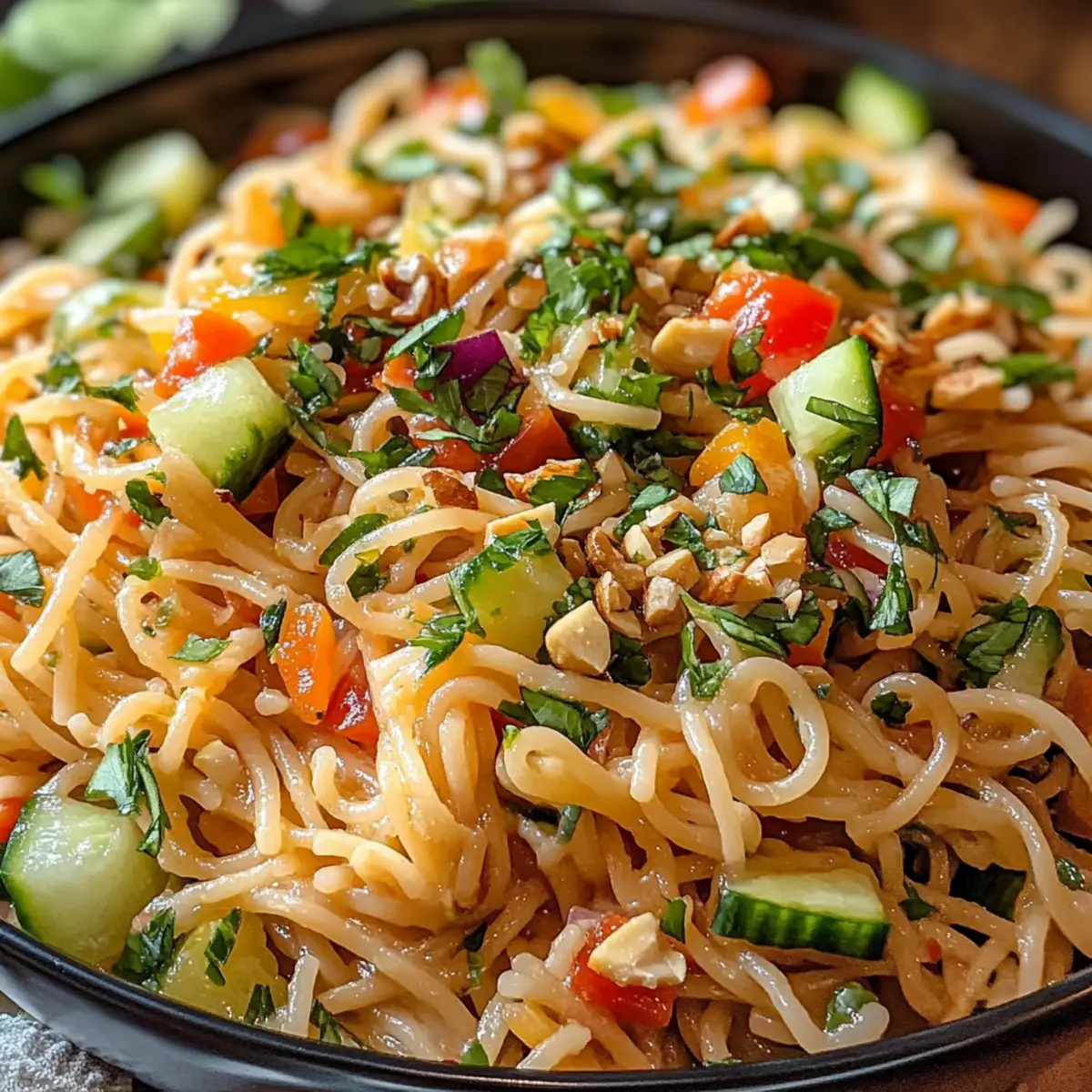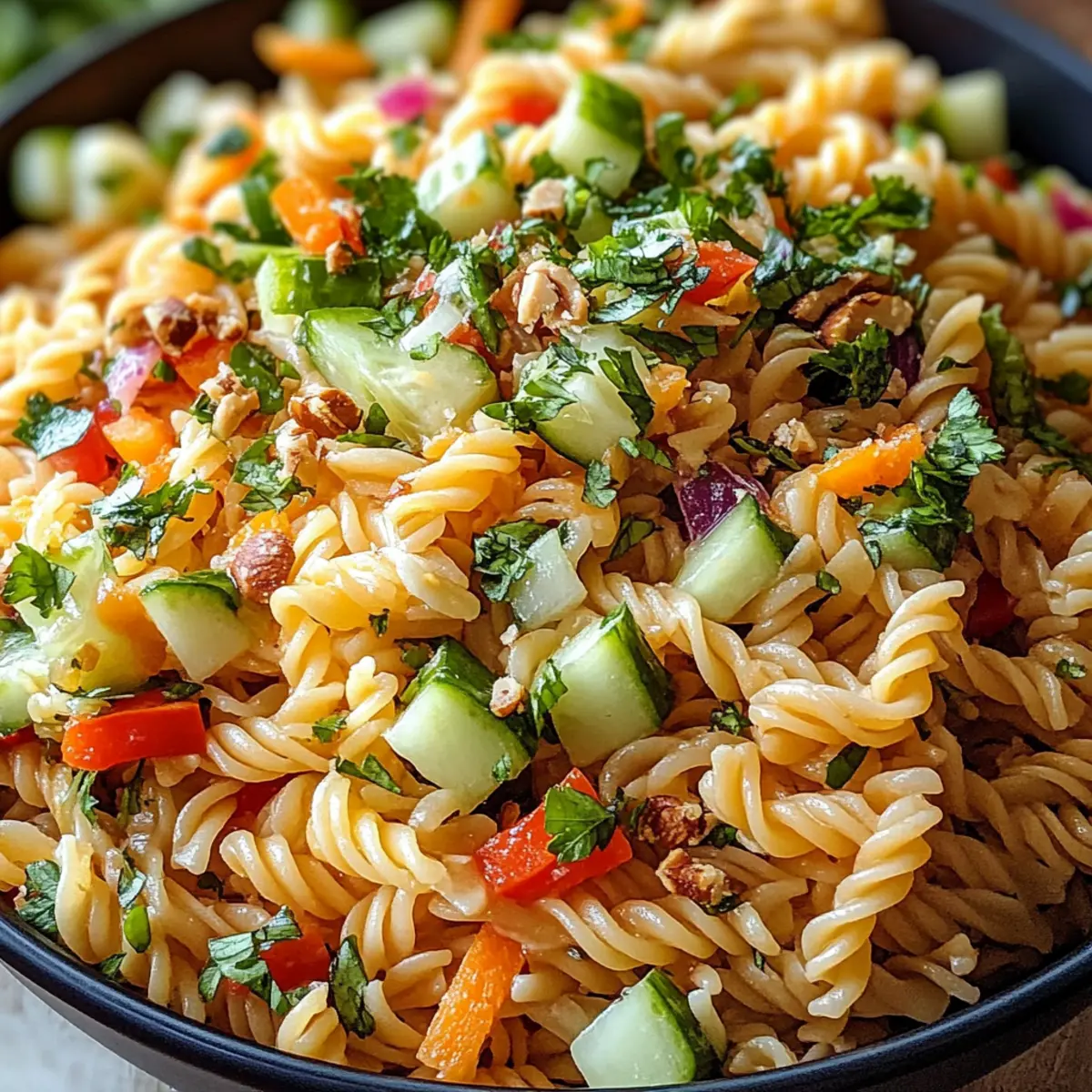 5. In einer großen Schüssel vereine die abgekühlten Nudeln, das vorbereitete Gemüse, die gerösteten Nüsse und den gehackten Koriander. Vermische alles behutsam.