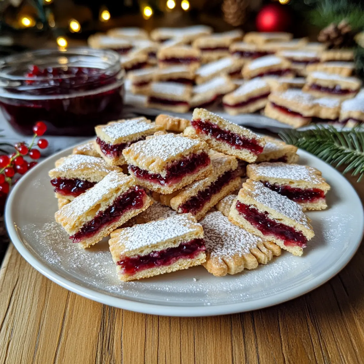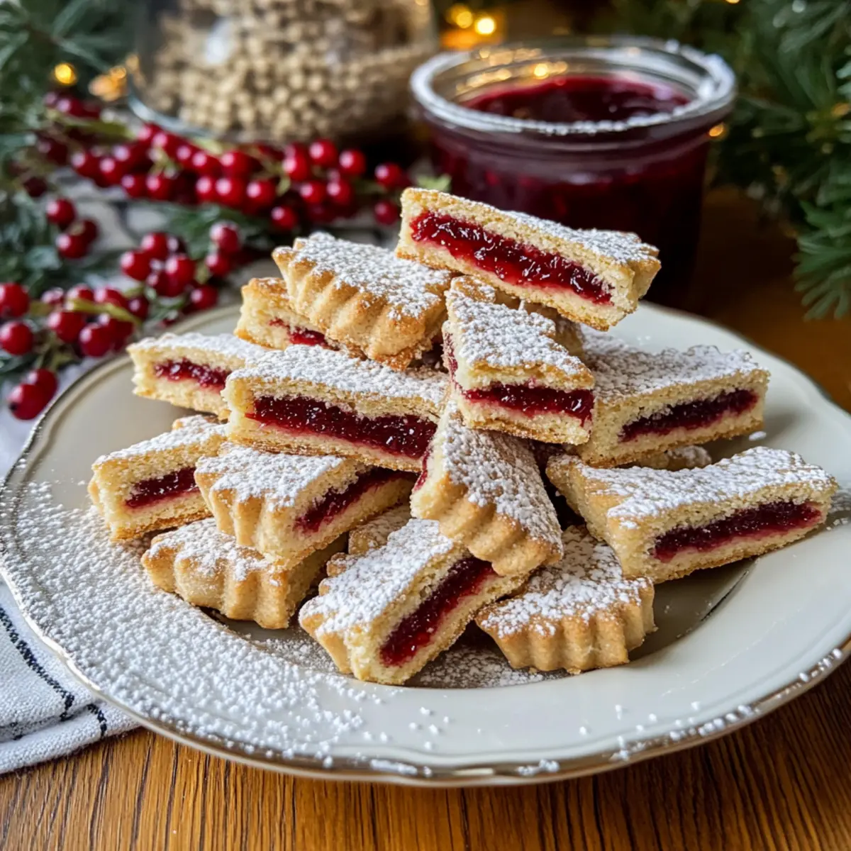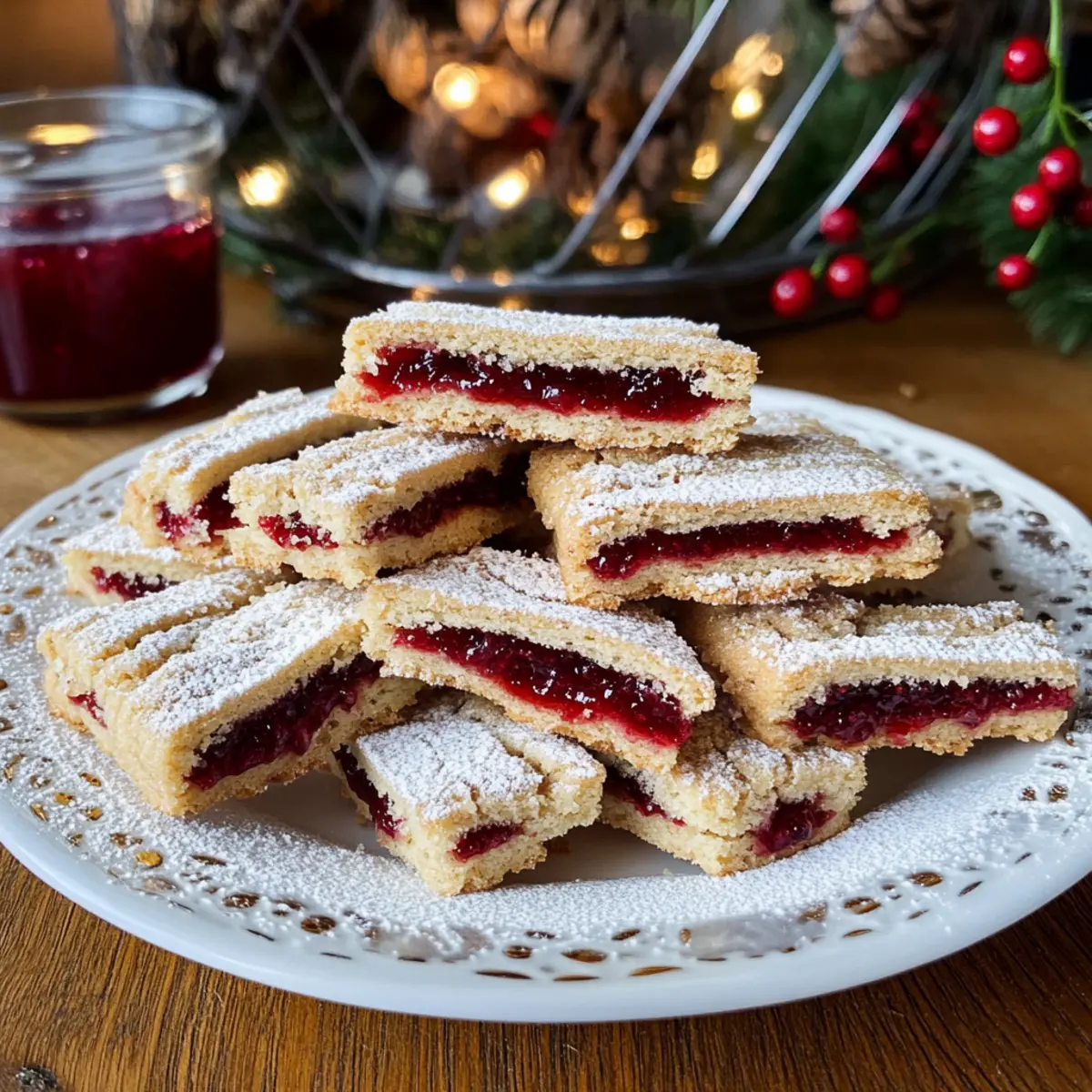 Wenn die ersten Schneeflocken fallen und die Luft nach Zimt duftet, weiß ich, dass es Zeit für Linzer Streifen ist. Diese klassischen österreichischen Weihnachtsplätzchen bezaubern nicht nur mit ihrer goldbraunen Farbe und knusprigen Oberfläche, sondern auch mit einer unwiderstehlichen Kombination aus zartem Mandelteig und fruchtiger Ribiselmarmelade. Als leidenschaftliche Hobbyköchin schätze ich, dass das Rezept einfach nachzubacken ist — ideal, um Freunde und Familie zu erfreuen, ohne viel Zeit in der Küche zu verbringen. Zudem lassen sich die Linzer Streifen wunderbar in großen Mengen zubereiten und sind ein perfektes Mitbringsel zu festlichen Feierlichkeiten. Wer könnte da schon widerstehen? Gerade in der Weihnachtszeit verbreiten diese Plätzchen eine unwiderstehliche Vorfreude. Bist du bereit, deine Küchenmagie zu entfalten und diese festlichen Köstlichkeiten zu kreieren? Warum sind Linzer Streifen so beliebt? Tradition: Linzer Streifen sind nicht nur köstlich, sondern haben auch eine reiche Geschichte in der österreichischen Backkultur, die sie besonders macht. Einfache Zubereitung: Das Rezept erfordert keine speziellen Fähigkeiten, was es ideal für jeden Heimkoch macht. Vielseitigkeit: Du kannst mit verschiedenen Marmeladensorten experimentieren, z.B. Himbeere oder Aprikose, um deinen eigenen Twist zu kreieren. Festliche Freude: Die schönen, goldbraunen Plätzchen bringen sofort Weihnachtsstimmung und sind perfekt zum Teilen mit Freunden und Familie. Zeitersparnis: Dank der großen Menge kannst du sie im Voraus zubereiten und sie bleiben bis zu einer Woche frisch, ideal für hektische Feiertage. Linzer Streifen Zutaten Entdecke die köstlichen Zutaten für deine Linzer Streifen, die in der Weihnachtszeit nicht fehlen dürfen! Für den Teig Mehl – sorgt für die Struktur des Teigs und ist unverzichtbar für die Basis. Glutenfreies Mehl kann als Alternative verwendet werden. Butter (kalt) – sorgt für Zartheit und Geschmack; achte darauf, dass sie kalt ist, um die richtige Textur zu erhalten. Mandeln (gemahlen) – für zusätzlichen Geschmack und eine schöne Textur; kannst du auch durch gemahlene Haselnüsse ersetzen. Backpulver – als Treibmittel hilft es, die Plätzchen aufzugehen. Staubzucker – für die perfekte Süße; bei Bedarf kann auch normaler Zucker verwendet werden. Eier – binden und sorgen für Feuchtigkeit, unerlässlich für die Konsistenz des Teigs. Nelkenpulver – für das aromatische Flair, optional oder durch Piment ersetzbar. Zimt – für Wärme und Aroma, ebenfalls optional nach Geschmack. Salz – zur Geschmacksbalance, hebt die Aromen hervor. Für die Füllung Ribiselmarmelade – sorgt für den fruchtigen Geschmack; alternativ kann auch Himbeer- oder Aprikosenmarmelade verwendet werden, um den Linzer Streifen einen neuen Twist zu geben. Schritt-für-Schritt-Anleitungen für Linzer Streifen Step 1: Butter vorbereiten Schneide die kalte Butter in kleine Stücke und gib sie in eine große Schüssel. Achte darauf, dass die Butter gut gekühlt ist, um die Textur des Teigs zu bewahren. Mische die Butter dann mit einem Handmixer oder einer Küchenmaschine, bis sie cremig und geschmeidig ist. Dies dauert etwa 3 Minuten. Step 2: Teig herstellen Trenne ein Ei und füge das Eigelb zu dem restlichen Ei in der Schüssel hinzu. Vermenge es mit der Butter, dem Mehl, den gemahlenen Mandeln, dem Backpulver, dem Staubzucker und den Gewürzen. Knete die Mischung, bis ein homogener Teig entsteht. Der Teig sollte leicht klebrig, aber gut formbar sein; das dauert etwa 5 Minuten. Step 3: Teig kühlen Wickle den Teig sorgfältig in Frischhaltefolie und lege ihn für mindestens 1 Stunde in den Kühlschrank. Dies ist entscheidend, um die Konsistenz des Teigs zu bewahren und das spätere Ausrollen zu erleichtern. Während der Teig kühlt, kannst du in der Zwischenzeit deinen Ofen vorheizen. Step 4: Ofen vorheizen Heize den Ofen auf 180°C (356°F) vor. Dies ist die ideale Temperatur, um die Linzer Streifen gleichmäßig zu backen und eine goldene Farbe zu erzielen. Überwache die Temperatur mit einem Ofenthermometer, um sicherzustellen, dass er rechtzeitig auf die richtige Temperatur kommt. Step 5: Teig ausrollen und backen Nimm etwa zwei Drittel des Teigs aus dem Kühlschrank und rolle ihn auf Backpapier etwa 3 mm dick aus. Übertrage den ausgerollten Teig auf ein Backblech. Steche den Teig mit einer Gabel ein, um Luftblasen zu vermeiden, und backe ihn ca. 15 Minuten lang, bis er leicht goldbraun ist. Step 6: Restlichen Teig kühlen Während der erste Teig im Ofen ist, lasse den verbleibenden Teig im Kühlschrank. Kühle ihn, bis er fest ist, damit das weitere Ausrollen und Schneiden der Streifen einfacher wird. Dies dauert in der Regel bis zum Ende der Backzeit des ersten Teigs. Step 7: Marmelade vorbereiten Erhitze die Ribiselmarmelade in einem kleinen Topf bei mittlerer Hitze, bis sie flüssig wird. Rühre die Marmelade regelmäßig um, um ein Anbrennen zu vermeiden, und achte darauf, dass sie leicht warm, aber nicht kochend ist. Dies dauert etwa 5 Minuten. Step 8: Marmelade auftragen Nimm das gebackene Teigblatt aus dem Ofen und lasse es kurz abkühlen. Bestreiche die oberste Schicht gleichmäßig mit dem restlichen Eiweiß und verteile dann die warme Ribiselmarmelade darauf. Achte darauf, die Marmelade gleichmäßig zu verteilen, um einen köstlichen Geschmack bei jedem Biss zu gewährleisten. Step 9: Streifen schneiden und legen Rolle den gekühlten Teig dünn aus und schneide ihn in etwa 1 cm breite Streifen. Lege die Streifen diagonal über die Marmelade, wobei du etwas Abstand lässt, sodass die Marmelade sichtbar bleibt. Dies sorgt für das charakteristische Aussehen der Linzer Streifen; achte auf eine schöne Anordnung. Step 10: Linzer Streifen backen Backe die Linzer Streifen auf der mittleren Schiene des Ofens für etwa 20 Minuten, bis die Ränder goldbraun sind. Überwache die Plätzchen während des Backens, um sicherzustellen, dass sie n