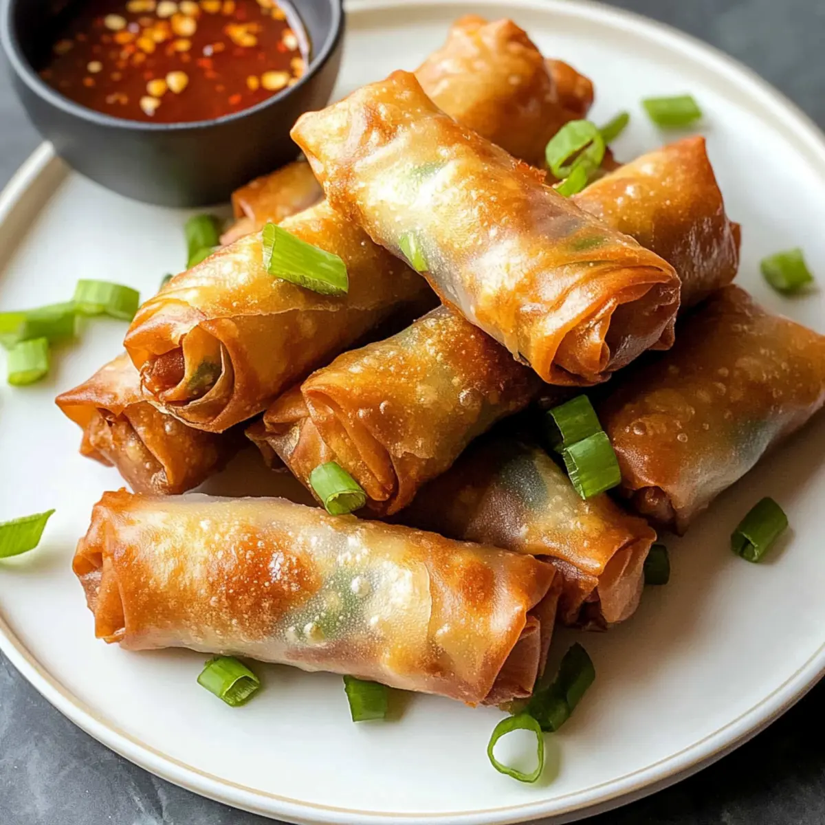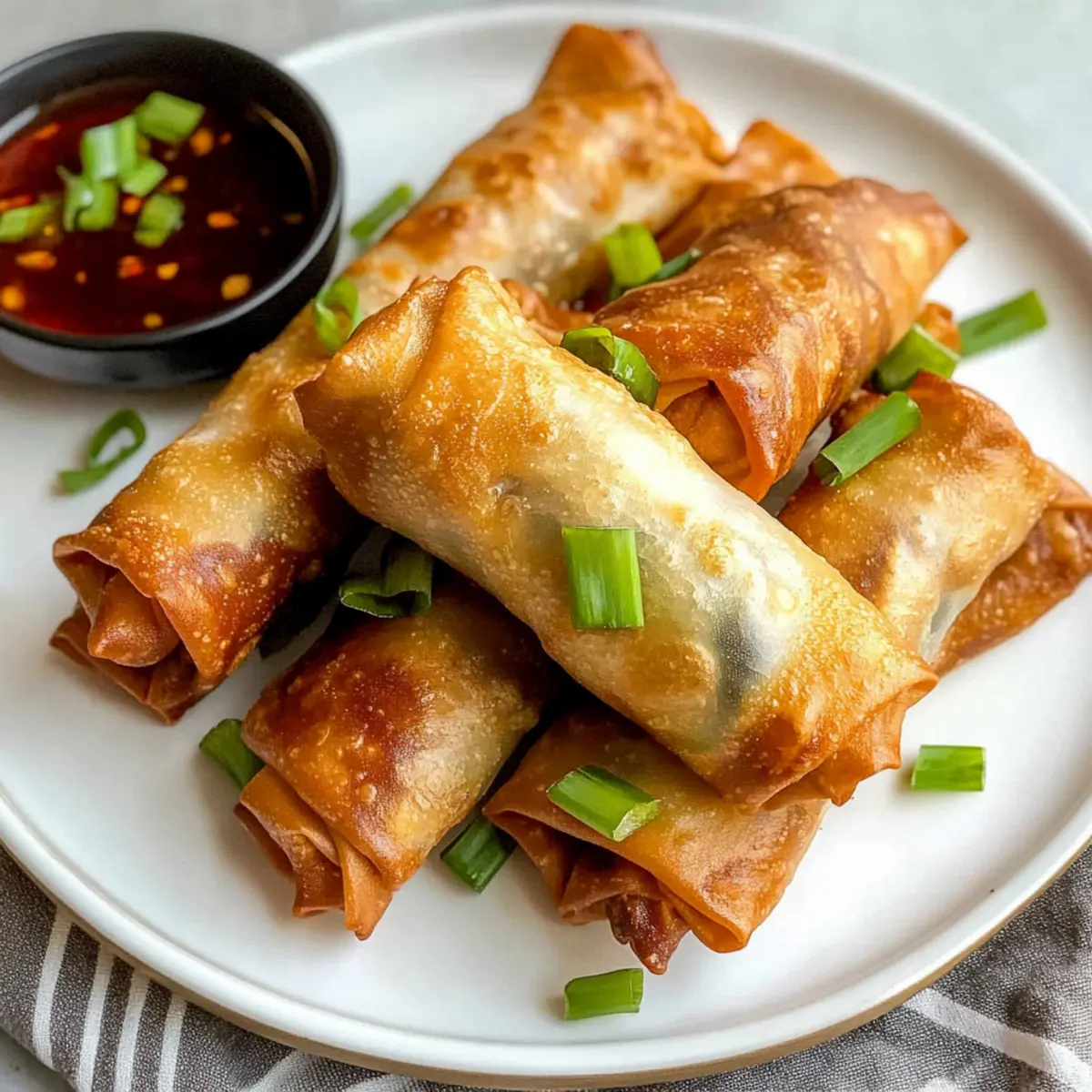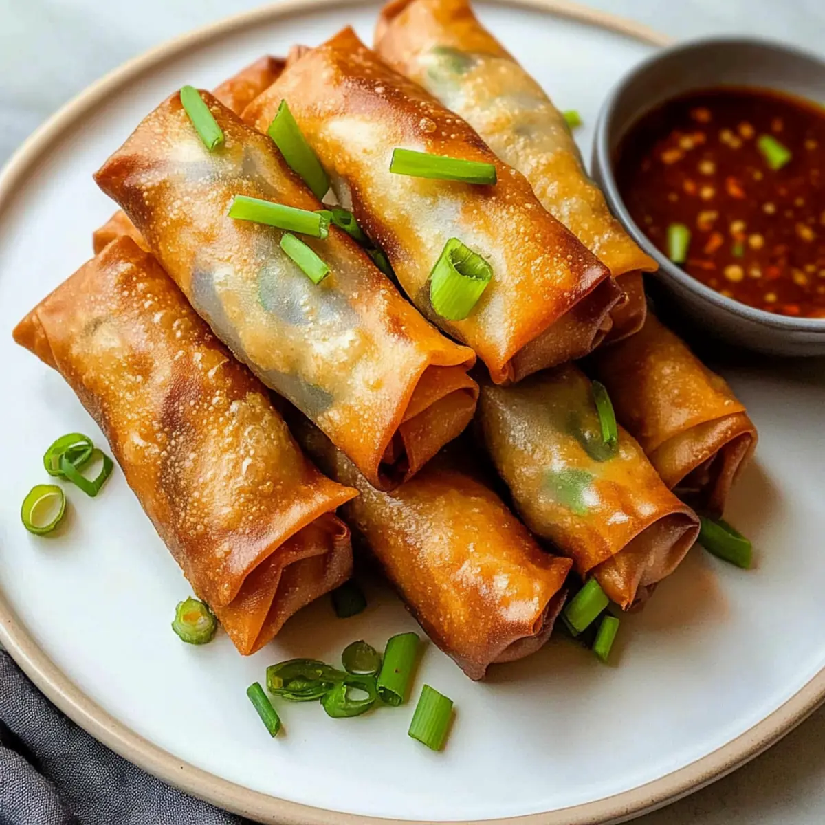 Es gibt Momente, in denen der Wunsch nach etwas Leckerem einfach nicht zu bändigen ist. Bei mir ist es oft der Fall, dass ich mich nach knusprigen Luftfritteuse Frühlingsrollen sehne. Diese gesunde Variante ist nicht nur leichter als die herkömmlichen frittierten Modelle, sondern auch unglaublich vielseitig! Mein Rezept für die Luftfritteuse Frühlingsrollen lässt sich mühelos mit Ihren Lieblingszutaten anpassen und ist somit perfekt für jeden Geschmack – ganz gleich, ob Sie glutenfrei unterwegs sind oder frisches Gemüse bevorzugen. Zubereitungszeit ist ein weiterer Vorteil: Ideal für einen schnellen Snack oder als geselliges Fingerfood bei Einladungen. Bereiten Sie sich also auf ein geschmackvolles Erlebnis vor, das Sie dazu einlädt, ein weiteres Stück zu probieren – ohne ein schlechtes Gewissen! Welche Füllung würden Sie für Ihre ersten Frühlingsrollen wählen? Warum sind diese Frühlingsrollen unverzichtbar? Gesundheitlicher Genuss: Diese Luftfritteuse Frühlingsrollen sind nicht nur köstlich, sondern auch eine gesündere Alternative zu traditionellen frittierten Snacks. Vielseitigkeit pur: Mit der Möglichkeit, sie nach Herzenslust zu füllen, sind sie perfekt für alle Geschmäcker, egal ob glutenfrei oder vegan! Schnelle Zubereitung: In weniger als 30 Minuten haben Sie ein leckeres Gericht auf dem Tisch, das perfekt als Vorspeise oder Snack geeignet ist. Knusprige Textur: Der luftige, knusprige Biss wird Ihre Gäste begeistern! Kombinieren Sie die Frühlingsrollen doch mit einem Dip aus Luftfritteuse Pizza Röllchen oder probieren Sie meine Heisluftfritteuse Langos Hei für noch mehr Abwechslung. Luftfritteuse Frühlingsrollen Zutaten • Für die Füllung: Olivenöl – sorgt für Feuchtigkeit und unterstützt beim Kochen; avocadoöl ist eine gute, geschmacksneutrale Alternative. Knoblauch (2 Zehen, gehackt) – verstärkt den Geschmack; Knoblauchpulver kann if nötig verwendet werden. Champignons (4 oz, gehackt) – bringt Umami und Feuchtigkeit in die Füllung; jede Pilzvariante ist geeignet (z.B. Cremini oder Shiitake). Hähnchenhackfleisch (1 lb, 93% mager empfohlen) – die Hauptproteinquelle für Geschmack und Textur; kann durch Puten-, Schweinehack oder Tofu ersetzt werden. Grüner Kohl (1½ Tassen, gehackt) – liefert Knackigkeit und Ballaststoffe; kann durch Napa- oder Savoyenkohl ersetzt werden. Karotten (1½ Tassen, gerieben) – fügt Süße und Farbe hinzu; ein Coleslaw-Mix kann als Alternative verwendet werden. Frühlingszwiebeln (2, dünn geschnitten) – bringt Schärfe und Frische; kann durch normale Zwiebeln oder Schnittlauch ersetzt werden. Sojasauce (1 EL) – sorgt für einen salzigen, herzhaften Geschmack; für eine glutenfreie Option verwenden Sie Tamari. Reisessig (2 EL) – bringt Säure zur Geschmacksbalance; kann durch Apfelessig ersetzt werden, wenn nötig. Maisstärke (1 TL) – hilft, die Füllung zu verdicken und die Zutaten zu binden; Pfeilwurzstärke ist ebenfalls eine gute Alternative. Frühlingsrollenteig (12-15) – umhüllt die Füllung; wählen Sie Reis- oder Weizenteig je nach Vorliebe; Reispapier muss vorher eingeweicht werden. Salz & Pfeffer – unverzichtbar zur Würzung. Maisstärke-Schlamm (zum Versiegeln der Teigwaren) – verhindert das Platzen während des Kochens. • Für den Dip: Soja- oder süße Chilisauce – diese Dips sind die perfekten Begleiter zu Ihren Luftfritteuse Frühlingsrollen und bringen frische Aromen mit sich. Diese Zutaten machen Ihre selbstgemachten Luftfritteuse Frühlingsrollen zu einem gesunden Genuss, den Sie nach Herzenslust anpassen können! Schritt-für-Schritt-Anleitung für Luftfritteuse Frühlingsrollen Step 1: Füllung zubereiten Erhitzen Sie das Olivenöl in einer Pfanne bei mittlerer Hitze. Fügen Sie den gehackten Knoblauch hinzu und sautieren Sie ihn, bis er duftet. Geben Sie die Champignons hinzu und braten Sie sie, bis sie goldbraun sind. Integrieren Sie das Hähnchenhackfleisch und braten Sie es, bis es teilweise durchgegart ist, was etwa 5 Minuten dauert. Step 2: Gemüse mischen Fügen Sie den gehackten Kohl, die geriebenen Karotten, die Frühlingszwiebeln, die Sojasauce und den Reisessig zur Pfanne hinzu. Kochen Sie alles unter gelegentlichem Rühren, bis das Gemüse leicht verwelkt ist (ca. 3-4 Minuten). Streuen Sie die Maisstärke ein, um die Füllung zu verdicken, und nehmen Sie die Pfanne vom Herd, um die Mischung abkühlen zu lassen. Step 3: Frühlingsrollen zusammenstellen Wenn Sie Reispapier verwenden, weichen Sie es gemäß den Anweisungen auf der Verpackung in Wasser ein. Legen Sie ein Stück Frühlingsrollenteig auf eine saubere Oberfläche und geben Sie etwa 2-3 Esslöffel der abgekühlten Füllung in die Mitte. Rollen Sie den Teig ein und versiegeln Sie die Ränder mit einer Maisstärke-Schlamm-Mischung, damit die Frühlingsrollen während des Kochens nicht aufplatzen. Step 4: Luftfritteuse vorheizen Heizen Sie Ihre Luftfritteuse auf 193 °C (380 °F) vor, während Sie die Frühlingsrollen vorbereiten. Stellen Sie sicher, dass die Fritteuse gut vorgeheizt ist, um eine gleichmäßige und knusprige Textur zu erreichen. Step 5: Frühlingsrollen frittieren Legen Sie die frisch gefüllten Frühlingsrollen in den Korb der Luftfritteuse. Achten Sie darauf, sie nicht zu überfüllen, um die Luftzirkulation zu gewährleisten. Sprühen Sie die Rollen mit etwas Öl ein und garen Sie diese für 8-10 Minuten, bis sie goldbraun und knusprig sind. Wenden Sie die Frühlingsrollen nach der Hälfte der Garzeit für eine gleichmäßige Bräunung. Step 6: Servieren Sobald die Luftfritteuse Frühlingsrollen fertig sind, nehmen Sie sie vorsichtig heraus und lassen Sie sie kurz abkühlen. Servieren Sie die knackigen Frühlingsrollen sofort mit Ihrer bevorzugten Dipsauce, um das beste Geschmackserlebnis zu genießen. Expertentipps für Luftfritteuse Frühlingsrollen Füllungsfeuchtigkeit beachten: Stellen Sie sicher, dass die Füllung nicht zu feucht ist, um die Knusprigkeit während 