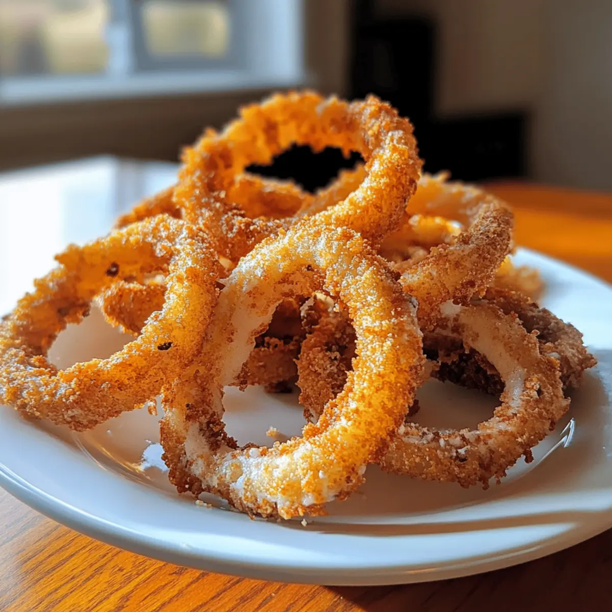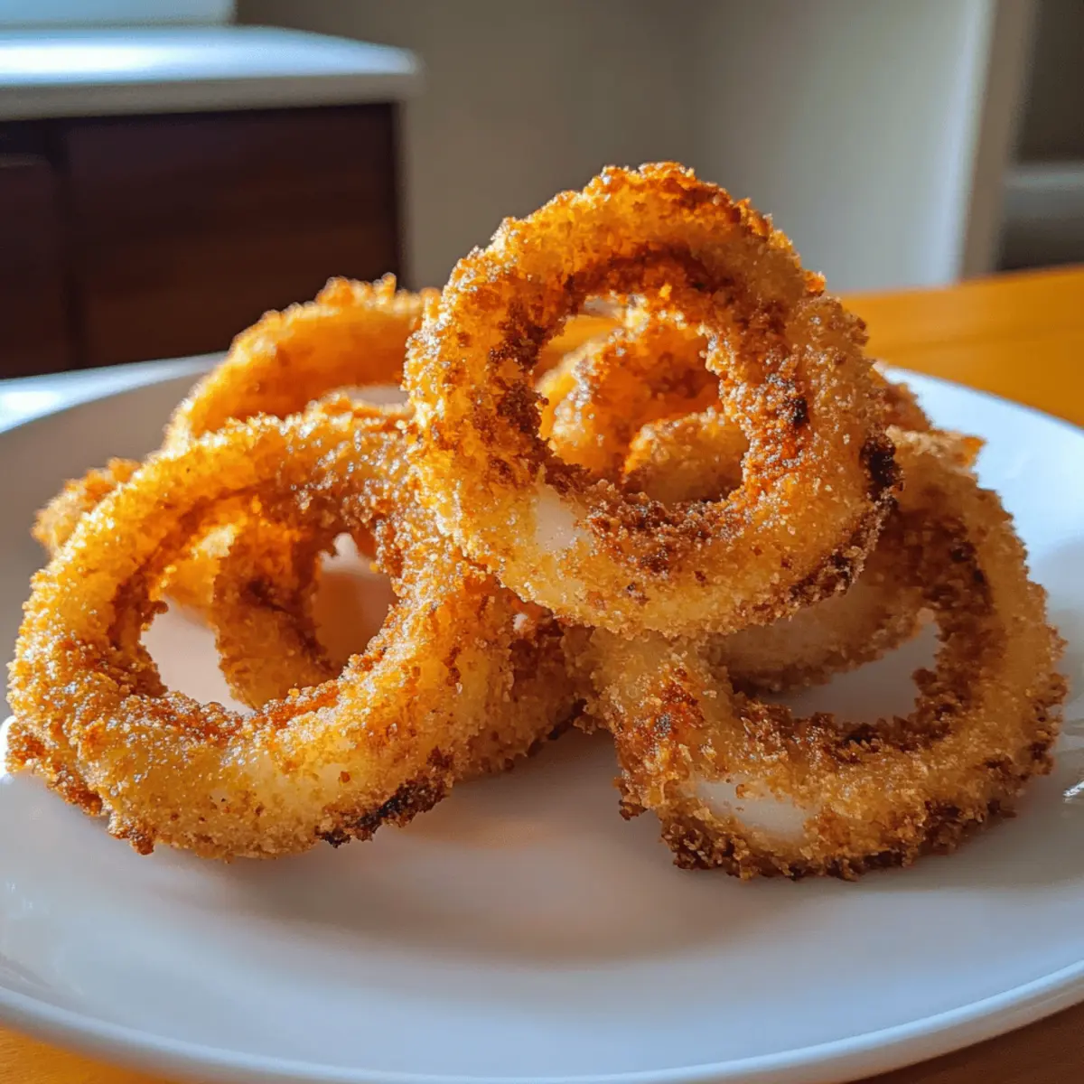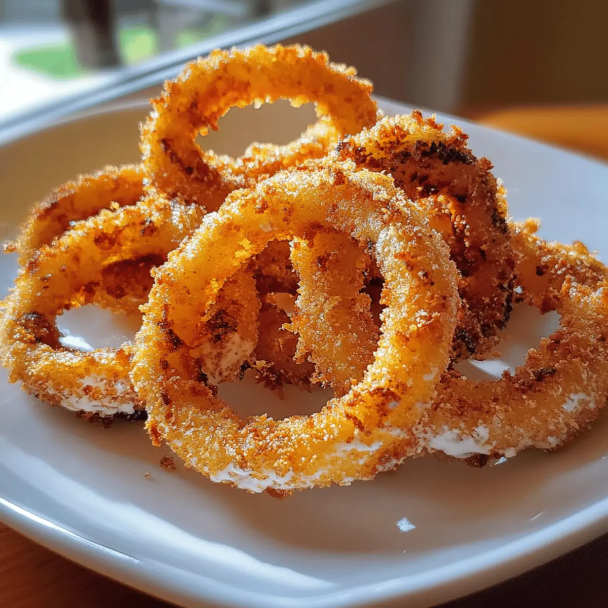 Wenn ich an den perfekten Snack für einen gemütlichen Abend denke, kommen mir sofort die Luftfritteusen-Zwiebelringe in den Sinn. Die knusprige Textur und die goldene Farbe sind unwiderstehlich und sie sind so viel gesünder als die klassischen, tiefgefrorenen Varianten. Hier sind sie, der ideale Begleiter für einen Filmabend oder als schmackhafte Beilage zu deinen Lieblingsgerichten. Mit minimalem Aufwand zubereitet und vollgepackt mit Geschmack, sind diese vegetarischen Ringe ein Hit für jeden, der schnelle und köstliche Snacks liebt. Und wer könnte schon der Versuchung widerstehen, beim Genießen einer Portion dieser knusprigen Köstlichkeiten einen weiteren Bissen zu nehmen? Bist du bereit, deinen nächsten Snack-Hit zu entdecken? Warum sind Luftfritteusen-Zwiebelringe beliebt? Köstlicher Crunch: Bei jedem Biss erwartet dich eine perfekte Kombination aus knuspriger Außenschicht und weichem Inneren. Gesunde Alternative: Diese Zwiebelringe sind fettärmer als die frittierten klassischen Versionen und bringen Genuss ohne schlechtes Gewissen. Schnelle Zubereitung: In nur wenigen Minuten sind sie bereit und genießen die Vorzüge einer schnellen Snacklösung. Vielseitigkeit: Perfekt für jeden Anlass – sei es ein gemütlicher Abend zu Hause oder ein Partyevent mit Freunden. Du kannst sie mit verschiedenen Dips wie Ranch-Dressing oder Knoblauch-Aioli servieren, um den Geschmack zu variieren. Einfach anpassbar: Experimentiere mit Gewürzen und Variationen, um neue Geschmackserlebnisse zu schaffen – Zucchini oder Auberginen sind tolle Alternativen! Luftfritteusen-Zwiebelringe Zutaten • Hier sind die benötigten Zutaten für köstliche luftfrittierte Zwiebelringe, die dich begeistern werden! Für den Teig Zwiebeln – Diese liefern die Struktur und den Geschmack; verwende gelbe Zwiebeln für mehr Süße. Weißmehl – Sorgt für eine knusprige Beschichtung; kann durch glutenfreies Mehl ersetzt werden. Paprika – Fügt milden Geschmack hinzu; geräucherte Paprika kann den Geschmack verstärken. Salz – Verstärkt den Geschmack; je nach Vorliebe anpassen. Schwarzer Pfeffer – Gibt eine würzige Note; frisch gemahlener Pfeffer sorgt für besseren Geschmack. Eier – Binden die Beschichtung; für eine vegane Option sind Leinsamen-Eier oder Aquafaba geeignet. Paniermehl – Gewährleistet die Knusprigkeit; panko sorgt für extra Crunch oder Vollkorn-Paniermehl für eine gesündere Variante. Ölspray – Verbessert die Knusprigkeit; verwende Oliven- oder Avocadoöl für zusätzlichen Geschmack. Egal, ob du ein erfahrener Koch oder ein Anfänger in der Küche bist, diese Luftfritteusen-Zwiebelringe sind einfach zuzubereiten und bieten eine köstliche, gesunde Alternative zu herkömmlichen frittierten Snacks. Step-by-Step Instructions für Luftfritteusen-Zwiebelringe Step 1: Vorheizen der Luftfritteuse Heize die Luftfritteuse auf 200°C vor, damit die Zwiebelringe gleichmäßig gegart werden. Dies dauert nur etwa 3–5 Minuten. Ein gutes Zeichen sind die leuchtenden Anzeigen und das erhebende Geräusch des Kochgeräts. So erreichst du eine perfekte Knusprigkeit für deine Luftfritteusen-Zwiebelringe. Step 2: Teigmischung vorbereiten In einer großen Schüssel vermenge Weißmehl, Paprika, Salz und schwarzen Pfeffer gründlich. Nimm dir etwa 5 Minuten Zeit, um sicherzustellen, dass alle Zutaten gleichmäßig verteilt sind. Bei der Mischung solltest du auf die leuchtend rote Farbe der Paprika achten, die in der Mischung deutlich sichtbar ist – das verspricht Geschmack und Würze. Step 3: Zwiebelringe vorbereiten Schneide die Zwiebeln in gleichmäßige Ringe, die ungefähr 1 cm dick sind. Dies ist wichtig, damit sie gleichmäßig garen. Tauche jeden Zwiebelring nacheinander in die vorbereitete Mehlmischung und achte darauf, überschüssiges Mehl abzuschütteln. Du solltest eine leicht mehlige Beschichtung auf jedem Ring sehen, bevor du mit der nächsten Zubereitung fortfährst. Step 4: Eintauchen in das Ei Schlage die Eier in einer separaten Schüssel auf und verquirle sie leicht. Nimm die bemehlten Zwiebelringe und tauche sie in die Eimischung, bis sie gleichmäßig bedeckt sind. Dieser Schritt hilft dabei, die Paniermehl-Schicht zu fixieren und sorgt für die knusprige Textur der Luftfritteusen-Zwiebelringe. Step 5: Beschichten mit Paniermehl Nimm die mit Eiern getauchten Zwiebelringe und wälze sie in einer Schüssel mit Paniermehl. Achte darauf, dass du jeden Ring gründlich bedeckst und schüttle überschüssiges Paniermehl ab. Du solltest eine schöne, dicke Schicht sehen, die den Ring umschließt, was zu einem besonders knusprigen Ergebnis führt. Step 6: Ringe in die Luftfritteuse legen Legen die beschichteten Zwiebelringe in den Garkorb deiner Luftfritteuse, ohne dass sie sich berühren. Dies sorgt für optimale Luftzirkulation und gleichmäßiges Garen. Berücksichtige die Größe deiner Luftfritteuse und teile eventuell die Zubereitung in zwei Runden auf, wenn nötig. Step 7: Anbraten und Wenden Spray leicht die Ringe mit Ölspray ein und stelle die Luftfritteuse auf 10-12 Minuten ein. Nach der Hälfte der Garzeit, etwa nach 5–6 Minuten, überprüfe die Zwiebelringe und wende sie vorsichtig, damit sie von beiden Seiten goldbraun werden und die Knusprigkeit erreichen, nach der du suchst. Step 8: Servieren und genießen Die Luftfritteusen-Zwiebelringe sind fertig, wenn sie gleichmäßig goldbraun und knusprig sind. Nimm sie aus der Luftfritteuse und lasse sie kurz abkühlen. Serviere sie warm mit deinen bevorzugten Dips wie Ranch oder Knoblauch-Aioli, um das Geschmackserlebnis zu vervollständigen! Variationen der Luftfritteusen-Zwiebelringe Entdecke die köstlichen Möglichkeiten, deine Luftfritteusen-Zwiebelringe nach deinem persönlichen Geschmack zu variieren und zu verbessern! Gemüsevariationen: Tausche die Zwiebeln gegen Zucchini oder Auberginen aus, um neue Geschmacksrichtungen zu erforschen. Diese Gemüsesorten bringen eine frische, leichte Note in das Rezept. Käse