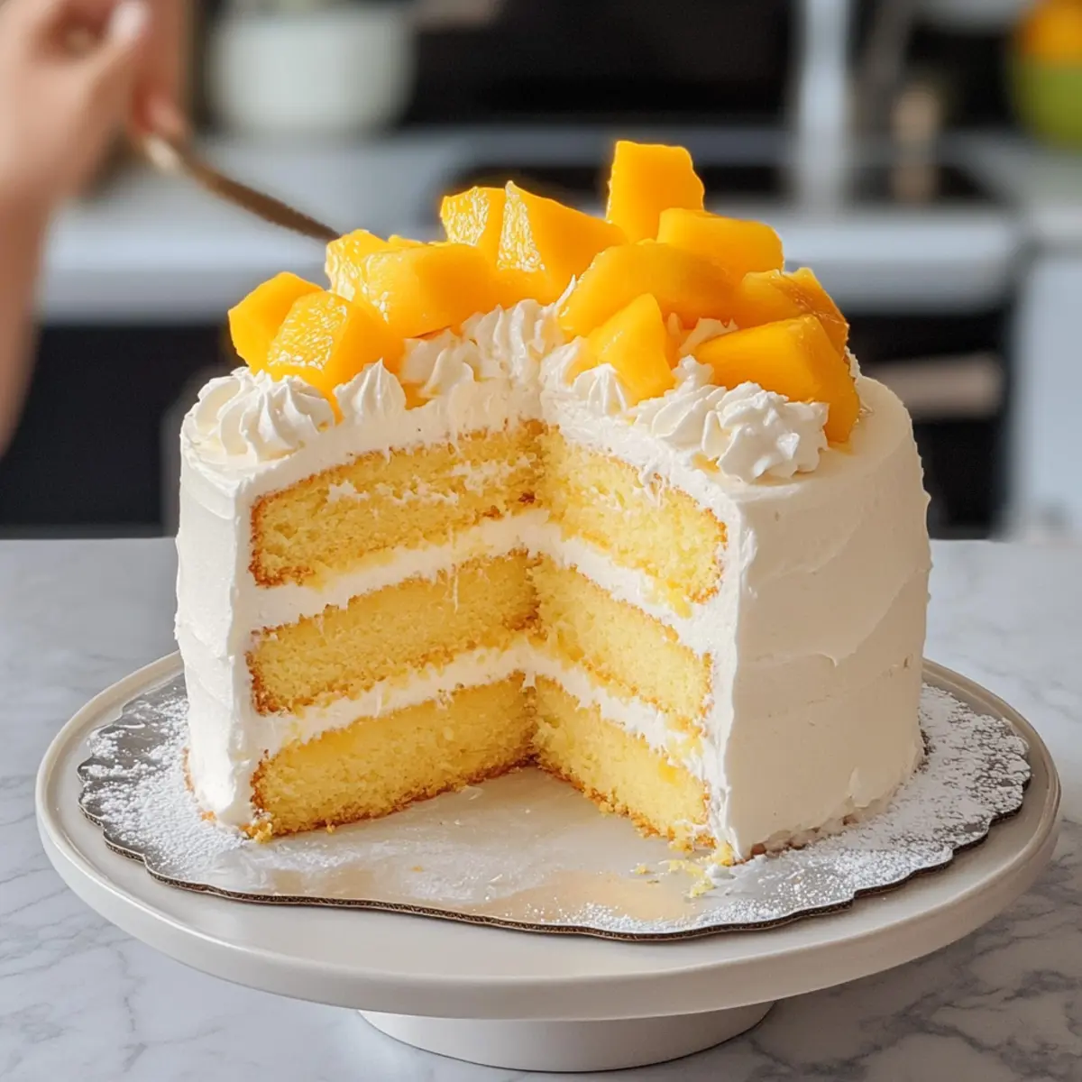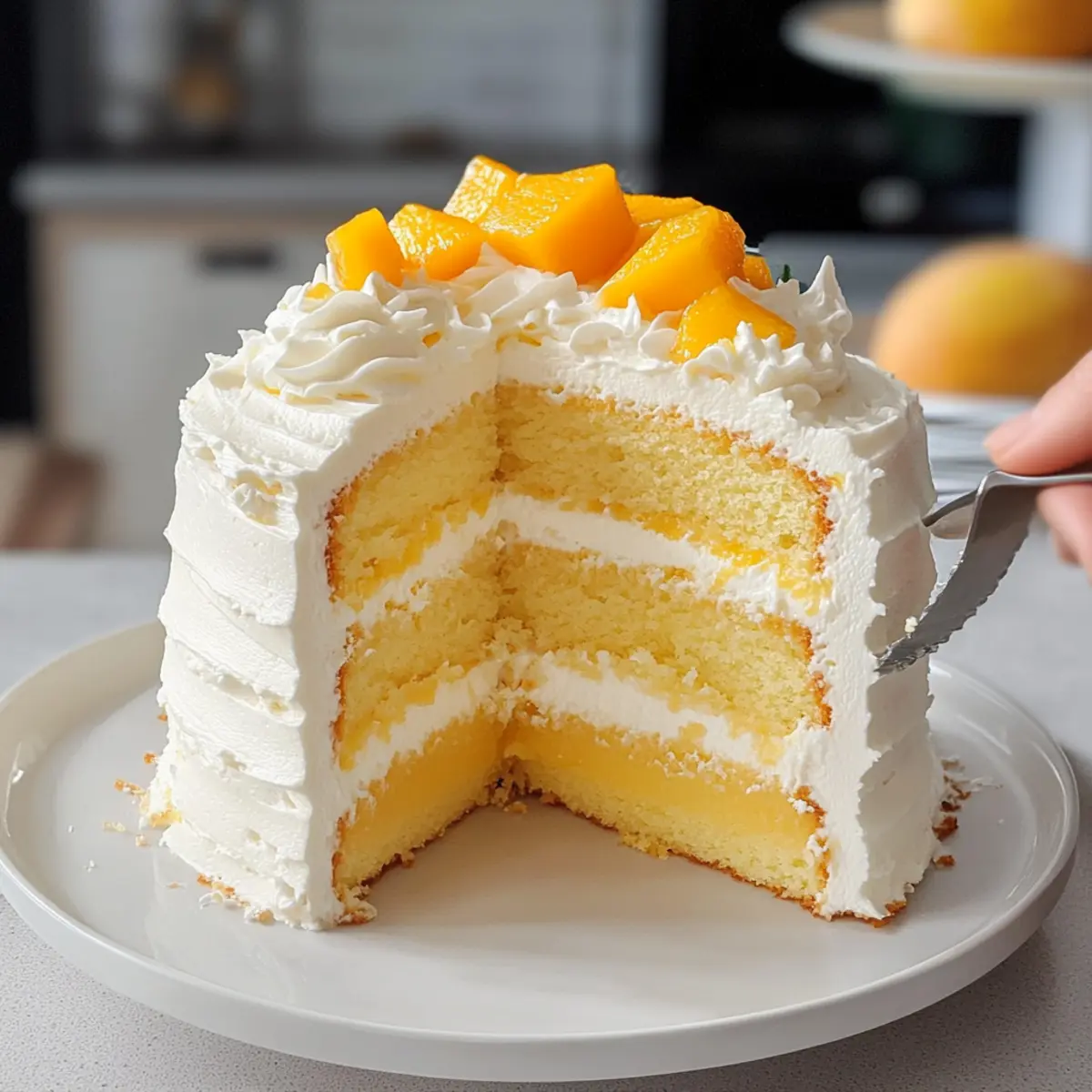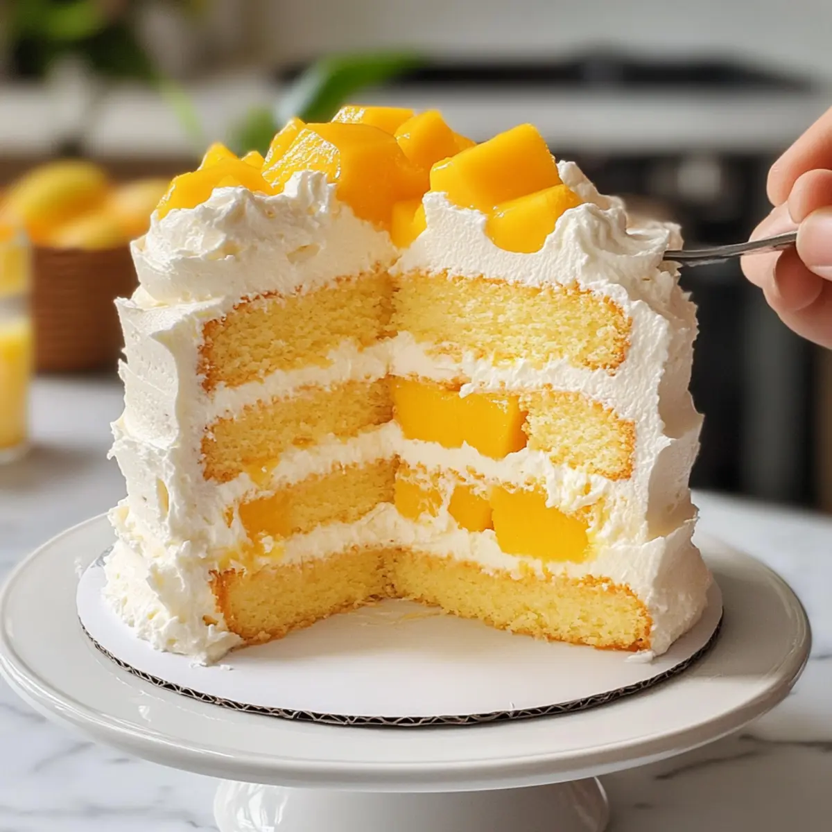 Die ersten warmen Sonnenstrahlen des Sommers bringen oft die Sehnsucht nach etwas Frischem und Leichtem mit sich. Genau hier kommt mein Rezept für einen asiatischen Mango Kuchen ins Spiel – ein Sommertraum, der nicht nur toll aussieht, sondern auch unglaublich köstlich ist. Dieser luftige Chiffon-Kuchen, gefüllt mit saftiger Mango und gekrönt mit einem zauberhaften Vanille-Schlagsahne, ist die perfekte Wahl für jede Feier oder einfach nur für einen besonderen Moment im Alltag. Er ist nicht nur ein Blickfang, sondern auch ein Genuss, der weniger süß ist als herkömmliche Kuchen und somit alle begeistern wird. Seid ihr bereit, den Sommer auf eine köstliche Art zu feiern? Warum ist dieser Mango Kuchen besonders? Einzigartig: Dieser asiatische Mango Kuchen begeistert mit seiner leichten und luftigen Textur, die jeden Bissen zum Erlebnis macht. Vielfältig: Ihr könnt ihn nach Lust und Laune anpassen, indem ihr verschiedene Früchte oder Dekorationen verwendet. Perfekte Balance: Mit weniger Süße als herkömmliche Kuchen ist er ideal für die warmen Sommertage. Einfache Zubereitung: Die Schritte sind klar und unkompliziert, perfekt auch für Anfänger. Augenschmaus: Die farbenfrohen Schichten aus Mango und Sahne machen ihn zu einem festlichen Highlight auf jedem Tisch, das alle begeistern wird! Zutaten für Mango Kuchen • Entdecke die köstlichen Zutaten, die diesen Mango Kuchen so besonders machen! Für den Teig: Cake Flour – sorgt für Struktur und Leichtigkeit des Chiffon-Kuchens. Hinweis: Kann durch Allzweckmehl ersetzt werden, aber Cake Flour ist für eine luftigere Textur bevorzugt. Baking Powder – hilft dem Kuchen, zu steigen. Hinweis: Optional, wenn die traditionelle Chiffon-Textur erhalten bleiben soll; das Rezept basiert auf geschlagenem Eiweiß für die Lockerheit. Große Eier – sowohl das Eiweiß als auch das Eigelb werden für Textur und Geschmack genutzt. Hinweis: Stelle sicher, dass die Eier Zimmertemperatur haben, um besseres Volumen beim Schlagen zu erreichen. Cream of Tartar – stabilisiert die Eiweiße beim Schlagen. Hinweis: Kann durch Zitronensaft oder Essig ersetzt werden, falls nicht verfügbar. Zucker – süßt den Kuchen; in zwei Teilen für die Meringe und die Eigelbmasse aufgeteilt. Hinweis: Kann je nach Geschmack für unterschiedliche Süße angepasst werden. Salz – verstärkt die Geschmacksbalance. Hinweis: Eine kleine Menge, aber essentiell für den Geschmack. Milch – fügt dem Teig Feuchtigkeit hinzu. Hinweis: Kann durch jede pflanzliche Milch ersetzt werden. Vanilleextrakt – verleiht Geschmack sowohl im Kuchen als auch in der Schlagsahne. Hinweis: Verwende reinen Vanilleextrakt für den besten Geschmack. Pflanzenöl – sorgt für Feuchtigkeit und hilft, den Kuchen zart zu halten. Hinweis: Kann durch geschmolzenes Kokosöl für eine tropische Note ersetzt werden. Für die Sahnehaube: Schlagsahne – sorgt für eine leichte und luftige Topping. Hinweis: Stelle sicher, dass sie kalt ist, bevor du sie schlägst, für die besten Ergebnisse. Puderzucker – süßt und stabilisiert die Schlagsahne. Hinweis: Kristallzucker kann verwendet werden, aber Puderzucker ist für eine glatte Textur bevorzugt. Frische Mangos – die Hauptzutat; sorgt für Feuchtigkeit und Süße. Hinweis: Achte auf reife Mangos, die bei leichtem Druck nachgeben, für besten Geschmack. Dieser Mango Kuchen ist nicht nur köstlich, sondern auch eine kleine Reise ins tropische Feeling des Sommers! Schritt-für-Schritt-Anleitung für Mango Kuchen Step 1: Ofen vorheizen und Formen vorbereiten Heize deinen Ofen auf 175°C vor. Währenddessen lege drei 15-cm-Kuchenformen mit Backpapier aus, um ein Anhaften des Kuchens zu verhindern. Die Vorbereitung der Formen ist entscheidend, damit der luftige Mango Kuchen nach dem Backen leicht herausgenommen werden kann. Step 2: Trockene Zutaten mischen Siebe das Cake Flour zusammen mit dem Backpulver in eine große Schüssel. Diese Kombination sorgt für die notwendige Leichtigkeit und Struktur des Kuchens. Achte darauf, keine Klumpen zu hinterlassen, um einen flaumigen Mango Kuchen zu erzielen. Step 3: Meringe zubereiten Schlage die Eiweiße zusammen mit der Cream of Tartar in einer sauberen Schüssel, bis sie schaumig sind. Füge dann nach und nach ein Drittel des Zuckers hinzu und schlage weiter, bis steife Spitzen entstehen. Diese stabilisierte Meringe ist entscheidend für die fluffige Textur deines Mango Kuchens. Step 4: Eigelbmasse vorbereiten In einer separaten Schüssel die Eigelbe mit dem restlichen Zucker, Salz, Milch und Vanille extrakt schaumig schlagen, bis die Masse hell und cremig aussieht. Dieser Schritt sorgt für Geschmack und Struktur in deinem Mango Kuchen, also achte darauf, alles gut zu vermischen. Step 5: Zutaten kombinieren Füge die gesiebten trockenen Zutaten vorsichtig zur Eigelbmasse hinzu und hebe sie sanft unter, bis keine Mehlreste mehr sichtbar sind. Danach füge die Meringe in drei Portionen hinzu und falte sie vorsichtig unter. Dies bewahrt die Luftigkeit und sorgt für einen leichten Mango Kuchen. Step 6: Backen Verteile den Teig gleichmäßig auf die vorbereiteten Kuchenformen. Backe die Kuchen 20 bis 22 Minuten lang, bis ein Zahnstocher sauber herauskommt. Lass die Kuchen anschließend in den Formen auskühlen, um sicherzustellen, dass sie nicht zusammenfallen. Step 7: Sahne schlagen Schlage die kalte Schlagsahne zusammen mit dem Puderzucker und dem Vanilleextrakt, bis sich mittelfeste Spitzen bilden. Dies kann einige Minuten dauern, also beobachte die Konsistenz genau, um sicherzustellen, dass sie leicht und luftig bleibt. Step 8: Kuchen zusammensetzen Nimm einen der abgekühlten Kuchenböden und verteile eine Schicht Schlagsahne darauf, gefolgt von einer Schicht frischer Mangostücke. Wiederhole diesen Vorgang mit den verbleibenden Kuchenböden, bis alle gestapelt sind. Dies verleiht deinem Mango Kuchen eine köstliche Frische. Step 9: Kühlen vor dem Servieren Lass den fertigen Mango Kuchen für 