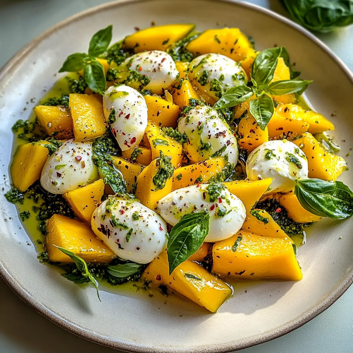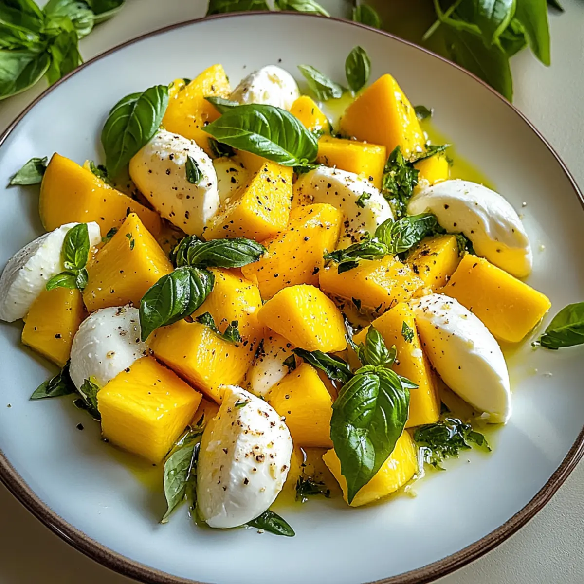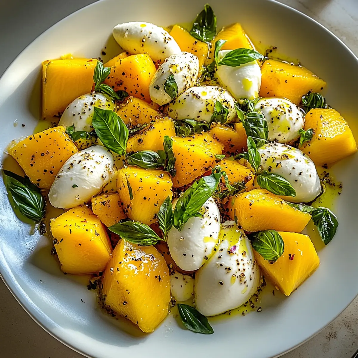 Schnell spürte ich die Sonne auf meiner Haut, während ich letzte Woche den Markt besuchte. Der verführerische Duft reifer Mangos und der frische Geruch von Kräutern zogen mich sofort an. Als ich über die verschiedenen Farben und Aromen nachdachte, hatte ich die Idee für meinen Mango-Mozzarella-Salat mit Limette & Chili. Dieser erfrischende Sommerteller vereint die süße Saftigkeit von Mango mit der Cremigkeit von Mozzarella und einem spritzigen Dressing, das Akzente von Zitrone und mildem Chili setzt. Die Zubereitung ist unkompliziert und bietet dir eine köstliche und gesunde Alternative zu schnellen Snacks, ideal für warme Tage. Wenn du zudem eine vegane Variante möchtest, kannst du die Mozzarella ganz einfach durch cremige Optionen aus Cashews oder Mandeln ersetzen! Bist du bereit, deinem Sommer mit dieser bunten Kreation einen besonderen Kick zu verleihen? Warum wirst du diesen Salat lieben? Frische Zutaten: Mit reifem Mango und cremigem Mozzarella vereint dieser Salat die besten Geschmackskomponenten des Sommers. Der erfrischende Kick von Limette macht das Gericht leicht und ansprechend. Veganer Genuss: Du kannst ganz einfach vegan genießen, indem du die Mozzarella durch eine cremige Nussalternative ersetzst – eine tolle Option für alle, die auf tierische Produkte verzichten möchten. Schnelle Zubereitung: In nur wenigen Minuten hast du ein leckeres Gericht, das ideal für spontane Grillpartys oder einen gemütlichen Abend ist. Vielfältige Variationen: Experimentiere mit weiteren Zutaten wie Avocado oder Nüssen für zusätzliche Textur und Aromen. Mische gerne frische Kräuter wie Basilikum oder Minze für eine individuelle Note! Wirkt auf den Teller: Dieser bunte Salat zieht die Blicke auf sich und erfreut nicht nur den Gaumen, sondern auch das Auge – perfekt für jede gesellige Runde! Mango-Mozzarella-Salat Zutaten • Die Zutaten für dieses leckere Rezept werden dich begeistern! Für den Salat Mango – sorgt für die süße Saftigkeit und leuchtende Farbe, wähle eine vollreife, saftige Mango für besten Genuss. Mozzarella – bietet eine cremige Textur; kannst du durch vegane Mozzarella-Alternativen aus Cashews oder Mandeln ersetzen, um das Gericht vegan zu gestalten. Lime – sorgt für Frische und Säure im Dressing; frisch gepresster Limettensaft ist ideal für den besten Geschmack. Zitronen-Thymian – liefert eine kräuterige Note mit zitrusartigen Untertönen und ergänzt das Dressing perfekt, ohne den Salat zu überlagern. Chili – bringt eine milde Schärfe, die die Süße der Mango ergänzt; variiere die Menge nach deinem gewünschten Schärfegrad. Olivenöl (Zitronenöl) – fügt Tiefe und einen Hauch von Zitronen-Aroma hinzu; ein hochwertiges aromatisiertes Olivenöl hebt den Geschmack nochmal an. Schritt-für-Schritt-Anleitungen für Mango-Mozzarella-Salat mit Limette & Chili Step 1: Zutaten vorbereiten Schäle die reife Mango und schneide sie in mundgerechte Würfel. Währenddessen bereitest du den Mozzarella vor, indem du ihn in ebenfalls kleine Stücke schneidest. Lege die vorbereiteten Zutaten in eine große Schüssel, damit du sie später einfach vermischen kannst. Achte darauf, dass die Mango saftig und gut gereift ist, um den besten Geschmack zu gewährleisten. Step 2: Dressing zubereiten In einer separaten Schüssel vermischst du den frisch gepressten Limettensaft mit hochwertigem Olivenöl – etwa zwei Teile Öl zu einem Teil Limettensaft. Füge dann die gehackten Blätter des Zitronen-Thymians und eine Prise Chili hinzu. Mische mit einem Schneebesen alles gut durch, bis das Dressing eine homogene Konsistenz erreicht hat. Schmecke es abschließend ab, um die Balance von Säure und Schärfe zu finden. Step 3: Zutaten kombinieren Gib die gewürfelte Mango und die Mozzarella-Stücke in die Schüssel mit dem zuvor zubereiteten Dressing. Vorsichtig vermischen, damit die Mango nicht zerdrückt wird, sondern gleichmäßig mit dem Dressing überzogen ist. Diese Kombination macht deinen Mango-Mozzarella-Salat mit Limette & Chili zu einem wahrhaften Hingucker, der Farben und Aromen miteinander vereint. Step 4: Servieren und genießen Serviere den Salat umgehend, um die Frische und die knackige Textur der Zutaten zu bewahren. Stelle sicher, dass du das Dressing erst kurz vor dem Servieren hinzufügst, um die Sorgfalt und den Geschmack perfekt in den ersten Bissen zur Geltung zu bringen. Dieser Salat ist nicht nur köstlich, sondern auch ein echter Hingucker auf jedem Tisch. Expert Tips für Mango-Mozzarella-Salat Frische Zutaten verwenden: Nutze reife Mango und frischen Mozzarella, um den besten Geschmack in deinem Mango-Mozzarella-Salat zu erzielen. Achte darauf, die Mango gut auszuwählen! Dressing anpassen: Schmecke das Dressing gründlich ab, bevor du es mit den Zutaten vermischst. So kannst du die Säure und Schärfe perfekt auf deine Vorlieben abstimmen. Nicht zu lange ziehen lassen: Lass den Salat nach dem Anrichten 5–10 Minuten ruhen, damit die Aromen sich entfalten. Vermeide jedoch, ihn zu lange ziehen zu lassen, um die Konsistenz der Mozzarella nicht zu beeinträchtigen. Vegan leicht gemacht: Für eine vegane Variante, ersetze den Mozzarella durch vegane Alternativen aus Cashews oder Mandeln. Diese sorgen für eine cremige Textur ohne tierische Produkte. Kreativ variieren: Füge zusätzliche Zutaten wie Avocado oder Nüsse hinzu, um deinem Salat mehr Textur und Geschmack zu verleihen. Experimentiere mit verschiedenen Kräutern für neue Geschmackskombinationen! Mango-Mozzarella-Salat Variationen Lass deiner Kreativität freien Lauf und entdecke, wie du diesen Salat ganz nach deinem Geschmack anpassen kannst! Vegan: Ersetze den Mozzarella durch vegane Mozzarella-Alternativen aus Cashews oder Mandeln für einen feinen, cremigen Genuss. So kannst du auch ohne tierische Produkte schlemmen. Mehr Würze: Füge frischen Chili hinzu, um dem Salat eine angenehm pikante Note zu verleihen. Ein bisschen Schärfe harmoniert wunderbar mit der Süße
