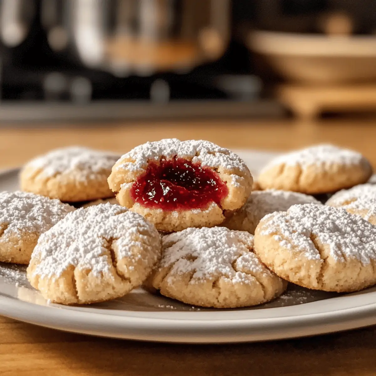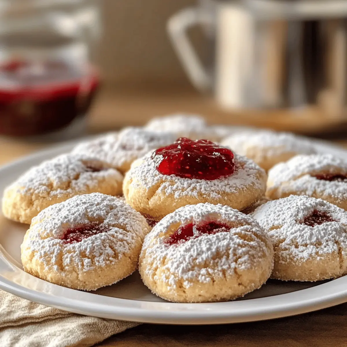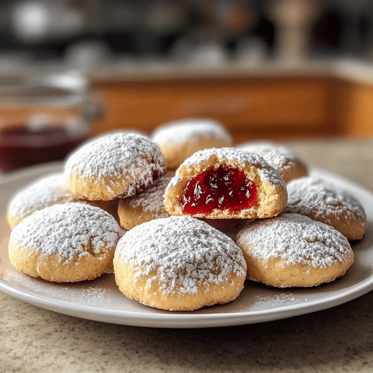 Die warmen Düfte frisch gebackener Kekse können einen sofort in eine nostalgische Zeit versetzen, in der das Backen noch mit der Familie und Freundinnen geteilt wurde. Wenn es um einfache, aber köstliche Leckereien geht, sind meine Marmeladen-Küsschen vom Blech die wahren Stars. Diese märchenhaft zarten Kekschen, gefüllt mit fruchtiger Marmelade, sind nicht nur ein Genuss für die Sinne, sondern auch ein wahrer Publikumsmagnet bei jeder Kaffeetafel. Und das Beste? Sie sind schnell zubereitet und schmecken einfach himmlisch! Egal, ob mit Himbeermarmelade, Erdbeermus oder einer anderen festen Fruchtfüllung – jeder Bissen erinnert an die süßen Momente des Lebens. Neugierig, wie diese kleinen Köstlichkeiten hergestellt werden? Lass uns gemeinsam in das Rezept eintauchen! Warum wirst du diese Kekse lieben? Einfachheit, die überzeugt: Mit nur wenigen Zutaten und klaren Schritten sind die Marmeladen-Küsschen vom Blech schnell zubereitet. Fruchtige Fülle: Der leckere Marmeladenkern sorgt für einen fruchtigen Kick, der dein Geschmackserlebnis bereichert. Vielseitigkeit in der Auswahl: Ob Himbeere, Erdbeere oder Johannisbeere – du kannst die Füllung nach deinem persönlichen Geschmack anpassen. Perfekte Kombination: Die Kombination aus zartem Keks und fruchtiger Marmelade ist einfach unwiderstehlich und sorgt für glückliche Gesichter bei jedem Bissen. Zeitersparnis: Mit der Möglichkeit, den Teig im Voraus zuzubereiten, kannst du diese Köstlichkeiten schnell backen, wann immer du Lust darauf hast. Diese Kekse sind nicht nur einfach zu machen, sondern auch ideal für jede Kaffeetafel – du wirst sie lieben! Marmeladen-Küsschen vom Blech Zutaten • Diese einfachen Kekse sind schnell zubereitet! Für den Teig Butter – Basis für einen zarten Teig; verwende weiche Butter für optimale Textur. Puderzucker – Sorgt für Süße und hilft, eine feinere Textur zu erzielen; kann nicht durch Kristallzucker ersetzt werden, da dies die Dichte beeinflusst. Weizenmehl Typ 405 – Wichtig für einen leichten, flauschigen Keks; kann durch Allzweckmehl ersetzt werden, aber die Textur könnte leicht variieren. Ei – Bindet die Zutaten und sorgt für Feuchtigkeit im Teig; ein Leinsamen-Ei kann als vegane Alternative verwendet werden. Salz – Verstärkt die Süße; füge eine Prise Meersalz für ein ausgewogenes Geschmacksprofil hinzu. Vanilleextrakt – Fügt Tiefe und einen süßen Duft hinzu; kann durch Mandelessenz für ein anderes Aroma ersetzt werden. Für die Füllung Fruchtaufstrich – Essentiell für die Füllung; wähle einen festen Fruchtaufstrich, um ein Überlaufen während des Backens zu verhindern (z. B. Himbeermarmelade, Erdbeermus oder Johannisbeer-Marmelade). Diese Marmeladen-Küsschen vom Blech sind eine wunderbare Möglichkeit, die Freude am Backen neu zu entdecken! Schritt-für-Schritt-Anleitung für Marmeladen-Küsschen vom Blech Step 1: Teig vorbereiten Die weiche Butter mit dem Puderzucker in einer Rührschüssel cremig schlagen, bis die Mischung hell und luftig ist. Das Ei, eine Prise Salz und Vanilleextrakt hinzufügen und gut verrühren. So entsteht eine zarte Basis für die Marmeladen-Küsschen vom Blech, die bereits jetzt verführerisch duftet. Step 2: Trockene Zutaten mischen Das Weizenmehl Typ 405 allmählich zur Butter-Ei-Mischung hinzufügen und alles mit einem Teigschneider oder der Hand zu einem geschmeidigen Teig verkneten. Achten Sie darauf, nicht zu lange zu kneten, damit die Kekse schön zart bleiben. Der Teig sollte gleichmäßig und gut verarbeitet sein. Step 3: Teig kühlen Den Teig zu einer Kugel formen, in Frischhaltefolie wickeln und mindestens 30 Minuten im Kühlschrank kühl stellen. Diese Chill-Phase hilft, den Teig fester zu machen, sodass die Marmeladen-Küsschen beim Backen ihre Form behalten und die Füllung nicht überläuft. Step 4: Ofen vorheizen Während der Teig kühlt, den Backofen auf 180°C (356°F) vorheizen. Dies gewährleistet, dass die Marmeladen-Küsschen vom Blech sofort gleichmäßig backen, sobald Sie den Teig formen und in den Ofen geben. Step 5: Kekse formen Den gekühlten Teig auf einer leicht bemehlten Arbeitsfläche in kleine Portionen teilen und zu kleinen Kugeln formen. Diese auf ein mit Backpapier ausgelegtes Backblech legen und mit dem Daumen oder einem kleinen Utensil in der Mitte eine Vertiefung schaffen. So haben die Kekse Platz für die Marmelade. Step 6: Füllung hinzufügen In jede Vertiefung einen Teelöffel der ausgewählten Fruchtmarmelade vorsichtig einfüllen. Achten Sie darauf, die Füllung nicht zu überladen, damit sie beim Backen nicht überläuft. Der Marmeladenkern wird einen herrlichen fruchtigen Geschmack zu den Marmeladen-Küsschen vom Blech beitragen. Step 7: Zweites Kühlen Das Backblech mit den gefüllten Keksen für weitere 30 Minuten in den Kühlschrank stellen. Dadurch wird sichergestellt, dass die Struktur der Kekse während des Backens stabil bleibt und die Füllung gut in der Vertiefung bleibt. Step 8: Backen Die Kekse im vorgeheizten Ofen 12–15 Minuten backen, bis die Ränder leicht goldbraun sind. Achten Sie darauf, dass die Marmelade in den Vertiefungen beginnt zu blubbern, was ein Zeichen dafür ist, dass die Kekse fertig sind. Step 9: Abkühlen und Puderzucker bestäuben Die Marmeladen-Küsschen vom Blech kurz auf dem Backblech auskühlen lassen, bevor Sie sie vorsichtig auf ein Kuchengitter umsetzen. Wenn sie vollständig abgekühlt sind, großzügig mit Puderzucker bestäuben und servieren – das macht sie nicht nur köstlich, sondern auch ansprechend! Vorbereiten der Marmeladen-Küsschen vom Blech für stressfreies Backen Die Marmeladen-Küsschen vom Blech sind perfekt für eine intelligente Vorbereitung! Du kannst den Teig bis zu 24 Stunden im Voraus zubereiten und in Frischhaltefolie gewickelt im Kühlschrank aufbewahren. Ebenso kannst du die gefüllten Kekse für bis zu 3 Tage vor dem Backen kühl lagern, um sicherzustellen, dass die Füllung während des Backens nicht 