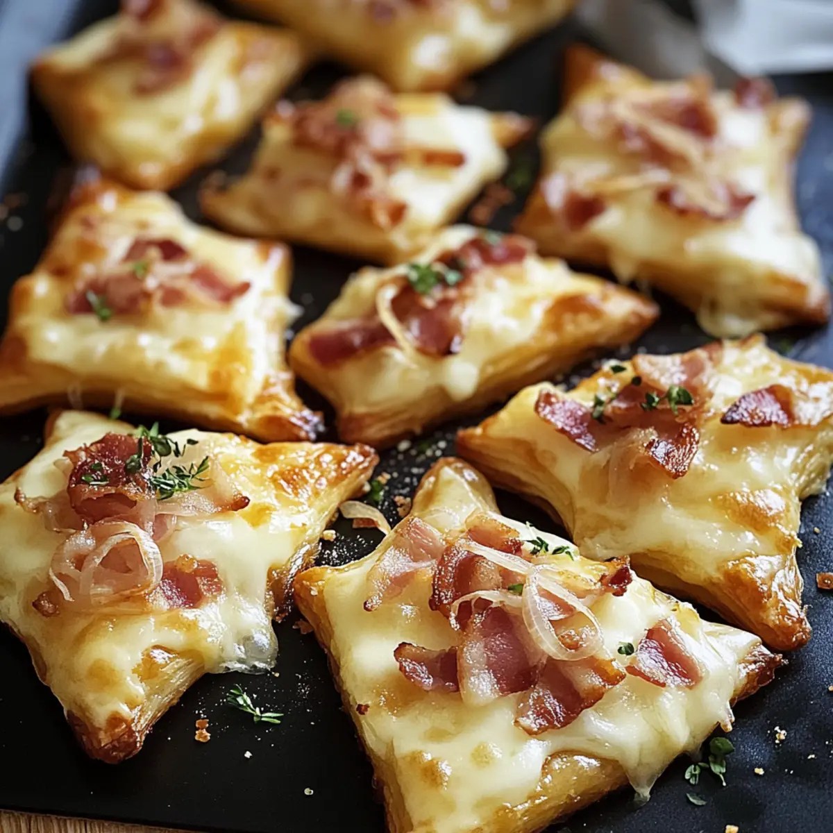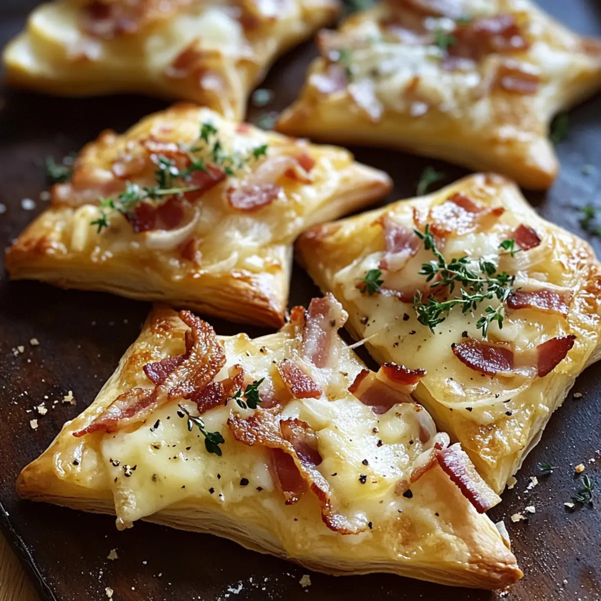 Wenn ich an unvergessliche Partys denke, kommen mir sofort die Mini Flammkuchen Sterne in den Sinn – ein wahres Highlight auf jedem Tisch! Diese kleinen, knusprigen Sterne sind nicht nur ein echter Augenschmaus, sondern auch im Handumdrehen zubereitet. Ideal, um Freunde und Familie zu beeindrucken, ohne stundenlang in der Küche zu stehen, sind sie das perfekte Fingerfood für jede Gelegenheit. Die Kombination aus zartem Teig, cremigem Schmand und würzigem Belag bietet unzählige Möglichkeiten zur Anpassung, sei es mit vegetarischen Zutaten oder köstlichem Räucherlachs. Verwöhnen Sie Ihre Gäste mit diesen herzhaften Köstlichkeiten und entdecken Sie, wie einfach es ist, beim nächsten Treffen für Begeisterung zu sorgen! Probieren Sie sie aus und lassen Sie sich überraschen, welche kreativen Variationen Ihnen einfallen! Warum sind Mini Flammkuchen Sterne besonders? Vielseitigkeit ist einer der größten Vorteile dieser Rezeptidee. Ob mit frischen Kräutern, gemischtem Gemüse oder sogar Räucherlachs – Ihre Kreativität kennt keine Grenzen! Schnelle Zubereitung sorgt dafür, dass Sie in kürzester Zeit ein beeindruckendes Fingerfood zaubern können, ideal für unerwartete Gäste oder spontane Feiern. Leichte Anpassbarkeit macht sie perfekt für Vegetarier oder unterschiedliche Geschmäcker, weshalb jeder etwas findet, das ihm schmeckt. Cremiger Genuss verbindet sich mit einer knusprigen Textur, die einfach unwiderstehlich ist. Bereiten Sie die Sterne im Voraus vor und backen Sie sie frisch, um das perfekte Erlebnis für Ihre Gäste zu garantieren! Mini Flammkuchen Sterne Zutaten • Für den Teig Flammkuchenteig – Ideal für einen schnellen Start; verwenden Sie auch fertigen Teig, wenn es schnell gehen soll. • Für den Belag Schmand – Verleiht eine cremige Note; kann durch crème fraîche oder saure Sahne ersetzt werden. Speckwürfel – Fügt herzhaften Geschmack hinzu; für eine vegetarische Variante einfach weglassen oder mit Räuchertofu ersetzen. Zwiebel – Für Süße und Textur; rote Zwiebeln sorgen für einen milderen Geschmack. Frischkäse – Macht die Mischung herrlich cremig; Neufchâtel kann als fettärmere Alternative genutzt werden. Gouda – Schmilzt schön und bringt Reichhaltigkeit; kann durch eine pflanzliche Käsealternative ersetzt werden. Frischer Rosmarin – Verleiht ein aromatisches Flair; probieren Sie auch Thymian oder Oregano für andere Geschmacksrichtungen. Salz und Pfeffer – Verstärkt den Gesamtschmack; nach persönlichem Belieben anpassen. Die Mini Flammkuchen Sterne sind eine kreative Fingerfood-Idee, die sich einfach anpassen lässt! Schritt-für-Schritt-Anleitung für Mini Flammkuchen Sterne Step 1: Ofen vorheizen Heizen Sie den Ofen auf 200°C (392°F) vor. Dies ist wichtig, damit die Mini Flammkuchen Sterne gleichmäßig backen und schön knusprig werden. Während der Ofen vorheizt, können Sie sich bereits um die Vorbereitung der Zutaten kümmern. Step 2: Teig vorbereiten Rollen Sie den Flammkuchenteig auf einer leicht bemehlten Arbeitsfläche aus. Verwenden Sie einen Ausstecher oder ein scharfes Messer, um den Teig in formschöne Sternchen zu schneiden. Legen Sie die Teigsterne auf ein mit Backpapier ausgelegtes Blech, sodass genügend Platz zwischen ihnen bleibt, um ein Zusammenkleben zu verhindern. Step 3: Belag anrühren In einer Schüssel mischen Sie den Schmand mit dem Frischkäse. Würzen Sie die Mischung großzügig mit Salz und Pfeffer, um den Geschmack zu intensivieren. Verteilen Sie dann eine gleichmäßige Schicht dieser cremigen Mischung auf den vorbereiteten Teigsternen, sodass der Geschmack der Mini Flammkuchen Sterne perfekt zur Geltung kommt. Step 4: Zwiebeln und Speck hinzufügen Schneiden Sie die Zwiebel in dünne Ringe und verteilen Sie diese gleichmäßig auf den bestrichenen Teigsternen. Fügen Sie die Speckwürfel hinzu, gleichmäßig darüber gestreut. Achten Sie darauf, den Belag nicht zu überladen, damit die Sterne knusprig bleiben und die Aromen gut zur Geltung kommen. Step 5: Käse und Kräuter streuen Bestreuen Sie die vorbereiteten Sterne großzügig mit geriebenem Gouda und frischem Rosmarin. Der Gouda sorgt beim Backen für eine köstliche Schmelzschicht. Hier können Sie auch gerne andere Käsesorten oder Kräuter nach Ihrem Geschmack verwenden, um die Mini Flammkuchen Sterne individuell anzupassen. Step 6: Backen Schieben Sie das Backblech in den vorgeheizten Ofen und backen Sie die Mini Flammkuchen Sterne für 10-12 Minuten. Beobachten Sie die Sterne während des Backens; sie sind fertig, wenn die Ränder goldbraun und knusprig sind. So kommen sie perfekt auf den Tisch und sind bereit, serviert zu werden. Tipps für die besten Mini Flammkuchen Sterne • Richtige Teigstärke: Achten Sie darauf, den Flammkuchenteig gleichmäßig auszurollen, damit die Mini Flammkuchen Sterne schön knusprig werden. Zu dicke Ränder können matschig sein. • Toppings nicht überladen: Vermeiden Sie es, zu viele Zutaten auf die Sterne zu geben. Ein leichter Belag sorgt für die perfekte Balance zwischen Knusprigkeit und Geschmack. • Ofen gut beobachten: Kontrollieren Sie die Mini Flammkuchen Sterne während des Backens regelmäßig. Jeder Ofen ist anders, also ziehen Sie sie heraus, sobald die Ränder goldbraun sind. • Gesunde Variationen: Experimentieren Sie mit verschiedenen Toppings wie buntem Gemüse oder Feta, um gesunde und köstliche Mini Flammkuchen Sterne zu kreieren. • Vorbereitung ist alles: Bereiten Sie die Sterne im Voraus vor und lagern Sie sie im Kühlschrank. Backen Sie sie frisch, um Ihre Gäste mit warmem, knusprigem Fingerfood zu begeistern. Mini Flammkuchen Sterne Variationen Entdecken Sie, wie Sie Ihre Mini Flammkuchen Sterne nach Lust und Laune anpassen können! Lassen Sie Ihrer Kreativität freien Lauf und genießen Sie verschiedene Geschmäcker und Texturen. Vegetarisch: Verwenden Sie gebratene Champignons, Paprika oder Zucchini für eine bunte, fleischlose Variante. Gourmet-Twist: F