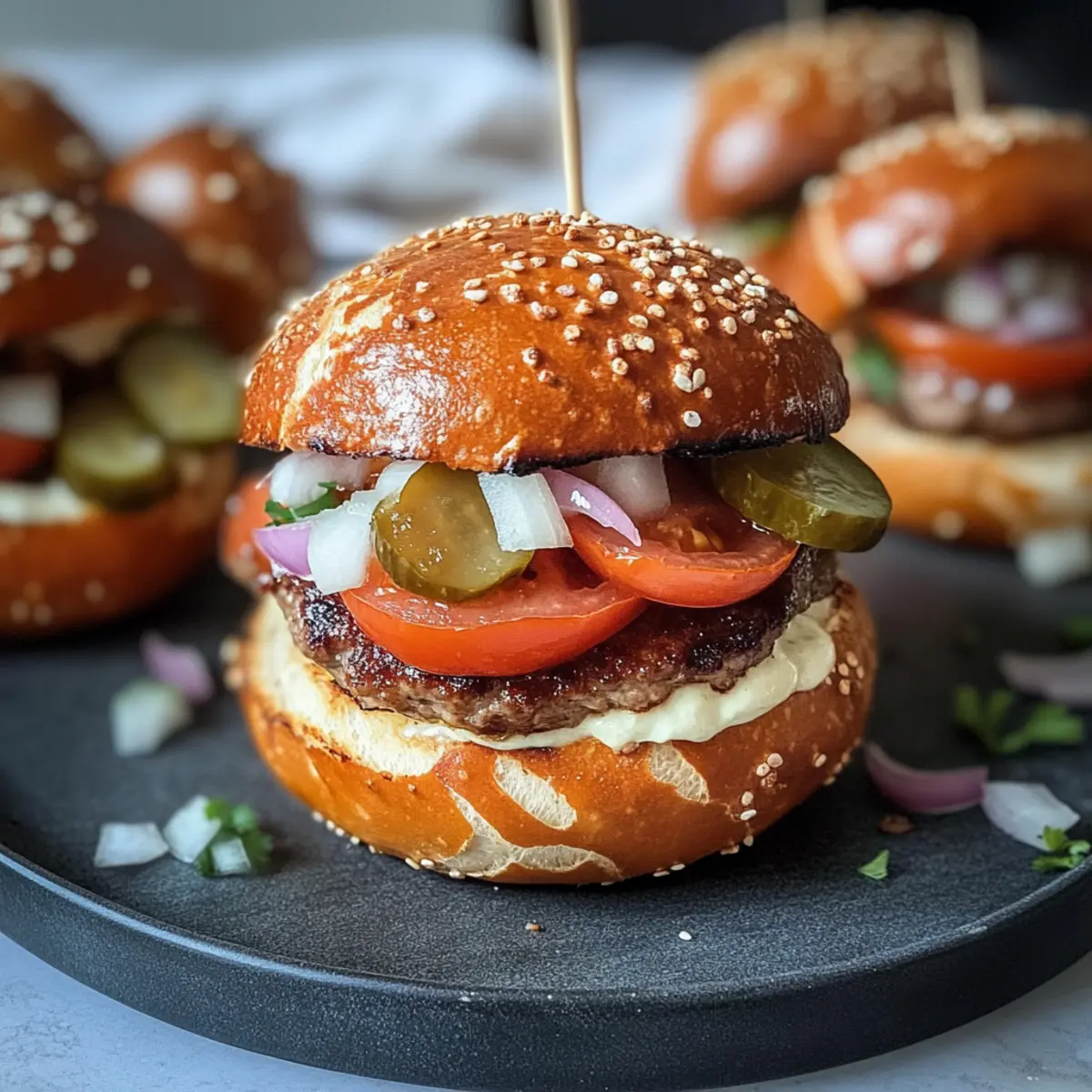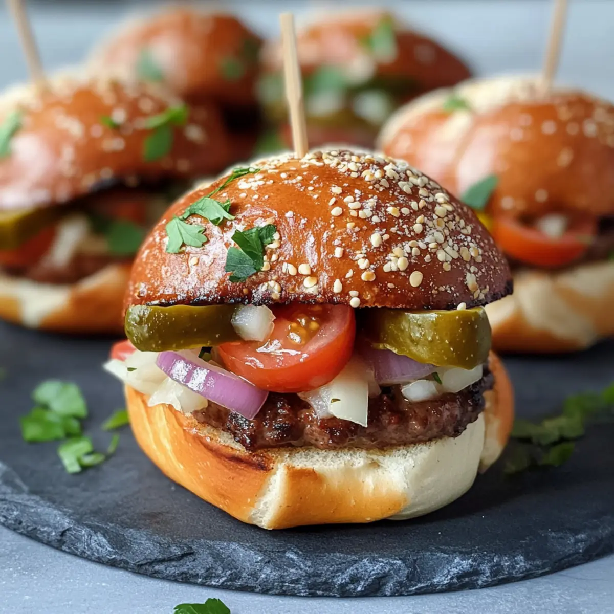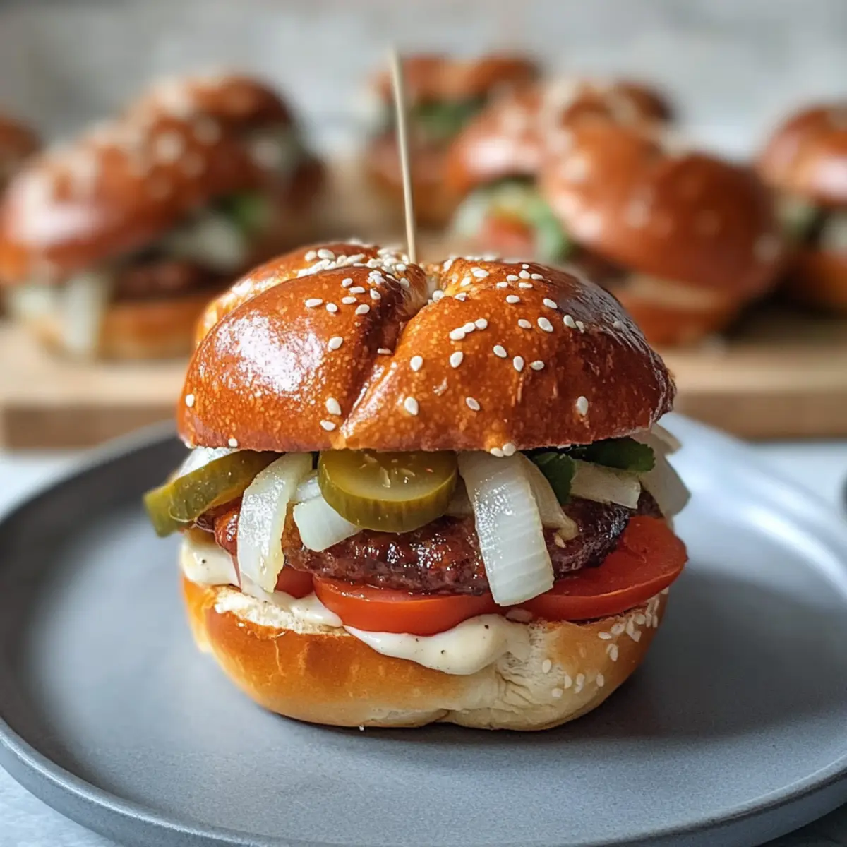 Was für ein Anblick! Wenn die ersten Küchengerüche sich in der Luft verbreiten und meine Mini Laugenburger mit Leberkäse im Ofen backen, fühle ich mich sofort in die herzliche Atmosphäre eines Oktoberfestes versetzt. Diese kleinen Burger sind nicht nur eine köstliche Neuinterpretation klassischer Burger, sondern auch perfekte Fingerfood für jede Party. In nur 30 Minuten zauberst du diese feinen Snacks, die sich wunderbar anpassen lassen – egal ob du sie mit frischen Cherrytomaten, knackigem Eisbergsalat oder einer ordentlichen Portion süßem Senf verfeinerst. Ihre Kombination aus weichen Laugenbrötchen und herzhaftem Leberkäse macht sie zum Hingucker und Gaumenschmaus zugleich. Bist du bereit, deine Gäste mit diesen unwiderstehlichen Mini Burgern zu begeistern? Warum werden diese Mini Laugenburger geliebt? Einfachheit: Die Zubereitung dieser Mini Laugenburger ist kinderleicht und benötigt nur grundlegende Kochkenntnisse. Sie sind in weniger als 30 Minuten fertig! ** Vielseitigkeit:** Ob bei einer Party oder dem Oktoberfest – diese Burger lassen sich problemlos mit deinen Lieblingsbelägen anpassen. Von frischen Cherrytomaten bis zu würzigen Jalapeños, deiner Kreativität sind keine Grenzen gesetzt! Köstlicher Geschmack: Die Kombination aus weichem Laugenbrötchen und herzhaftem Leberkäse sorgt für einen wahren Geschmacksexplosion. Die knackigen Gurken und der süße Senf runden das Gesamtbild perfekt ab. Beliebtes Fingerfood: Diese Mini Laugenburger sind der ideale Snack für gesellige Runden und ziehen die Blicke auf sich. Sie sind genau das richtige für deine nächste Feier! Frische ist entscheidend: Serviere sie am besten frisch aus dem Ofen, um das volle Aroma zu genießen. Eine echte Geschmackserfahrung, die du und deine Gäste nicht vergessen werden! Um noch mehr leckere Variationen auszuprobieren, schau dir auch meine Tipps für Vegetarische Alternativen an! Mini-Laugen-Burger Zutaten • Für die Laugenbrötchen: Laugenstangen – Sie dienen als köstliche Basis für die Burger; gefrorene Stangen sind super praktisch. • Für die Füllung: Leberkäse – Der Hauptbestandteil, der für reichhaltigen Geschmack sorgt; kannst du durch Hähnchen- oder pflanzliche Alternativen ersetzen. • Für die Frische: Cherrytomaten – Bringen Farbe und Frische; reguläre Tomaten sind auch möglich, pass jedoch die Menge an. Zwiebel – Sorgt für Crunch; verwende rote für mehr Süße oder lasse sie weg, wenn du es milder magst. Saure Gurken – Für die nötige Säure; Jalapeños bringen Schärfe oder lass sie für weniger Säure einfach weg. Eisbergsalat – Gefühl von Knackigkeit, alternativ geht auch Spinat oder Rucola. • Für das Finish: Süßer Senf – Gibt den Burgern den letzten Schliff; du kannst auch einen körnigen Senf für einen anderen Geschmack verwenden. Bereite die Mini-Laugen-Burger mit Leberkäse so einfach und lecker vor, dass sie bei jeder Einladung auf die nächste Feier für Begeisterung sorgen werden! Schritt-für-Schritt-Anleitung für Mini-Laugen-Burger mit Leberkäse Step 1: Laugenstangen vorbereiten Nehme 8 gefrorene Laugenstangen und lasse sie auftauen. Sobald sie weich sind, schneide jede Stange in vier gleichmäßige Stücke. Diese Stücke bilden die Basis für deine Mini Laugenburger mit Leberkäse. Achte darauf, saubere Schnitte zu machen, um eine gleichmäßige Form zu erhalten. Step 2: Backen Lege die geschnittenen Laugenstücke auf ein mit Backpapier ausgelegtes Blech und stelle sicher, dass sie genügend Platz haben. Heize den Ofen auf 180°C vor und backe die Laugenstücke für etwa 12 Minuten, bis sie goldbraun sind. Die angenehme, goldene Farbe zeigt dir, dass sie perfekt gebacken sind. Step 3: Füllung zubereiten Während die Laugenstücke im Ofen sind, würfle 200g Leberkäse und 1 Zwiebel in kleine Stücke. Erhitze eine Pfanne bei mittlerer Hitze und brate die gewürfelte Mischung für etwa 5-7 Minuten, bis der Leberkäse leicht knusprig und die Zwiebel goldbraun ist. Der Duft, der während des Bratens entsteht, macht Lust auf mehr! Step 4: Gemüse schneiden Nimm dir 100g Cherrytomaten, 5 saure Gurken und 1/4 Eisbergsalat zur Hand. Würfle die Tomaten und die Gurken, und schneide den Eisbergsalat in feine Streifen. Das frisch geschnittene Gemüse wird deinem Mini Laugenburger eine tolle Farbe und Textur verleihen. Step 5: Burger zusammenstellen Sobald die Laugenstücke aus dem Ofen kommen, schneide sie horizontal auf, aber nicht ganz durch. Bestreiche die Innenseiten mit 2 EL süßem Senf. Schichte dann die gebratene Leberkäse-Zwiebel-Mischung, gefolgt von den geschnittenen Tomaten, Gurken und dem Eisbergsalat hinein. Step 6: Sichern Um die Mini Laugenburger zu fixieren, stecke Zahnstocher in die geschichteten Burger, damit sie beim Servieren nicht auseinanderfallen. Diese kleine Maßnahme sorgt dafür, dass deine Gäste sie einfach greifen und genießen können, ohne dass etwas herausfällt. Lagerungstipps für Mini-Laugen-Burger mit Leberkäse Raumtemperatur: Mini Laugenburger sollten idealerweise frisch serviert werden. Wenn du sie jedoch für kurze Zeit bei Raumtemperatur lassen musst, bedecke sie mit einem Küchentuch, damit sie nicht austrocknen. Kühlschrank: Lagere übrig gebliebene Mini Laugenburger in einem luftdichten Behälter im Kühlschrank für bis zu 2 Tage. Dies hilft, ihren Geschmack und ihre Frische so gut wie möglich zu bewahren. Aufwärmen: Zum Aufwärmen die Mini Laugenburger in den Ofen bei 150°C für etwa 10 Minuten legen. So werden sie wieder schön warm und knusprig. Einfrieren: Gefrorene Mini Laugenburger können für bis zu 2 Monate im Gefrierfach aufbewahrt werden. Wickele sie einzeln in Frischhaltefolie und lege sie dann in einen Gefrierbeutel. Achte darauf, sie vollständig aufzutauen, bevor du sie aufwärmst. Mini-Laugen-Burger Variationen & Alternativen Lasse deiner Kreativität freien Lauf und entdecke die köstlichen Möglichkeiten, wie du diese Mini Laugenburger noch ansprechender gesta