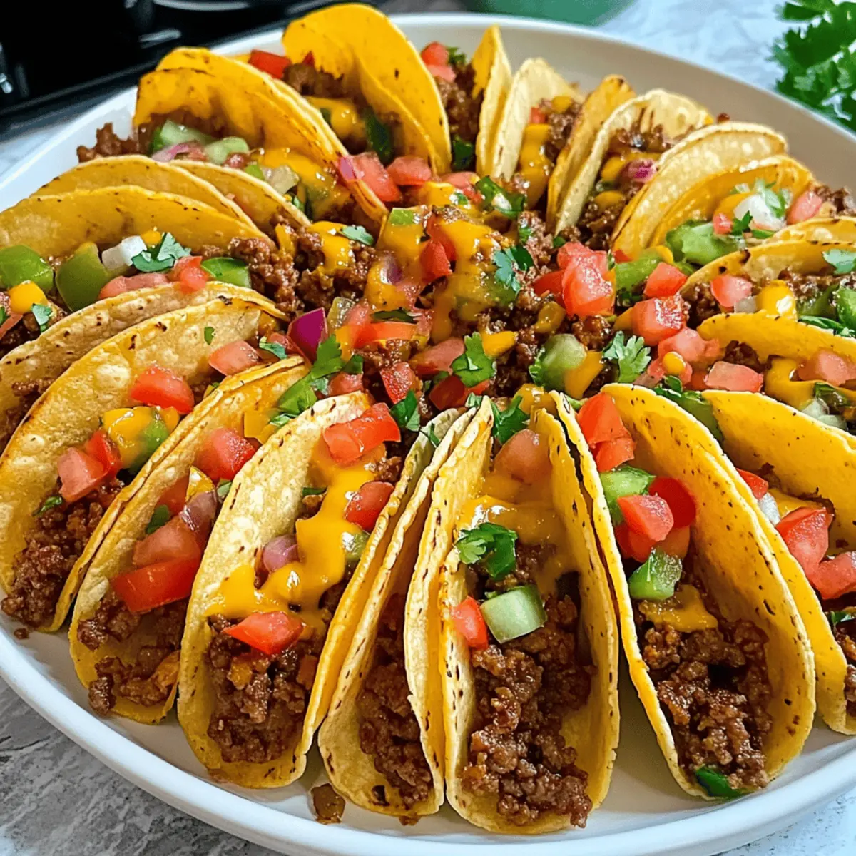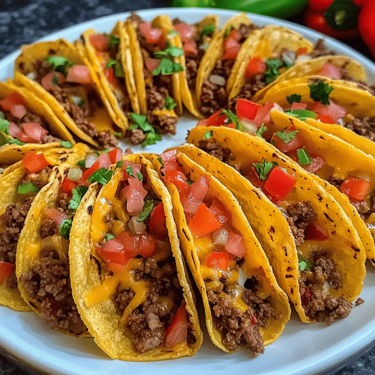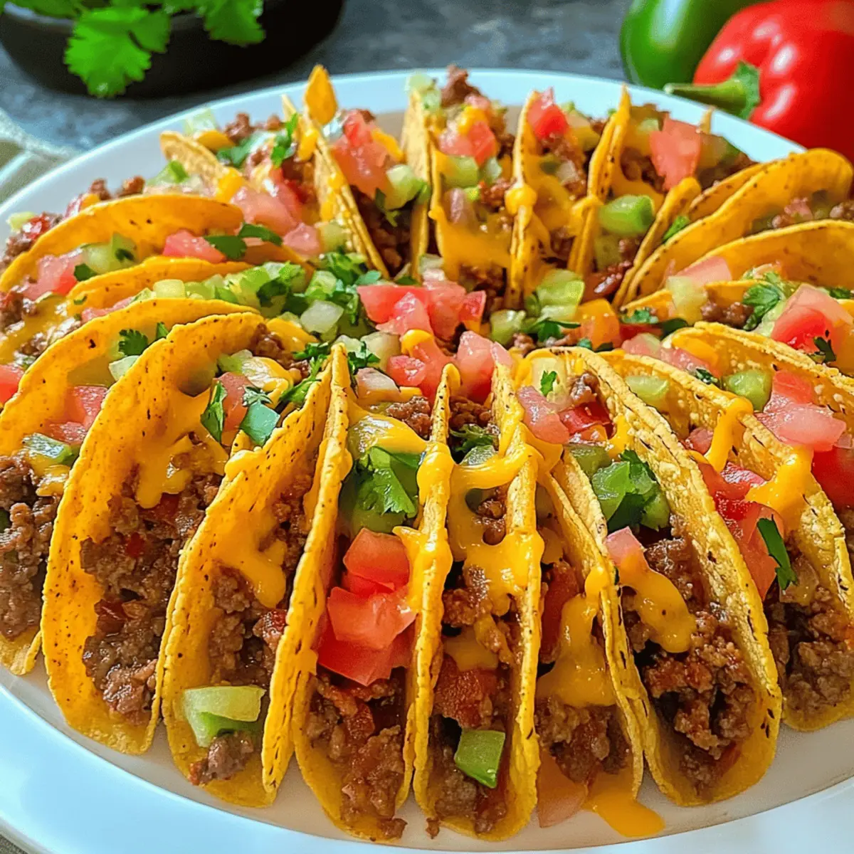 Eines der besten Dinge am Kochen ist die Möglichkeit, mit Farben und Aromen zu experimentieren. Heute möchte ich euch in die Welt der Mini-Tacos mit würzigem Hackfleischfüllung entführen – kleine, knusprige Häppchen, die perfekt für jede Gelegenheit sind. Diese Mini-Tacos sind nicht nur schnell zubereitet, sondern auch super anpassbar, sodass jeder Gast die Füllung nach seinem Geschmack genießen kann. Sie sind die ideale Wahl für Partys oder einfach für einen schönen Abend zuhause. Stellt euch vor, wie die Aromen von frisch gewürztem Rinderhack und geschmolzenem Käse durch eure Küche tanzen! Bereit, den Inhalt der Mini-Tacos mit euren Lieblingszutaten nachzupassen? Lasst uns gleich loslegen! Warum wirst du diese Mini-Tacos lieben? Vielfalt, die begeistert: Diese Mini-Tacos mit würzigem Hackfleischfüllung lassen sich nach Herzenslust anpassen und sind somit für jeden Geschmack geeignet. Einfache Zubereitung: Mit nur wenigen Handgriffen und einer begrenzten Zutatenliste sind sie schnell für Gäste oder die Familie vorbereitet. Köstlicher Genuss: Die Kombination aus knusprigen Tortillas und würzigem Fleisch sorgt für ein Geschmackserlebnis, das in Erinnerung bleibt. Perfekt für Anlässe: Ob als Party-Snack oder gemütliches Abendessen, diese kleinen Häppchen passen einfach immer! Zeit sparen: Dank der unkomplizierten Zubereitung kannst du mehr Zeit mit deinen Gästen verbringen und weniger in der Küche stehen. Genieße dazu auch tolle Varianten wie unser geschmackvolles Honig Senf Reis oder probiere das herzhafte Serbisches Reisfleisch Jeden, um dein Menü zu erweitern! Zutaten für Mini-Tacos mit würzigem Hackfleischfüllung • Eine kleine Zusammenstellung für ein großartiges Gericht. Für die Wraps Wraps – Sie bilden die Grundlage für die Mini-Tacos; mittlere Wraps sind ideal für die perfekte Größe. Für die Füllung Rinderhackfleisch (500g) – Die Hauptproteinquelle; verleiht den Tacos einen reichhaltigen Geschmack. Du kannst auch mit Pute oder pflanzlichem Fleisch substituieren, um es leichter zu machen. Gehackte Tomaten aus der Dose (400g) – Sie sorgen für Feuchtigkeit und Säure; frische Tomaten können für einen frischeren Geschmack verwendet werden. Geriebener Käse (150g) – Sorgt für Cremigkeit und Geschmack; Cheddar oder eine Gouda-Mischung eignen sich gut zum Schmelzen. Mais (1 kleine Dose, abgetropft) – Bietet Süße und Textur; kann durch schwarze Bohnen ersetzt werden, um eine vegetarische Option zu schaffen. Rote Paprika (1) – Für einen knackigen und süßen Biss; kann durch grüne Paprika ersetzt werden, wenn du einen schärferen Geschmack willst. Rote Zwiebel (1) – Fügt eine milde Süße hinzu; gelbe oder weiße Zwiebeln können auch verwendet werden. Knoblauch (3 Zehen) – Verstärkt die Geschmacksvielfalt; du kannst auch Knoblauchpulver verwenden, aber frischer ist bevorzugt. Öl (2 Esslöffel) – Zum Anbraten des Fleisches und der Gemüse; jedes neutrale Öl reicht aus. Süßes Paprika (1 Teelöffel) – Verleiht Wärme und Farbe. Scharfes Paprika (½ Teelöffel) – Für die nötige Schärfe; passe die Menge nach deinem Geschmack an oder verwende Chili-Pulver für mehr Feuer. Currypulver (1 Teelöffel) – Bringt unerwartete Tiefe; kann weggelassen werden, wenn du es nicht möchtest. Cayennepfeffer (½ Teelöffel) – Für zusätzlichen Schärfe; kann angepasst oder durch eine mildere Gewürzmischung ersetzt werden. Zum Servieren Dips – Serviere die Mini-Tacos mit saurer Sahne, Guacamole oder einer joghurtbasierten Soße für ein perfektes Geschmackserlebnis. Bereit, in die Welt der Mini-Tacos mit würzigem Hackfleischfüllung einzutauchen? Lass uns diese köstlichen Häppchen zusammen zubereiten! Schritt-für-Schritt-Anleitung für Mini-Tacos mit würzigem Hackfleischfüllung Step 1: Ofen vorheizen Heize den Ofen auf 200 °C vor, damit er bereit ist, die Mini-Tacos knusprig zu backen. Während der Ofen aufheizt, kannst du die Wraps vorbereiten, um den Kochprozess zu beschleunigen und gleichmäßig knusprige Häppchen zu gewährleisten. Step 2: Wraps vorbereiten Verwende ein Glas oder einen Keks-Ausstecher, um 4-5 kleine Kreise aus jedem Wrap auszuschneiden (ca. 7-8 cm im Durchmesser). Diese Kreise werden die Grundlage für deine Mini-Tacos mit würzigem Hackfleischfüllung sein und sollten gleichmäßig geschnitten werden, um eine gute Form zu erhalten. Step 3: Gemüse und Mais vorbereiten Würfle die rote Zwiebel, die rote Paprika und den Knoblauch fein. Lasse den Mais aus der Dose abtropfen und halte ihn bereit. Die frischen Zutaten werden deinem Füllungsmix eine schöne Textur und zusätzlichen Geschmack verleihen, der die Mini-Tacos lebendig macht. Step 4: Hackfleisch anbraten Erhitze 2 Esslöffel Öl in einer großen Pfanne bei mittlerer Hitze. Füge das Rinderhackfleisch hinzu und brate es an, bis es gleichmäßig gebräunt ist (etwa 5-7 Minuten). Achte darauf, das Fleisch gut zu zerkleinern, damit es gleichmäßig gart und eine saftige Füllung entsteht. Step 5: Gemüse hinzufügen Sobald das Hackfleisch fertig ist, füge die gewürfelte Zwiebel, den Knoblauch und die Paprika hinzu. Rühre alles gut um und brate die Mischung für weitere 2-3 Minuten, bis das Gemüse weich geworden und die Aromen miteinander verschmolzen sind. Step 6: Füllung würzen und köcheln lassen Gib die gehackten Tomaten, den abgetropften Mais sowie die Gewürze (süßes Paprika, scharfes Paprika, Currypulver und Cayennepfeffer) in die Pfanne. Mische alles gut durch und lasse die Füllung bei geringer Hitze 5-10 Minuten köcheln, sodass alle Geschmäcker intensiv werden. Step 7: Muffinblech vorbereiten Bereite ein Muffinblech vor, indem du es auf den Kopf stellst und leicht einfettest oder mit Backpapier auslegst. Dieses Blech wird dir helfen, die Mini-Tacos in Form zu bringen, damit sie gleichmäßig knusprig werden. Step 8: Taco-Schalen formen Forme jeden Wrap-Kreis in eine Taco-Schale und lege sie in die Vertiefungen des umgedr