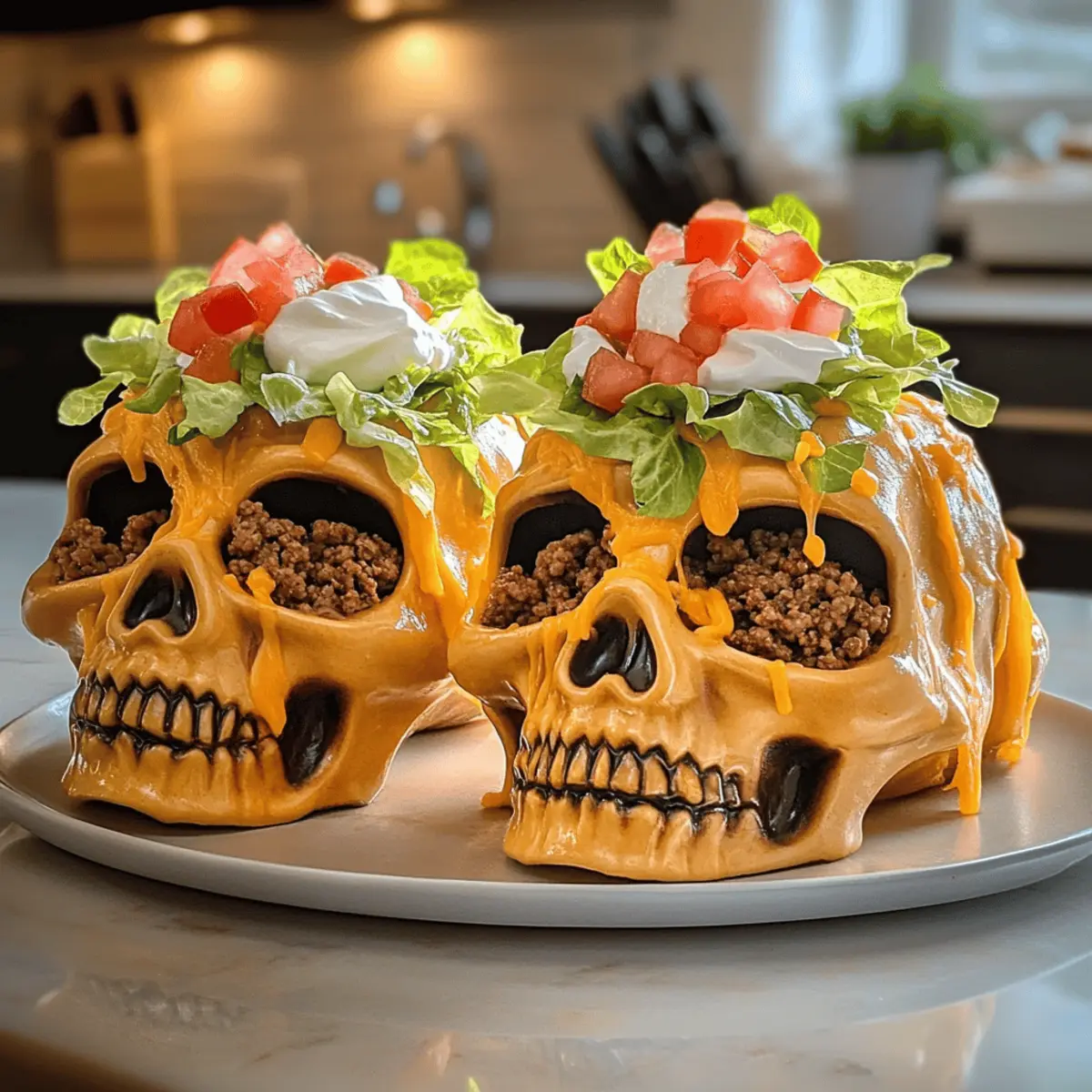 Servieren like a pro: Festlich anrichten: Arrangiere die Monster Taco Schädel auf einem großen Teller und serviere sie mit kleinen Schalen für Sauerrahm oder Guacamole, um den Genuss abzurunden.