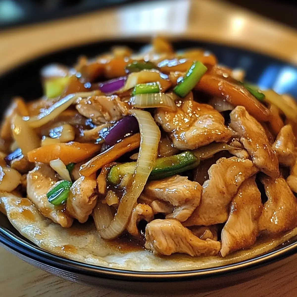 „Kann ich bitte einen Pfannkuchen haben?“ fragte mein kleiner Neffe mit großen, neugierigen Augen, als ich in der Küche stand und die duftenden Zutaten für mein Moo Shu Hähnchen Rezept bereitete. Dieses Gericht ist nicht nur ein wahrer Familienliebling, sondern auch eine köstliche Lösung für belebte Wochentage. Überhaupt, wer sagt, dass gesundes Essen langweilig sein muss? Mit knusprigem Gemüse, zartem Hähnchen und einer harmonischen Soße wird jede Portion zum interaktiven Vergnügen – jeder kann seine eigenen Wraps aus warmen Mandarin-Pfannkuchen oder Tortillas zaubern. Ein weiterer Vorteil? Diese Mahlzeit ist ebenso schnell zubereitet wie anpassbar, sodass auch Vegetarier auf ihre Kosten kommen! Bist du bereit, den köstlichen Geschmack des fernöstlichen Comfort Foods zu entdecken? Warum wird dir dieses Rezept gefallen? Einfachheit: Die Zubereitung des Moo Shu Hähnchens ist kinderleicht und benötigt nur grundlegende Kochfähigkeiten. Vielfalt: Mit anpassbaren Zutaten hast du die Freiheit, das Rezept nach deinen Vorlieben zu gestalten – probiere es zum Beispiel auch mit Tofu für eine vegetarische Variante! Woche für Woche: Schnelle Zubereitung macht es zum idealen Wochenendessen, perfekt für beschäftigte Familien. Interakiver Genuss: Jeder kann seine eigenen Wraps kreieren, was dieses Gericht zu einem Spaß für die ganze Familie macht. Gesund und Lecker: Die Kombination aus frischem Gemüse und zartem Hähnchen sorgt dafür, dass du dich satt und zufrieden fühlst. Verpasse nicht die Gelegenheit, mit diesem Rezept deine Kochkünste zu zeigen und die Herzen deiner Liebsten zu gewinnen! Moo Shu Hähnchen Zutaten • Für das Gericht: Hähnchenbrust – ist die Hauptproteinquelle; für eine vegetarische Option, probiere festen Tofu. Shiitake-Pilze – bieten eine herzhafte Tiefe; du kannst auch Champignons verwenden. Karotten – fügen Frische und Crunch hinzu; vorgeraspelte Karotten sparen Zeit. Kohl – sorgt für Biss; knackiger Weißkohl ist ebenfalls eine gute Wahl. Frühlingszwiebeln – bringen ein mildes Zwiebelaroma; ersetzen durch rote Zwiebeln, wenn nötig. Knoblauch – ist ein essentielles Aroma; frisch ist am besten, aber Pulver geht in der Not. Eier – machen das Gericht sättigender; kann weggelassen werden für vegane Alternativen. • Für die Soße: Sojasauce – verleiht Tiefe und Umami; verwende eine natriumarme Variante für eine leichtere Version. Hoisinsauce – sorgt für Süßheit und Komplexität; achte auf eine vegane Marke, wenn nötig. Sesamöl – intensiviert den Geschmack; kann auch durch Olivenöl ersetzt werden. • Für die Wraps: Pfannkuchen oder Tortillas – die perfekte Umhüllung für das Moo Shu; traditionell sind Mandarin-Pfannkuchen die erste Wahl. Gemischte Zutaten – die Kombination des Hähnchens und der Gemüse macht dieses Moo Shu Hähnchen Rezept zu einem schmackhaften Erlebnis. Schritt-für-Schritt-Anleitung für Moo Shu Hähnchen Rezept Schritt 1: Hähnchen anbraten Das Pflanzenöl in einer großen Pfanne bei mittlerer bis hoher Hitze erhitzen. Fügen Sie die in dünne Streifen geschnittene Hähnchenbrust hinzu und braten Sie sie 5-7 Minuten lang an, bis sie goldbraun und durchgegart ist. Achten Sie darauf, dass die Stücke gleichmäßig garen und eine schöne Bräunung erreichen. Schritt 2: Gemüse und Knoblauch hinzufügen Geben Sie nun den gehackten Knoblauch, die Shiitake-Pilze, Karotten, und den Kohl in die Pfanne. Braten Sie alles zusammen für etwa 3-4 Minuten weiter, bis das Gemüse etwas weich wird, aber noch seine Farbe und den Biss behält. Regelmäßiges Umrühren sorgt für eine gleichmäßige Garung. Schritt 3: Soße einrühren Reduzieren Sie die Hitze auf mittlere Stufe und gießen Sie die Sojasauce, Hoisinsauce und Sesamöl über das Gemüse und das Hähnchen. Rühren Sie alles gut um, damit die Soßen gleichmäßig verteilt werden. Lassen Sie die Mischung 2-3 Minuten köcheln, damit sich die Aromen verbinden und ein köstlicher Duft aufsteigt. Schritt 4: Eier hinzufügen Die leicht geschlagenen Eier in die Pfanne geben und vorsichtig unter die Mischung heben. Kochen Sie alles für 2-3 Minuten weiter, bis die Eier fest und gut eingearbeitet sind. Achten Sie darauf, die Mischung regelmäßig umzurühren, damit nichts ansetzt und die Eier gleichmäßig garen. Schritt 5: Wraps vorbereiten und servieren Erwärmen Sie die Pfannkuchen oder Tortillas in einer separaten Pfanne oder Mikrowelle, bis sie heiß sind. Verteilen Sie die Moo Shu Hähnchen-Mischung gleichmäßig auf die Wraps und rollen Sie sie auf. Servieren Sie sie warm und genießen Sie die Interaktivität dieses reizvollen Moo Shu Hähnchen Rezepts, während jeder seine eigenen Wraps zusammenstellt. Moo Shu Hähnchen Rezept Variationen Lass deiner Kreativität freien Lauf und passe dieses herrliche Rezept ganz nach deinem Geschmack an! Vegetarisch: Tausche das Hähnchen gegen festen Tofu für eine köstliche, fleischlose Variante. Tofu absorbiert wunderbar die Aromen der Soße und sorgt für eine samtige Textur. Vegan: Verwende anstelle der Eier einfach noch mehr Gemüse oder etwas pflanzlichen Ei-Ersatz. So bleibt das Gericht rein pflanzlich und angenehm sättigend. Würzig: Füge Sriracha oder Chili-Paste zur Soße hinzu, um eine prickelnde Schärfe zu erzielen. Ein wenig Schärfe bringt deine Geschmacksnerven zum Tanzen! Zusätzliche Gemüse: Experimentiere mit verschiedenen Arten von Gemüse wie Zucchini oder Paprika, um den Geschmack zu variieren und neue Texturen hinzuzufügen. Ihre Süße ergänzt die geballte Kraft der Soßen hervorragend. Gekochte Eier: Füge hartegekochte Eier für einen zusätzlichen Protein-Kick hinzu. Sie geben dem Gericht eine ganz eigene Note und bereichern die traditionelle Zubereitung. Alternative Wraps: Probiere die Füllung in Salatblätter statt in Pfannkuchen oder Tortillas zu servieren. Das macht die Mahlzeit leicht und erfrischend! Low-Carb: Verwende Zucchini-Nudeln oder Blumenkohlreis anstelle von 
