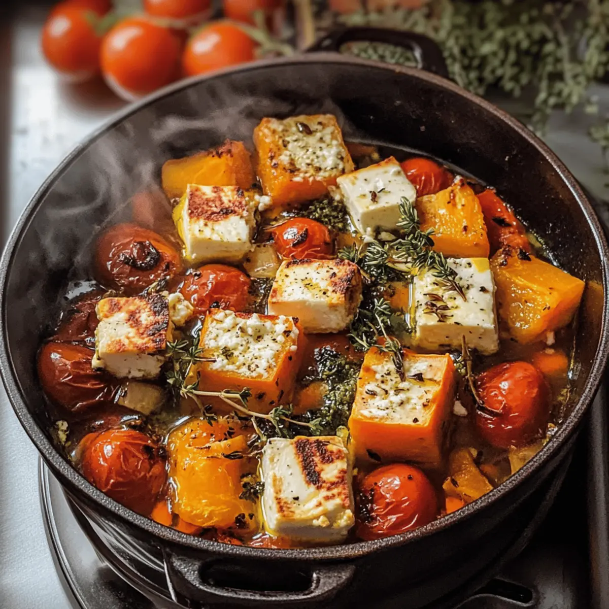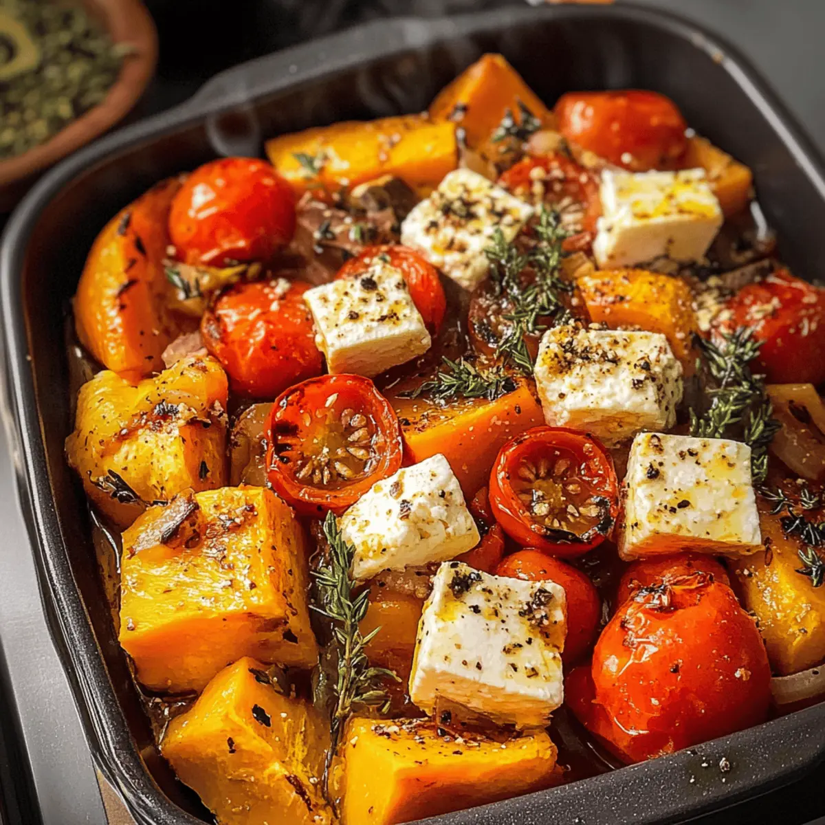 Der Duft von geröstetem Kürbis erfüllt die Küche und erinnert mich an sonnige Herbsttage, an denen die Farben der Natur in warmen Gold- und Orangetönen leuchten. Das Rezept für Ofenkürbis mit Feta bringt nicht nur eine rustikale Note auf den Tisch, sondern ist auch ein schnelles und gesundes Gericht, das jede Menge mediterranen Charme versprüht. Mit der perfekten Kombination aus süßem Hokkaido-Kürbis, würzigem Feta und saftigen Kirschtomaten ist dieses Gericht nicht nur ein Genuss für den Gaumen, sondern auch ein wahrer Augenschmaus. Ideal für entspannte Wochentage oder gesellige Zusammenkünfte, wird es sicher zu einem neuen Favoriten bei deinen Liebsten. In welchen Variationen wirst du es ausprobieren? Warum wirst du Ofenkürbis mit Feta lieben? Einfachheit: Die Zubereitung ist kinderleicht und benötigt nur wenige Schritte, sodass du schnell ein köstliches Gericht zaubern kannst. Gesunde Vielfalt: Hokkaido-Kürbis ist nicht nur lecker, sondern auch nährstoffreich und bietet eine hervorragende Grundlage für viele Variationen. Würzige Kombination: Der herzhafte Feta und die vielschichtigen Aromen von Rosen- und Thymian setzen neue Akzente auf deinem Esstisch. Perfekte Beilage: Ob als leichtes Mittagessen oder als köstliche Beilage zu gegrilltem Fleisch, dieses Rezept passt überall hervorragend. Saisonale Frische: Genieße die Aromen des Herbstes mit frischen Zutaten, die das Gericht einfach unvergesslich machen! Entdecke auch die Gebackene Feta Gnocchi für ein weiteres geschmackliches Erlebnis! Ofenkürbis mit Feta Zutaten Für das Gericht Hokkaido-Kürbis – Verleiht natürliche Süße und Cremigkeit; du kannst ihn auch durch Butternut-Kürbis ersetzen. Rote Zwiebel – Bringt milde Süße und Tiefe ins Gericht; verwende alternativ eine gelbe Zwiebel für einen intensiveren Geschmack. Knoblauch – Steigert Aroma und Geschmack; frischer Knoblauch ist ideal, während jarierter Knoblauch den Geschmack leicht verändern kann. Rosmarin & Thymian – Kräuter, die hervorragend mit dem Kürbis harmonieren; getrocknete Kräuter können verwendet werden, jedoch die Menge reduzieren. Gemüsebrühe (70 ml) – Sorgt für Feuchtigkeit und Geschmack während des Garens; ersetze sie gegebenenfalls durch Wasser, woraufhin der Geschmack milder sein kann. Olivenöl (3 Esslöffel) – Gibt dem Gericht Reichhaltigkeit und unterstützt das Rösten; kannst auch Avocadoöl verwenden. Gyros-Gewürzmischung (1 Teelöffel) – Sorgt für eine besondere Würze; eine Mischung aus geräuchertem Paprika, Kreuzkümmel und Oregano eignet sich als Ersatz. Feta-Käse (150-200 g) – Sorgt für eine würzige und cremige Note; du kannst ihn durch Ziegenkäse ersetzen, um einen anderen Geschmack zu erzielen. Kirschtomaten (200 g) – Bringt Saftigkeit und harmoniert perfekt mit Kürbis; verwende andere Tomatensorten, passe jedoch die Garzeit an. Salz & Pfeffer – Nach Geschmack; achte darauf, besonders bei Verwendung von gesalzenem Feta vorsichtig zu würzen. Geröstete Kürbiskerne (1 Esslöffel) – Für zusätzlichen Crunch und nussigen Geschmack als Garnitur; optional, für mehr Textur. Extra Olivenöl – Zum Beträufeln; verwende hochwertiges Öl für den besten Geschmack. Step-by-Step Instructions for Ofenkürbis mit Feta Step 1: Ofen vorheizen Heize den Ofen auf 220 °C vor. Dies sorgt dafür, dass dein Ofenkürbis mit Feta gleichmäßig und knusprig gegart wird. Nutze während des gesamten Kochens eine mittlere Ofenrille, damit die Hitze ideal zirkulieren kann und das Gemüse schön röstet. Step 2: Gemüse vorbereiten Schneide den Hokkaido-Kürbis in gleichmäßige Würfel und gib sie zusammen mit der gewürfelten roten Zwiebel und dem gehackten Knoblauch in eine Auflaufform. Füge frischen Rosmarin und Thymian hinzu. Diese Aromen harmonieren perfekt mit dem Kürbis und bringen eine mediterrane Note in das Gericht. Step 3: Würzen Würze die Gemüsemischung mit Salz, Pfeffer und der Gyros-Gewürzmischung. Gieße die Gemüsebrühe über das Gemüse und vermische alles gut. Diese Schritte sorgen dafür, dass alle Zutaten gleichmäßig gewürzt werden und ein köstlicher Geschmack entsteht, während sie im Ofen garen. Step 4: Olivenöl hinzufügen und rösten Träufle 2 Esslöffel Olivenöl über die Mischung und backe alles für 15 Minuten im vorgeheizten Ofen. Achte darauf, dass der Kürbis leicht braun wird und die Aromen sich entfalten, während er beginnt, weich zu werden. Step 5: Kirschtomaten vorbereiten Während das Gemüse röstet, halbiere die Kirschtomaten und bestreue sie mit einer Prise Salz. Das Salzen hilft, ihren Geschmack zu intensivieren und sorgt für eine köstliche Ergänzung zum Ofenkürbis mit Feta. Step 6: Feta und Tomaten hinzufügen Nimm die Auflaufform nach 15 Minuten aus dem Ofen und forme eine kleine Vertiefung in der Mitte für den Feta. Lege den Feta hinein und verteile die Kirschtomaten rundherum. Träufle etwas zusätzliches Olivenöl über den Feta, um ihm eine goldene Farbe zu verleihen. Step 7: Weiter rösten Schiebe die Auflaufform zurück in den Ofen und röste das Ganze für weitere 20 Minuten. Achte darauf, dass der Feta leicht goldbraun wird und die Tomaten anfangen, zu platzen. Dies sorgt für eine schöne Konsistenz und eine Mischung aus cremigen und saftigen Texturen. Step 8: Anrichten und servieren Nimm das Gericht aus dem Ofen und garniere es nach Belieben mit gerösteten Kürbiskernen und frischem Thymian. Serviere den Ofenkürbis mit Feta warm. Die harmonische Kombination aus süßem Kürbis und würzigem Feta wird deine Gäste begeistern! Was passt gut zu Ofenkürbis mit Feta? Der Ofenkürbis mit Feta ist eine Geschmacksexplosion, die perfekt ergänzt werden kann. Lass uns dein Menü auf das nächste Level heben! Cremige Polenta: Diese samtige Beilage bringt eine wunderbare Textur und mildert die Aromen des Kürbisses. Sie ist einfach zuzubereiten und eignet sich hervorragend, um die Säfte aufzusaugen. Knuspriges Baguette: Ein frisch gebacke