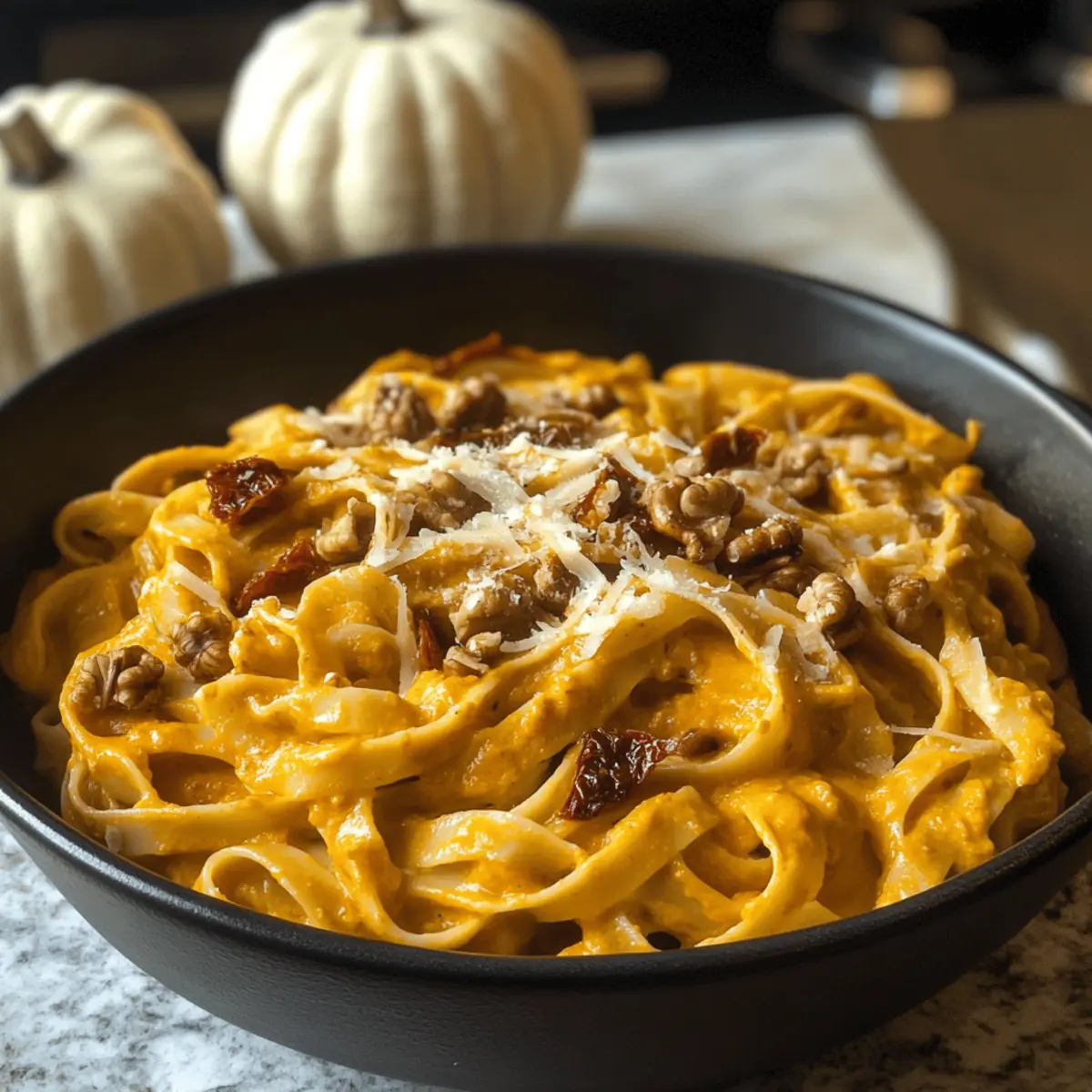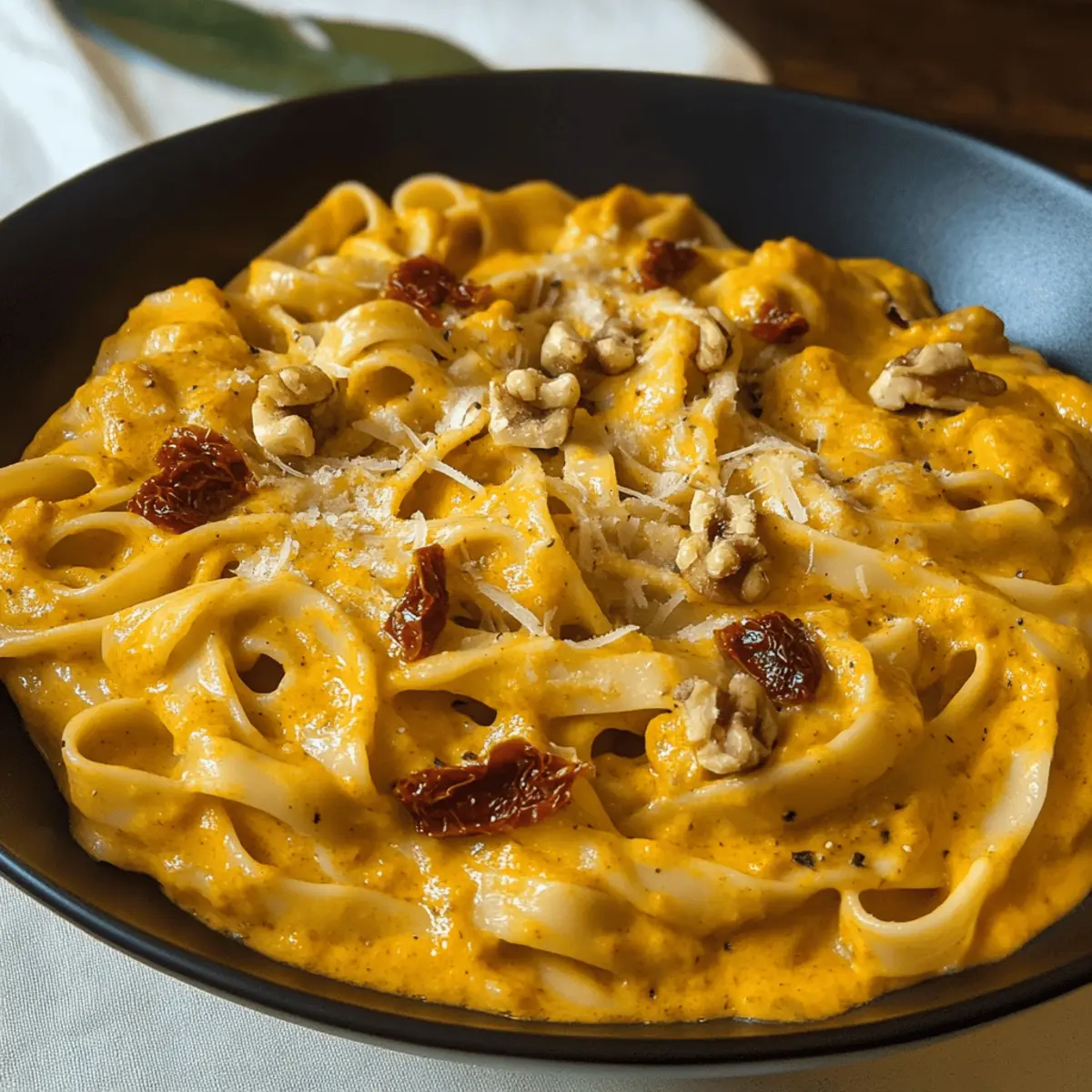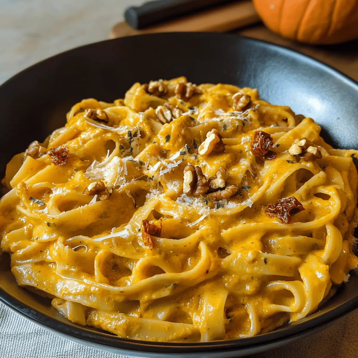 Eines kühlen Herbstabends saß ich mit einer Tasse Tee und blätterte durch meine Rezeptesammlung, als mir der Gedanke kam: Was könnte mir und meinen Freunden mehr Freude bereiten als eine warme, einladende Mahlzeit? Die Antwort kam schnell: eine köstliche One-Pot-Kürbis-Pasta, die mit der Süße und Cremigkeit des Hokkaido-Kürbisses glänzt. Dieses einfache, aber beeindruckende Gericht kombiniert die nussigen Aromen gerösteter Walnüsse und die herzhafte Tiefe von getrockneten Tomaten, während der Parmesan und die Sahne für ein samtiges Finish sorgen. Perfekt für all jene, die sowohl schnell zuzubereitete Gerichte als auch den Geschmack der Saison lieben, bietet dieses Rezept nicht nur Komfort, sondern auch die Möglichkeit, die Schönheit der herbstlichen Ernte zu zelebrieren. Wer könnte da widerstehen, sich einen Teller vollzureichen? Lass uns gemeinsam in die Welt dieser cremigen Kürbis-Pasta eintauchen! Warum ist diese One-Pot-Kürbis-Pasta so besonders? Einfachheit garantiert: Mit nur einem Topf zauberst du dieses köstliche Gericht im Handumdrehen und sparst dir das Aufräumen. Herbstliche Aromen: Der Hokkaido-Kürbis bringt eine wunderbar süße Note, die perfekt zur saisonalen Stimmung passt. Vielfältige Texturen: Die Kombination aus cremiger Sauce und knackigen Walnüssen sorgt für ein rundum zufriedenes Esserlebnis. Schnelle Zubereitung: Ideal für beschäftigte Abende, lässt sich dieses Gericht in kurzer Zeit genießen. Cremige Verführung: Die Mischung aus Parmesan und Sahne sorgt für einen unvergleichlich reichen Geschmack, der die Gäste begeistert. Ideal fürs Teilen: Perfekt für gesellige Abende mit Freunden oder der Familie; kaum jemand kann diesem Komfortessen widerstehen! One-Pot-Kürbis-Pasta Zutaten Für die Pasta • Hokkaido-Kürbis – der Hauptbestandteil, der Süße und Cremigkeit bietet; kann durch Butternut-Kürbis ersetzt werden. • Pasta – jede Pastasorte funktioniert, aber Fettuccine wird empfohlen, um die Sauce gut aufzunehmen. Für die Sauce • Sahne – verleiht eine reichhaltige Textur; du kannst auch Halbfett oder Kokoscreme für eine leichtere Variante verwenden. • Getrocknete Tomaten – bringen eine würzige Tiefe; frische Tomaten können als Ersatz dienen, verändern jedoch die Textur. • Walnüsse – sorgen für einen knackigen Biss und nussigen Geschmack; Pekannüsse sind eine geeignete Alternative. • Parmesan – intensiviert den Umami-Geschmack; für eine vegane Option kann Nährhefe verwendet werden. Zusätzliche Zutaten • Ein Spritzer Olivenöl – für das Anbraten der Zutaten und zusätzliches Aroma. • Salz und Pfeffer – nach Geschmack für die perfekte Würze. Diese One-Pot-Kürbis-Pasta ist nicht nur ein einfaches und schnelles Rezept, sondern auch eine wunderbare Möglichkeit, die Geschmäcker des Herbstes in einem einzigen, köstlichen Gericht zu kombinieren. Schritt-für-Schritt-Anleitung für One-Pot-Kürbis-Pasta Step 1: Kürbis vorbereiten Schneide den Hokkaido-Kürbis in zwei Hälften, entkerne ihn und schäle ihn dann. Würfle das Fruchtfleisch in kleine Stücke, die gleichmäßig garen. Erhitze einen großen Topf bei mittlerer Hitze und füge einen Spritzer Olivenöl hinzu. Gib die Kürbiswürfel hinein und brate sie etwa 5 Minuten an, bis sie leicht gebräunt sind und weich werden. Step 2: Pasta kochen Füge nun 250 g Fettuccine und 500 ml Gemüsebrühe zu dem Topf mit dem Kürbis hinzu. Lasse die Mischung zum Kochen bringen und reduziere dann die Hitze, um sie 10-12 Minuten sanft köcheln zu lassen. Rühre gelegentlich um, um sicherzustellen, dass die Pasta nicht am Boden kleben bleibt. Wenn die Pasta al dente ist, nimm den Topf vom Herd. Step 3: Sauce zubereiten Gib 200 ml Sahne sowie 100 g gehackte getrocknete Tomaten und 50 g grob gehackte Walnüsse zur Pasta in den Topf. Mischung gut umrühren, damit sich die Zutaten gleichmäßig verteilen und die Sauce eine cremige Konsistenz erhält. Stelle den Topf bei schwacher Hitze wieder auf den Herd und lasse alles für 2-3 Minuten erhitzen, bis die Sauce schön warm ist. Step 4: Käse hinzufügen Rühre 50 g frisch geriebenen Parmesan unter die Pasta. Dieser wird schmelzen und eine wunderbar cremige Sauce ergeben, die die Pasta umhüllt. Achte darauf, alles gründlich zu vermengen, damit die Aromen gleichmäßig verteilt sind. Lass die One-Pot-Kürbis-Pasta noch 1-2 Minuten auf der Hitze, um alle Zutaten gut zu vereinen. Step 5: Servieren und genießen Nehme den Topf von der Hitze und schmecke die One-Pot-Kürbis-Pasta mit Salz und Pfeffer ab. Serviere die Pasta direkt aus dem Topf in tiefen Tellern und garniere sie optional mit zusätzlich geriebenem Parmesan und frischen Kräutern. Sofort genießen und das herbstliche Aroma auf der Zunge zergehen lassen! Aufbewahrungstipps für One-Pot-Kürbis-Pasta • Raumtemperatur: Nicht empfohlen; die Pasta sollte nach der Zubereitung zeitnah verzehrt werden, um die Qualität zu gewährleisten. • Kühlschrank: Lagere die reste in einem luftdichten Behälter bis zu 3 Tagen. So bleibt die One-Pot-Kürbis-Pasta frisch und lecker. • Gefrierschrank: Du kannst die Pasta bis zu 2 Monate einfrieren. Achte darauf, sie gut in einer Gefrierbox zu verpacken, um Gefrierbrand zu vermeiden. • Erhitzen: Zum Aufwärmen kannst du die Pasta in einer Pfanne mit einem Spritzer Wasser oder Sahne erhitzen, um die Cremigkeit wiederherzustellen und ein Ankleben zu verhindern. Was passt zur One-Pot-Kürbis-Pasta? Egal, ob an kalten Abenden oder bei geselligen Treffen, mit den richtigen Beilagen wird deine One-Pot-Kürbis-Pasta zum unvergleichlichen Highlight. Frische Gartensalate: Ein luftiger Blattsalat mit einem Zitronendressing bringt eine erfrischende Note, die die Reichhaltigkeit der Pasta ausbalanciert. Knuspriges Baguette: Ein warmes, knuspriges Baguette ist ideal, um die cremige Sauce aufzutunken und schafft ein harmonisches Esserlebnis. Geröstetes Gemüse: Saisonales geröstetes Gemüse wie Rosenkohl oder Karotten unt