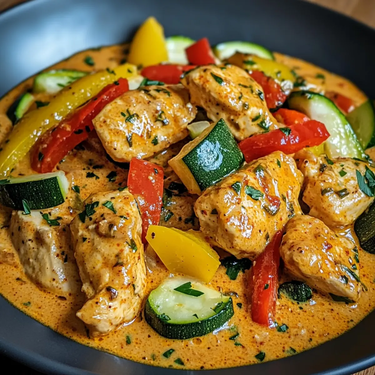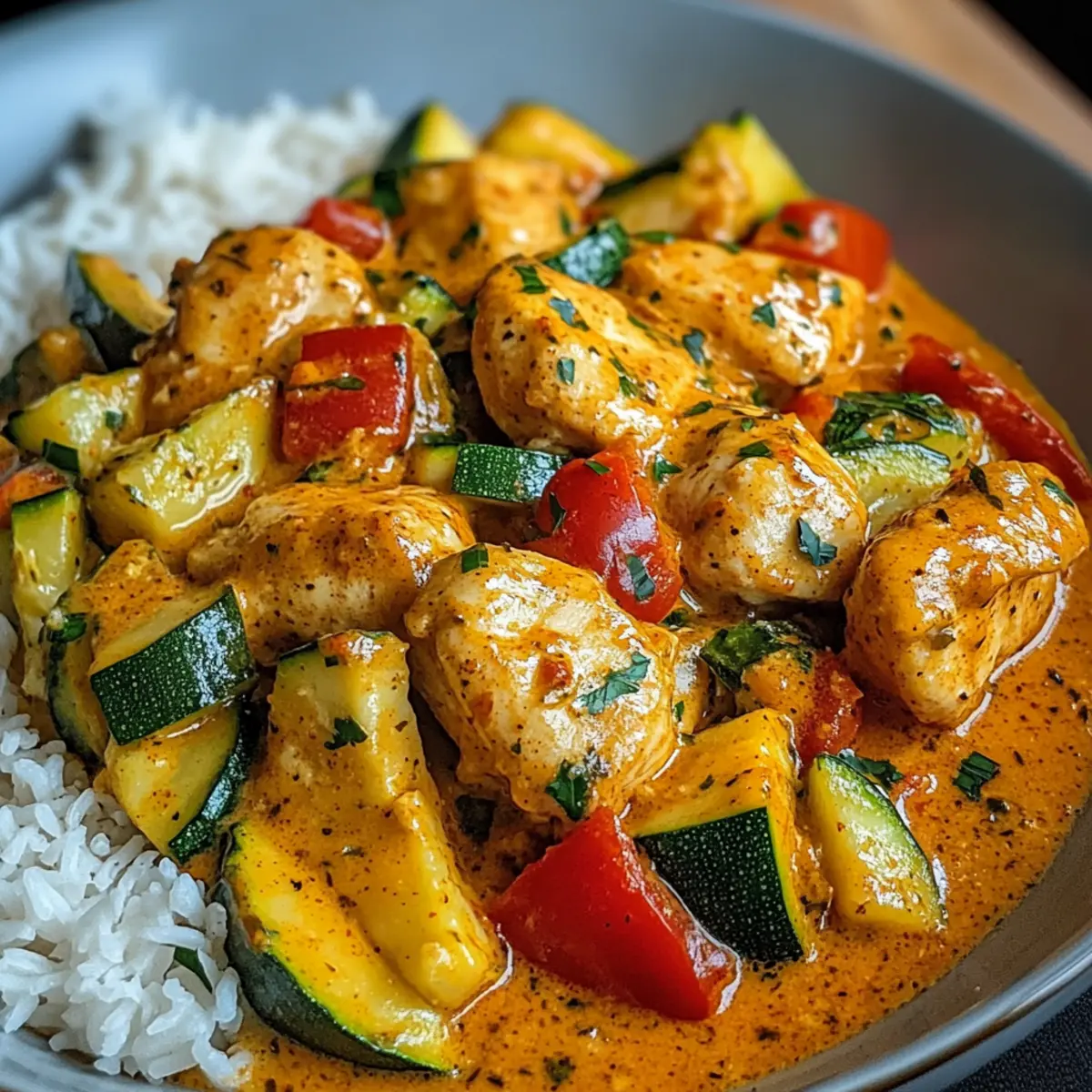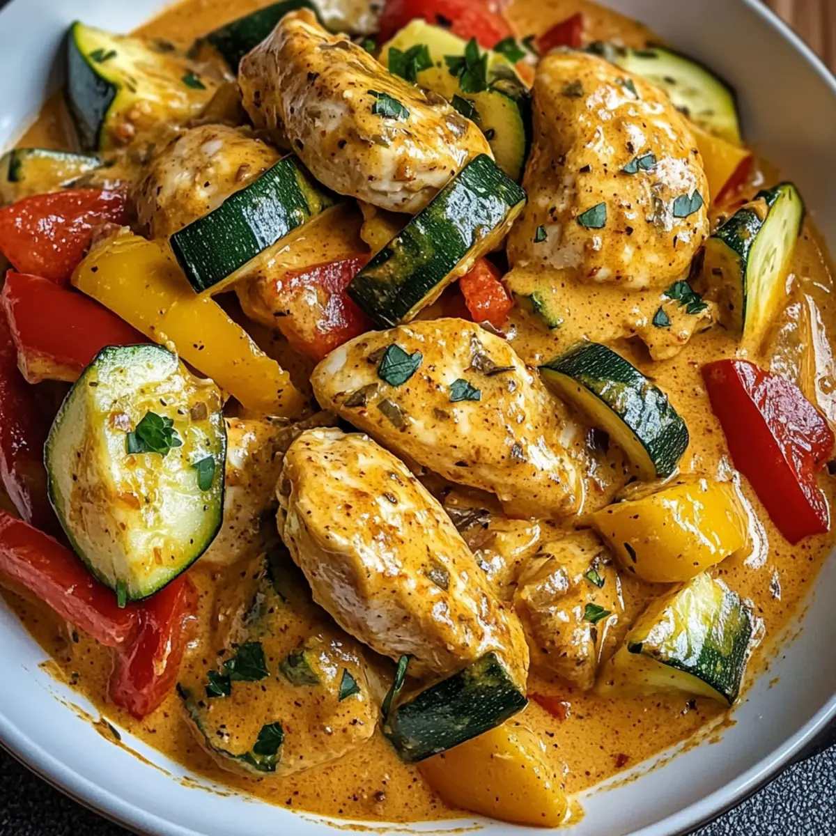 Ah, der Duft von gebratenem Hähnchen, der durch meine Küche zieht! Es gibt doch nichts Besseres als ein herzhaftes Gericht, das nicht nur den Gaumen verwöhnt, sondern auch das Herz erwärmt. Heute lade ich euch ein, das Rezept für mein beliebtes Paprika-Zucchini-Sahne-Hähnchen auszuprobieren – ein einfaches, vielseitiges Gericht, das ideal für geschäftige Wochentage und gemütliche Familienessen ist. Die Kombination aus zartem Hähnchen, bunten Paprika und frischer Zucchini in einer cremigen Soße sorgt nicht nur für ein kräftiges Aroma, sondern bringt auch alle nötigen Nährstoffe auf den Tisch. Und das Beste daran? Es ist eine freudige Möglichkeit, die saisonalen Gemüse aus unserem Garten zu nutzen. Seid ihr bereit, euer nächstes Lieblingsgericht zu entdecken? Warum ist dieses Rezept so besonders? Einfache Zubereitung: Die Schritte sind unkompliziert und erfordern kein Kochprofi-Wissen. Vielseitig einsetzbar: Ihr könnt ganz nach Saison und Vorlieben die Gemüsezutaten anpassen. Würzige Aromen: Die Kombination aus Paprika und Zucchini in einer sahnigen Soße sorgt für ein reichhaltiges Geschmackserlebnis, das die ganze Familie begeistern wird. Zeitersparnis: Schnell und einfach, perfekt für hektische Wochentage oder spontane Dinnerpartys! Gesund und Nahrhaft: Vollgepackt mit Proteinen und frischem Gemüse, bietet dieses Gericht eine ausgewogene Mahlzeit. Anpassbar: Testet gerne auch andere Variationen oder fügt zusätzliche Gewürze hinzu, um euren individuellen Geschmack zu treffen. Wenn ihr noch mehr Ideen braucht, schaut euch auch unsere weitere Rezeptvielfalt an! Paprika-Zucchini-Sahne-Hähnchen Zutaten • Um eure Neugier zu wecken, präsentiert diese Liste die Hauptzutaten für ein köstliches Paprika-Zucchini-Sahne-Hähnchen. Für das Hähnchen Hähnchenbrust – Hauptproteinquelle, die Zartheit bringt; alternativ könnt ihr auch Putenbrust oder Tofu verwenden. Olivenöl – Zum Anbraten der Gemüse und des Hähnchens; auch andere neutrale Öle sind geeignet. Zwiebel – Gibt dem Gericht Süße und Tiefe; wer es milder mag, kann Schalotten benutzen. Knoblauch – Sorgt für aromatische Nuancen; frischer Knoblauch ist am besten, aber auch Knoblauchpulver kann im Notfall verwendet werden. Für das Gemüse Paprika (rot & gelb) – Wichtig für Farbe und Süße; gerne auch andere Farben verwenden oder die Zucchini durch Brokkoli ersetzen. Zucchini – Fügt Frische und Nährstoffe hinzu; kann auch durch gelben Kürbis oder Auberginen ersetzt werden. Für die Soße Schlagsahne – Schafft eine reichhaltige und cremige Soße; halb und halb oder eine pflanzliche Sahnealternative für eine leichtere Version sind ebenso möglich. Paprika – Bringt den Geschmack und eine leichte Rauchnote; geräucherte Paprika kann die Komplexität des Gerichts steigern. Getrockneter Thymian – Für einen erdigen Geschmack; frische Kräuter wie Thymian oder italienische Gewürzmischung gibt es alternativ. Salz & Pfeffer – Essenziell für die Würze in verschiedenen Zubereitungsschritten. Schritt-für-Schritt-Anleitung für Paprika-Zucchini-Sahne-Hähnchen Step 1: Hähnchen vorbereiten Spülen und trocknen Sie die Hähnchenbrust gründlich ab, um überschüssige Feuchtigkeit zu entfernen. Schneiden Sie das Fleisch in gleichmäßige Stücke und würzen Sie es großzügig mit Salz und Pfeffer. Dies sorgt dafür, dass das Paprika-Zucchini-Sahne-Hähnchen saftig und geschmackvoll wird. Step 2: Gemüse anbraten Erhitzen Sie in einer großen Pfanne bei mittlerer Hitze etwas Olivenöl. Sobald das Öl gut heiß ist, fügen Sie die gewürfelte Zwiebel hinzu und braten sie etwa 2-3 Minuten lang, bis sie glasig wird. Danach den gehackten Knoblauch einrühren und für etwa 1 Minute weiterkochen, bis er aromatisch ist. Step 3: Paprika und Zucchini hinzufügen Geben Sie die geschnittenen Paprika und die Zucchini in die Pfanne. Braten Sie das Gemüse unter häufigem Umrühren für etwa 5-7 Minuten, bis es leicht weich ist, aber noch etwas Biss hat. Diese bunte Mischung wird dann die Basis für das cremige Paprika-Zucchini-Sahne-Hähnchen bilden. Step 4: Hähnchen anbraten Schieben Sie das Gemüse zur Seite der Pfanne, um Platz für die Hähnchenstücke zu schaffen. Legen Sie das Hähnchen in die Pfanne und bräunen Sie es auf jeder Seite für etwa 5 Minuten. Achten Sie darauf, dass das Hähnchen schön goldbraun wird, um den vollen Geschmack zu entfalten. Step 5: Soße zubereiten Gießen Sie nun die Schlagsahne in die Pfanne, während Sie Paprika und getrockneten Thymian hinzufügen. Rühren Sie gut um und bringen Sie die Mischung zum Köcheln, damit die Aromen verschmelzen und die Soße gut eindickt. Step 6: Hähnchen garen Lassen Sie das Paprika-Zucchini-Sahne-Hähnchen auf niedriger Hitze für etwa 10 Minuten köcheln. Stellen Sie sicher, dass das Hähnchen eine Innentemperatur von 75°C erreicht, damit es durchgegart und zart ist. Beobachten Sie das Gericht gut, um ein Übergaren zu vermeiden. Step 7: Anrichten und servieren Vor dem Servieren können Sie das Gericht nach Belieben mit frischen Kräutern wie Petersilie oder Basilikum garnieren. Servieren Sie das Paprika-Zucchini-Sahne-Hähnchen heiß, idealerweise mit Basmatireis, cremigen Kartoffelpüree oder einem frischen Salat, um eine ausgewogene Mahlzeit zu genießen. Was passt zum Paprika-Zucchini-Sahne-Hähnchen? Genießt das Geschmackserlebnis dieses herzhaften Gerichts, indem ihr es mit köstlichen Beilagen kombiniert, die alle Sinne verwöhnen. Cremiges Kartoffelpüree: Dieses samtige Püree harmoniert perfekt mit der reichhaltigen Soße und bietet einen wunderbaren Kontrast zur zarten Textur des Hähnchens. Basmati-Reis: Der aromatische Reis nimmt die Sahnesoße auf und sorgt so für einen vollmundigen Genuss, der jeder Gabel das gewisse Etwas verleiht. Frischer grüner Salat: Die knackige Frische eines grünen Salates bringt Leichtigkeit in das vollmundige Gericht und schafft einen perfekten Ausgleich aus Texturen. Quinoasalat: Ein l