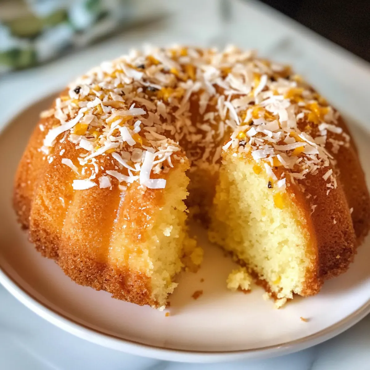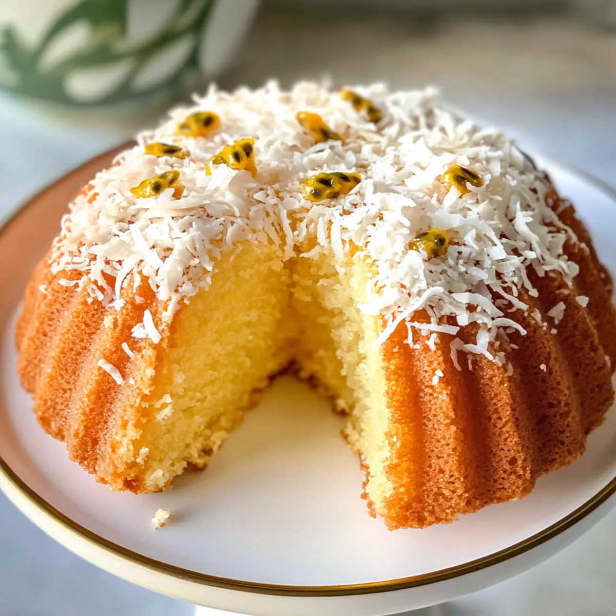 Als ich das erste Mal eine Scheibe von Passionsfrucht Kokosnuss Gugelhupf Kuchen kosten durfte, fühlte ich mich wie in einem tropischen Paradies. Die perfekte Kombination aus saftigem Kokos und der spritzigen Frische der Passionsfrucht lässt nicht nur die Geschmacksnerven tanzen, sondern bringt auch das Urlaubsgefühl direkt in meine Küche. Dieses Rezept ist nicht nur kinderleicht zuzubereiten, sondern überzeugt auch als Blickfang auf jeder Feier. Die zarte Konsistenz gepaart mit der leicht kauenden Textur von Kokosraspeln macht jeden Bissen zu einem kulinarischen Erlebnis. Bereitet euch auf begeisterte Rückmeldungen vor – denn dieser Gugelhupf ist nicht nur ein Genuss, er ist auch ein Hit für jede Zusammenkunft! Seid ihr bereit, in die tropische Geschmackswelt einzutauchen? Warum sollten Sie diesen Gugelhupf lieben? Einfachheit: Die Zubereitung des Passionsfrucht Kokosnuss Gugelhupf Kuchens ist unkompliziert und erfordert nur grundlegende Backkenntnisse. Tropischer Genuss: Die harmonische Kombination aus fruchtiger Passionsfrucht und cremiger Kokosnuss ist wie ein Urlaub im Mund. Dieser Kuchen lässt sich perfekt mit Schlagsahne oder einer Kugel Vanilleeis servieren – ein wahrer Genuss! Feierlicher Blickfang: Mit seiner leuchtenden Farbe und der einzigartigen Textur zieht dieser Gugelhupf die Blicke auf sich und wird garantiert zum Star auf jeder Veranstaltung. Vielseitigkeit: Variieren Sie das Rezept, indem Sie verschiedene Fruchtpürees ausprobieren, oder tauschen Sie den Rum gegen Kokosnuss-Extrakt aus. Zeitersparnis: Der Kuchen kann gut im Voraus gebacken und aufbewahrt werden – ideal für stressfreie Feiern! Passionsfrucht Kokosnuss Gugelhupf Kuchen Zutaten Hinweis: Hier sind die Zutaten für Ihren köstlichen Passionsfrucht Kokosnuss Gugelhupf Kuchen, um jeden Bissen zu einem tropischen Erlebnis zu machen! Für den Teig Allzweckmehl – sorgt für die Struktur des Kuchens; glutenfreies Mehl kann verwendet werden, wenn gewünscht. Salz – verstärkt den Geschmack; keine Substitutionen erforderlich. Backpulver – dient als Treibmittel; stellen Sie sicher, dass es frisch ist für beste Ergebnisse. Ungesalzene Butter – fügt Geschmack und Feuchtigkeit hinzu; sollte Zimmertemperatur haben für einfaches Mischen. Zucker – sorgt für die Süße; kann gegen Kokoszucker ausgetauscht werden für einen anderen Geschmack. Eier – dienen als Bindemittel und sorgen für Feuchtigkeit; wichtig für die Struktur. Keine Alternativen empfohlen, es sei denn, eine vegane Version ist gewünscht. Vanilleextrakt – verbessert den Geschmack; verwenden Sie reinen Extrakt für die beste Qualität. Dunkler Rum (optional) – fügt Tiefe hinzu; kann durch Kokosnuss-Extrakt ersetzt werden für eine alkoholfreie Version. Kokosmilch – sorgt für zusätzliche Feuchtigkeit und Kokosgeschmack; kann durch Mandelmilch für eine milchfreie Option ersetzt werden. Passionsfruchtkonzentrat – verleiht Geschmack und eine erfrischende Säure; frisches Passionsfruchtfleisch kann ebenfalls verwendet werden. Ungesüßte Kokosraspeln – sorgen für Textur und Geschmack; kann durch getrocknete Kokosraspeln ersetzt werden. Für den Sirup Zutaten für den Passionsfrucht-Sirup – sorgen für zusätzlichen Geschmack und Feuchtigkeit beim Durchtränken des Kuchens. Schritt-für-Schritt-Anleitungen für Passionsfrucht Kokosnuss Gugelhupf Kuchen Step 1: Ofen vorheizen Heizen Sie den Ofen auf 175 °C (350 °F) vor und fetten Sie eine 12-Zoll Gugelhupfform gründlich mit Butter oder einer Backspray ein. Stellen Sie sicher, dass die Form gleichmäßig eingefettet ist, damit der Kuchen später leicht herauskommt. Dies ist ein entscheidender Schritt, um einen perfekt gebackenen Passionsfrucht Kokosnuss Gugelhupf Kuchen zu gewährleisten. Step 2: Trockene Zutaten mischen In einer mittelgroßen Schüssel das Allzweckmehl, das Salz und das Backpulver gut vermischen. Verwenden Sie einen Schneebesen oder Sieb, um sicherzustellen, dass keine Klumpen entstehen. Dieser Schritt wird dazu beitragen, dass die Zutaten gleichmäßig verteilt sind und der Gugelhupf beim Backen gleichmäßig aufgeht und eine fluffige Textur erhält. Step 3: Butter und Zucker schaumig schlagen In einer großen Schüssel die Zimmertemperatur-Butter und den Zucker mit einem Handmixer bei mittlerer Geschwindigkeit ca. 3-5 Minuten lang schaumig schlagen, bis die Mischung leicht und luftig ist. Dies sorgt für einen feinen, luftigen Teig, der dem Passionsfrucht Kokosnuss Gugelhupf Kuchen seine köstliche Konsistenz verleiht. Fügen Sie anschließend die Eier einzeln hinzu, und mixen Sie jedes Mal gut. Step 4: Nasse Zutaten hinzufügen Nun den Vanilleextrakt, den optionalen dunklen Rum, die Kokosmilch und das Passionsfruchtkonzentrat vorsichtig zur Buttermischung geben. Alles gut verrühren, bis eine gleichmäßige, glatte Masse entsteht. Achten Sie darauf, die Zutaten vollständig zu integrieren, damit der Passionsfrucht Kokosnuss Gugelhupf Kuchen den vollen tropischen Geschmack entfaltet. Step 5: Trockene Zutaten unterheben Die zuvor gemischten trockenen Zutaten langsam und portioniert zur feuchten Mischung geben. Mit einem Spatel oder einem Holzlöffel vorsichtig umrühren, bis gerade so alles vermischt ist. Nicht übermixen, um eine zarte Konsistenz zu erhalten. Falten Sie schließlich die ungesüßten Kokosraspeln unter, um dem Gugelhupf die gefragte Textur und den intensiven Kokosgeschmack zu verleihen. Step 6: Teig in die Form füllen Gießen Sie den Teig gleichmäßig in die vorbereitete Gugelhupfform und klopfen Sie sie leicht auf die Arbeitsfläche, um Luftblasen zu entfernen. Achten Sie darauf, dass der Teig gleichmäßig in der Form verteilt ist, um ein gleichmäßiges Backen und einen schön geformten Passionsfrucht Kokosnuss Gugelhupf Kuchen zu garantieren. Step 7: Kuchen backen Backen Sie den Kuchen im vorgeheizten Ofen für 45-50 Minuten oder bis ein Zahnstocher, der in die Mitte gesteckt wird, sauber herauskommt. Während des Backens so