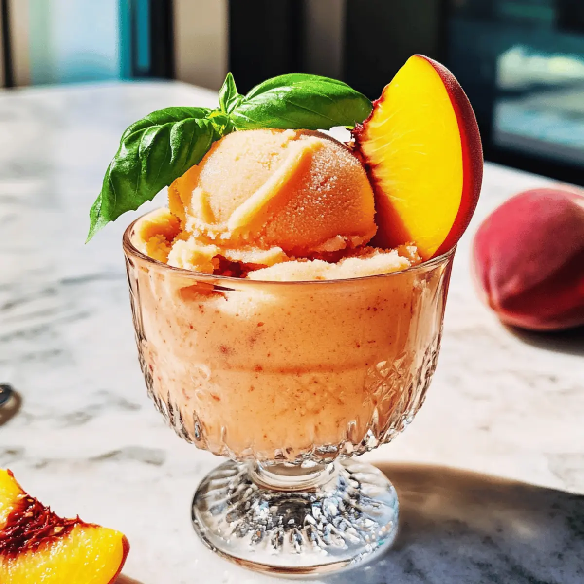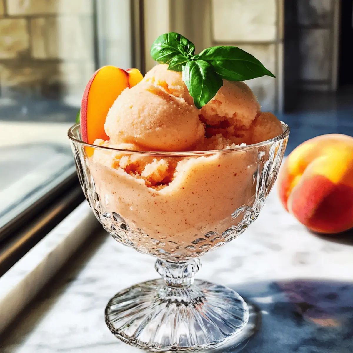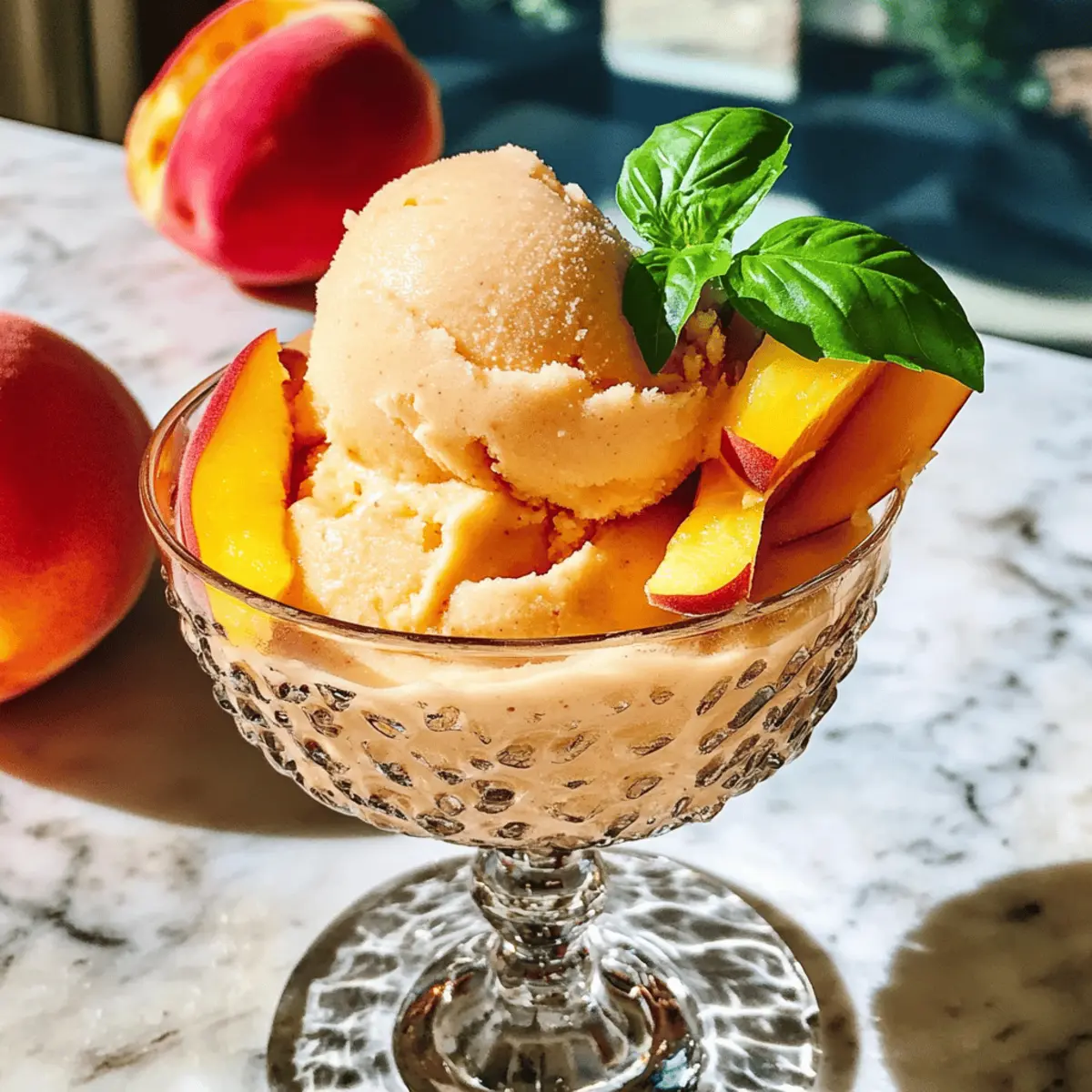 Erfrischendes Pfirsich-Sorbet mit Basilikum, ein veganer Genuss für heiße Tage.