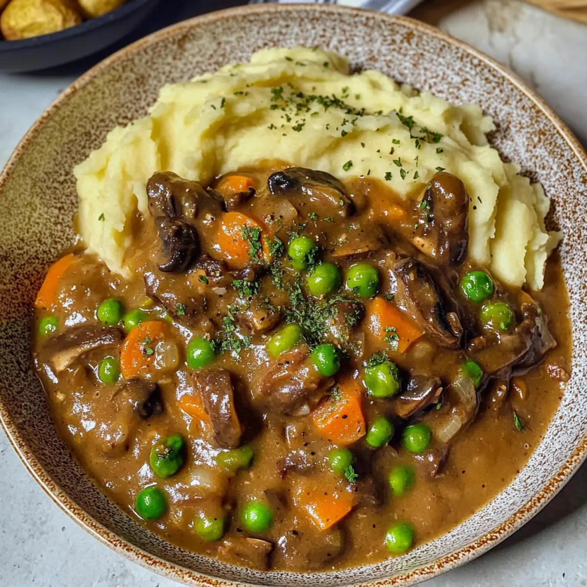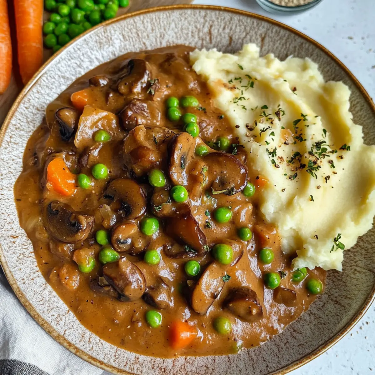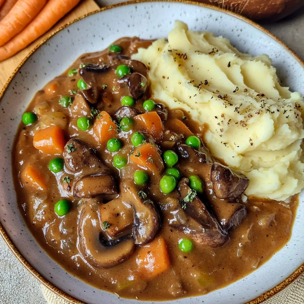 Als ich neulich in der Küche stand, um etwas ganz Besonderes zu kreieren, schwebte mir der Gedanke an ein cremiges Pilzgulasch mit Kartoffelpüree vor. Diese vegane Variante des klassischen Gerichts bringt nicht nur Erinnerungen an genussvolle Familienabendessen zurück, sondern ist auch perfekt für alle, die nach einer schnellen und schmackhaften Abendessen suchen. Mit einer köstlichen Mischung aus frischen und getrockneten Pilzen, würzigem Paprika und aromatischem Thymian wird dieses Pilzgulasch Rezept mit Kartoffelpüree schnell zum Favoriten in deiner Küche. Und das Beste daran? Es ist nicht nur eine wohltuende Umarmung für die Seele, sondern auch kinderleicht zuzubereiten – in nur 50 Minuten! Bereit, diesen herzhaften Klassiker neu zu erleben? Warum wirst du dieses Pilzgulasch lieben? Herzhaft und cremig: Dieses Pilzgulasch Rezept mit Kartoffelpüree vereint die Aromen von frischen und getrockneten Pilzen zu einem unwiderstehlich reichhaltigen Gericht. Schnell zubereitet: In nur 50 Minuten kannst du ein schmackhaftes Abendessen zaubern, das sowohl Freude als auch Zufriedenheit bringt. Familienfreundlich: Kinder und Erwachsene lieben es gleichermaßen – ein echter Publikumsliebling! Vielfältig: Du kannst es leicht anpassen, indem du zum Beispiel mit Hülsenfrüchten oder anderen Gemüsesorten experimentierst, um es einzigartig zu machen. Komfort im Teller: Ideal für kalte Tage oder für einen gemütlichen Abend zu Hause, erfüllt es den Wunsch nach etwas Warmem und Beruhigendem. Gesunde Zutaten: Mit pflanzlichen Zutaten lässt es sich gut in eine ausgewogene Ernährung integrieren – ein Gericht, das gut tut! Pilzgulasch Rezept mit Kartoffelpüree Zutaten Für das Pilzgulasch: Getrocknete Pilze – bieten einen umami-reichen Geschmack; alternativ 300 g frische Champignons verwenden. Öl – zum Anbraten der Gemüse; neutrales Öl wie Raps- oder Sonnenblumenöl funktioniert hervorragend. Zwiebel – sorgt für eine geschmackliche Basis; du kannst auch Schalotten für einen milderen Geschmack nutzen. Karotten – bringen Süße und Biss; bei Bedarf durch Pastinaken ersetzen. Gefrorene Erbsen – für einen Farbtupfer und Süße; grüne Bohnen sind eine gute Alternative. Knoblauch – hebt den Geschmack; bei Bedarf durch Knoblauchpulver ersetzen. Frischer Thymian – verleiht ein erdiges Aroma; stattdessen 1 TL getrockneten Thymian verwenden. Zwiebelpulver – intensiviert die Aromen; kann weggelassen werden, wenn frische Zwiebeln verwendet werden. Meersalz – unverzichtbar zum Würzen; nach Geschmack anpassen. Schwarzer Pfeffer – sorgt für die Würze; kann bei Bedarf durch weißen Pfeffer ersetzt werden. Geräuchertes Paprikapulver – verleiht ein rauchiges Aroma; reguläres Paprika ist ebenfalls geeignet. Rotwein – bringt Säure und Tiefe; alternativ Gemüsebrühe verwenden, wenn du auf Alkohol verzichten möchtest. Tamari (oder Sojasauce) – verstärkt den umami-Geschmack; Kokosaminos sind eine glutenfreie Option. Gemüsebrühe – dient als Basis für die Sauce; hausgemacht oder aus dem Glas, beides funktioniert gut. Pflanzliche Milch – sorgt für eine cremige Konsistenz; Mandel- oder Hafermilch sind gute Alternativen, wobei Kokosmilch für mehr Reichhaltigkeit bevorzugt wird. Speisestärke – dient zum Eindicken der Sauce; kann durch Pfeilwurzpulver ersetzt werden. Für das Kartoffelpüree: Kartoffeln – die Basis für das Püree; jede Sorte ist geeignet, je nach Vorliebe. Kokosmilch – sorgt für Cremigkeit im Püree; alternativ kann jede pflanzliche Sahne verwendet werden. Muskatnuss – hebt den Kartoffelgeschmack hervor; sparsam verwenden für beste Ergebnisse. Genieße dieses Pilzgulasch Rezept mit Kartoffelpüree, das nicht nur köstlich ist, sondern auch deine Kokosmilch für mehr Geschmack einbezieht! Schritt-für-Schritt-Anleitung für das Pilzgulasch Rezept mit Kartoffelpüree Step 1: Pilze einweichen Weiche die getrockneten Pilze in einer Schüssel mit warmem Wasser für 15–20 Minuten ein, bis sie weich sind. Wenn du frische Pilze verwendest, kannst du diesen Schritt überspringen. Die eingeweichten Pilze abtropfen lassen und beiseite stellen. Diese aromatischen Pilze verleihen deinem Pilzgulasch Rezept mit Kartoffelpüree eine tiefere Umami-Note. Step 2: Kartoffeln kochen Schäle die Kartoffeln und schneide sie in grobe Stücke. Setze einen Topf mit gesalzenem Wasser auf und bringe es zum Kochen. Gib die Kartoffeln hinzu und koche sie etwa 15 Minuten lang, bis sie zart sind und leicht mit einer Gabel zerdrückt werden können. Diese perfekt gekochten Kartoffeln sind die Grundlage für ein cremiges Püree. Step 3: Gemüse anbraten Erhitze in einer großen Pfanne bei mittlerer Hitze etwas Öl. Gib die gehackte Zwiebel hinzu und brate sie 4–5 Minuten lang an, bis sie glasig wird. Füge die eingeweichten Pilze, Karotten, gefrorene Erbsen, Knoblauch und frischen Thymian hinzu. Rühre alles gut um und brate es eine weitere Minute, um die Aromen zu entfalten. Step 4: Rotwein hinzufügen Gieße den Rotwein in die Pfanne und lasse ihn 2 Minuten lang köcheln, damit der Alkohol verdampfen kann und sich die Aromen intensivieren. Dies gibt deinem Pilzgulasch eine wunderbare Tiefe. Rühre alles gut um und lass die Mischung köcheln, bis sich die Flüssigkeit etwas reduziert. Step 5: Brühe und Gewürze hinzufügen Füge nun die Tamari und die Gemüsebrühe hinzu und rühre gut um, um alles zu kombinieren. Decke die Pfanne ab und lasse das Ganze für 10–12 Minuten bei niedriger Hitze köcheln. Das Gemüse sollte weich sein, und die Sauce sollte schön aromatisch sein, bereit, deinem Pilzgulasch Rezept mit Kartoffelpüree Charakter zu verleihen. Step 6: Sauce eindicken Mische in einer kleinen Schüssel die pflanzliche Milch mit der Speisestärke, bis sie glatt ist. Gieße die Mischung in die Pfanne und rühre konstant, während du weiter köchelst, bis die Sauce mindestens 3–4 Minuten dick wird. Diese cremige Textur macht dein Pilzgulasch unwiderstehl