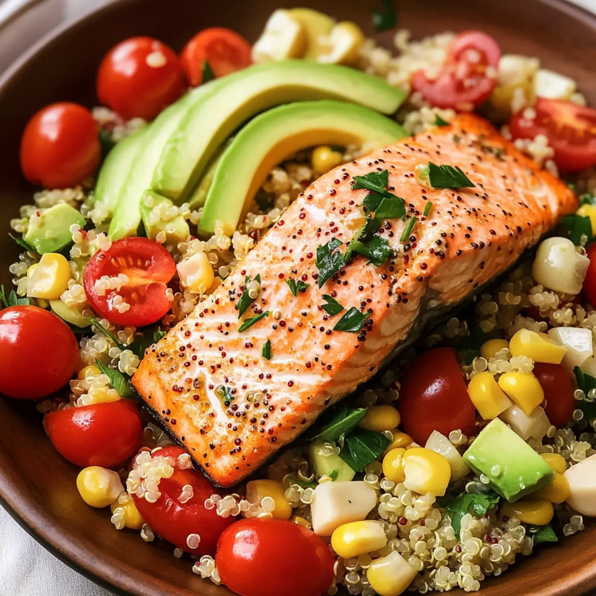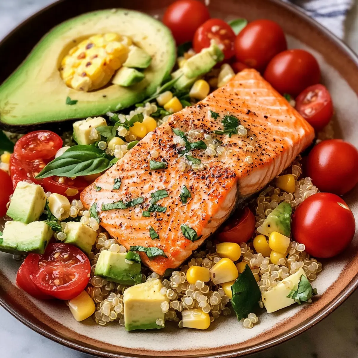 Als ich zum ersten Mal diesen Quinoa-Salat mit Lachs zubereitete, wurde mir sofort klar, dass dies mein neues Lieblingsgericht für den Sommer ist. Die Kombination aus zart gegrilltem Lachs, knusprigem Gemüse und der frischen tarragon-honig Vinaigrette verleiht einem bei jedem Bissen das Gefühl von Urlaub und leichten Tagen. Dieses Rezept ist nicht nur hoch in Proteinen, sondern auch perfekt für Meal Prep geeignet – ideal für all jene, die sich eine gesunde, selbstgemachte Mahlzeit wünschen, die auch noch köstlich schmeckt. Mit nur wenigen Zutaten zaubern Sie ein helles, nahrhaftes Gericht, das sowohl als Hauptgericht als auch als Beilage glänzt. Neugierig darauf, welche Zutaten Sie noch hinzufügen können, um dieses Rezept ganz nach Ihrem Geschmack zu gestalten? Warum sollten Sie diesen Quinoa-Salat probieren? Frische Zutaten: Sie können einfache, gesunde Zutaten nutzen, um dieses Gericht zuzubereiten – ideal für den Sommer! Hoher Proteingehalt: Der Lachs und die Quinoa bieten eine hervorragende Proteinquelle, die Sie satt und zufrieden macht. Vielseitig: Fügen Sie nach Belieben weiteres Gemüse hinzu oder ersetzen Sie die Quinoa durch Couscous – die Möglichkeiten sind endlos! Schnelle Zubereitung: Mit minimalem Aufwand haben Sie in kürzester Zeit ein leckeres Gericht, das perfekt für Meal Prep geeignet ist. Crowd-Pleaser: Dieser Salat wird sicher nicht nur Ihnen, sondern auch Ihren Freunden und Ihrer Familie schmecken. Servieren Sie ihn bei Ihrem nächsten Grillfest oder piknicken Sie damit in der Natur! Wenn Sie weiteres gesundes Essen suchen, werfen Sie einen Blick auf mein Rezept für Hackballs in cremiger Sauce oder Spaghetti mit Pfifferlingen. Quinoa-Salat mit Lachs Zutaten • Dieser Quinoa-Salat mit Lachs ist nicht nur gesund, sondern auch einfach zuzubereiten! Für den Salat Quinoa – liefert die perfekte Grundlage; gut abspülen, um Bitterkeit zu vermeiden. Olivenöl – zum Anbraten der Aromen; extra natives Olivenöl bringt zusätzliches Aroma. Schalotte – verleiht eine subtile Süße; kann durch rote Zwiebel ersetzt werden. Knoblauch – sorgt für eine warme, tiefgründige Note; frisch verwenden für den besten Geschmack. Kreuzkümmel – bringt erdige Aromen in die Quinoa; kann für einen milderen Geschmack weggelassen werden. Salz – wichtig für die Würze; nach Geschmack anpassen. Hühnerbrühe – gibt der Quinoa zusätzliches Aroma; kann durch Gemüsebrühe ersetzt werden. Frischer Mais – süß und knackig; verwenden Sie frischen oder grillen Sie ihn für mehr Geschmack. Radieschen – für einen pfeffrigen Crunch; können durch Gurke ersetzt werden. Cherrytomaten – saftig und süß; können durch Traubentomaten substituiert werden. Rote Zwiebel – für eine scharfe Note; kann auch weggelassen werden. Gurken – sorgt für Frische; können durch andere Sorten ersetzt werden. Feta-Käse – für Cremigkeit und einen leicht sauren Geschmack; auszutauschen durch veganen Feta möglich. Frisches Basilikum – sorgt für einen frischen Kick; kann durch Petersilie oder Minze ersetzt werden. Avocados – bieten Cremigkeit und gesunde Fette; reife Avocados verwenden für die beste Textur. Lachsfilets – hauptsächlich Proteinquelle; frisch ist am besten; kann durch Hühnchen oder Tofu ersetzt werden. Für das Dressing Zitrone – zum Beträufeln des Lachs nach dem Garen; fördert den Geschmack und die Frische. Estragon-Essig – bringt eine einzigartige Kräuternote; kann durch Zitronensaft ersetzt werden. Honig – süßt das Dressing auf natürliche Weise; kann durch Ahornsirup für eine vegane Option ersetzt werden. Dijon-Senf – fügt dem Dressing Tiefe hinzu; kann weggelassen werden. Frischer Estragon – aromatische Kräuter, die das Gericht aufhellen; kann auch zu getrockneter Variante gegriffen werden, ist aber weniger intensiv. Schritt-für-Schritt-Anleitung für Quinoa-Salat mit Lachs Step 1: Quinoa abspülen Spülen Sie die Quinoa in einem feinen Sieb unter kaltem Wasser gründlich ab, um Bitterkeit zu entfernen. Lassen Sie sie abtropfen, während Sie die weiteren Schritte vorbereiten. Dies ist ein wichtiger Schritt für den Quinoa-Salat mit Lachs, da er den Geschmack erheblich verbessert. Step 2: Aromen anbraten Erhitzen Sie in einer großen Pfanne 2 Esslöffel Olivenöl bei mittlerer Hitze. Fügen Sie dann die gehackte Schalotte, den Knoblauch, den Kreuzkümmel und eine Prise Salz hinzu. Braten Sie die Mischung unter Rühren für etwa 2 bis 3 Minuten an, bis sie duftet und die Schalotten glasig sind. Step 3: Quinoa rösten Geben Sie die abgespülte Quinoa in die Pfanne und rösten Sie sie unter ständigem Rühren für ca. 2-3 Minuten. Dies verleiht der Quinoa eine nussige Note und ist eine wichtige Basis für Ihren Quinoa-Salat mit Lachs. Step 4: Quinoa kochen Gießen Sie 500ml Hühnerbrühe in die Pfanne und bringen Sie die Mischung zum Kochen. Reduzieren Sie dann die Hitze auf niedrig, decken Sie die Pfanne ab und lassen Sie die Quinoa 15 Minuten lang köcheln, bis sie die Flüssigkeit aufgenommen hat und weich ist. Step 5: Quinoa auflockern Schalten Sie die Hitze aus und lassen Sie die Quinoa 5 Minuten ruhen. Verwenden Sie anschließend eine Gabel, um die Quinoa aufzulockern und bringen Sie die Körner wieder in ihre luftige Form. Dies gibt Ihrem Quinoa-Salat mit Lachs die perfekte Konsistenz. Step 6: Vinaigrette zubereiten Geben Sie in ein Glas mit Deckel die gehackte Schalotte, den Knoblauch, 3 Esslöffel Olivenöl, 2 Esslöffel Estragon-Essig, 1 Esslöffel Honig und 1 Teelöffel Dijon-Senf. Schrauben Sie den Deckel fest auf und schütteln Sie alles kräftig, bis die Vinaigrette gut vermischt ist und eine homogene Konsistenz hat. Step 7: Lachs vorbereiten Trocknen Sie die Lachsfilets mit etwas Küchenpapier ab und würzen Sie sie großzügig mit Salz und Pfeffer. Lassen Sie den Lachs somit seine Aromen entfalten, bevor Sie ihn anbraten. Dies ist ein essentieller Schritt für den Quinoa-Salat mit Lachs. Step 8: Lachs anbraten Er