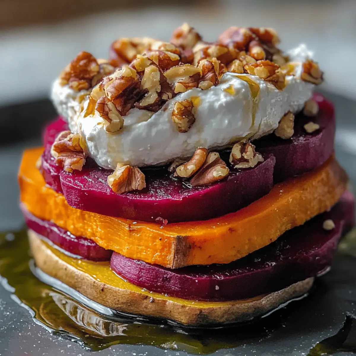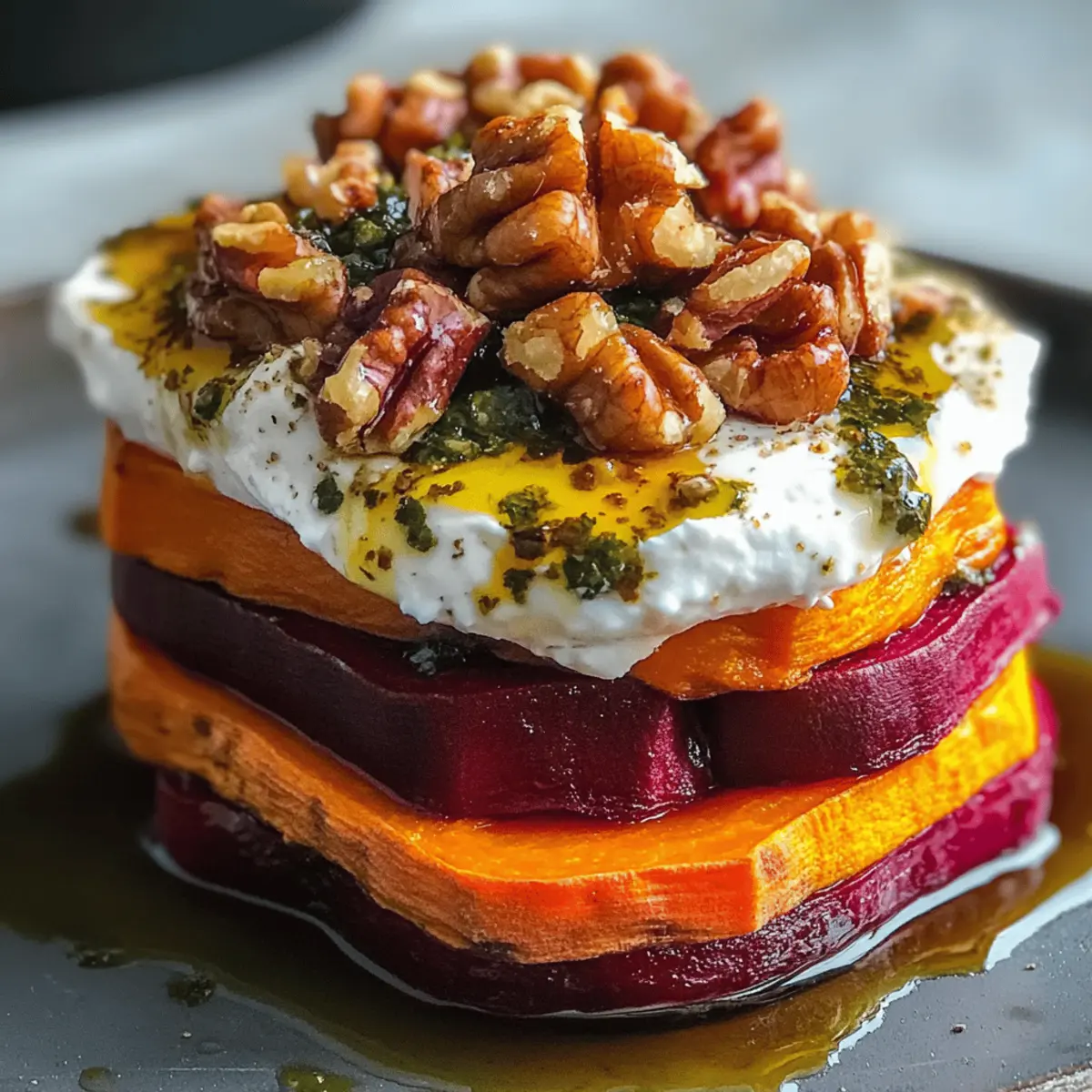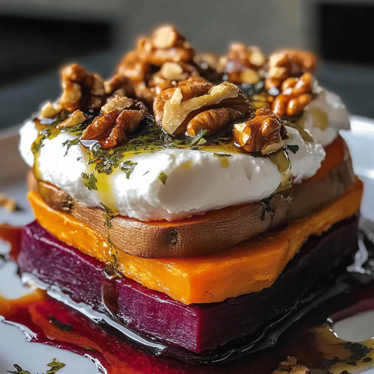 Als ich neulich in meinem Garten stöberte, erblickte ich die leuchtenden Farben von Süßkartoffeln und Rüben. Diese lebendige Mischung inspirierte mich, ein Rezept für Süßkartoffel- und Rübenstapel mit Pesto, Burrata und Walnüssen zu kreieren. Es ist ein Gericht, das nicht nur das Auge erfreut, sondern auch eine harmonische Balance aus erdigen Aromen, cremiger Textur und knackigem Biss bietet. Perfekt für besondere Anlässe oder einfach, um den Alltag aufzupeppen, sind diese vegetarischen Stapel kinderleicht zuzubereiten und regelmäßig ein Hit bei meinen Freunden. Bereit, in die Welt der mediterranen Küche einzutauchen? Lass uns gemeinsam kochen und diese köstlichen Stapel zaubern! Warum sind diese Stapel so besonders? Farblich ansprechend: Die leuchtenden Farben von Süßkartoffeln und Rüben machen dieses Gericht zu einem Fest für die Augen und ein Highlight auf jedem Tisch. Vielfältige Aromen: Der geschmackvolle Einsatz von Basilikumpesto verleiht den Stapeln eine erfrischende Note, während die cremige Burrata und die knackigen Walnüsse für ein unvergessliches Geschmackserlebnis sorgen. Einfache Zubereitung: Diese einfach zuzubereitenden Stapel benötigen nur wenige Zutaten, was sie zur idealen Wahl für beschäftigte Kochliebhaber macht. Gesund und nahrhaft: Mit frischem Gemüse und Nüssen sind die Stapel nicht nur lecker, sondern auch nährstoffreich – perfekt für eine ausgewogene Ernährung. Vielseitig: Ob als Hauptgericht oder als elegante Beilage, diese Stacks sind eine tolle Wahl für jede Gelegenheit und sicherlich ein Hit bei deinen Gästen. Lass dich von der Einfachheit und den Aromen überzeugen und genieße diese mediterrane Köstlichkeit! Zutaten für Süßkartoffel- und Rübenstapel • Die Hauptzutaten für dieses Rezept für Süßkartoffel- und Rübenstapel mit Pesto, Burrata und Walnüssen sind einfach und gesund. Für die Stapel Süßkartoffeln – bieten Struktur und natürliche Süße; für eine andere Geschmackrichtung kann Kürbis verwendet werden. Rüben – bringen Erdigkeit und lebendige Farbe; können durch gekochte Karotten ersetzt werden, um ein süßeres Profil zu erzielen. Für das Rösten Olivenöl – sorgt für Reichhaltigkeit und hilft beim Rösten; Avocadoöl kann als Ersatz verwendet werden. Salz & schwarzer Pfeffer – essentielle Gewürze für die richtige Würze; verwende grobes Meersalz für eine bessere Textur. Für das Pesto Basilikumpesto – verleiht den Stapeln den frischen, kräuterigen Geschmack; eine milchfreie Variante kann mit Nährhefe anstelle von Käse zubereitet werden. Für die Garnitur Burrata – sorgt für Cremigkeit und ergänzt die Aromen wunderbar; vegane Alternativen sind Nuss-Käse auf Cashew-Basis. Walnüsse – fügen eine knusprige Textur hinzu und runden das Gericht mit nussigem Geschmack ab; Pekannüsse oder Haselnüsse sind ebenfalls gute Ersatzmöglichkeiten. Microgreens oder frisches Basilikum – für den letzten Schliff und zusätzliche Frische; andere frische Kräuter können ebenfalls verwendet werden. Schritt-für-Schritt-Anleitung für Süßkartoffel- und Rübenstapel mit Pesto, Burrata und Walnüssen Step 1: Ofen vorheizen Heize deinen Ofen auf 200 °C (400 °F) vor und lege ein Backblech mit Backpapier aus. Dies ist wichtig, damit die Süßkartoffeln und Rüben beim Rösten nicht ankleben. Der Duft des warmen Ofens wird schon bald deine Küche erfüllen und Vorfreude auf das Gericht wecken. Step 2: Gemüse vorbereiten Schäle die Süßkartoffeln und Rüben und schneide sie in dünne Scheiben von etwa einem Zentimeter Dicke. Achte darauf, dass die Scheiben gleichmäßig sind, damit sie gleichmäßig garen und beim Stapeln gut übereinanderliegen. Diese lebendigen Farben werden schon beim Schneiden dein Herz erfreuen! Step 3: Gemüse würzen Gib die geschnittenen Runden in eine große Schüssel und beträufle sie großzügig mit Olivenöl. Streue Salz und schwarzen Pfeffer nach Geschmack darüber und vermische alles gut, sodass jede Scheibe gleichmäßig gewürzt ist. Dies sorgt dafür, dass die Süßkartoffel- und Rübenstapel beim Rösten geschmacklich intensiv werden. Step 4: Rösten und Wenden Verteile die gewürzten Runden gleichmäßig auf dem vorbereiteten Backblech in einer einzigen Schicht. Röste das Gemüse 25 bis 30 Minuten lang im Ofen und wende die Scheiben nach der Hälfte der Zeit. Achte darauf, dass sie zart und goldbraun werden – das ist das Zeichen, dass sie fertig sind. Step 5: Stapeln mit Pesto Lass die Scheiben nach dem Rösten kurz abkühlen, bevor du sie auf einer Servierplatte anrichtest. Beginne mit einer Süßkartoffelscheibe, füge einen Löffel Pesto hinzu und lege dann eine Rübe darauf – wiederhole dies, um einen hübschen Stapel zu bilden. Die Aromen des Pestos werden den ganzen Stapel wunderbar durchdringen. Step 6: Burrata und Walnüsse hinzufügen Zerreiße die Burrata vorsichtig und verteile die Stücke dekorativ über die gestapelten Süßkartoffeln und Rüben. Anschließend streue die gerösteten Walnüsse darüber. Die cremige Burrata und die knackigen Nüsse bringen einen köstlichen Kontrast zur Textur der Stacks. Step 7: Garnieren und servieren Gib noch etwas frische Microgreens oder Basilikum als Garnitur dazu und verleihe dem Gericht einen feinen letzten Schliff. Wenn gewünscht, träufle etwas Balsamico-Glasur darüber, um die Aromen zu intensivieren. Diese Süßkartoffel- und Rübenstapel mit Pesto, Burrata und Walnüssen sind nun bereit, serviert zu werden. Step 8: Genießen Diese Stacks können warm serviert werden, sind aber auch bei Zimmertemperatur köstlich. Platziere sie auf dem Tisch und lass die Gäste sich ihr Stück nehmen – das wird ein echter Blickfang auf jeder Feier oder beim Abendessen mit Familie und Freunden! Tipps für die besten Süßkartoffel- und Rübenstapel Einheitliche Scheiben: Achte darauf, die Gemüsescheiben gleichmäßig zu schneiden, damit sie gleichmäßig garen und gut übereinander stapelbar sind. Öl-Ko