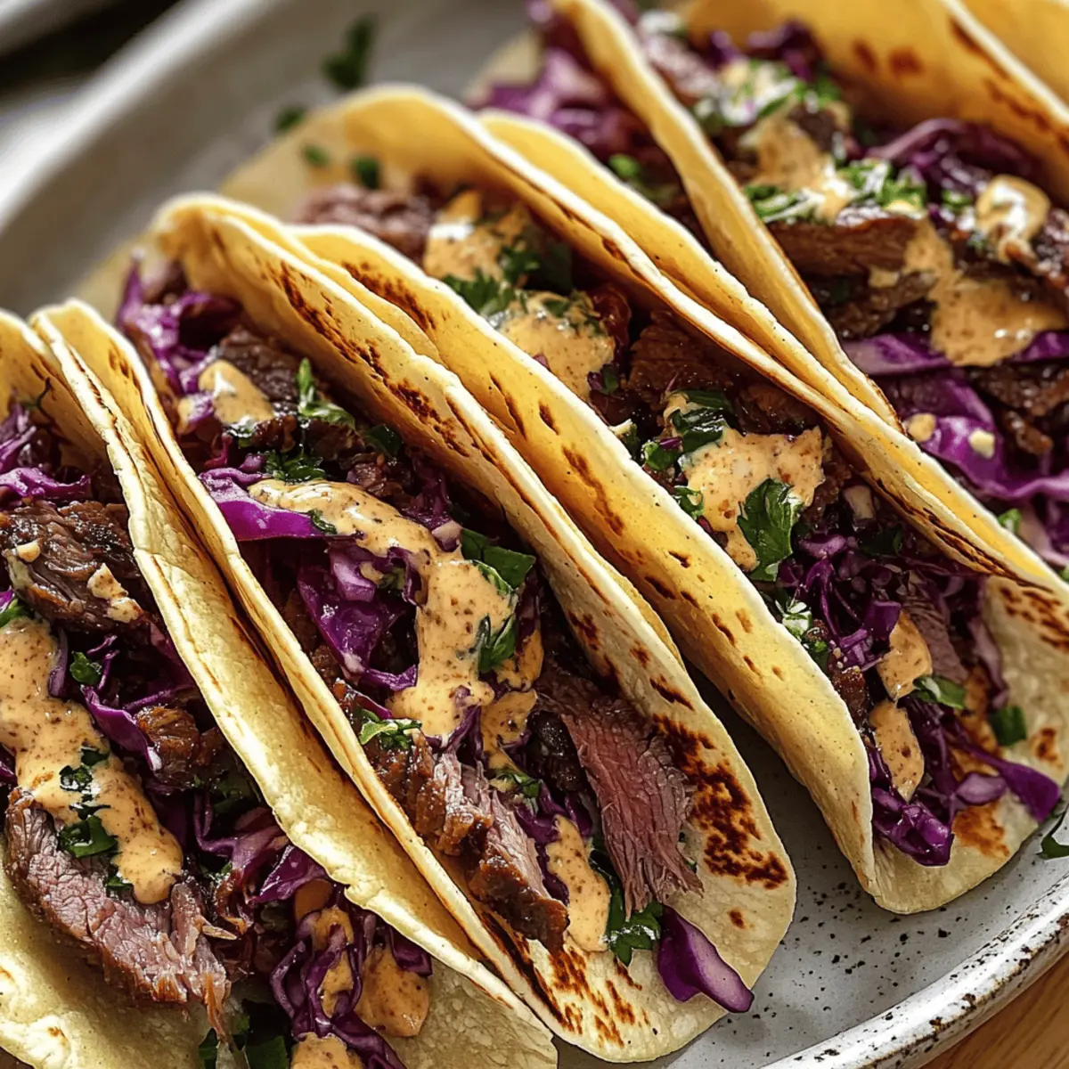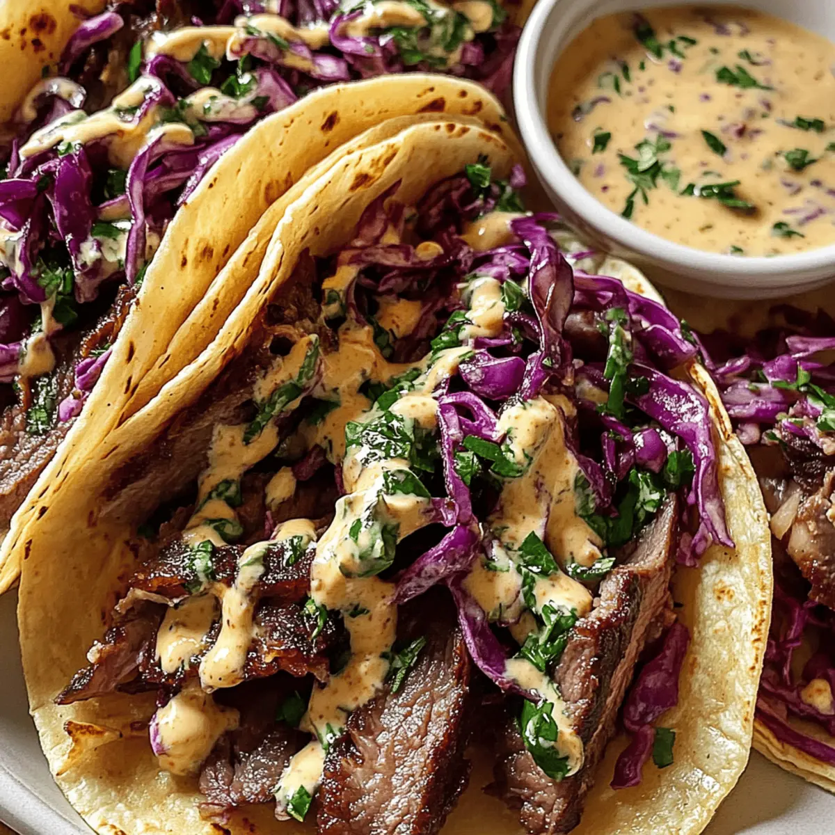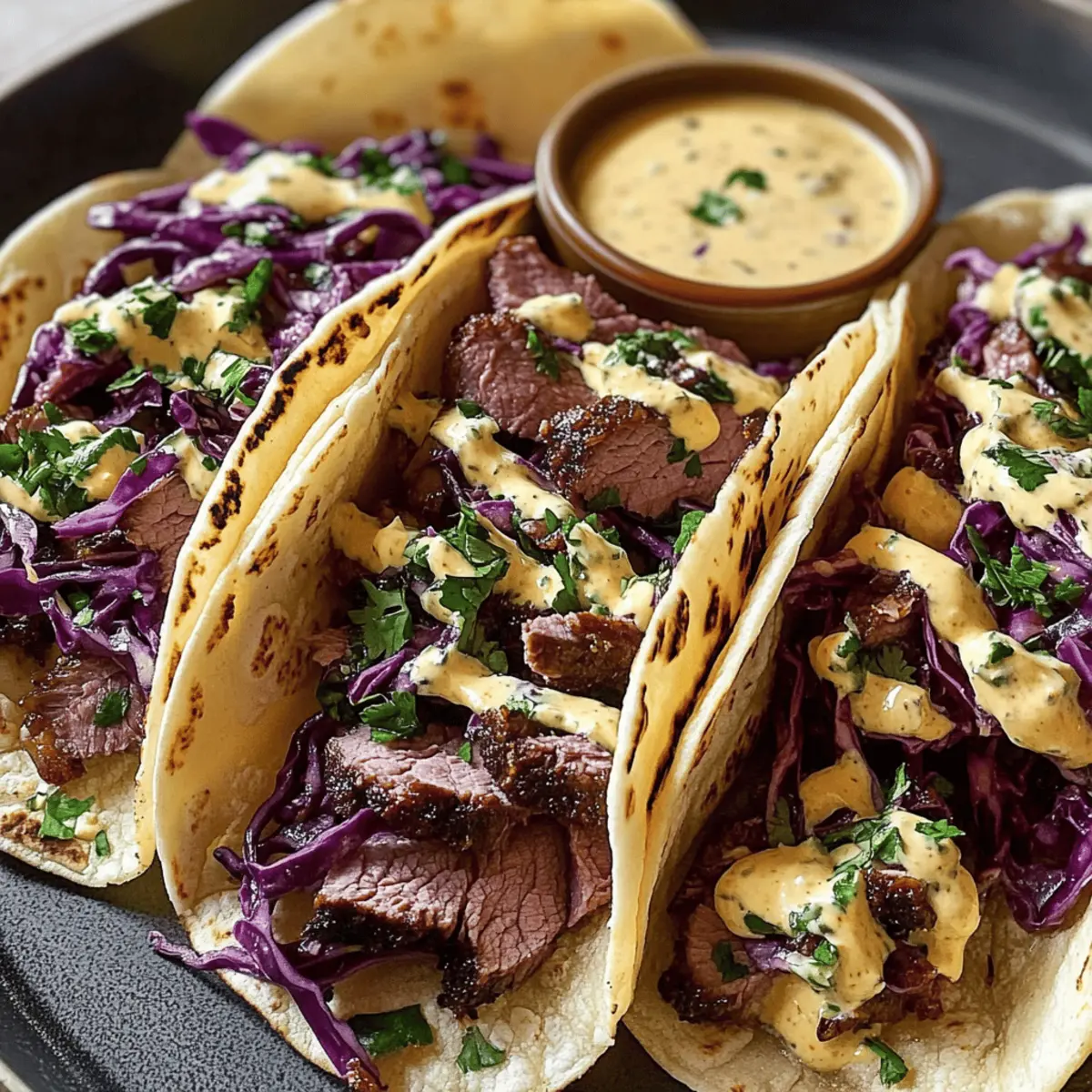 Wusstest du, dass die Verbindung von deutschem und mexikanischem Essen eine geschmackliche Offenbarung sein kann? Mit meinen Rinderrouladen Tacos mit Rotkohl Slaw lade ich dich ein, die klassischen Aromen von Rinderrouladen neu zu entdecken. Diese kreative Fusion ist nicht nur ein Genuss für den Gaumen, sondern auch ein einfacher Weg, um deine nächste Familienfeier oder einen gemütlichen Abend mit Freunden aufzupeppen. Das Beste daran? Diese Tacos sind proteinreich und können leicht an verschiedene Ernährungsbedürfnisse angepasst werden – egal, ob du glutenfrei, vegetarisch oder einfach nur neugierig auf neue Geschmackserlebnisse bist. Bist du bereit, deine Geschmacksnerven auf eine aufregende Reise zu schicken? Warum wirst du diese Tacos lieben? Einzigartige Fusion: Rinderrouladen Tacos mit Rotkohl Slaw verbinden das Beste aus der deutschen und mexikanischen Küche. Vielseitig anpassbar: Perfekt für jeden Geschmack – wähle zwischen glutenfreien, vegetarischen oder klassischen Optionen. Einfaches Kochen: Das Rezept ist leicht verständlich und erfordert keine komplizierten Techniken. Kraftvolle Aromen: Zarte Rinderroulade kombiniert mit frischem Rotkohl sorgt für einen unwiderstehlichen Geschmack! Ideal für Feste: Diese Tacos sind hervorragendes Fingerfood und bringen Leben in jede Zusammenkunft! Schnelle Zubereitung: In weniger als einer Stunde zum Genuss, perfekt für hektische Abende. Rinderrouladen Tacos Zutaten Werde kreativ mit diesen köstlichen Rinderrouladen Tacos! Rinderrouladen (Beef): Hauptproteinquelle – sorgt für reichhaltigen Geschmack; alternativ Hähnchenbrust oder fester Tofu verwenden. Gewürzgurken (Pickles): Fügt eine würzige Note hinzu – wähle zwischen süßen oder Dill-Gurken nach Vorliebe. Senf (Mustard): Vertieft den Geschmack – kann durch scharfen Senf ersetzt werden, um einen zusätzlichen Kick zu erhalten. Bacon: Sorgt für Raucharoma – kann durch Puten-Bacon ersetzt oder bei einer vegetarischen Version weggelassen werden. Zwiebel (Onion): Bringt Süße und Tiefe – gelbe Zwiebeln sind ideal; Schalotten für einen milderen Geschmack nutzen. Butterschmalz (Clarified Butter): Zum Braten verwendet – bietet eine reiche Note; kann durch Olivenöl ersetzt werden. Rinderfond (Beef Broth): Hält das Fleisch saftig – Gemüsebrühe eignet sich gut für eine vegetarische Variante. Rotkohl (Red Cabbage): Bietet eine farbenfrohe, knusprige Beilage – grüner Kohl kann als Ersatz verwendet werden. Karotte (Carrot): Bringt natürliche Süße – auch andere Wurzelgemüse wie Radieschen sind möglich. Apfelessig (Apple Cider Vinegar): Balanciert die Aromen – jeder Essig kann verwendet werden, aber Apfel verleiht eine mildere Süße. Honig (Honey): Sorgt für Süße – Ahornsirup ist ein veganer Ersatz. Öl (Oil): Zum Ankleiden des Slaws und Braten genutzt – neutrale Öle wie Sonnenblumenöl sind gute Alternativen. Schmand oder Crème fraîche (Sour Cream or Crème fraîche): Verleiht dem Dip Cremigkeit – vegane saure Sahne für milchfreie Optionen verwenden. Körniger Senf (Grainy Mustard): Sorgt für Textur – kann auch durch Dijon-Senf ersetzt werden. Mini-Tortillas: Transportmittel für die Füllung – wähle Mais für glutenfreie Option; Mehl-Tortillas für eine weichere Textur. Frische Kräuter (Fresh Herbs): Garnierung zur Verbesserung von Aroma und Aussehen – Petersilie oder Schnittlauch bringen Frische. Diese Rinderrouladen Tacos mit Rotkohl Slaw sind nicht nur ein Gaumenschmaus, sondern auch eine großartige Gelegenheit, deine Kochkünste auf ein neues Niveau zu heben! Schritt-für-Schritt-Anleitung für Rinderrouladen Tacos mit Rotkohl Slaw Step 1: Rinderrouladen vorbereiten Die Rinderrouladen in gleichmäßige Streifen schneiden und großzügig mit Salz und Pfeffer würzen. Erhitze Butterschmalz in einer großen Pfanne bei mittlerer Hitze. Brate die Rinderstreifen für etwa 3-4 Minuten pro Seite, bis sie goldbraun sind. Nimm das Fleisch aus der Pfanne und stelle es beiseite. Step 2: Bacon und Zwiebel anbraten Gib den in Stücke geschnittenen Bacon in die gleiche Pfanne und brate ihn für 2-3 Minuten, bis er knusprig ist. Füge die gewürfelten Zwiebeln hinzu und dünste sie für weitere 3 Minuten, bis sie weich sind. Jetzt die Gewürzgurken und den Senf dazugeben und alles gut vermengen. Step 3: Rinderfond hinzufügen Gieße den Rinderfond in die Pfanne und rühre alles gut um, um die angebratenen Stücke vom Pfannenboden zu lösen. Die vorbereiteten Rinderstreifen zurück in die Pfanne geben. Decke die Pfanne ab und lasse alles bei niedriger Hitze etwa 40 Minuten köcheln, bis das Fleisch zart ist. Step 4: Rotkohl-Slaw zubereiten In einer separaten Schüssel den fein geschnittenen Rotkohl und die Karottenraspel kombinieren. Füge Apfelessig, Honig, Öl, Salz und Pfeffer hinzu und vermenge alles gut. Etwa 15 Minuten ziehen lassen, damit die Aromen sich entfalten und der Slaw knackig bleibt. Step 5: Senf-Dip anmixen In einer kleinen Schüssel Schmand oder Crème fraîche mit körnigem Senf und einem Spritzer Zitronensaft vermengen. Mit Salz und Pfeffer abschmecken und den Dip bis zum Servieren kaltstellen, damit er cremig und erfrischend bleibt. Step 6: Tortillas erwärmen Die Mini-Tortillas in einer trockenen Pfanne oder im Ofen auf mittlerer Hitze für ca. 1-2 Minuten pro Seite erwärmen, bis sie weich und leicht goldbraun sind. Dadurch erhältst du die perfekte Textur, um die Rinderrouladen und den Rotkohl-Slaw zu halten. Step 7: Tacos füllen und servieren Die warmen Tortillas großzügig mit der Rinderrouladen-Mischung füllen. Den vorbereiteten Rotkohl-Slaw darüber geben und mit einem Schuss Senf-Dip versehen. Die Rinderrouladen Tacos mit frischen Kräutern garnieren und direkt servieren, um den besten Geschmack zu genießen. Lagerungstipps für Rinderrouladen Tacos mit Rotkohl Slaw Zimmertemperatur: Die Rinderrouladen sollten nicht länger als 2 Stunden bei Zimmertemperatur stehen gelassen werden, um die Frische zu 