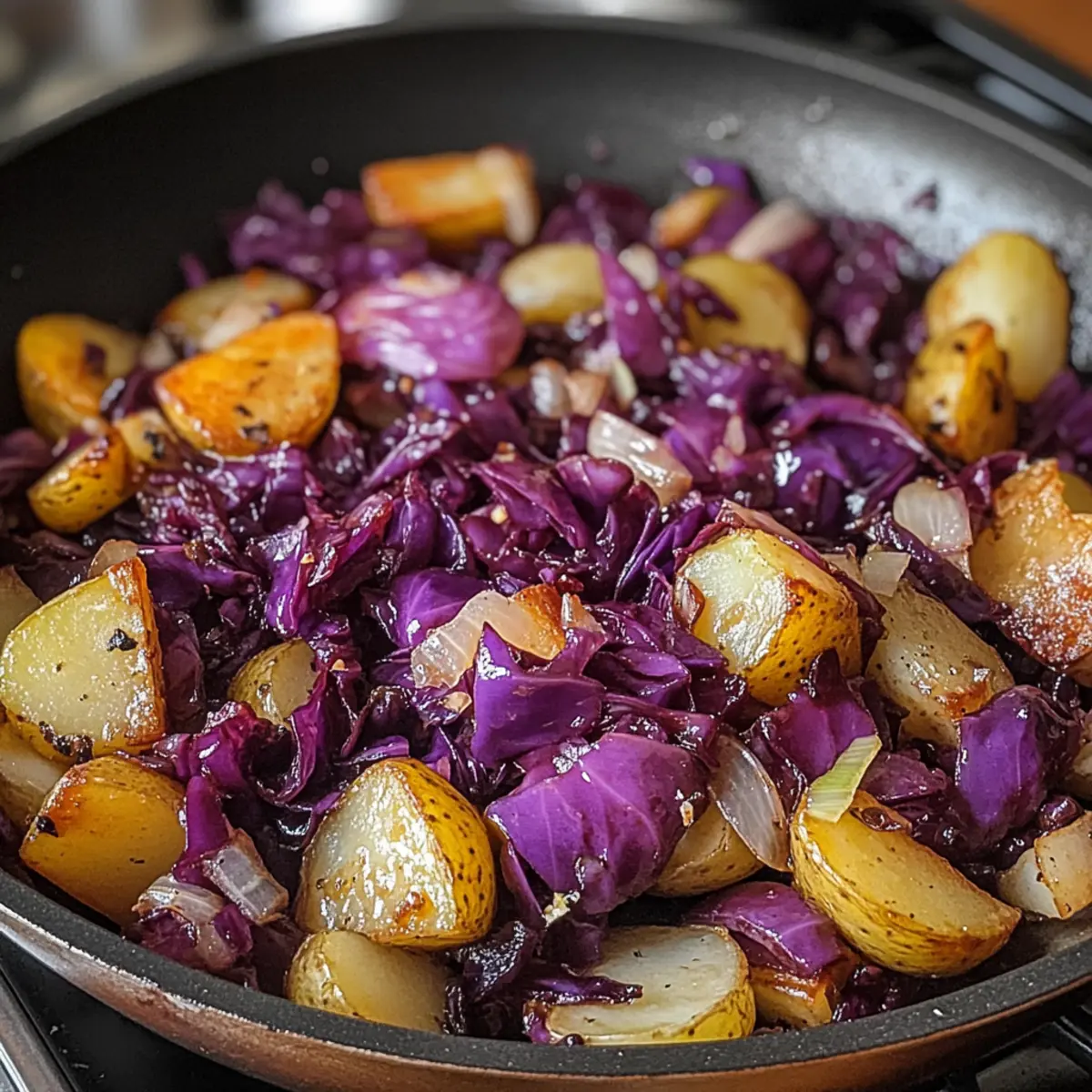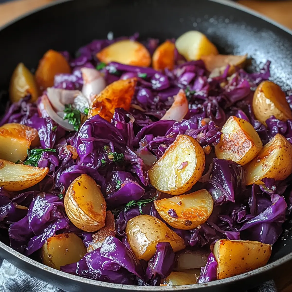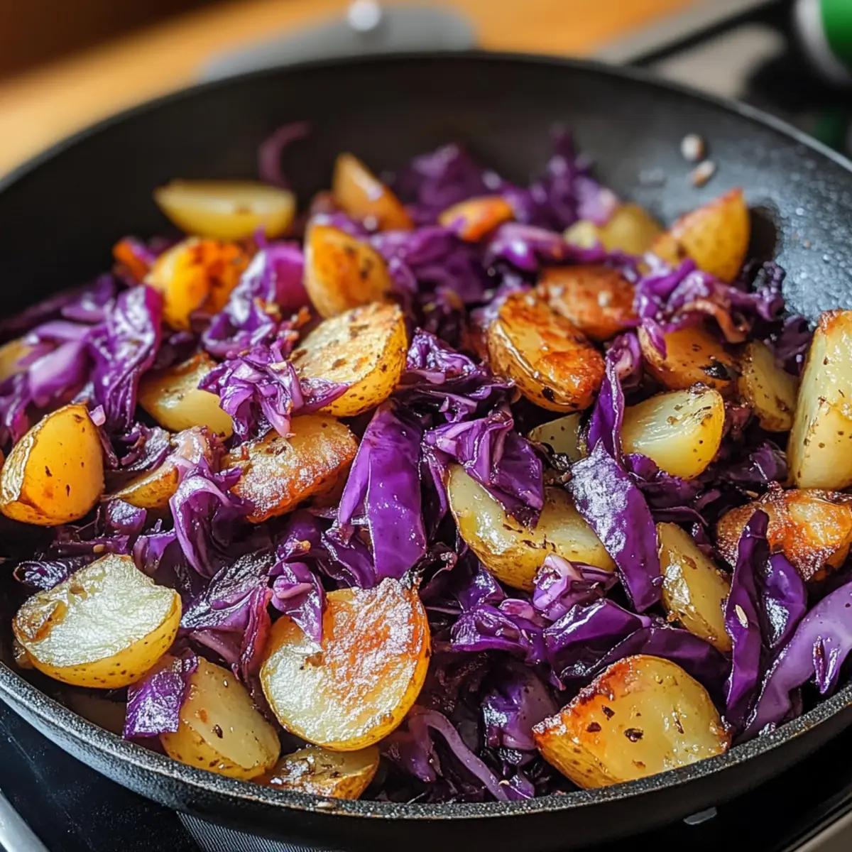 Eines der besten Dinge an der herbstlichen Küche ist die Freude, die in einem Topf entsteht, wenn frische, saisonale Zutaten zusammentreffen. Mein Rezept für Rotkohl Pfanne mit Kartoffeln ist das perfekte Beispiel dafür – ein schnelles, vegetarisches Gericht, das nicht nur den Magen, sondern auch die Seele wärmt. Die süß-sauren Aromen von zartem Rotkohl harmonieren wunderbar mit den knusprigen, goldenen Kartoffeln und bringen einen Hauch von heimischer Gemütlichkeit auf den Tisch. In kurzer Zeit zubereitet, wird dieses Gericht schnell zum Star jeder Mahlzeit, sei es frisch serviert oder als praktisches Meal-Prep für die Woche. Worauf warten Sie noch? Lassen Sie uns in die köstliche Welt dieser herzhaften Pfanne eintauchen! Warum werden Sie dieses Rezept lieben? Einfachheit, die begeistert: Mit nur wenigen Zutaten und einfachen Schritten können Sie ein Gericht zaubern, das großartige Aromen bietet. Saisonale Frische: Rotkohl und Kartoffeln sind nicht nur nahrhaft, sondern auch die perfekten Zutaten für jede Jahreszeit. Dieses schnelle Rezept ist ideal für eine unkomplizierte Abendmahlzeit. Vielfältige Variationsmöglichkeiten: Verfeinern Sie das Gericht mit Apfelessig für eine spritzige Note oder fügen Sie Gewürze nach Ihrem Geschmack hinzu. Ihre kulinarischen Ideen sind hier herzlich willkommen! Eindruck hinterlassen: Sowohl für Familie als auch für Gäste – die Kombination aus zartem Rotkohl und knusprigen Kartoffeln wird jeden begeistern. Genießen Sie es warm oder gekühlt als Teil Ihrer Meal Prep. Nährstoffreich: Diese Pfanne ist nicht nur lecker, sondern auch reich an Vitaminen und Ballaststoffen. Sie können es mit anderen saisonalen Gerichten kombinieren oder als Hauptgericht servieren. Probieren Sie auch meine anderen Rezepte, wie deftige Kartoffelsuppe oder herzhafte Gemüsepfanne! Rotkohl Pfanne mit Kartoffeln Zutaten • Verleihen Sie Ihrem Gericht Geschmack und Farbe mit diesen frischen Zutaten! Für die Pfanne Rotkohl (Rotkohl) – sorgt für die süß-sauren Geschmackskomponenten, die das Gericht ausmachen. Substitution: Grüner Kohl, aber der Geschmack wird anders sein. Kartoffeln – liefern die nötige Herzhaftigkeit und Textur und ergänzen den Kohl perfekt. Substitution: Süßkartoffeln für eine süßere Variante. Apfelessig – bringt die erforderliche Säure für ein ausgewogenes Geschmacksprofil. Substitution: Rotweinessig kann in der Not verwendet werden. Kreuzkümmel – verstärkt das Aroma und die Wärme des Gerichts. Omissieren oder durch geräuchertes Paprikapulver ersetzen, um einen anderen Geschmack zu erzielen. Paprika oder Chili (optional) – für diejenigen, die es würzig mögen. Kann nach Geschmack angepasst werden. Speck oder Räuchertofu (optional) – fügt eine zusätzliche Geschmacksdimension hinzu. Für ein veganes Gericht weglassen oder durch pflanzlichen Speck ersetzen. Schritt-für-Schritt-Anleitung für Rotkohl Pfanne mit Kartoffeln Step 1: Zutaten vorbereiten Zuerst schneiden Sie den Rotkohl in feine Streifen und die Kartoffeln in kleine Würfel. Das gleichmäßige Schneiden sorgt dafür, dass alles gleichmäßig gart. Stellen Sie sicher, dass die Kartoffeln etwa gleich groß sind, damit sie einerseits knusprig werden und andererseits die Kochzeit nicht variiert. Step 2: Kartoffeln anbraten Erhitzen Sie 2 Esslöffel Öl in einer großen, beschichteten Pfanne bei mittlerer Hitze. Fügen Sie die gewürfelten Kartoffeln hinzu und braten Sie sie etwa 10 Minuten lang an, bis sie goldbraun und knusprig sind. Rühren Sie gelegentlich um, damit die Kartoffeln nicht anbrennen und gleichmäßig garen. Step 3: Rotkohl hinzufügen Sobald die Kartoffeln schön gebräunt sind, geben Sie den vorbereiteten Rotkohl in die Pfanne. Rühren Sie alles gut um und lassen Sie den Kohl etwa 5 Minuten mitgaren, bis er zusammenfällt und weich wird. Achten Sie darauf, dass der Kohl nicht zu lange gart, damit er seine schöne Farbe und den Biss behält. Step 4: Würzen und abschmecken Fügen Sie nun 2 Esslöffel Apfelessig sowie 1 Teelöffel Kreuzkümmel und optional etwas Paprika oder Chili hinzu. Mischen Sie alles gut durch und lassen Sie es für weitere 2-3 Minuten köcheln, bis die Aromen sich schön verbunden haben. Probieren Sie und passen Sie die Würze nach Ihrem Geschmack an. Step 5: Servieren und genießen Jetzt ist Ihre Rotkohl Pfanne mit Kartoffeln bereit, serviert zu werden! Genießen Sie das Gericht warm als Hauptspeise oder lassen Sie es abkühlen und verwenden Sie es als praktisches Meal-Prep für die Woche. Die harmonischen Aromen und die gesunde Zutatenkombination werden Sie begeistern! Rotkohl Pfanne mit Kartoffeln Variationen Lassen Sie Ihrer Kreativität freien Lauf und passen Sie dieses köstliche Rezept nach Ihrem Geschmack an! Hier sind einige aufregende Alternativen und Ergänzungen. Dairy-Free: Ersetzen Sie Fleisch durch geräucherten Tofu oder pflanzlichen Speck für eine vegane Variante. Leichter Genuss: Tauschen Sie Kartoffeln gegen Blumenkohl oder Kürbis aus, um das Gericht leichter zu machen. Süße Note: Fügen Sie gewürfelte Äpfel oder Rosinen hinzu, um einen süßen Kontrast zum Kohl zu bieten. Crunch-Faktor: Bestreuen Sie das fertige Gericht mit gerösteten Nüssen oder frischen Kräutern für zusätzlichen Biss und Frische. Würzige Extras: Erhöhen Sie die Schärfe, indem Sie gewürfelte Jalapeños oder Chili-Flocken nach Belieben hinzufügen. Zitronenfrische: Ein Spritzer frischer Zitronensaft kurz vor dem Servieren bringt einen tollen Frischekick ins Gericht. Herzhafter Genuss: Machen Sie es gehaltvoller, indem Sie gekochte Linsen oder Kichererbsen untermischen – perfekt für eine proteinreiche Mahlzeit. Schichtmeisterwerk: Verwenden Sie das Gericht als Füllung für Wraps oder in einem herzhaften Auflauf, um ihm einen ganz neuen Dreh zu geben. Entdecken Sie die Möglichkeiten und ergänzen Sie Ihre Mahlzeiten mit Gemüsegerichten wie deftigen Kartoffelsuppe oder herzhafter Gemüsepfanne für noch meh