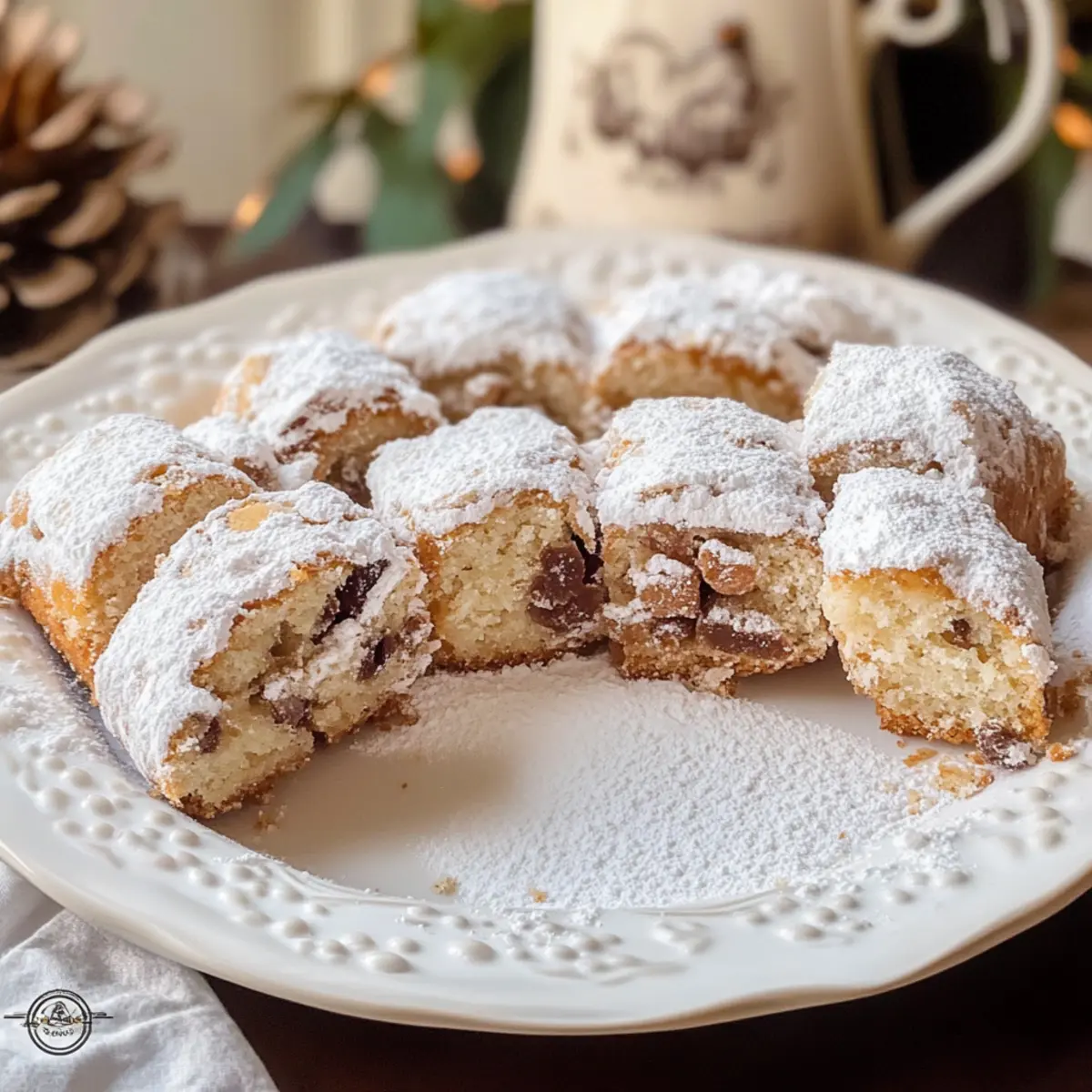 Ein besinnlicher Winterabend, der Duft von frisch gebackenem Gebäck durchzieht das ganze Haus – das Bild eines perfekten Weihnachtsfestes. Mein Rezept für saftiges Stollenkonfekt mit Marzipan bringt diese festliche Stimmung direkt in eure Küche. Diese kleinen, köstlichen Ministollen sind nicht nur himmlisch weich und feucht, sondern auch kinderleicht zubereitet, was sie zu einem idealen Leckerbissen für die Feiertage macht. Mit dem süßen Geschmack des Marzipans und der Möglichkeit, verschiedene Trockenfrüchte hinzuzufügen, verwöhne ich nicht nur mich selbst, sondern bringe auch die Familie zusammen. Ist das nicht der perfekte Grund, um gleich heute mit dem Backen zu beginnen? Warum wird dieses Stollenkonfekt geliebt? Einfachheit, die begeistert: Die Zubereitung ist unkompliziert und erfordert nur grundlegende Backkenntnisse. Verführung durch Marzipan: Der reichhaltige, süße Geschmack des Marzipans macht jeden Bissen zu einem Erlebnis. Kreative Variationsmöglichkeiten: Experimentiere mit unterschiedlichen Trockenfrüchten oder Nüssen, um deine persönliche Note einzubringen. Festliche Atmosphäre: Perfekt für die Weihnachtszeit, bringt dieses Gebäck die festliche Stimmung direkt auf den Tisch. Zeitersparnis: In nur wenigen Schritten zauberst du einen köstlichen Snack, ideal für spontane Feste oder winterliche Nachmittage. Familienliebling: Ob jung oder alt, jeder wird von diesem saftigen Stollenkonfekt begeistert sein. Bereite es vor, während du ein warmes Getränk genießt und entdecke auch andere tolle Rezepte wie unser einfaches Weihnachtsgebäck oder die besten Winterdesserts! Saftiges Stollenkonfekt Zutaten • Um sicherzustellen, dass dein saftiges Stollenkonfekt mit Marzipan perfekt gelingt, benötigst du folgende Zutaten: Für den Teig: Weizenmehl – bildet die Basis des Teigs, ein Muss für die Struktur. Zucker – sorgt für die nötige Süße, kann nach Geschmack angepasst werden. Trockenhefe – dient als Triebmittel, frische Hefe kann ebenfalls verwendet werden. Stollengewürz oder Zimt – bringt eine warme Würze ins Gebäck, individuell anpassbar. Milch – sorgt für die nötige Feuchtigkeit im Teig, für lactosefreie Variante einfach Milch ersetzen. Salz – hebt den Geschmack hervor, ist wichtig für das Bauen des Gebäckes. Butter – verleiht Reichhaltigkeit und Feuchtigkeit, sollte gut zimmerwarm sein. Für die Füllung und den Überzug: Marzipan-Rohmasse – fügt einen süßen, mandeligen Geschmack hinzu, kann auch weggelassen werden. Rosinen – sorgen für eine süße und chewy Textur; können durch getrocknete Aprikosen ersetzt werden. gehackte Mandeln – bringen eine schöne Textur, du kannst sie durch Walnüsse oder Pekannüsse ersetzen. Rum oder Saft / Amaretto – zum Einweichen der Früchte, verbessert den Geschmack; ersetzt mit Apfelsaft für eine alkoholfreie Version. Bittermandelaroma – gibt intensiven Mandelgeschmack, die Menge kann nach Geschmack reduziert werden. Für den Abschluss: Puderzucker – zum Bestäuben für zusätzliche Süße, kann auch reduziert werden. Schritt-für-Schritt-Anleitung für saftiges Stollenkonfekt mit Marzipan Step 1: Früchte einweichen Vermische in einer Schüssel die Rosinen und gehackten Mandeln mit Rum und Bittermandelaroma. Lasse die Mischung möglichst über Nacht ziehen, damit die Früchte die Aromen aufnehmen und geschmackvoll werden. Diese Vorbereitung ist entscheidend, um deinem saftigen Stollenkonfekt mit Marzipan eine reichhaltige Basis zu geben. Step 2: Marzipan vorbereiten Schneide das Marzipan in kleine Stücke und erwärme es leicht, falls erforderlich, um es geschmeidiger zu machen. Dieser Schritt erleichtert das Einarbeiten des Marzipans in den Teig und sorgt dafür, dass der süße Geschmack gleichmäßig verteilt wird. Step 3: Teig mischen In einer großen Schüssel vermischst du Weizenmehl, Zucker, Trockenhefe und Stollengewürz. Erwärme die Milch leicht, bevor du sie zusammen mit dem Salz zur weichen Butter hinzufügst, und verrühre alles gründlich, bis eine glatte Masse entsteht. Diese homogene Mischung bildet die Grundlage für dein saftiges Stollenkonfekt. Step 4: Zutaten kombinieren Füge die trockenen Zutaten zu der feuchten Mischung hinzu und rühre alles zusammen, bis sich ein klebriger Teig formt. Die Klebrigkeit ist eine gute Eigenschaft und sorgt für die feuchte Struktur des Stollenkonfekts. Integriere dann die eingeweichten Früchte gleichmäßig in den Teig. Step 5: Erster Aufgang Decke die Schüssel mit einem sauberen Küchentuch ab und lasse den Teig an einem warmen Ort für 1-2 Stunden gehen, bis er sichtbar aufgeht und an Volumen zunimmt. Achte darauf, dass der Teig nicht zu kalt ist, damit die Hefe optimal arbeiten kann. Step 6: Formen und Schneiden Heize den Ofen auf 175°C vor. Nach dem Aufgehen, forme den Teig auf einer leicht bemehlten Fläche in die gewünschte Stollenkonfekt-Form. Du kannst ihn in kleine Stücke schneiden oder ausrollen, je nach Vorliebe. Diese Schritte bringen die traditionellen Stollenformen in dein Gebäck. Step 7: Backen Lege die geformten Stücke auf ein mit Backpapier ausgelegtes Backblech. Backe die Stollenkonfekte für 12-15 Minuten, bis sie goldbraun sind. Achte darauf, dass sie eine schöne, gleichmäßige Farbe bekommen, um den perfekten Geschmack und die Textur zu erreichen. Step 8: Fertigstellen Nehme die warmen Stücke aus dem Ofen und tauche sie direkt in geschmolzene Butter. Rolle sie anschließend in Puderzucker, um eine süße, glänzende Schicht zu erhalten. Diese abschließende Berührung wird deinem saftigen Stollenkonfekt mit Marzipan eine unwiderstehliche Süße verleihen. Was passt gut zu saftigem Stollenkonfekt mit Marzipan? Ein festlicher Genuss lädt ein, das Weihnachtsessen vollständig zu gestalten und die Sinne zu erfreuen. Würziger Glühwein: Der warme, aromatische Wein ist die perfekte Ergänzung, um die süße des Stollenkonfekts auszugleichen und eine gemütliche Atmosphäre zu schaffen. Fruchtige