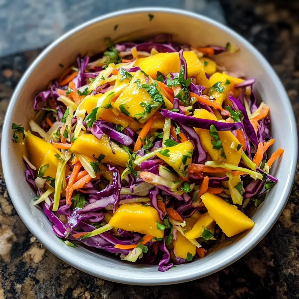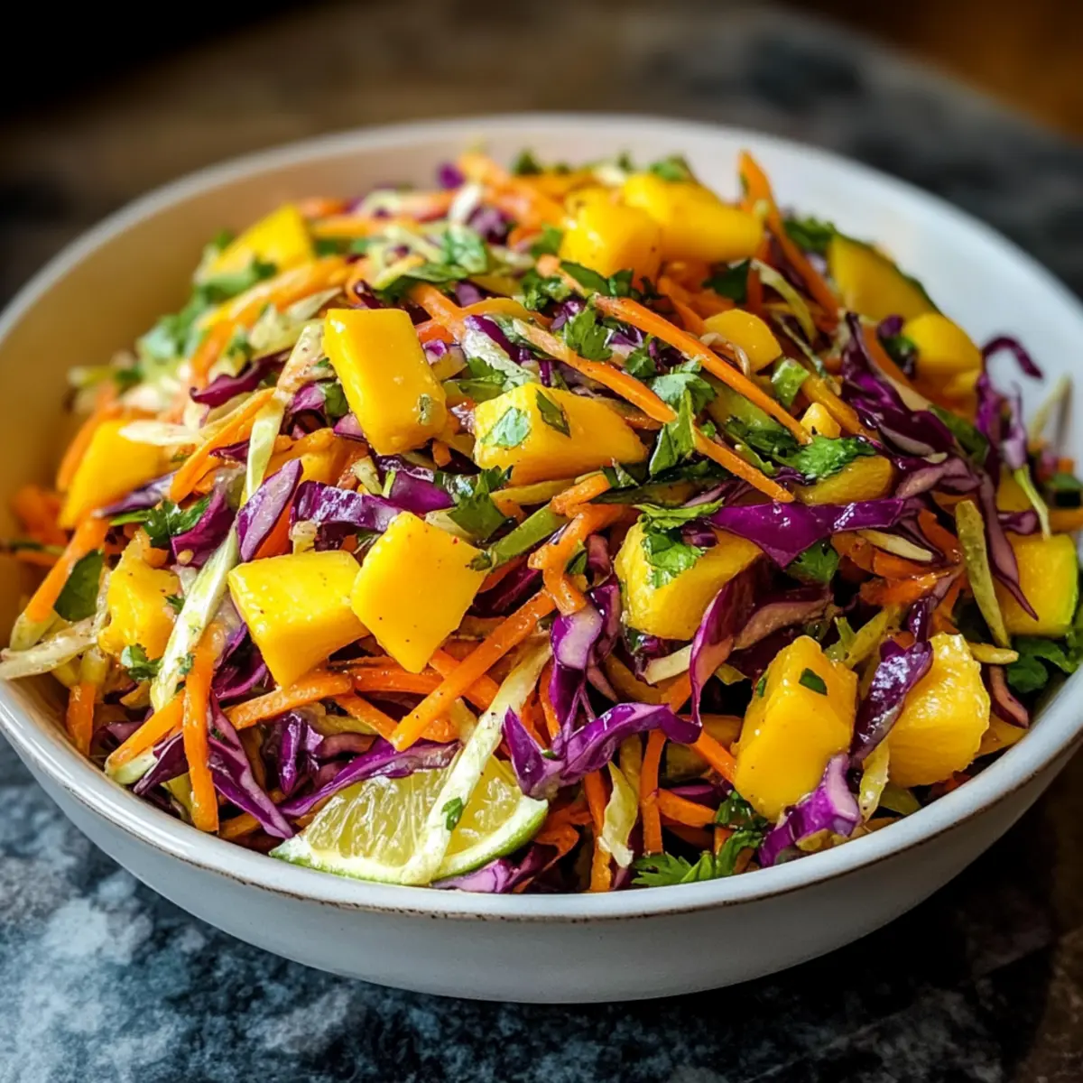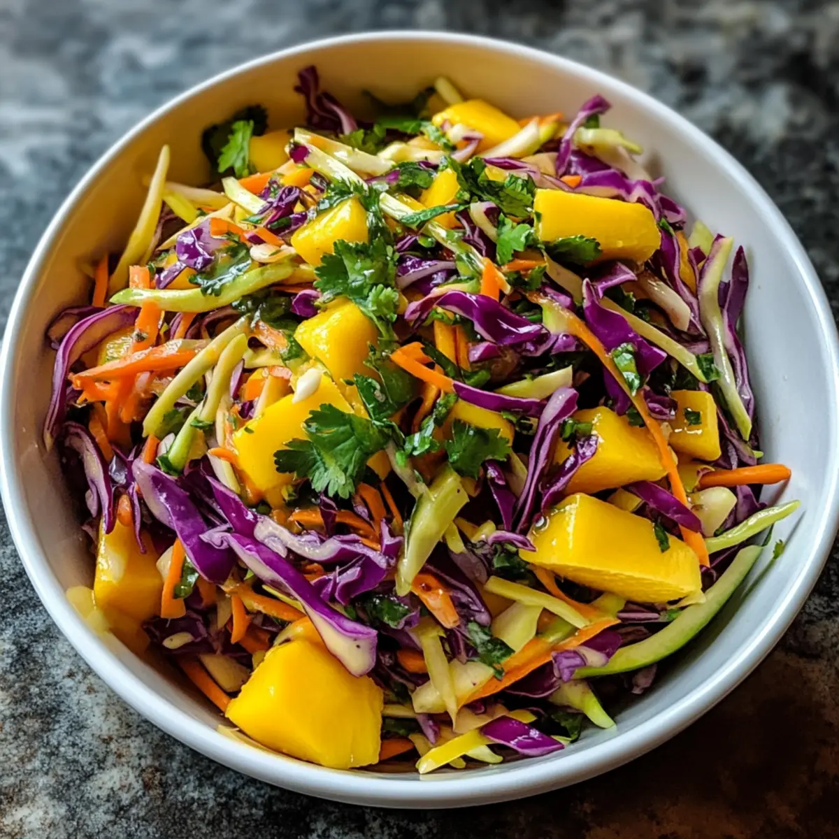 Frische Aromen: Dieser Mango-Slaw bringt die perfekte Kombination aus süßen Mango-Stücken und knackigem Gemüse auf deinen Tisch.