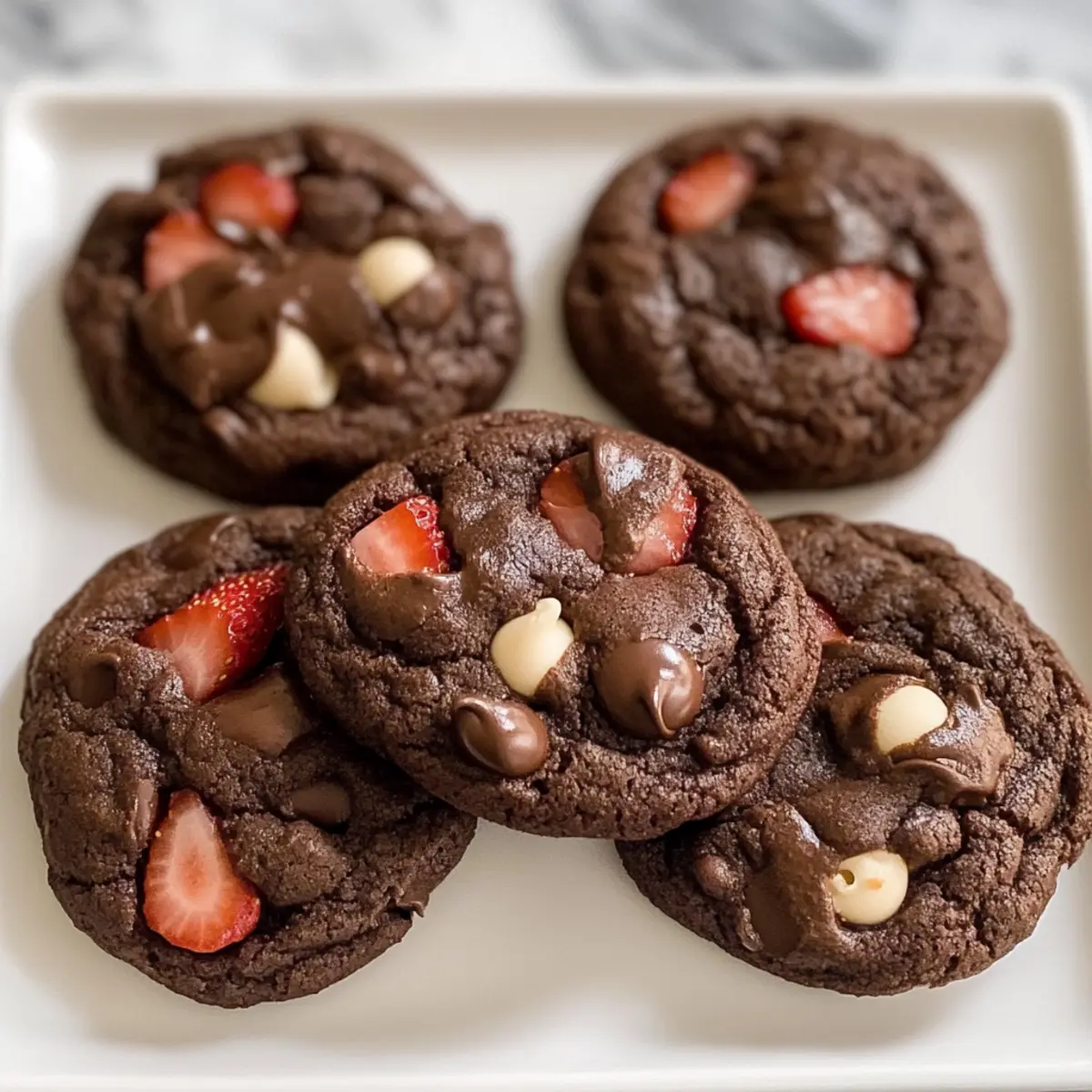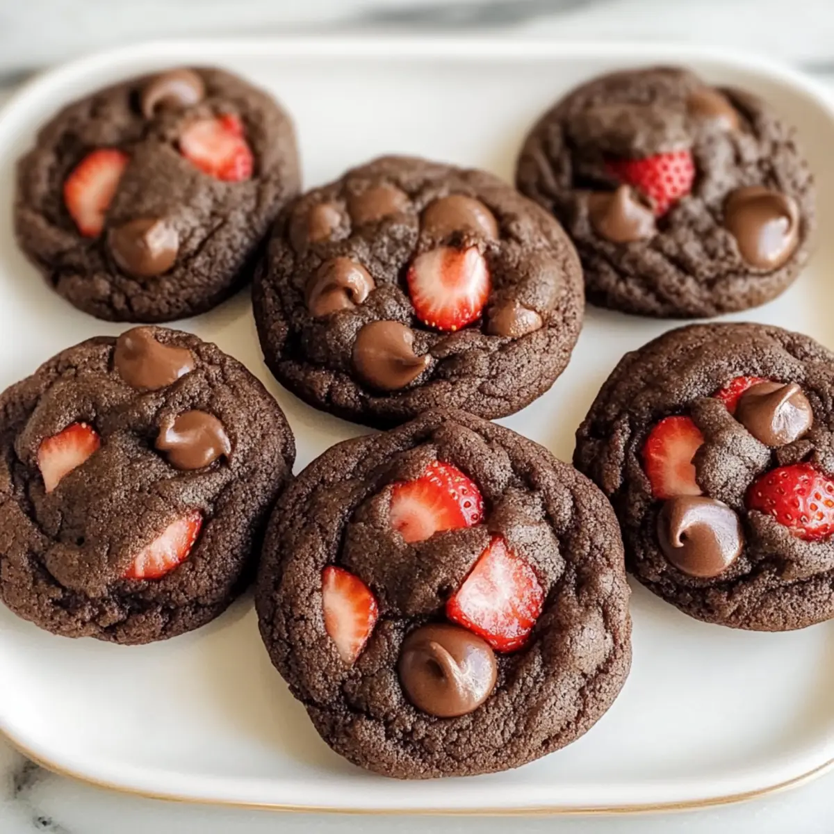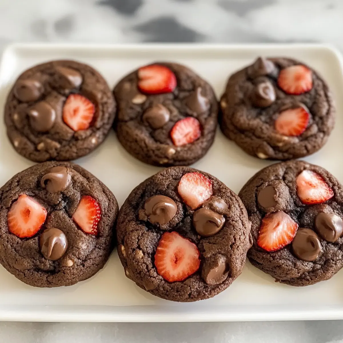 Die Kombination aus saftigen Erdbeeren und schmelzendem Schokolade in diesen Schokoladen-Erdbeer-Keksen lässt meine Geschmacksknospen aufleben! Wenn der Backofen vorheizt und sich der süße Duft in meiner Küche verbreitet, fühle ich mich wie ein Kind vor Weihnachten. Diese Kekse sind nicht nur mühelos zuzubereiten, sondern sie bieten auch eine großartige Möglichkeit, spontane Backmomente zu genießen. Mit einer wunderbar weichen Mitte und leicht knusprigen Rändern sind sie der perfekte Genuss für jeden Anlass. Und das Beste? Sie sind anpassbar – egal, ob du eine glutenfreie oder milchfreie Variante bevorzugst. Bist du bereit, deine Backgeschichte zu beginnen? Warum sind diese Kekse so besonders? Einfachheit: Die Zubereitung ist unkompliziert und benötigt keine speziellen Fähigkeiten – perfekt für jeden Hobbybäcker. Vielseitigkeit: Tausch eine Zutat aus, um die Kekse glutenfrei oder milchfrei zu machen, und passe sie deinem Geschmack an! Aromatische Freude: Das Zusammenspiel von schmelzender Schokolade und frischen Erdbeeren bringt einen köstlichen, fruchtigen Geschmack, der einfach unwiderstehlich ist. Zeitersparnis: In weniger als 30 Minuten sind die Kekse fertig – ideal für den schnellen Snack zwischendurch oder unvergessliche Zusammenkünfte. Crowd-Pleaser: Perfekt für Partys oder einfach, um die Familie zu erfreuen; jeder wird nach dem Rezept fragen! Schokoladen-Erdbeer-Keks-Zutaten • Für diese unwiderstehlichen Schokoladen-Erdbeer-Kekse brauchst du folgende Zutaten: Für den Teig Allzweckmehl – sorgt für die nötige Struktur und Weichheit der Kekse. Kakaopulver – verleiht den Keksen ein tiefes Schokoladenaroma. Backpulver – hilft dabei, die Kekse leicht und zart zu machen. Salz – harmonisiert die Süße der Kekse. Butter – sorgt für reichhaltigen Geschmack und eine klassische Keksstruktur. Substitution: Verwende pflanzliche Butter für eine milchfreie Option. Feiner Zucker – süßt und trägt zum leichten Knusprigen bei. Brauner Zucker – spendet Feuchtigkeit und sorgt für eine angenehme Kaubarkeit. Ei – bindet den Teig zusammen. Vanilleextrakt – hebt den Schokoladengeschmack hervor. Für die Früchte und Schokolade Erdbeeren – frisch oder gefriergetrocknet für süßen Fruchtgeschmack. Hinweis: Frische Erdbeeren klein schneiden und trocken tupfen, um überschüssige Feuchtigkeit zu vermeiden. Schokoladenstückchen – optional, aber sie fügen zusätzlichen Schokoladengeschmack hinzu. Diese Zutaten versprechen, dass deine Schokoladen-Erdbeer-Kekse köstlich und einzigartig werden – viel Spaß beim Backen! Schritt-für-Schritt-Anleitung für Schokoladen-Erdbeer-Kekse Step 1: Trocken Zutaten vermischen In einer großen Schüssel das Allzweckmehl, das Kakaopulver, das Backpulver und das Salz miteinander vermengen. Verwende einen Schneebesen, um sicherzustellen, dass alle trockenen Zutaten gut miteinander vermischt sind und keine Klumpen bilden. Dieser Schritt sollte etwa 2-3 Minuten in Anspruch nehmen und sorgt dafür, dass die Schokoladen-Erdbeer-Kekse gleichmäßig aufgehen. Step 2: Butter und Zucker cremig rühren In einer separaten Schüssel die weiche Butter, den feinen Zucker und den braunen Zucker mit einem Handmixer oder einem Holzlöffel gut vermengen. Rühre die Mischung für etwa 3-4 Minuten, bis sie leicht und cremig ist. Der Mix sollte heller werden und eine fluffige Konsistenz annehmen – perfekt für den nächsten Schritt! Step 3: Ei und Vanille hinzufügen Jetzt kommt das Ei und der Vanilleextrakt in die geschmeidige Butter-Zucker-Mischung. Rühre beides gründlich ein, bis die Mischung gut verbunden ist und eine glatte Textur hat. Dies sollte nur etwa 1-2 Minuten dauern. Achte darauf, dass die Masse einheitlich und ohne Klumpen ist, um die besten Schokoladen-Erdbeer-Kekse zu erreichen. Step 4: Trocken- und Nasszutaten kombinieren Langsam die zuvor gemischten trockenen Zutaten in die nassen Zutaten einarbeiten. Dabei vorsichtig mit einem Spatel oder Löffel rühren, bis ein dickes, homogènes Teig entsteht. Es ist wichtig, nicht zu lange zu mischen, damit die Kekse später nicht zu fest werden. Dies dauert etwa 2-3 Minuten, bis alle Zutaten gut miteinander verbunden sind. Step 5: Erdbeeren und Schokoladenstückchen unterheben Falls gewünscht, die kleinen, trockenen Erdbeerstücke und optional die Schokoladenstückchen vorsichtig in den Teig einarbeiten. Nutze einen Spatel und falte die Zutaten gleichmäßig ein, damit die Frucht und die Schokolade schön verteilt sind. Dies sollte sanft geschehen, um die Erdbeeren nicht zu zerdrücken – es dauert nur 1-2 Minuten. Step 6: Teig portionieren und backen Mit einem Esslöffel oder einem Eisportionierer gleichmäßige Portionen des Teigs auf ein mit Backpapier ausgelegtes Backblech setzen. Achte darauf, genügend Abstand zwischen den Portionen zu lassen, damit die Schokoladen-Erdbeer-Kekse beim Backen Platz zum Ausbreiten haben. Die Kekse für 10-12 Minuten im vorgeheizten Ofen bei 175°C backen, bis sie in der Mitte noch weich erscheinen. Step 7: Abkühlen lassen Nach dem Backen die Kekse für etwa 5 Minuten auf dem Backblech ruhen lassen. Dadurch können sie sich setzen und etwas festigen. Anschließend vorsichtig auf ein Kuchengitter transferieren, um vollständig abzukühlen. Dieses kurze Abkühlen sorgt dafür, dass die Schokoladen-Erdbeer-Kekse die perfekte Konsistenz erhalten und nicht zerfallen. Schokoladen-Erdbeer-Kekse: Vorbereitung für stressfreie Backmomente Mit etwas Planung können diese Schokoladen-Erdbeer-Kekse im Handumdrehen zum Lieblingssnack der Familie werden! Du kannst die trockenen Zutaten (Mehl, Kakaopulver, Backpulver und Salz) bis zu 24 Stunden im Voraus mischen und in einem luftdichten Behälter aufbewahren, um Zeit zu sparen – das verhindert auch Klumpenbildung. Auch die Butter und Zucker-Mischung kann vorab zubereitet und bis zu 3 Tage im Kühlschrank gelagert werden. Wenn du bereit bist zu backen, kombiniere einfach die Mischung und füge Ei