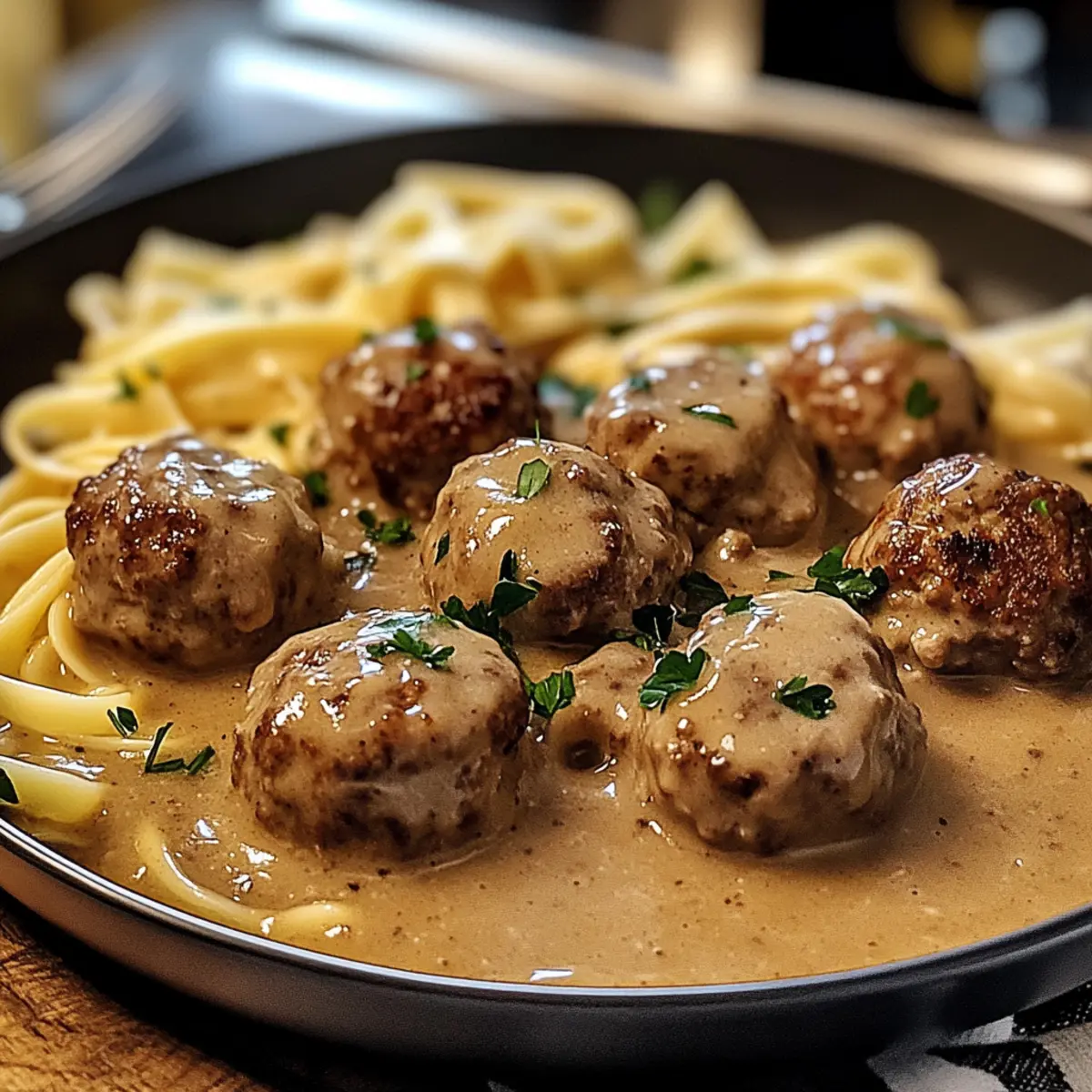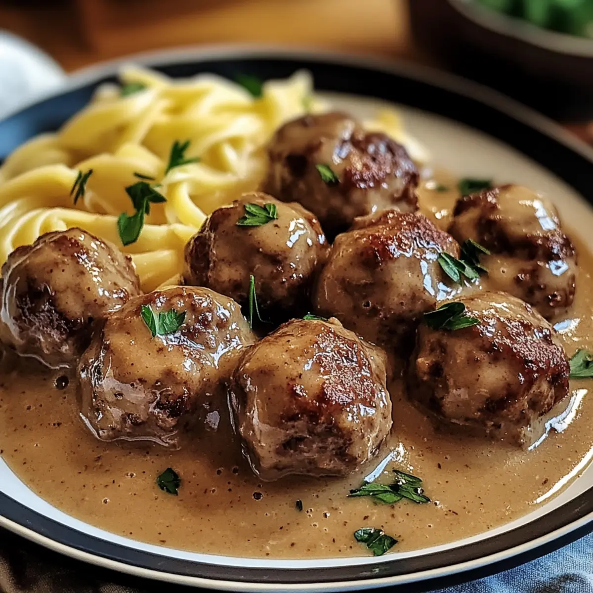 Als ich neulich in einer schwedischen kleinen Stadt spazieren ging, erinnerte mich der Duft von herzhaft zubereiteten Fleischbällchen an die gemütlichen Familienessen, die ich als Kind genossen habe. Heute möchte ich mit euch mein Rezept für Schwedische Fleischbällchen in cremiger Soße teilen – ein wahres Wohlfühlessen! Diese zarten Bällchen, umhüllt von einer reichhaltigen, cremigen Soße, sind nicht nur unglaublich lecker, sondern auch schnell zubereitet und perfekt für die gesamte Familie. Und das Beste daran? Sie sind frei von Schweinefleisch und Alkohol, sodass sie verschiedenen diätetischen Vorlieben gerecht werden. Seid ihr bereit, die Küche in ein kleines schwedisches Restaurant zu verwandeln? Lasst uns gemeinsam loslegen! Warum sind diese Fleischbällchen ein Hit? Einfachheit: Die Zubereitung ist unkompliziert und erfordert keine speziellen Kochkünste – ideal für alle, die sich nach einem gelungenen Abendessen sehnen. Vielseitigkeit: Diese Schwedischen Fleischbällchen können zu verschiedenen Beilagen serviert werden, sei es zu cremigen Kartoffeln, Reis oder sogar Nudeln. Würzige Aromen: Die Kombination aus Allgewürz und Muskatnuss verleiht diesen Bällchen eine wohlig-warme Note, die jeden Bissen unvergesslich macht. Zeitersparnis: In kürzester Zeit zauberst du ein herzhaftes Gericht, das selbst bei den wählerischsten Essern punkten kann. Wenn du auf der Suche nach weiteren Rezepten für Familienabende bist, schau dir auch unsere Familienfreundlichen Kochideen an! Geselligkeit: Perfekt für gemütliche Abende mit Freunden oder der Familie – jeder wird diese Leckerbissen lieben! Zutaten für Schwedische Fleischbällchen • Für die Fleischmasse Mageres Rinderhackfleisch – sorgt für eine feste Struktur und würzigen Geschmack; ideal für die Zubereitung unserer Schwedischen Fleischbällchen. Kalbs- oder Truthahnhackfleisch – verleiht Zartheit und authentisches Aroma; du kannst auch vollständig Rind oder Truthahn verwenden, wenn gewünscht. Allgewürz – bringt eine warm-aromatische Note; kann durch eine Mischung aus Zimt und Muskat ersetzt werden, um einen ähnlichen Geschmack zu erzielen. Muskatnuss – verstärkt den herzhaften Charakter der Fleischbällchen; verwende sie sparsam, da der Geschmack intensiv ist. Semmelbrösel – dient als Bindemittel; als glutenfreie Option kann auch auf zerbröselte Cracker zurückgegriffen werden. Zwiebel – sorgt für süßliche Tiefe; kann durch Schalotten ersetzt werden, wenn ein milderer Geschmack gewünscht ist. • Für die Sauce Schlagsahne – ist entscheidend für die cremige Konsistenz der Sauce; kann auch durch die Hälfte Sahne, Hälfte Milch ersetzt werden, um die Sauce leichter zu machen. Rinderbrühe – bildet die Basis der Sauce; für ein intensiveres Aroma verwende gegebenenfalls selbstgemachte Brühe. Schritt-für-Schritt-Anleitung für Schwedische Fleischbällchen in cremiger Sauce Schritt 1: Fleischmasse vorbereiten In einer großen Schüssel das mageres Rinderhackfleisch, Kalbs- oder Truthahnhackfleisch, Semmelbrösel, fein gehackte Zwiebel, Allgewürz, Muskatnuss sowie eine Prise Salz und Pfeffer kombinieren. Achte darauf, die Mischung nur so lange zu vermengen, bis alles gut verbunden ist, denn Übermischen kann die Fleischbällchen zäh machen. Schritt 2: Fleischbällchen formen Nehme eine kleine Menge der Fleischmasse und forme sie mit den Händen zu gleichmäßigen, etwa 2,5 cm großen Bällchen. Achte darauf, dass die Bällchen gut geformt sind, damit sie gleichmäßig garen. Lege die geformten Bällchen auf einen Teller, während du die restlichen Bällchen zubereitest. Schritt 3: Fleischbällchen anbraten Erhitze eine große Pfanne bei mittlerer Hitze und füge einen Esslöffel Öl hinzu. Brate die Fleischbällchen in der heißen Pfanne für etwa 6-8 Minuten unter gelegentlichem Wenden an, bis sie von allen Seiten schön gebräunt sind. Nimm die gebräunten Fleischbällchen aus der Pfanne und stelle sie kurz beiseite. Schritt 4: Sauce zubereiten In der gleichen Pfanne, in der du die Fleischbällchen gebraten hast, gieße die Rinderbrühe und die Schlagsahne hinzu. Kratze mit einem Holzlöffel die goldbraunen Stückchen vom Boden der Pfanne, um zusätzlichen Geschmack zu erhalten. Bringe die Mischung zum Simmern und lasse sie für etwa 2-3 Minuten kochen, bis sie leicht eingedickt ist. Schritt 5: Fleischbällchen kombinieren Gebe die gebräunten Schwedischen Fleischbällchen wieder in die Pfanne und reduziere die Hitze auf niedrig. Decke die Pfanne ab und lasse die Fleischbällchen in der Sauce für etwa 10-15 Minuten sanft köcheln, bis sie durchgegart und zart sind. Die Sauce sollte cremig und aromatisch sein. Schritt 6: Servieren Nimm die Pfanne vom Herd und serviere die Schwedischen Fleischbällchen über cremigen Kartoffelpüree, Nudeln oder Reis. Du kannst das Gericht nach Belieben mit frischer Petersilie garnieren, um einen Farbtupfer hinzuzufügen. Genieße dein köstliches, hausgemachtes Essen! Was passt zu Schwedischen Fleischbällchen? Entdecken Sie die perfekten Beilagen, die Ihre Schwedischen Fleischbällchen in cremiger Sauce zu einem unvergesslichen Festmahl machen werden! Cremiges Kartoffelpüree: Die samtige Textur ergänzt die zarten Bällchen und nimmt die köstliche Sauce wunderbar auf. Ein Klassiker, der immer Freude bereitet! Einfache Eiernudeln: Diese zarten Nudeln harmonieren wunderbar mit der cremigen Soße, und die Kombination ist einfach unwiderstehlich. Außerdem sind sie schnell zubereitet! Jasminreis: Der duftende Reis bietet einen leckeren Kontrast zu den herzhaften Fleischbällchen und nimmt die Aromen der Sauce auf. Eine erfrischende Wahl für ein leichtes Essen. Gebackenes Gemüse: Geröstete Karotten und Brokkoli bringen frische und Knackigkeit ins Spiel. Sie sorgen für Farbvielfalt auf dem Teller und einen vitaminreichen Genuss! Grüner Salat: Ein knuspriger Salat mit einem leichten Dressing lässt das Gericht leichter erscheinen und sorgt für