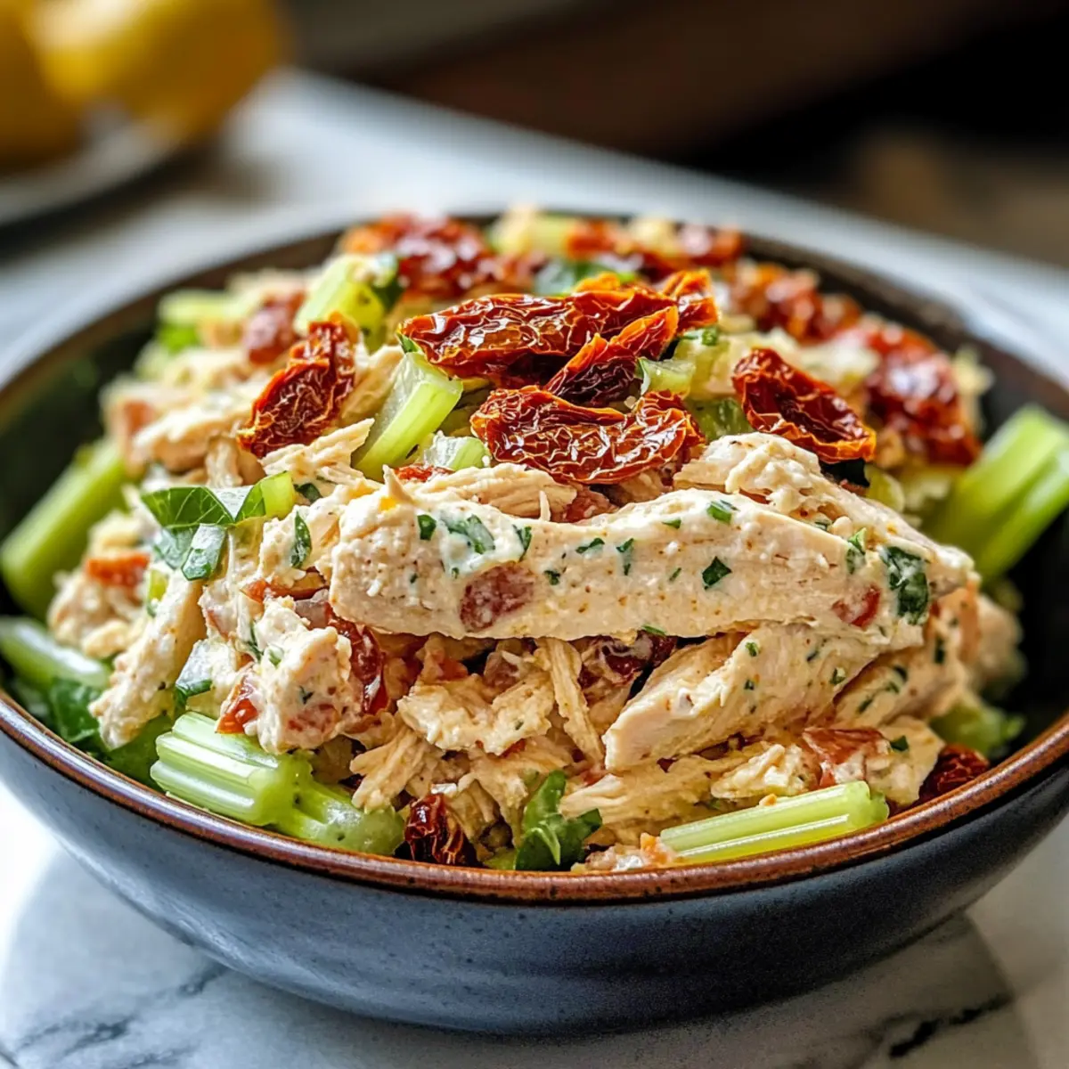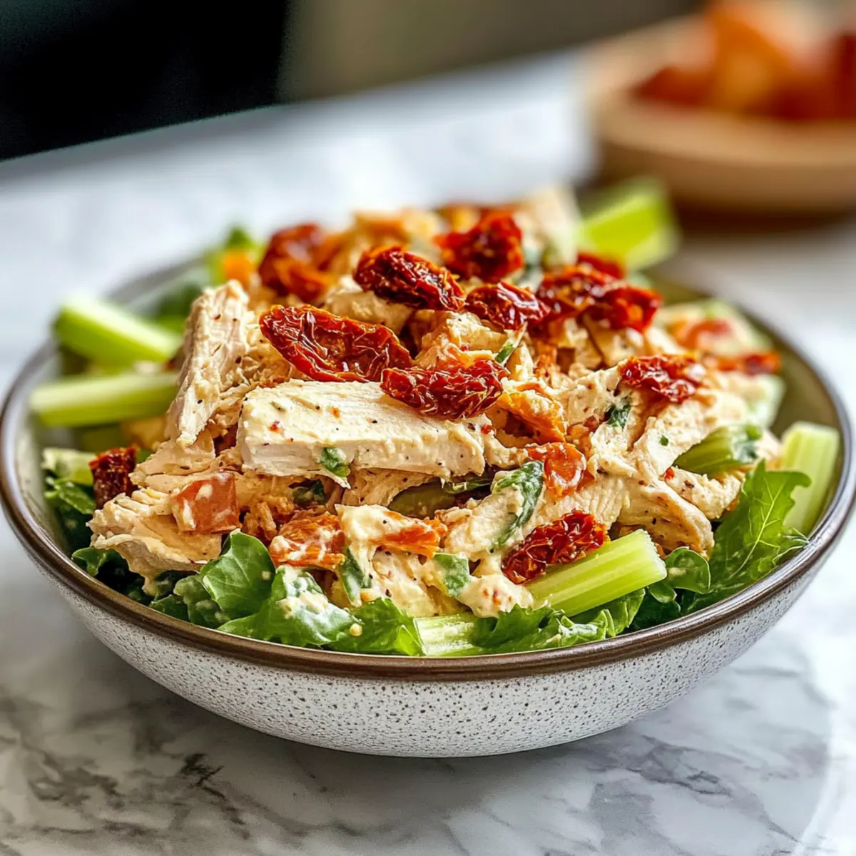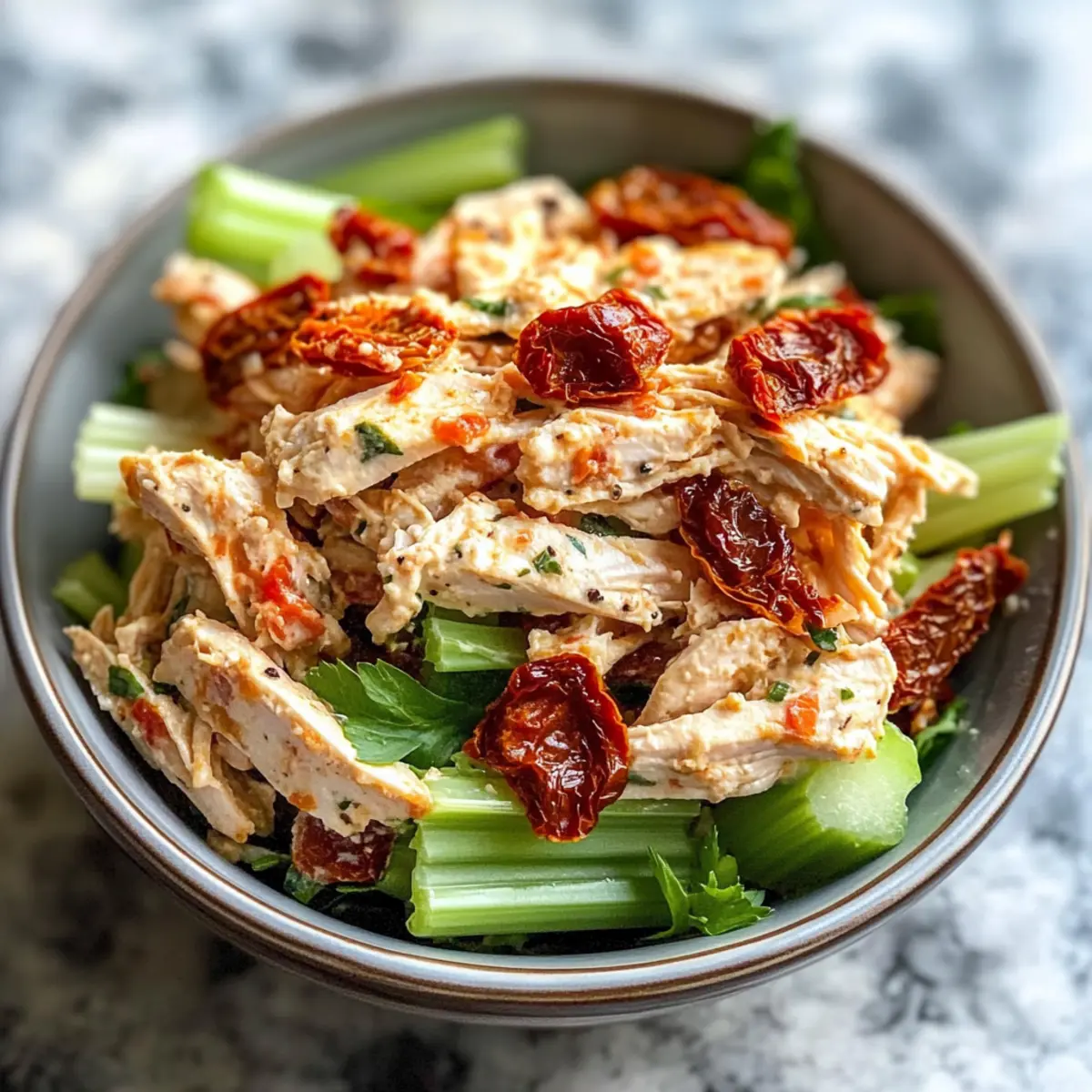 Ein leichter Wind bringt den verführerischen Duft von frischen Kräutern und sonnengereiften Tomaten mit sich, während ich in meiner Küche stehe und an einem köstlichen Sonnentrockene Tomaten Hähnchensalat Rezept arbeite. Diese Kombination aus zartem Hähnchen, aromatischen sonnentrockenen Tomaten und frischem Rucola verwandelt ein schnelles Mittagessen in ein wahres Geschmackserlebnis. Mit einer cremigen Feta- und Olivenöl-Dressing ist dieser Salat nicht nur ein Genuss für den Gaumen, sondern auch gesund und low-fat – perfekt für alle, die sich schnell etwas Leckeres zubereiten möchten. Ob für ein unkompliziertes Abendessen mit Freunden oder eine gesunde Lunchbox, dieser Salat wird sicherlich zum Star jeder Mahlzeit. Welche überraschenden Aromen werden Sie entdecken, wenn Sie diese Variante ausprobieren? Warum ist dieser Salat so besonders? Einfachheit: Die Zubereitung ist unglaublich mühelos und erfordert nur wenig Zeit, perfekt für hektische Tage. Frische Aromen: Die Kombination aus Rucola, sonnentrockenen Tomaten und Feta sorgt für ein geschmackliches Erlebnis, das sofort begeistert. Gesundheitsbewusst: Dieses Rezept ist gesund und kalorienarm und bietet eine tolle Option für kalorienbewusste Genießer. Vielseitigkeit: Ideal als leichtes Mittagessen oder als Beilage bei geselligen Anlässen. Es schmeckt auch hervorragend in einer gesund gefüllten Lunchbox. Ein Genuss: Benutzen Sie frische Zutaten für den besten Geschmack und beeindruckende Präsentation – perfekt für jedes Dinner, bei dem Sie Ihre Gäste beeindrucken wollen! Sonnentrockene Tomaten Hähnchensalat Zutaten • Diese köstlichen Zutaten sorgen für ein Geschmackserlebnis! Für den Salat Hähnchenbrust – liefert zarte Proteinbasis; kann auch vorgekocht oder geröstet verwendet werden. Sonnentrockene Tomaten – bringen eine tangige und süße Note; unverzichtbar für das Rezept. Rucola – sorgt für einen frischen und pfeffrigen Geschmack; kann alternativ durch Spinat ersetzt werden. Fetakäse – fügt cremosen, salzigen Geschmack hinzu; geschmacklich bereichernd und sehr aromatisch. Für das Dressing Olivenöl – bringt gesunde Fette mit und verstärkt die Aromen der anderen Zutaten. Balsamico-Essig – sorgt für eine angenehme Säure; frischer Essig ist ideal, kann aber auch durch Apfelessig ersetzt werden. Salz und Pfeffer – unverzichtbare Gewürze, um den Geschmack zu intensivieren; verwenden Sie frisch gemahlenen Pfeffer für ein besseres Aroma. Mit diesen Zutaten kreieren Sie nicht nur ein schnelles, sondern auch ein gesundes und köstliches sonnentrockene Tomaten Hähnchensalat Rezept! Schritt-für-Schritt Anleitung für Sonnentrockene Tomaten Hähnchensalat Rezept Schritt 1: Hähnchenbrust kochen Bringen Sie einen großen Topf mit Wasser zum Kochen und fügen Sie die Hähnchenbrust hinzu. Lassen Sie das Hähnchen 15–20 Minuten kochen, bis es vollständig durchgegart ist und eine Innentemperatur von 75°C erreicht ist. Nehmen Sie das Hähnchen anschließend aus dem Wasser, lassen Sie es etwas abkühlen und schneiden Sie es dann in kleine Stücke. Schritt 2: Sonnentrockene Tomaten hacken Nehmen Sie die sonnentrockenen Tomaten aus der Verpackung und schneiden Sie sie in kleine Stücke. Wenn sie in Öl eingelegt sind, lassen Sie sie zuerst abtropfen, um überschüssige Flüssigkeit zu vermeiden. Diese aromatischen Tomaten werden dem Sonnentrockene Tomaten Hähnchensalat Rezept eine köstliche, fruchtige Note verleihen. Schritt 3: Rucola waschen Waschen Sie den Rucola gründlich unter kaltem Wasser, um Schmutz und Rückstände zu entfernen. Lassen Sie ihn in einem Sieb oder auf einem Küchentuch gut abtropfen. Der frisch gewaschene Rucola bringt nicht nur eine schöne Farbe, sondern auch einen pfeffrigen Geschmack, der perfekt zu den anderen Zutaten des Salats passt. Schritt 4: Zutaten vermengen In einer großen Schüssel fügen Sie die vorbereiteten Hähnchenstücke, die gehackten sonnentrockenen Tomaten, den abgetropften Rucola und den zerbröckelten Fetakäse zusammen. Mischen Sie alles behutsam mit einem großen Löffel oder einer Zange, um eine gleichmäßige Verteilung der Aromen im Sonnentrockene Tomaten Hähnchensalat Rezept zu gewährleisten. Schritt 5: Dressing zubereiten In einer separaten Schüssel kombinieren Sie das Olivenöl und den Balsamico-Essig. Fügen Sie etwas Salz und frisch gemahlenen Pfeffer hinzu und verrühren Sie alles gut. Die Mischung sollte gut emulgieren, sodass das Dressing eine cremige Konsistenz hat. Dies wird das Geschmacksprofil des Salats wunderbar abrunden. Schritt 6: Salat anrichten und servieren Gießen Sie das Dressing gleichmäßig über den fertigen Salat und mischen Sie alles nochmals sanft, bis alle Zutaten gleichmäßig bedeckt sind. Servieren Sie den sonnentrockene Tomaten Hähnchensalat sofort auf großen Tellern oder in Schüsseln. Er eignet sich hervorragend als leichtes Hauptgericht oder als Beilage und bringt frische Aromen auf den Tisch. Expertentipps für das Sonnentrockene Tomaten Hähnchensalat Rezept Hähnchen richtig garen: Achten Sie darauf, die Hähnchenbrust gut durchzukochen, um zarte und saftige Stücke zu erhalten, die perfekt für den Salat sind. Tomaten vorbereiten: Verwenden Sie nach Möglichkeit sonnentrocknete Tomaten in Öl – das verleiht dem Rezept zusätzlichen Geschmack. Lassen Sie sie jedoch gut abtropfen, um die Konsistenz nicht zu beeinträchtigen. Frische Zutaten nutzen: Je frischer die Zutaten, desto besser der Geschmack! Verwenden Sie frischen Rucola und Feta für ein intensives Geschmackserlebnis im Sonnentrockene Tomaten Hähnchensalat Rezept. Dressings gut vermengen: Emulgieren Sie das Dressing gründlich, um die Aromen gleichmäßig zu verteilen. Ein gut gemischtes Dressing macht den Salat besonders schmackhaft. Kühlen für die Aromen: Lassen Sie den Salat etwa 15 Minuten im Kühlschrank ziehen, damit die Aromen sich gut verbinden können, bevor Sie ihn servieren. Was passt gut zu Sonnentrockene Tomaten