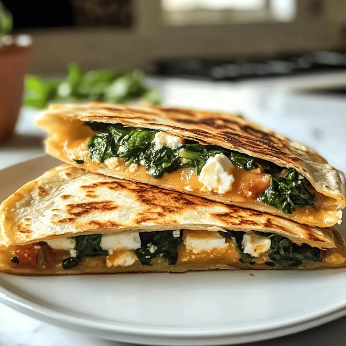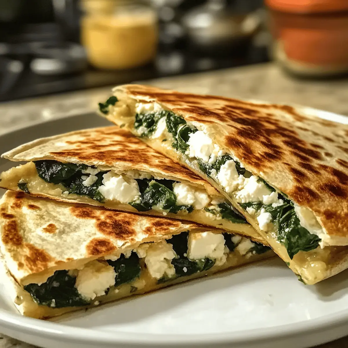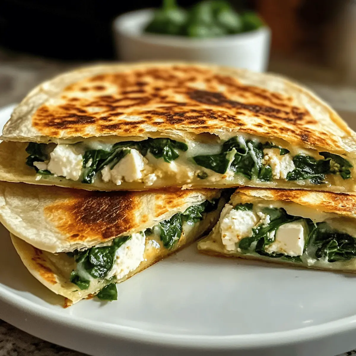 „Ich kann es kaum glauben, aber es sind nur 15 Minuten, die zwischen mir und diesen köstlichen Spinat-Feta-Quesadillas stehen! Die Kombination aus knusprigen Tortillas, cremigem Feta und frischem Spinat nimmt mich mit auf eine kleine kulinarische Reise ins mediterrane Herz. Diese Quesadillas sind nicht nur blitzschnell zubereitet, sondern auch eine gesunde Option für ein schnelles Mittagessen oder einen leichten Abendessen. Sie sind somit perfekt für all jene unter uns, die frische Aromen und gesunde Zutaten lieben. Neugierig auf die vielen Möglichkeiten, diese leckeren Quesadillas zu variieren? Lass uns gemeinsam in das Rezept eintauchen!“ Warum sind diese Quesadillas so besonders? Schnelle Zubereitung: In nur 15 Minuten kannst du diese köstlichen Spinat-Feta-Quesadillas genießen – ideal für stressige Tage! Gesunde Zutaten: Mit frischem Spinat und cremigem Feta sind sie nicht nur lecker, sondern auch reich an Nährstoffen. Vielseitigkeit: Du kannst sie ganz nach deinem Geschmack anpassen, sei es mit zusätzlichen Gemüsesorten oder Proteinen! Perfekte Konsistenz: Die Kombination aus knuspriger Tortilla und gooey Füllung sorgt für ein wahres Geschmackserlebnis. Kulturelle Kreativität: Diese Quesadillas vereinen mexikanische Tradition mit mediterranen Aromen und bereichern so dein kulinarisches Repertoire. Beliebte Begleiter: Serviere sie mit einem frischen griechischen Salat oder köstlichem Tzatziki für ein rundum gelungenes Essen! Spinat-Feta-Quesadilla-Zutaten • Für die Tortillas Tortillas – Sie sind die Grundlage der Quesadillas und sorgen für eine knusprige Außenlage. Alternativ kannst du auch Vollkorn- oder glutenfreie Varianten verwenden. • Für die Füllung Feta-Käse – Cremig und salzig, verleiht er den Quesadillas den mediterranen Geschmack und enthält viel Kalzium und Protein. Du kannst auch Ziegenkäse oder Mozzarella für einen milderen Geschmack verwenden. Frischer Spinat – Er bringt Farbe und essentielle Nährstoffe wie Eisen und Vitamin K. Gefrorenen Spinat kannst du ebenfalls verwenden, achte jedoch darauf, ihn gut abzutropfen. • Für das Braten Olivenöl oder Butter – Es verleiht der Quesadilla eine goldene, knusprige Textur. Für eine gesündere Option kannst du eine beschichtete Pfanne mit minimalem Öl verwenden. • Optionale Zutaten Getrocknete Tomaten – Sie bringen eine süße Note in die Füllung. Schwarze Oliven – Fügen Tiefe und Geschmack hinzu. Vorgegartes Hähnchen – Ideal für zusätzlichen Protein-Gehalt. Karamellisierte Zwiebeln – Verstärken die Süße der Quesadillas.* Jede Zutat spielt eine entscheidende Rolle in deinem kulinarischen Erlebnis, und mit diesen Spinat-Feta-Quesadillas kannst du dir sicher sein, dass du ein schnelles, gesundes und köstliches Gericht zauberst! Schritt-für-Schritt-Anleitung für Spinat-Feta-Quesadillas Step 1: Spinat vorbereiten Wasche den frischen Spinat gründlich, um Schmutz zu entfernen, und trockne ihn anschließend gut ab. Schneide den Spinat grob, damit er gleichmäßig in den Quesadillas verteilt werden kann. Zerbrösele den Feta-Käse in kleine Stücke, sodass er später gut mit dem Spinat harmoniert. Step 2: Tortilla belegen Lege eine Tortilla flach auf eine saubere Arbeitsfläche oder ein Schneidebrett. Verteile die vorbereiteten Spinatstücke und die zerbröselte Feta-Käse-Mischung gleichmäßig auf einer Hälfte der Tortilla. Wenn du optionale Zutaten wie getrocknete Tomaten oder Oliven verwenden möchtest, füge sie jetzt hinzu, um zusätzliche Aromen zu erzeugen. Step 3: Tortilla falten Falte die Tortilla in der Mitte über die Füllung, sodass eine halbe Mondform entsteht. Drücke die Ränder leicht zusammen, um sicherzustellen, dass die Füllung beim Braten nicht herausfällt. Dies hilft auch, die Quesadilla während des Kochens zusammenzuhalten. Step 4: Quesadilla braten Erhitze eine beschichtete Pfanne bei mittlerer Hitze und füge einen Esslöffel Olivenöl oder Butter hinzu. Wenn das Öl heiß ist oder die Butter geschmolzen und schäumend ist, lege die gefaltete Tortilla vorsichtig in die Pfanne. Brate die Quesadilla 2-3 Minuten, bis sie goldbraun und knusprig ist. Step 5: Wenden und fertigstellen Wenn die Unterseite der Quesadilla schön goldbraun ist, verwende einen Spatel, um sie vorsichtig umzudrehen und die andere Seite ebenfalls 2-3 Minuten zu braten. Achte darauf, die Quesadilla nicht zu überhitzen, damit sie gleichmäßig garen kann, bis der Käse geschmolzen ist. Step 6: Servieren Nimm die Quesadilla aus der Pfanne und lasse sie kurz abkühlen. Schneide sie dann mit einem scharfen Messer in gleichmäßige Dreiecke. Serviere die warmen Spinat-Feta-Quesadillas sofort, idealerweise mit einem Dip wie Tzatziki oder einer frischen Beilage wie einem griechischen Salat. Vorbereiten der Spinat-Feta-Quesadillas für stressfreie Abende Die Spinat-Feta-Quesadillas sind ideal für die Vorbereitung, sodass du sie bei Bedarf ruckzuck zubereiten kannst! Du kannst den frischen Spinat im Voraus bis zu 3 Tage in einem luftdichten Behälter im Kühlschrank aufbewahren, und den Feta-Käse zerbröseln – so sparst du wertvolle Zeit beim Kochen. Zusätzlich lässt sich die gefüllte Tortilla bis zu 24 Stunden im Voraus zusammenstellen und in Frischhaltefolie wickeln. Achte darauf, die Quesadillas in einer vorgeheizten Pfanne nicht zu überhitzen, um die Knusprigkeit zu bewahren. Wenn du dann bereit bist, sie zu servieren, brauchst du nur noch 2-3 Minuten pro Seite zum Braten. Mit diesen Vorbereitungen hast du einfach und schnell köstliche Spinat-Feta-Quesadillas, ideal für hektische Abende! Aufbewahrungstipps für Spinat-Feta-Quesadillas Zimmertemperatur: Halte die Quesadillas nicht länger als 2 Stunden bei Raumtemperatur, um das Risiko eines Bakterienwachstums zu vermeiden. Kühlschrank: Bewahre übrig gebliebene Spinat-Feta-Quesadillas in einem luftdichten Behälter im Kühlschrank für bis zu 3 Tage auf. Gefrierer: Friere die Quesadillas in einer luftdichten Verpa