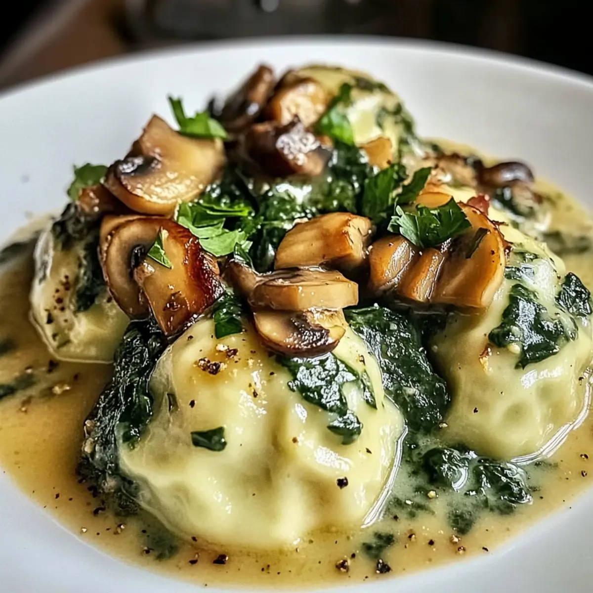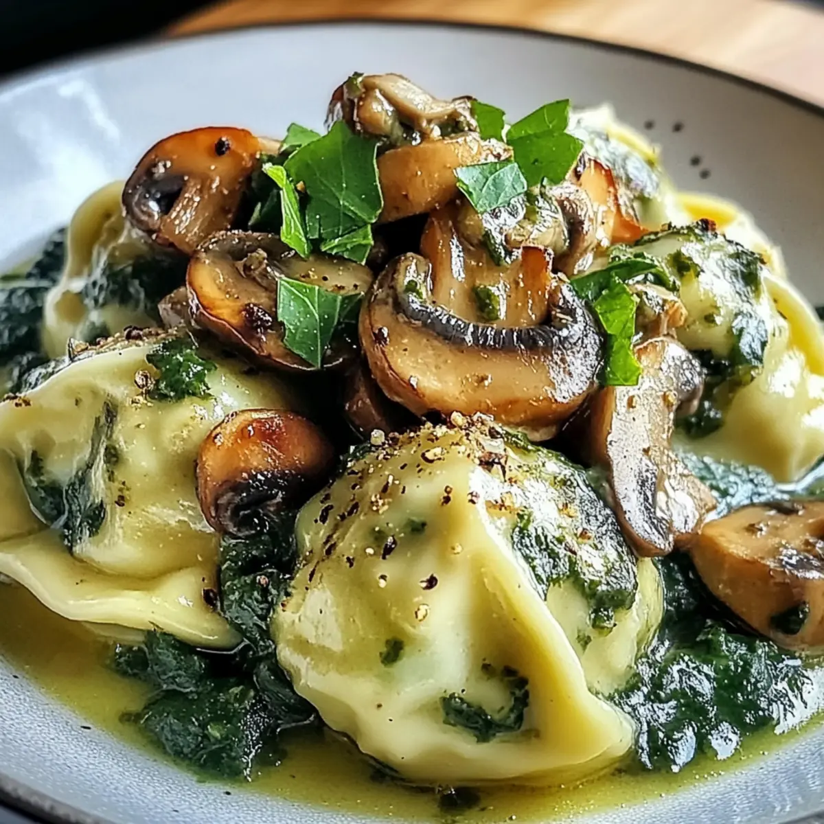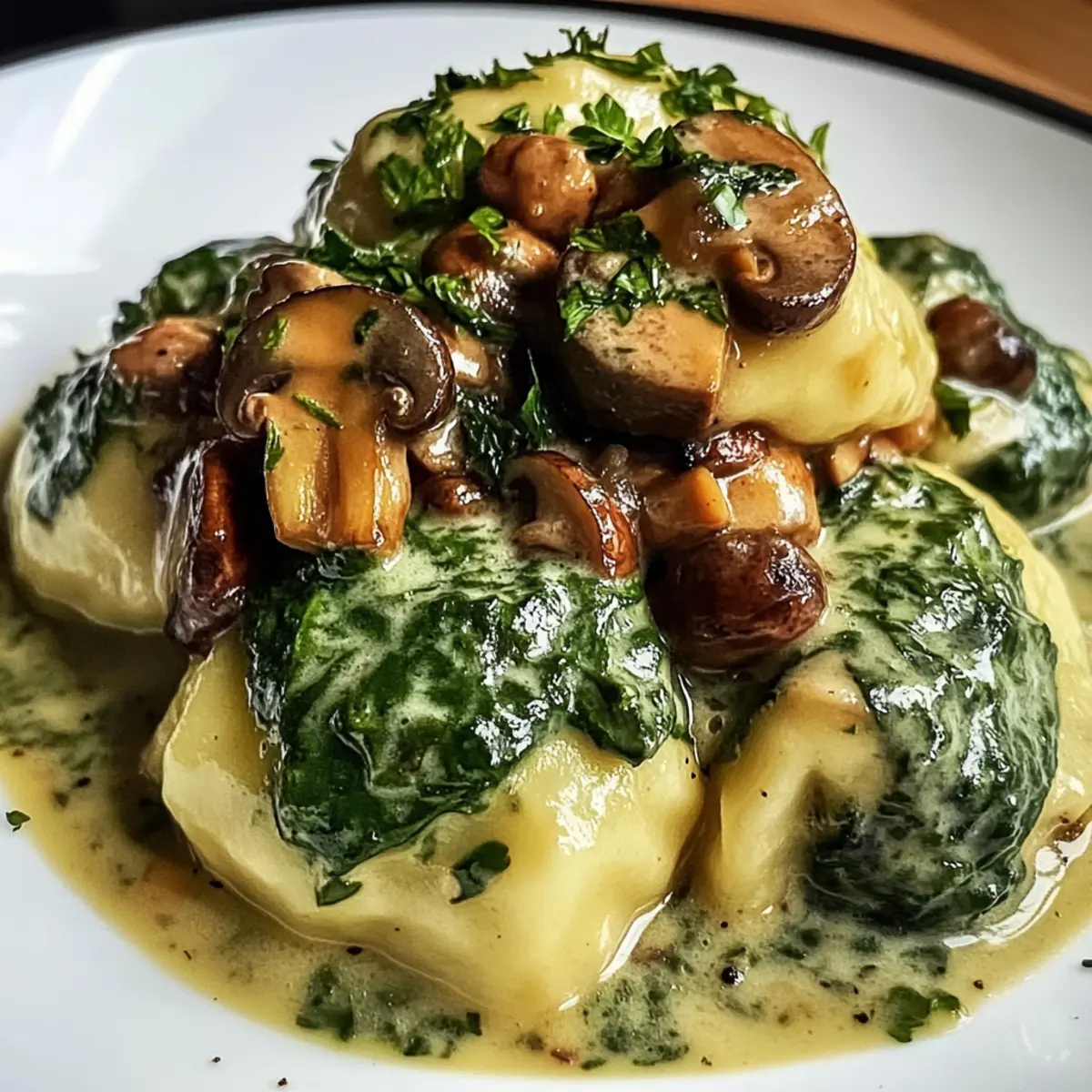 „Hast du schon einmal den feinen Duft von frisch zubereiteten Spinatknödeln wahrgenommen, der dich in die Küchen der traditionellen deutschen Gastfreundschaft entführt?“ Wenn ich diesen köstlichen Geruch spüre, fühle ich mich sofort wie zu Hause. Heute lade ich dich ein, in die Welt der Spinatknödel mit Pilzragout einzutauchen – einem vegetarischen Gericht, das sowohl tröstlich als auch herzhaft ist. Die luftigen Knödel sind nicht nur schnell zubereitet, sondern auch ein perfektes Gericht für gesellige Abende mit Familie und Freunden. Diese Kombination aus zarten Dumplings und cremigem Pilzragout bringt nicht nur Vielfalt auf den Teller, sondern auch Freude in jede Mahlzeit. Bist du bereit, deine Kochkünste auf die nächste Stufe zu heben und alle an deinem Tisch zu begeistern? Warum sind Spinatknödel so besonders? Herzhaft und nahrhaft: Die Spinatknödel bieten eine wunderbare Balance aus Geschmack und Textur. Ergänzt durch ein cremiges Pilzragout, wird jede Portion zu einem Festmahl. Einfach zuzubereiten: Selbst Kochanfänger können mit diesem Rezept glänzen – es sind keine besonderen Fertigkeiten nötig. Vielseitig: Ob als Hauptgericht oder Beilage, dieses Gericht passt zu jeder Gelegenheit und verleiht jedem Essen einen besonderen Touch. Tradition trifft Moderne: Diese klassischen Knödel bringen den Geschmack der deutschen Küche auf deinen Tisch, ideal für gesellige Abende mit Freunden. Gesund und vegetarisch: Perfekt für alle, die auf der Suche nach gesunden, fleischfreien Rezepten sind, wie vegetarische Rezepte oder Gemüsegerichte für die ganze Familie. Zutaten für Spinatknödel mit Pilzragout • Die Zubereitung dieser köstlichen Spinatknödel mit Pilzragout wird dein Herz erwärmen und deinen Gaumen erfreuen. Für die Knödel Frischer Spinat – bringt Farbe und Geschmack in die Knödel; kann durch tiefgefrorenen Spinat ersetzt werden (aufgetaut und gut abgetropft). Altes Weißbrot – sorgt für die nötige Textur; verwende jede Art von Brot, solange es alt ist. Zwiebel – bietet eine süße Note; kann durch Schalotten für einen milderen Geschmack ersetzt werden. Olivenöl – zum Sautieren, verstärkt das Aroma; kann auch durch Butter oder anderes Öl ersetzt werden. Eier – binden die Knödelmasse; keine direkte Substitution für dieses wichtige Element. Parmesan – bereichert den Geschmack; kann durch Pecorino oder Hefeflocken für eine vegane Variante ersetzt werden. Weizenmehl – sorgt für Stabilität; Vollkornmehl ist eine gesunde Alternative. Muskatnuss – fügt Wärme und Aroma hinzu; eine Prise Zimt kann ebenfalls verwendet werden. Salz – verstärkt alle Aromen. Schwarzer Pfeffer – gibt Würze und leichte Schärfe; frisch gemahlen ist am besten. Für das Pilzragout Champignons – Hauptzutat des Ragouts, sorgt für eine herzhafte Textur; gemischte Pilze bringen zusätzlichen Geschmack. Gemüsebrühe – Basis für das Ragout; verwendet anstelle von Fleischbrühe in der vegetarischen Variante. Knoblauch – verleiht dem Ragout Geschmack; kann im Notfall durch Knoblauchpulver ersetzt werden. Sahne – sorgt für die Cremigkeit des Ragouts; kann durch Kokoscreme für eine milchfreie Option ersetzt werden. Thymian – frische oder getrocknete Kräuter, die das Geschmackserlebnis intensivieren; Italienische Kräutermischung ist auch möglich. Entdeck deine Kochleidenschaft mit diesem herzhaften Rezept! Schritt-für-Schritt-Anleitung für Spinatknödel mit Pilzragout Step 1: Spinat vorbereiten Erhitze einen Topf bei mittlerer Hitze und füge einen Spritzer Wasser hinzu. Gib den frischen Spinat hinein und lasse ihn für etwa 3-4 Minuten dünsten, bis er verwelkt ist. Anschließend den Spinat abgießen, gut ausdrücken und leicht hacken, um die Zubereitung der Spinatknödel einzuleiten. Step 2: Brot einweichen Schneide das alte Weißbrot in kleine Stücke und lege es in eine Schüssel. Bedecke die Brotwürfel mit Wasser und lasse sie etwa 10 Minuten einweichen, bis sie weich sind. Drücke das Brot anschließend gut aus, um überschüssige Flüssigkeit zu entfernen, damit die Knödel die perfekte Konsistenz haben. Step 3: Zwiebeln anbraten Erhitze in einer Pfanne 2 Esslöffel Olivenöl bei mittlerer Hitze. Füge die gewürfelten Zwiebeln hinzu und brate sie für etwa 5 Minuten an, bis sie durchsichtig und leicht goldbraun sind. Dies verleiht den Spinatknödeln zusätzlichen Geschmack und Tiefe. Step 4: Knödelmasse mischen In einer großen Schüssel vermenge das ausgelassene Brot, den gehackten Spinat, die angebratenen Zwiebeln, die geschlagenen Eier, den geriebenen Parmesan, das Mehl, die Muskatnuss sowie Salz und Pfeffer. Mische alles gut durch, bis eine homogene Masse entsteht, die deine Spinatknödel formen wird. Step 5: Knödel formen Nimm mit den Händen Portionsstücke des Teigs und forme daraus kleine, gleichmäßige Bälle. Achte darauf, dass sie nicht zu groß sind, da sie beim Kochen in der Brühe aufgehen. Die so geformten Knödel sind bereit für den nächsten Schritt und warten nur darauf, gegart zu werden. Step 6: Knödel kochen Bringe in einem großen Topf ausreichend Wasser zum Kochen und reduziere die Hitze auf ein sanftes Köcheln. Gib die geformten Spinatknödel vorsichtig ins Wasser und lasse sie etwa 15 Minuten garen. Achte darauf, dass sie schwimmen – dies ist ein sicheres Zeichen dafür, dass sie fertig sind. Step 7: Pilzragout zubereiten In einer Pfanne erhitze 2 Esslöffel Olivenöl und brate die geschnittenen Champignons und Zwiebeln bei mittlerer Hitze an, bis sie goldbraun sind. Dies dauert etwa 7-10 Minuten. Achte darauf, die Pilze regelmäßig umzurühren, um eine gleichmäßige Bräunung zu erzielen. Step 8: Ragout vollenden Füge den gehackten Knoblauch hinzu und brate ihn kurz mit, bis er aromatisch ist, etwa 1 Minute. Gieße dann die Gemüsebrühe in die Pfanne und lasse das Ragout für weitere 5-10 Minuten köcheln, bis es leicht eingedickt ist. Rühre danach die Sahne und frischen Thymian ein, um da