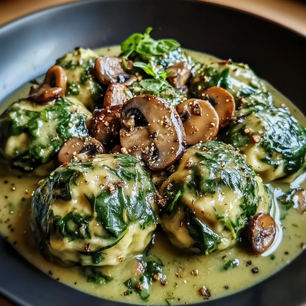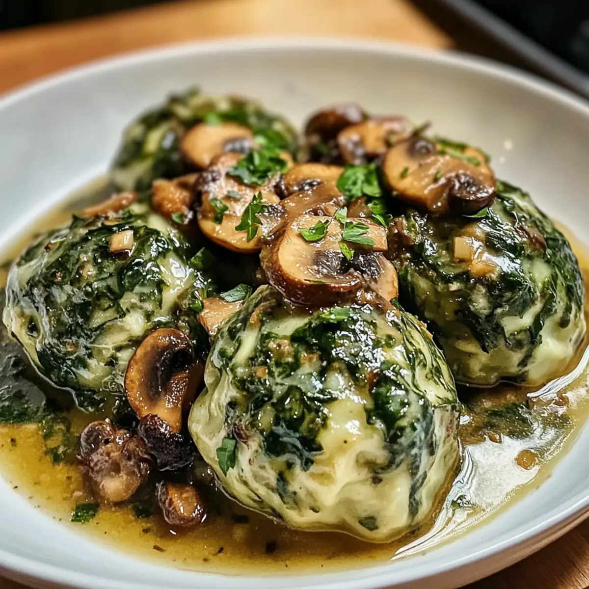 In einer gemütlichen Ecke meiner Küche, als der Duft frischer Kräuter die Luft erfüllte, erkannte ich, dass es Zeit für ein herzhaftes Gericht war. Heute teile ich mit euch mein Rezept für Spinatknödel mit Pilzragout – eine vegetarische Köstlichkeit, die jedem Gaumen Freude bereitet. Diese knusprigen, zarten Knödel sind nicht nur ein wahrer Genuss, sondern auch unglaublich gesund und einfach zuzubereiten. Mit der Kombination aus aromatischen Pilzen und einer cremigen Sauce wird diese Mahlzeit selbst die skeptischsten Fleischliebhaber überzeugen. Und das Beste daran? Ihr könnt die Rezepte an eure Vorlieben anpassen, sei es glutenfrei oder vegan – es bleibt einfach köstlich! Seid ihr bereit, euch in die Welt der Aromen und Texturen zu stürzen? Warum sind Spinatknödel so beliebt? Einfachheit der Zubereitung: Dieses Rezept ist so unkompliziert, dass selbst Kochanfänger ohne Probleme leckere Ergebnisse erzielen können. Saisonale Frische: Die Verwendung von frischem Spinat und aromatischen Pilzen bringt die Aromen des Jahreszeiten auf den Teller. Gesunde Wahl: Mit einer Kombination aus wertvollen Inhaltsstoffen ist dieses Gericht nicht nur lecker, sondern auch nährstoffreich. Vielseitige Anpassungen: Ob glutenfrei oder vegan – dieses Rezept passt sich euren Bedürfnissen an, sodass jeder Spaß am Essen hat. Perfekt für Familie und Freunde: Die herzhaften Spinatknödel sind ein Hit bei jeder Zusammenkunft und sorgen für glückliche Gesichter am Tisch. Spinatknödel mit Pilzragout Zutaten Für die Spinatknödel: • Frischer Spinat (300 g) – bietet den Hauptgeschmack und wichtige Nährstoffe; frischer Spinat sorgt für das beste Aroma, gefrorener Spinat geht aber auch. • Altes Brot oder Brötchen (250 g) – dient als Basis für die Knödelstruktur und nimmt Feuchtigkeit auf; glutenfreies Brot ist eine hervorragende Alternative. • Eier (2) – binden die Knödel; Vegane Alternativen wie Leinsamen-Ei können ausprobiert werden. • Allzweckmehl (100 g, Type 405) – sorgt für Struktur; ersetzt es durch glutenfreies Mehl für eine glutenfreie Version. • Frisch geriebener Parmesan (50 g) – hebt den Geschmack; kann durch eine vegane Käsesorte ersetzt werden. • Zwiebel (1, fein gehackt) – bringt Tiefe ins Gericht. • Knoblauch (1 Zehe, gehackt) – fügt ein aromatisches Element hinzu. • Salz und Pfeffer – nach Geschmack würzen. • Muskatnuss (frisch gerieben) – sorgt für Wärme im Geschmack; optional, aber empfehlenswert. • Butter oder Olivenöl – für das Anbraten und zur Geschmacksanreicherung der Knödel. Für das Pilzragout: • Gemischte Pilze (400 g, z.B. Champignons, Steinpilze, Pfifferlinge) – die Stars des Ragouts, die Umami und Textur hinzufügen; verschiedene Sorten können gemischt werden. • Zwiebel (1, gewürfelt) – verleiht Süße und Geschmack. • Knoblauch (2 Zehen, gehackt) – verstärkt den Gesamtgeschmack. • Gemüsebrühe (200 ml) – sorgt für eine herzhafte Basis für das Ragout. • Sahne oder eine pflanzliche Alternative (100 ml) – erhöht die Cremigkeit der Sauce. • Frischer oder getrockneter Thymian (1 TL) – für das aromatische Kräuteraroma. • Salz und Pfeffer – nach Geschmack. • Olivenöl – zum Anbraten. Step-by-Step Instructions for Spinatknödel mit Pilzragout Step 1: Spinat blanchieren Bringe einen großen Topf mit Wasser zum Kochen und füge eine Prise Salz hinzu. Blanchiere den frischen Spinat für 2-3 Minuten, bis er verwelkt ist. Danach abgießen, kurz mit kaltem Wasser abbrausen, um den Kochvorgang zu stoppen, und gut abtropfen lassen. Hacke den Spinat fein und stelle ihn beiseite. Step 2: Zwiebeln und Knoblauch anbraten Erhitze in einer Pfanne einen Esslöffel Butter oder Olivenöl bei mittlerer Hitze. Füge die fein gehackte Zwiebel und die Knoblauchzehe hinzu und brate sie unter Rühren 3-4 Minuten an, bis sie weich und leicht goldbraun sind. Gib dann den gehackten Spinat dazu und lasse die Mischung etwas abkühlen. Step 3: Teig für die Knödel herstellen In einer großen Schüssel mische die gewürfelten alten Brötchen, die abgekühlte Spinat-Zwiebel-Mischung, die Eier, das Mehl, den Parmesan sowie Salz, Pfeffer und Muskatnuss. Vermenge alles gründlich, bis eine homogene Mischung entsteht. Lasse den Teig etwa 15 Minuten ruhen, damit sich die Aromen entfalten. Step 4: Knödel formen Mit den Händen, die du leicht anfeuchtest, nimm jeweils eine Portion des Teigs und forme sie zu runden Knödeln von etwa 5 cm Durchmesser. Achte darauf, dass die Knödel gleichmäßig geformt sind, damit sie gleichmäßig garen. Lege die geformten Knödel auf ein mit Mehl bestäubtes Brett. Step 5: Knödel kochen Setze einen großen Topf mit gesalzenem Wasser auf und bringe es zum Kochen. Reduziere die Hitze, sodass das Wasser nur leicht köchelt. Gib die Knödel vorsichtig ins Wasser und koche sie 15-20 Minuten lang oder bis sie an die Oberfläche steigen. Nimm die Knödel mit einem Schöpflöffel heraus und lasse sie gut abtropfen. Step 6: Pilzragout zubereiten In einer großen Pfanne erhitze erneut etwas Olivenöl. Füge die gewürfelte Zwiebel und den gehackten Knoblauch hinzu und brate sie für 3-4 Minuten an, bis sie weich sind. Dann gib die gemischten Pilze dazu und brate sie an, bis sie goldbraun sind und ihre Flüssigkeit abgegeben haben. Step 7: Ragout verfeinern Gieße die Gemüsebrühe in die Pfanne mit den Pilzen und füge die Sahne oder eine pflanzliche Alternative hinzu. Würze mit frischem oder getrocknetem Thymian, Salz und Pfeffer. Lass das Ragout bei schwacher Hitze für etwa 10 Minuten köcheln, bis es leicht eindickt und die Aromen sich entfalten. Step 8: Anrichten Serviere die warmen Spinatknödel auf Tellern und löffle großzügig das cremige Pilzragout darüber. Genieße den Geschmack der hausgemachten Spinatknödel mit Pilzragout, das jeden Bissen zu einem festlichen Erlebnis macht. Was passt zu Spinatknödel mit Pilzragout? Eine köstliche Kombination kann deine Mahlzeit no