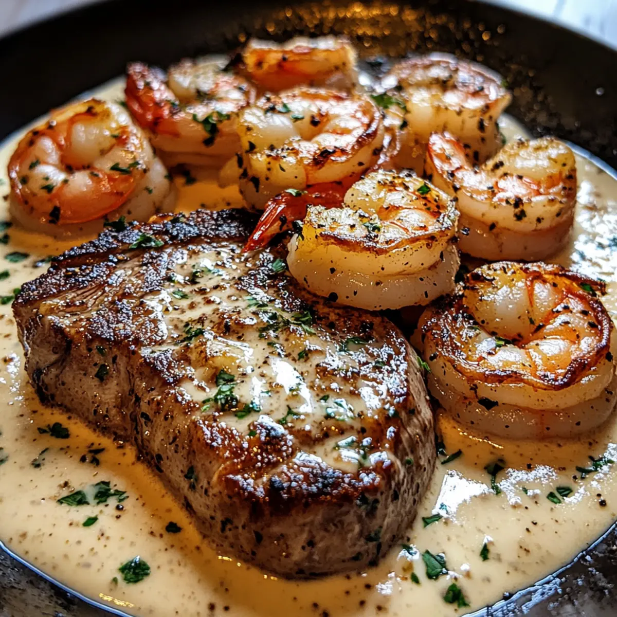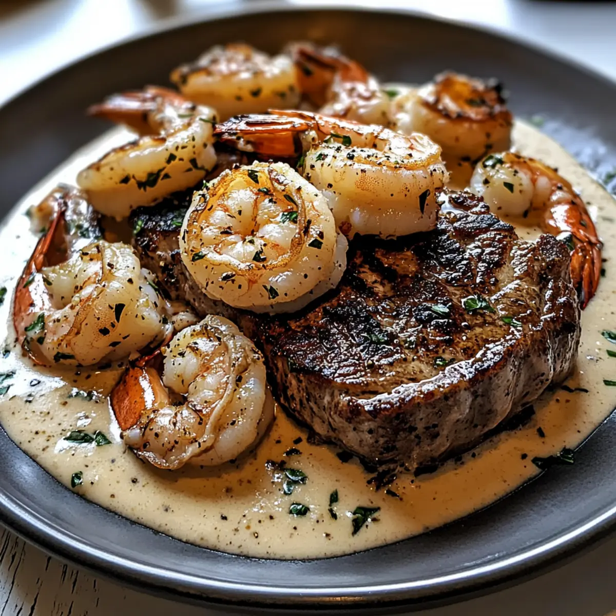 „Wenn ich an das perfekte Abendessen denke, dann leuchten meine Augen bei der Vorstellung von Steak und cremigen Knoblauchgarnele.“ Diese Gaumenfreude verbindet zartes Steak mit saftigen Garnelen in einer köstlich reichen Knoblauchsauce. Perfekt für einen besonderen Anlass oder einfach einen verwöhnenden Abend unter der Woche, bietet dieses Rezept nicht nur einen Genuss, sondern überrascht auch mit unkomplizierter Zubereitung. Die Kombination aus herzhaften und aromatischen Aromen lässt jeden Bissen zu einem Erlebnis werden. Freuen Sie sich auf das Entstehen luxuriöser Restaurant-Atmosphäre in Ihrer eigenen Küche. Wer kann da schon widerstehen? Sind Sie bereit, etwas Magisches zu kreieren? Warum werden Sie dieses Rezept lieben? Einfachheit: Die Zubereitung ist unkompliziert und erfordert nur grundlegende Kochkenntnisse. Reicher Geschmack: Die Kombination aus zartem Steak und cremiger Knoblauchsauce sorgt für ein Geschmacksfeuerwerk. Luxuriöses Erlebnis: Genießen Sie das Gefühl eines gehobenen Restaurants direkt zu Hause! Vielseitigkeit: Dieses Gericht lässt sich problemlos anpassen – warum nicht einige frische Kräuter oder Gemüse hinzufügen? Perfekte Mahlzeit: Egal, ob für einen besonderen Anlass oder ein verwöhnendes Wochendinner, es wird sicher beeindrucken! Schnell zubereitet: In nur wenigen Schritten zaubern Sie ein Feierabendessen, das sich sehen lassen kann. Verwenden Sie frische Zutaten, um das Beste aus Ihrem Gericht herauszuholen! Steak und cremige Knoblauchgarnele Zutaten Für das Steak • Ribeye – bietet den besten Geschmack und die perfekte Zartheit; Sirloin oder Filet Mignon sind gute Alternativen. • Salz & Pfeffer – essentielle Gewürze, um das Steak zu würzen und den natürlichen Geschmack hervorzuheben. Für die Knoblauchgarnele • Garnelen – frisch oder gefroren; sie verleihen dem Gericht eine süßliche Note und eine zarte Textur. • Knoblauch – sorgt für ein intensives Aroma; frisch gehackt ist ideal, alternativ kann Knoblauchpulver verwendet werden. Für die Sauce • Schlagsahne – macht die Sauce cremig und reichhaltig; Halbfettcreme kann für eine leichtere Variante genutzt werden. • Butter – bringt zusätzlichen Geschmack; Öl ist eine fettärmere Option. • Cayennepfeffer – für eine Prise Schärfe; je nach Vorliebe anpassen oder weglassen. Sonstiges • Zusätzliche Gewürze – experimentieren Sie mit Kräutern oder Gewürzen, um den Geschmack zu verfeinern. Unser Rezept für Steak und cremige Knoblauchgarnele wird Ihnen viel Freude beim Kochen bereiten! Schritt-für-Schritt-Anleitung für Steak und cremige Knoblauchgarnele Step 1: Steak vorbereiten Würzen Sie das Ribeye-Steak großzügig mit Salz und Pfeffer und lassen Sie es etwa 10 Minuten bei Raumtemperatur ruhen. Dies sorgt dafür, dass das Steak gleichmäßig gart. Währenddessen können Sie eine schwere Pfanne oder eine gusseiserne Pfanne bei mittelhoher Hitze vorheizen, bis sie heiß ist. Step 2: Steak anbraten Fügen Sie einen Esslöffel Butter in die heiße Pfanne hinzu, bis sie schäumt. Legen Sie das Steak vorsichtig hinein und braten Sie es für etwa 4-5 Minuten pro Seite, bis eine schöne Kruste entsteht und es auf der gewünschten Garstufe (zum Beispiel 130°F für medium-rare) ist. Achten Sie darauf, die Temperatur nicht zu hoch einzustellen, um ein Verbrennen zu vermeiden. Step 3: Steak ruhen lassen Nehmen Sie das Steak aus der Pfanne und legen Sie es auf einen Teller. Decken Sie es leicht mit Folie ab und lassen Sie es 5-10 Minuten ruhen, damit sich die Säfte setzen können. Dieser Schritt ist wichtig, damit das Steak zart und saftig bleibt, während Sie die cremige Knoblauchgarnele zubereiten. Step 4: Garnelen sautieren Verwenden Sie die gleiche Pfanne, in der Sie das Steak gebraten haben, und fügen Sie bei Bedarf etwas mehr Butter hinzu. Geben Sie die Garnelen und den gehackten Knoblauch dazu und braten Sie beides bei mittlerer Hitze für etwa 3-4 Minuten, bis die Garnelen rosa und durchgegart sind. Achten Sie darauf, die Garnelen nicht zu lange zu garen, da sie sonst zäh werden. Step 5: Sauce zubereiten Reduzieren Sie die Hitze und gießen Sie die Schlagsahne über die Garnelen in der Pfanne. Fügen Sie nach Geschmack Cayennepfeffer hinzu und lassen Sie die Mischung sanft köcheln, während Sie alles gut umrühren. In etwa 2-3 Minuten wird die Sauce dicklich und cremig, perfekt für unser Steak und cremige Knoblauchgarnele. Step 6: Anrichten Schneiden Sie das ruhende Steak gegen die Faser in Scheiben. Servieren Sie die Steakstücke auf den Tellern und löffeln Sie die cremigen Knoblauchgarnelen sowie die Sauce darüber. Genießen Sie Ihr luxuriöses Gericht, das wie ein echtes Restaurantessen aussieht und schmeckt! Tipps zur Vorbereitung für Steak und cremige Knoblauchgarnele Die Zubereitung von Steak und cremigen Knoblauchgarnele lässt sich ideal im Voraus planen! Sie können das Steak bis 24 Stunden im Voraus würzen und in Frischhaltefolie im Kühlschrank marinieren, um die Aromen zu intensivieren. Außerdem können die Garnelen bereits geschält und entdarmt werden, sodass sie bereit sind, wenn es Zeit zum Kochen ist. Wenn Sie die Soße vorbereiten möchten, können Sie sie ebenfalls für bis zu 3 Tage im Voraus zubereiten und im Kühlschrank aufbewahren; achten Sie darauf, die Sahne erst kurz vor dem Servieren hinzuzufügen, um die cremige Konsistenz zu bewahren. Wenn es Zeit ist, Ihr luxuriöses Gericht zu servieren, braten Sie das Steak und die Garnelen wie beschrieben an und genießen Sie die Restaurantqualität in Ihrem eigenen Zuhause – so sparen Sie Zeit an hektischen Abenden! Variationen für Steak und cremige Knoblauchgarnele Entdecken Sie, wie Sie dieses köstliche Gericht nach Ihrem Geschmack anpassen können! Dairy-Free: Ersetzen Sie die Schlagsahne durch Kokosmilch für eine milchfreie, trotzdem cremige Sauce. Für mehr Gemüse: Fügen Sie frischen Spinat oder sautierte Champignons zur Sauce hinzu. Das sorgt für zusät