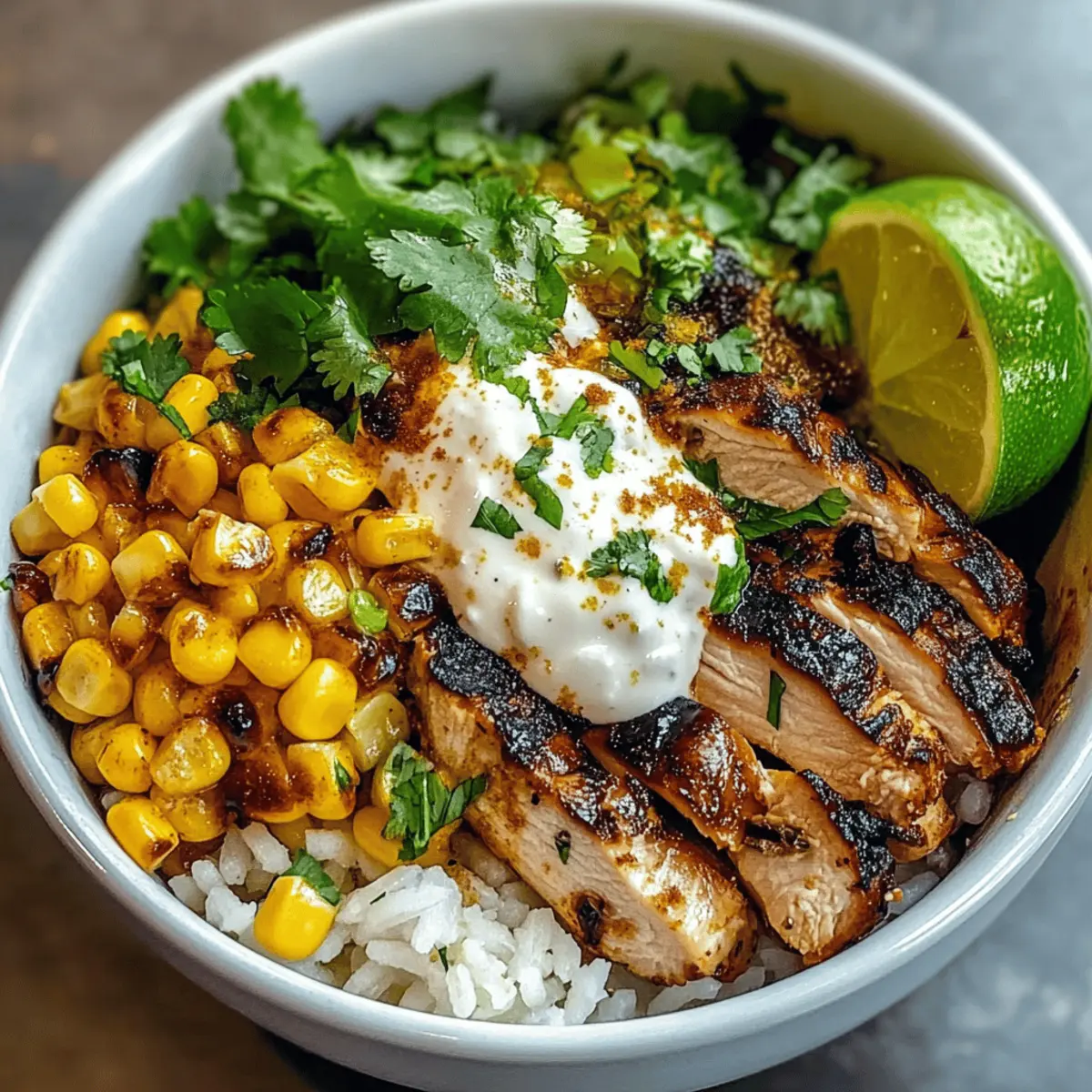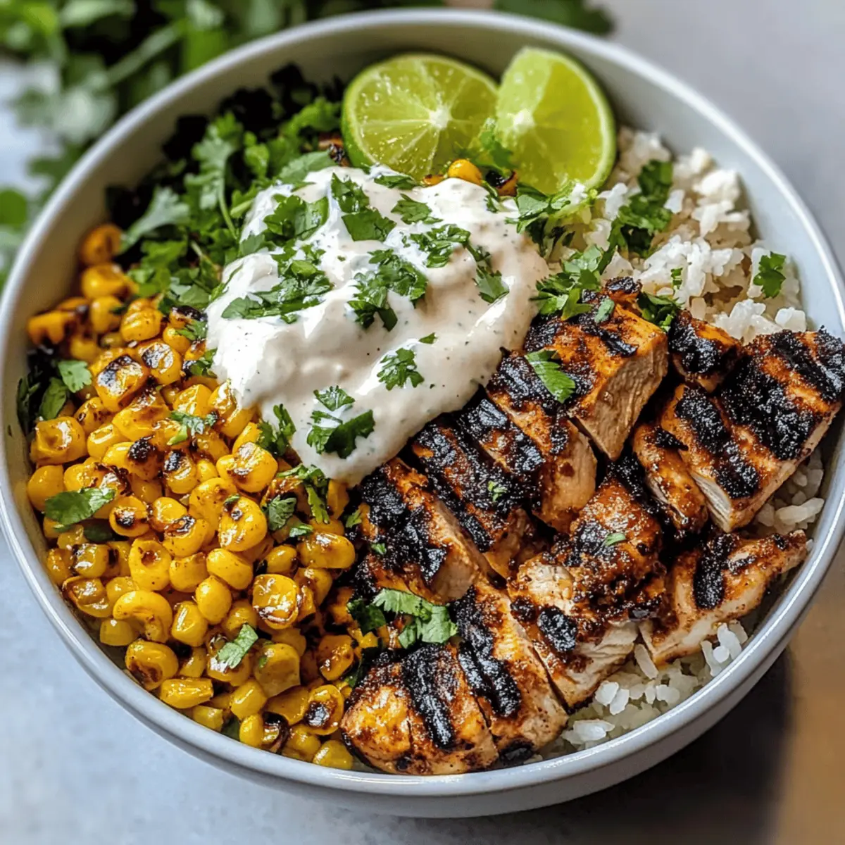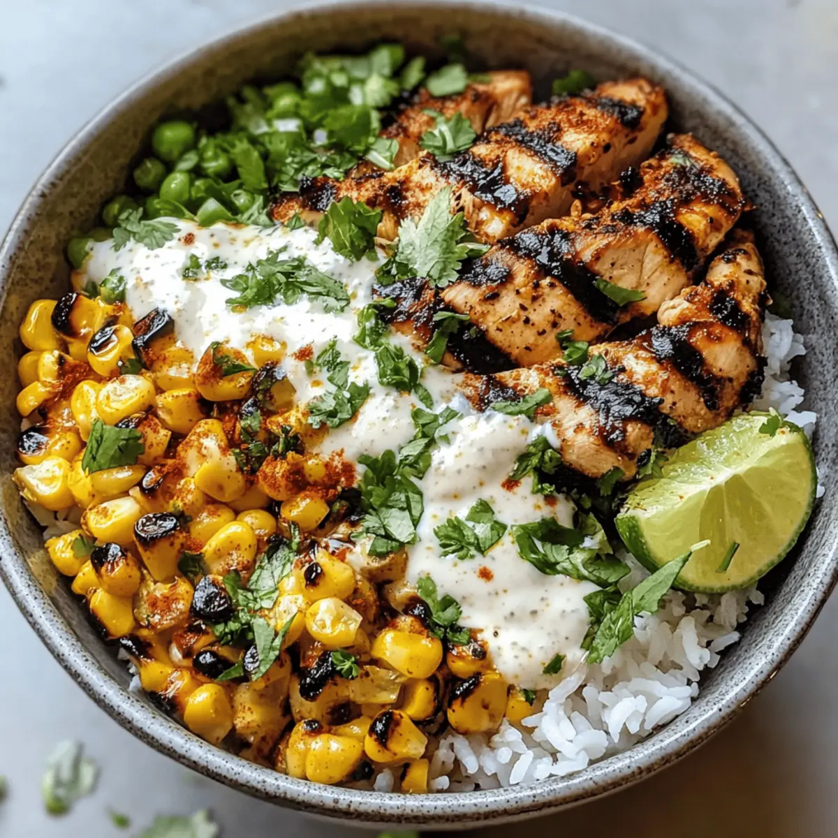 Als ich beim letzten Straßenfest den verlockenden Duft von gegrilltem Hähnchen und geröstetem Mais einatmete, wusste ich sofort, dass ich dieses Erlebnis in meine Küche holen wollte. Heute lade ich euch ein, mit mir eine köstliche Straßenmais-Hühnchen-Reisschüssel zuzubereiten, die nicht nur einfach zu machen ist, sondern auch eure Geschmacksnerven zum Tanzen bringt. Diese mexikanisch inspirierte Schüssel vereint zartes Hähnchen, knusprigen, leicht angebratenen Mais und eine erfrischende Limettencreme in weniger als 40 Minuten. Perfekt für geschäftige Wochentage oder gemütliche Wochenendabende – und das Beste daran? Ihr könnt sie nach Belieben anpassen! Welche Zutaten werden eure Lieblingsvarianten ausmachen? Lasst uns gemeinsam diese geschmackliche Entdeckungsreise antreten! Warum solltest du diese Reisschüssel probieren? Köstliche Aromen: Diese Straßenmais-Hühnchen-Reisschüssel vereint die verlockenden Aromen Mexikos in einem Gericht, das jeder lieben wird. Einfach zuzubereiten: In weniger als 40 Minuten hast du ein aromatisches, gesundes Essen auf dem Tisch. Vielseitig: Du kannst die Zutaten ganz nach deinem Geschmack anpassen – von Proteinen bis zu Toppings ist der Kreativität keine Grenze gesetzt. Perfekte Texturen: Die Kombination aus zartem Hähnchen und knusprigem, geröstetem Mais sorgt für ein aufregendes Esserlebnis. Familienfreundlich: Ideal für ein schnelles Abendessen, das selbst die wählerischsten Esser begeistert! Vergesst nicht, nach weiteren leckeren Variationen wie Quinoa oder einer vegetarischen Option mit Tofu zu schauen; eure Familie wird es lieben! Straßenmais-Hühnchen-Reisschüssel Zutaten • Eine aufregende und vielfältige Kombination für dein nächstes Essen! Für das Hähnchen Entbeinte Hähnchenoberkeulen – Diese Stücke sind zart und geschmackvoll beim Grillen; du kannst sie auch durch Hähnchenbrust ersetzen, wenn du auf Kalorien achtest. Olivenöl – Verleiht Feuchtigkeit und hilft beim Marinieren; Avocadoöl ist eine geeignete Alternative. Chili Pulver – Für die nötige Schärfe und Komplexität; auch geräuchertes Paprika bringt eine besondere Note. Kreuzkümmel – Verstärkt die erdigen Aromen; Koriander kann hier eine interessante Abwechslung bieten. Paprika – Für milde Süße und Farbe; geräuchertes Paprika kann den Geschmack vertiefen. Knoblauch (gehackt) – Verleiht aromatische Tiefe; bei Verfügbarkeit kannst du auch Knoblauchpulver verwenden. Limettensaft – Bringt Frische ins Gericht und zartet das Hähnchen während der Marinierzeit; Zitronensaft kann eine andere Zitrusnote hinzufügen. Salz & Pfeffer – Essentiell zum Würzen; passe die Menge nach deinem Geschmack an. Für die Reisbasis Jasminreis – Bietet eine duftende, fluffige Textur für die Schüssel; brauner Reis ist eine gesunde Alternative. Hühnerbrühe – Koch die Reiskörner darin für zusätzlichen Geschmack; Gemüsebrühe ist eine vegetarische Option. Für die Toppings Frischer Koriander (gehackt) – Sorgt für Frische und einen Geschmackskick; wenn du keinen Koriander magst, ist Petersilie eine gute Wahl. Frischer oder gefrorener Mais – Bestes Topping ist, wenn er angebraten ist; Dosenmais kann als Notlösung dienen, bietet aber nicht die gleiche Textur. Mayonnaise – Für die cremige Komponente in dem Mais-Topping; griechischer Joghurt kann eine herzhafte Alternative bieten. Cotija-Käse (zerbröselt) – Traditionelles Topping, das für Salzigkeit und Cremigkeit sorgt; Feta kann hier ebenfalls verwendet werden. Limette (für die Creme) – Fügt der Limettencreme eine spritzige Note hinzu; andere Zitrussäfte sind ebenfalls möglich. Salz – Verstärkt den Geschmack; nutze es sparsam in der Creme-Zubereitung. Drücke dich kreativ aus mit dieser Straßenmais-Hühnchen-Reisschüssel – ein Gericht, das nicht nur schön aussieht, sondern auch wunderbar schmeckt! Schritt-für-Schritt-Anleitung für die Straßenmais-Hühnchen-Reisschüssel Step 1: Hähnchen marinieren In einer Schüssel das Hähnchen mit Olivenöl, Chili-Pulver, Kreuzkümmel, Paprika, gehacktem Knoblauch, Limettensaft, Salz und Pfeffer gut vermischen. Die Marinade sollte das Hähnchen gleichmäßig bedecken. Lass das Hähnchen mindestens 30 Minuten im Kühlschrank marinieren, damit die Aromen gut einziehen. Step 2: Reis kochen Erhitze in einem mittelgroßen Topf die Hühnerbrühe zum Kochen. Füge den Jasminreis hinzu und reduziere die Hitze auf niedrig, dann decke den Topf ab und lass den Reis etwa 15 Minuten köcheln, bis er fluffig ist. Rühre frisch gehackten Koriander und Limettensaft unter, um dem Reis einen frischen Geschmack zu verleihen. Step 3: Mais anbraten Grille frischen Mais auf einer Grillpfanne oder dem Grill bei mittlerer Hitze. Wende ihn alle 3–4 Minuten, bis die Körner leicht angebräunt sind und eine schöne Grillmarkierung haben. Lass den Mais etwas abkühlen, schneide dann die Körner von den Kolben ab und vermische sie mit Mayonnaise und der Hälfte des Chili-Pulvers für extra Geschmack. Step 4: Hähnchen grillen Erhitze einen Grill oder eine Grillpfanne auf mittlerer bis hoher Hitze. Lege die marinierten Hähnchenteile auf den Grill und grille sie für etwa 5–7 Minuten pro Seite, bis sie goldbraun und durchgegart sind. Lass das Hähnchen nach dem Grillen 5 Minuten ruhen, bevor du es in dünne Scheiben schneidest. Step 5: Limettencreme zubereiten In einer kleinen Schüssel Limettensaft, eine Prise Salz und saure Sahne gut vermischen, bis eine homogene Creme entsteht. Diese Limettencreme wird gleichmäßig auf deiner Straßenmais-Hühnchen-Reisschüssel verteilt und sorgt für eine frische, cremige Note. Step 6: Schüsseln anrichten Bereite die Schüsseln vor, indem du zuerst eine Schicht des aromatischen Jasminreises in jede Schüssel gibst. Füge die geschnittenen Hähnchenstücke, die charred Maiskörner, zerbröselten Cotija-Käse und die Limettencreme hinzu. Verziere die Schüsseln großzügig mit frischem Koriander und einem Sprit